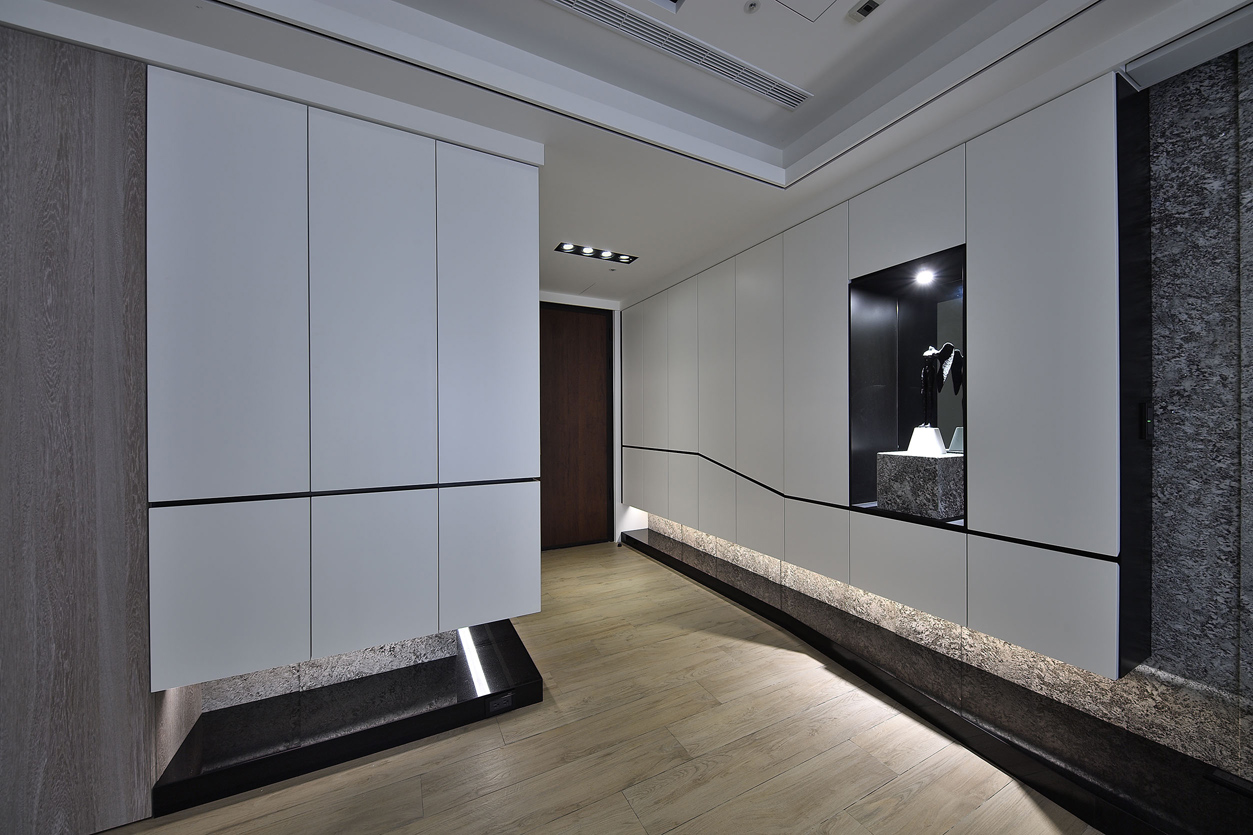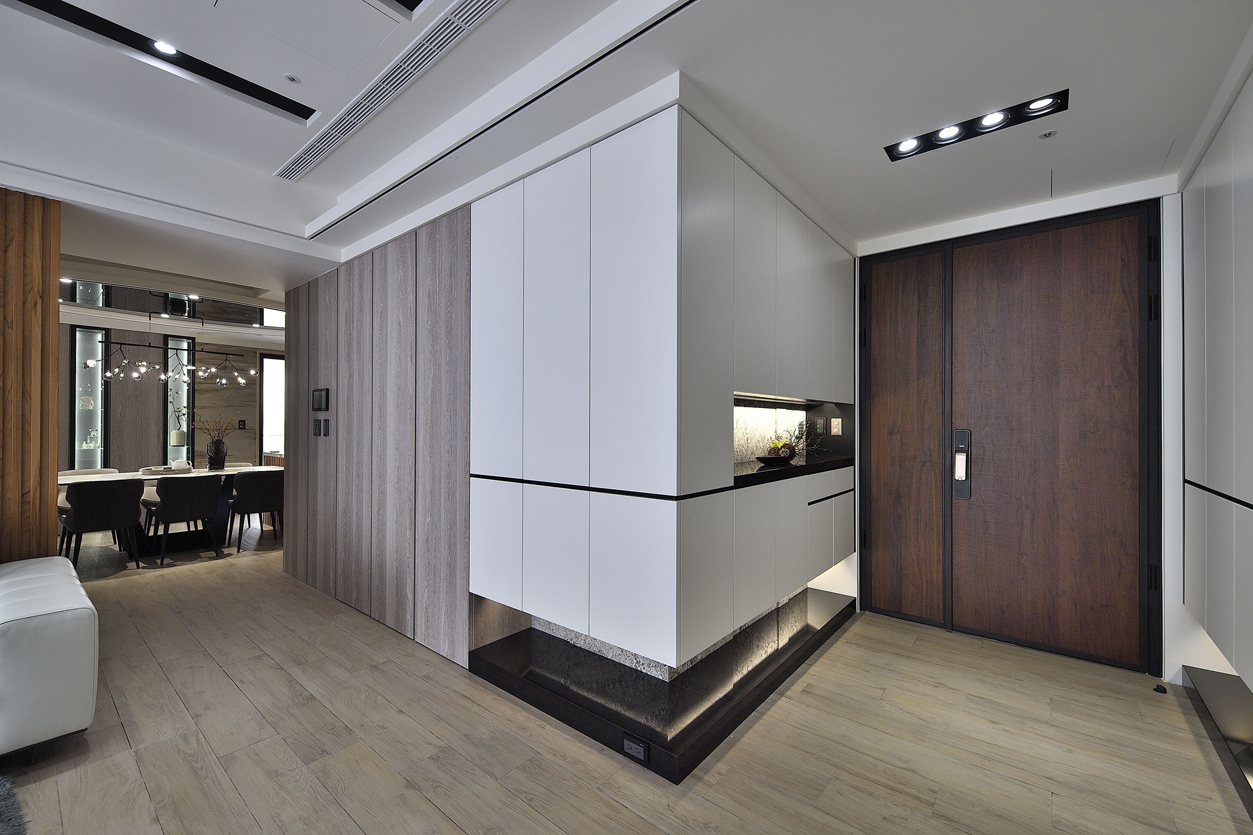 空间布局:入口區域設計了隱藏式鞋櫃與收納櫃,與牆面完美結合,提供充足的儲物空間,同時保持視覺上的整潔,白色櫃體搭配黑色石材底座,簡約中帶有設計感,增強空間的現代風格引導動線,從玄關→客廳→餐廳,動線開放且流暢,滿足日常生活的便利性,不同功能區域之間雖有視覺分隔,但動線沒有多餘阻礙,提升了生活效率。