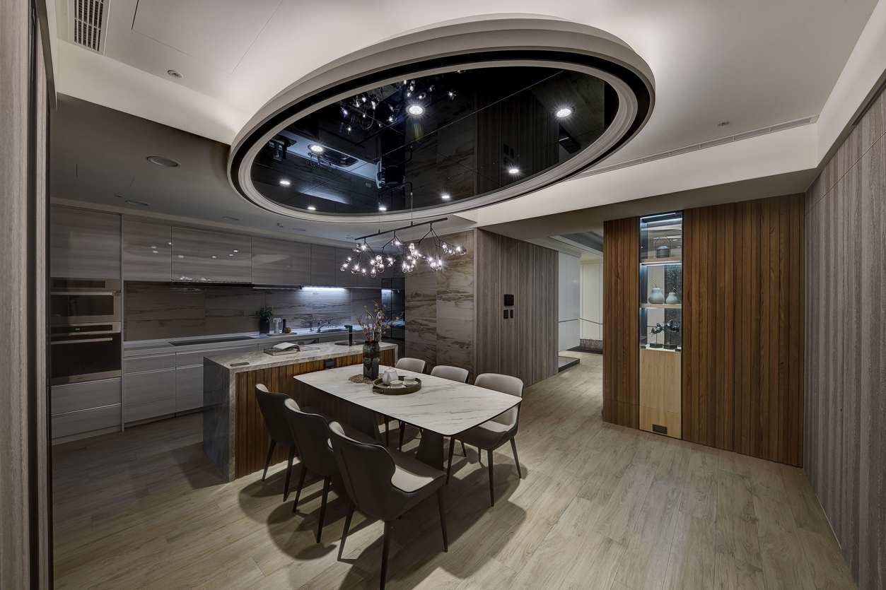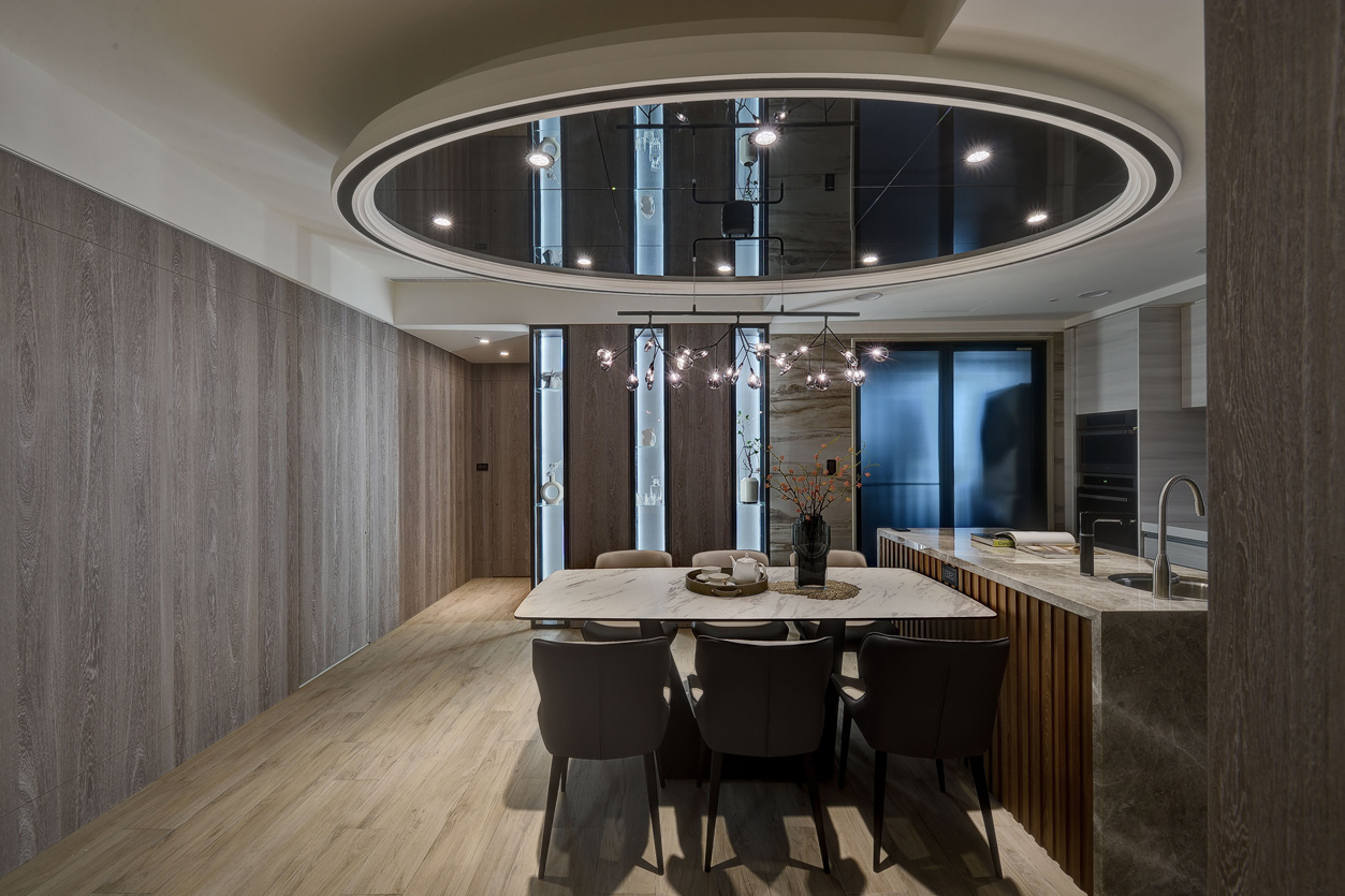空间意境:強調「少即是多」的設計原則,捨棄繁複的裝飾,注重空間的功能性與整體視覺的平衡,透過乾淨俐落的線條、簡約色調、黑色嵌入式燈帶及鏡面與白色天花板形成對比,兼具功能性與視覺藝術效果,增強空間的現代感設計,營造出優雅、舒適且現代感十足的居家空間。