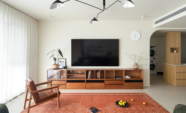 楼梯间的廊道也被巧妙地利用上了,不仅安排下了洗衣区,还给男屋主规划了一个小酌区,一个茶水柜加上一把舒适的躺椅,妥妥的个人居心地。