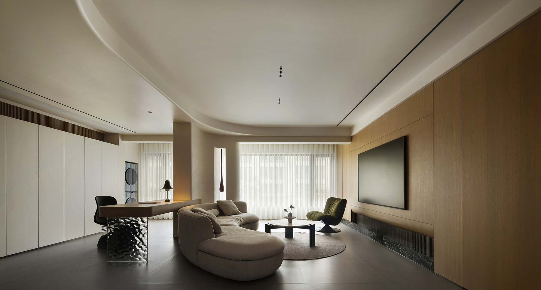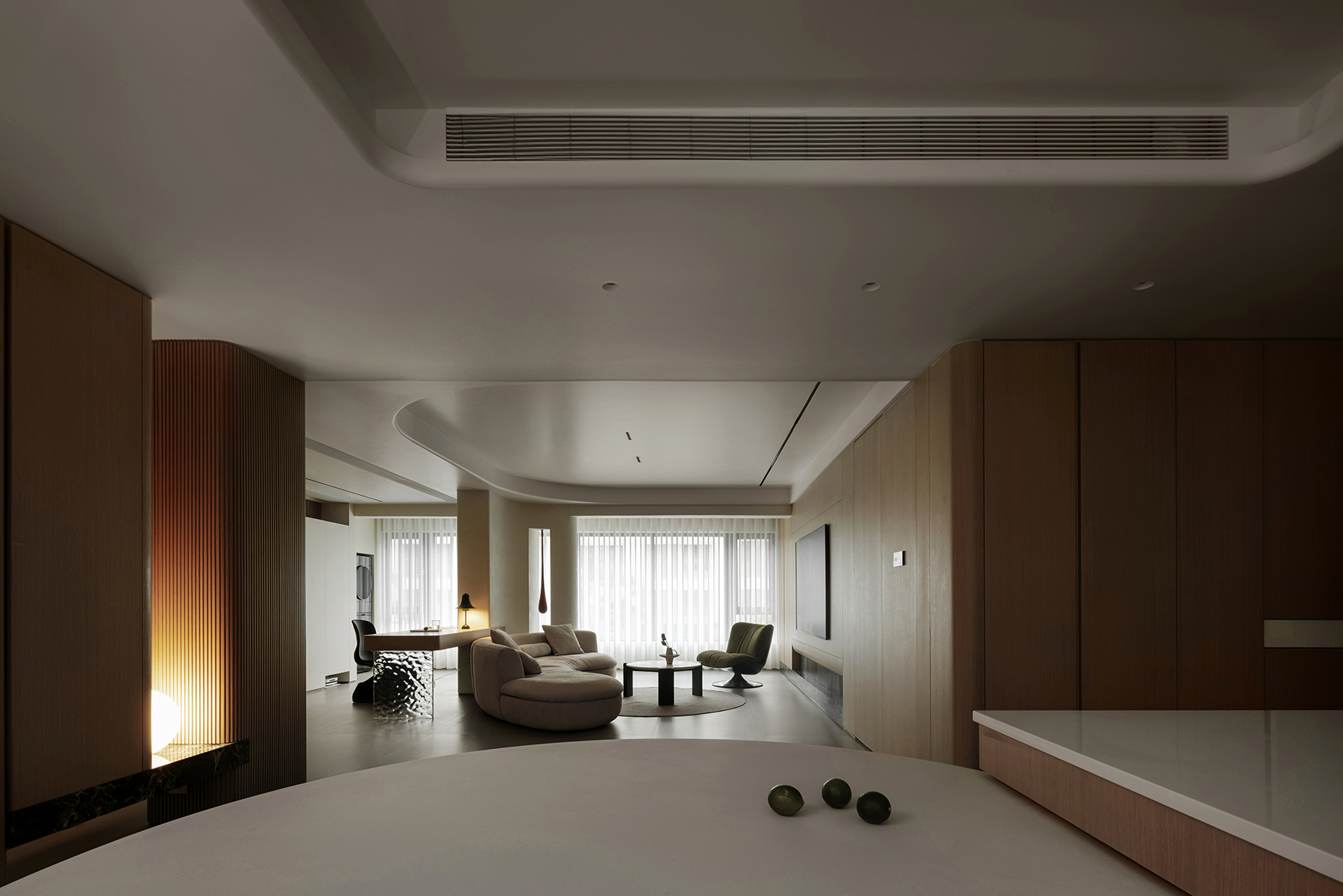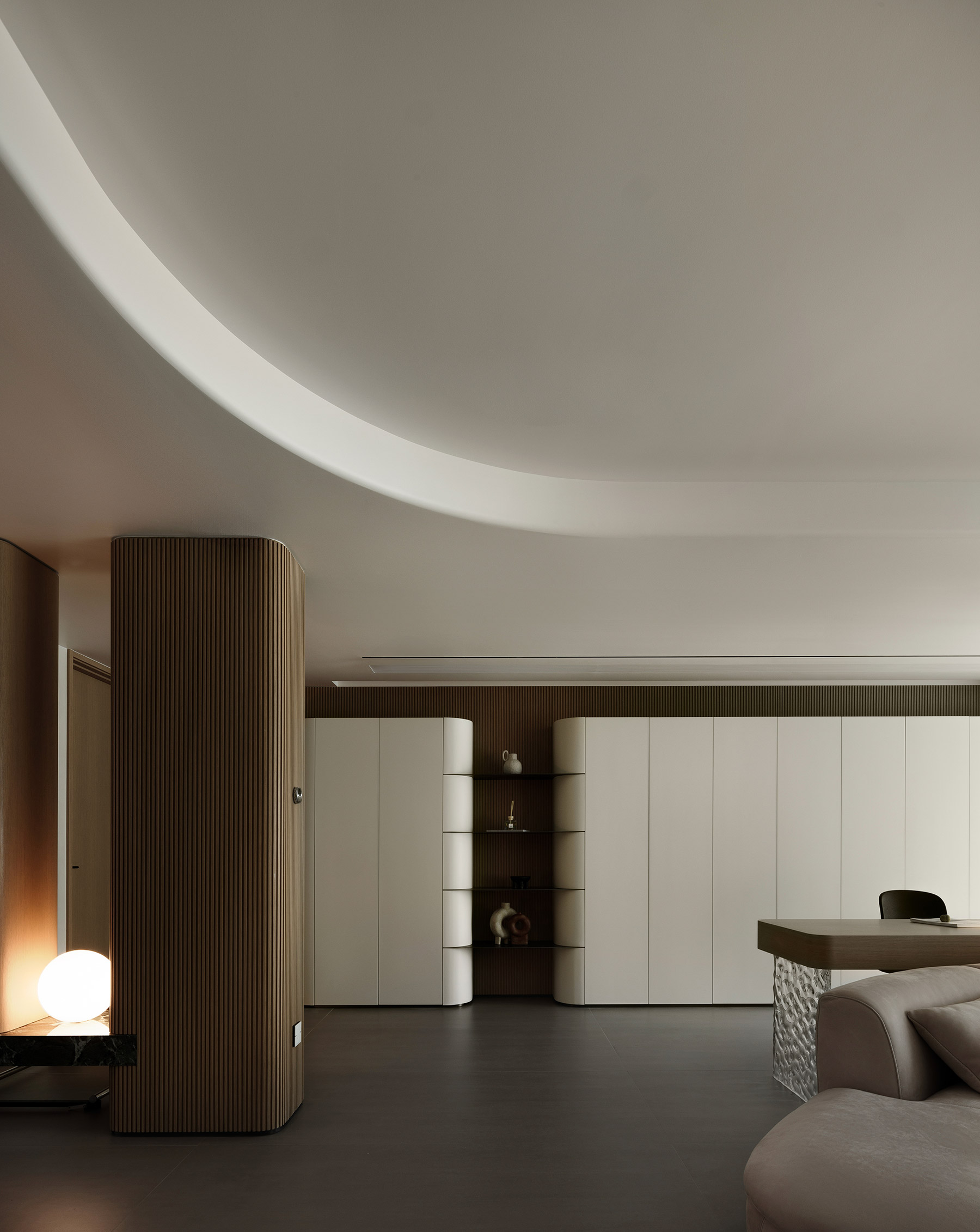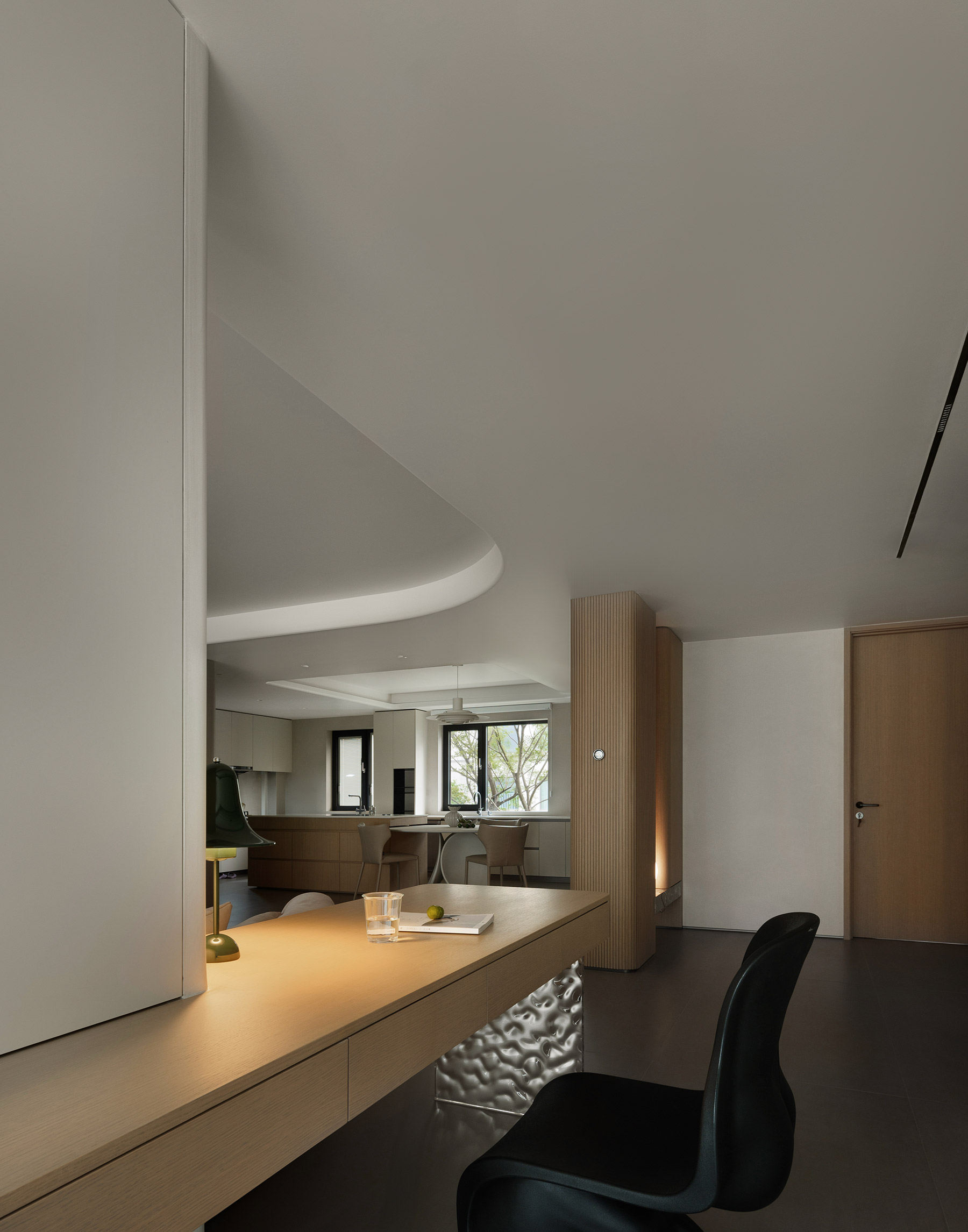 空间整体以木质感和简白调为主,素朴的用色,纯粹的材质,与开阔的空间磨合,主人在设计之初,表示自己性格过于硬朗,希望通过室内大量圆弧的运用,来增加空间的温润感,让主人变得更加温和。每一处设计细节,都是代表主人