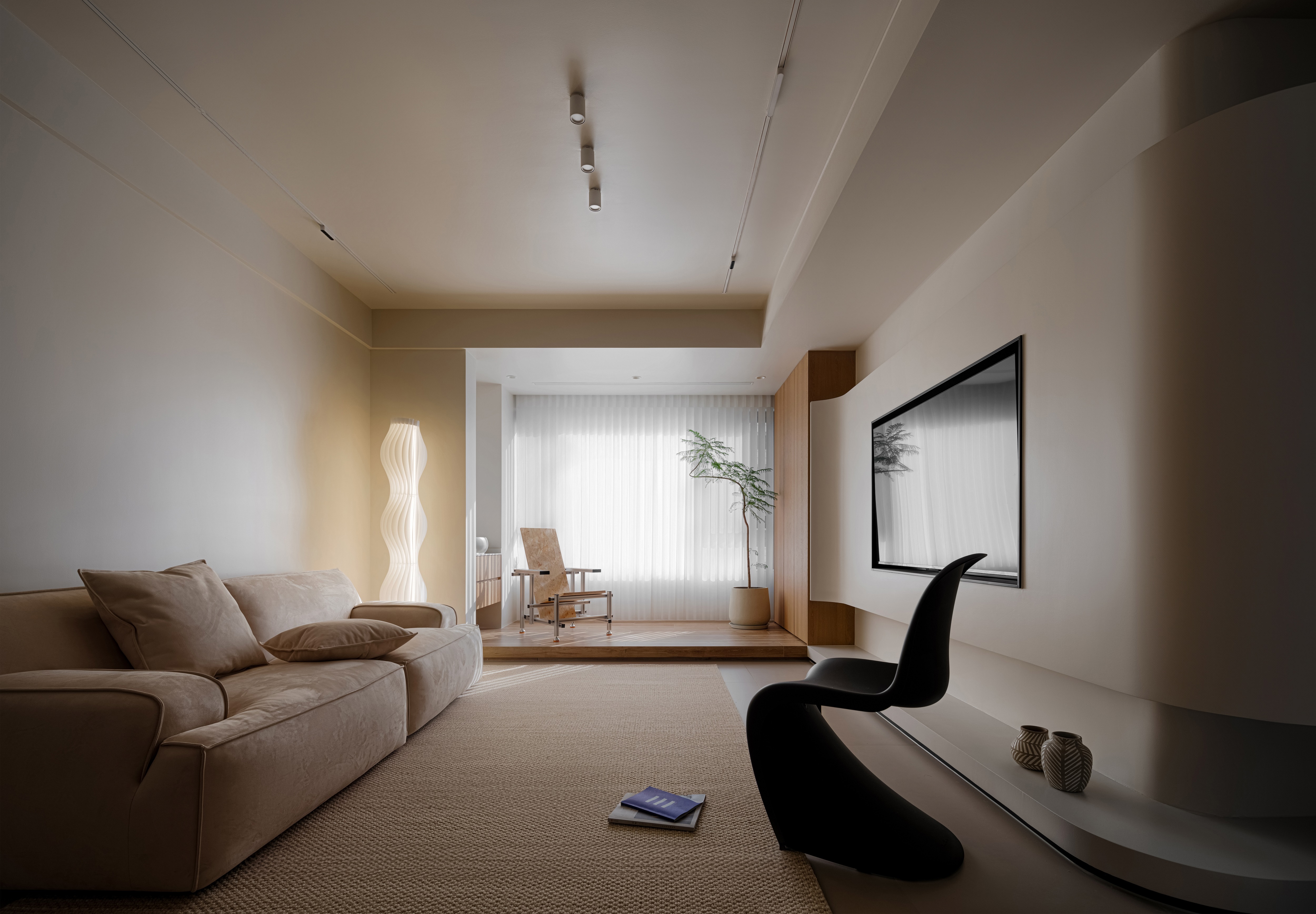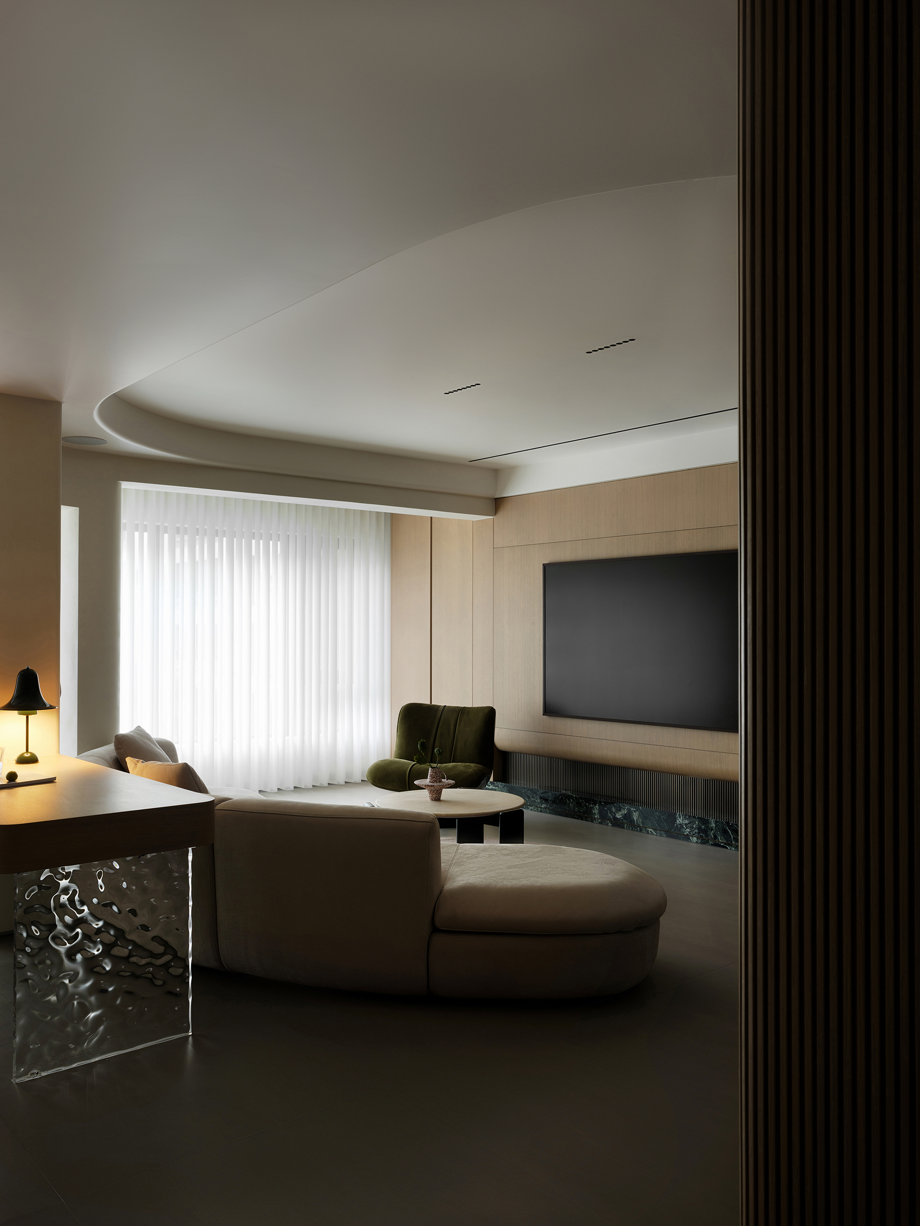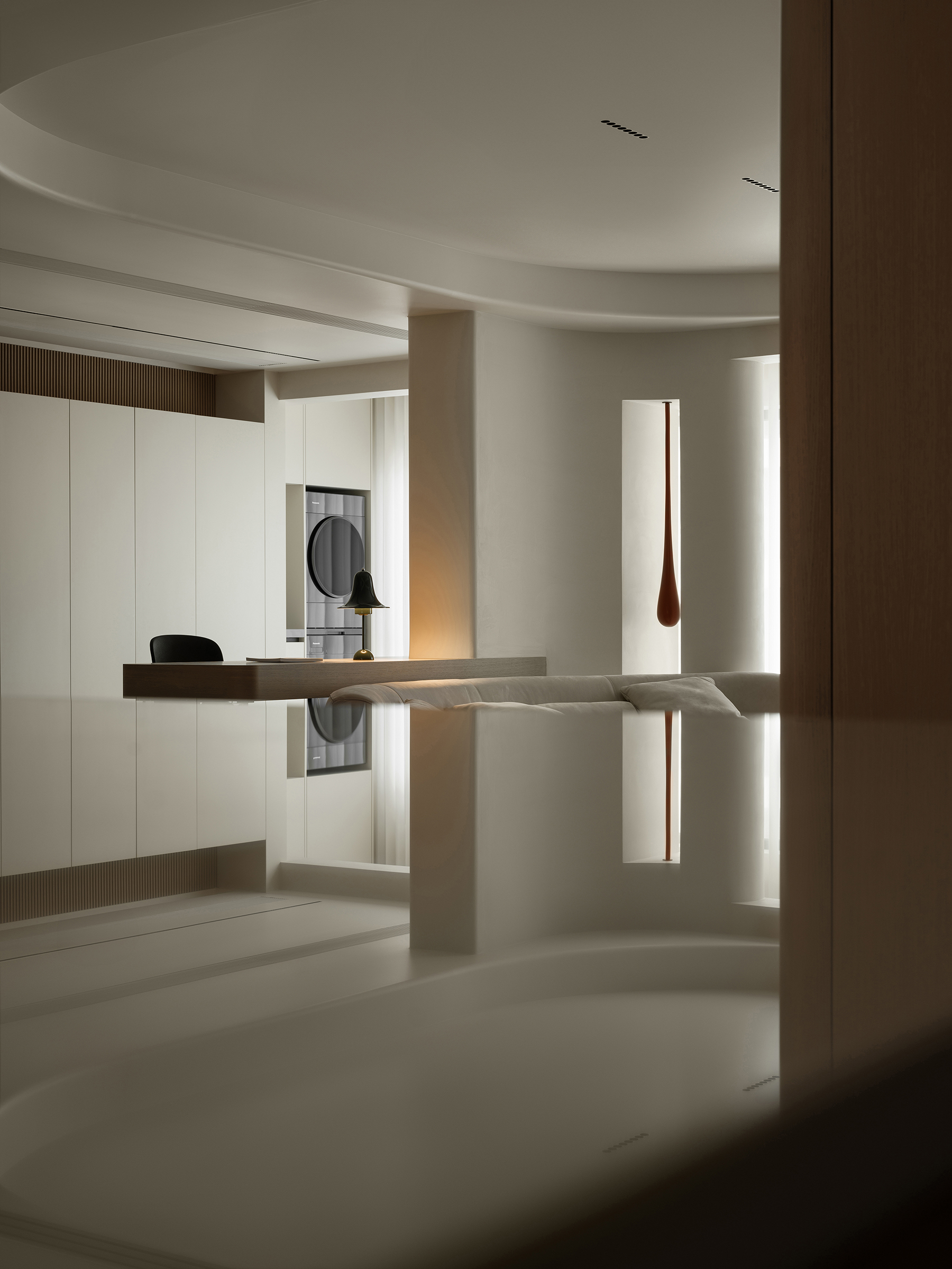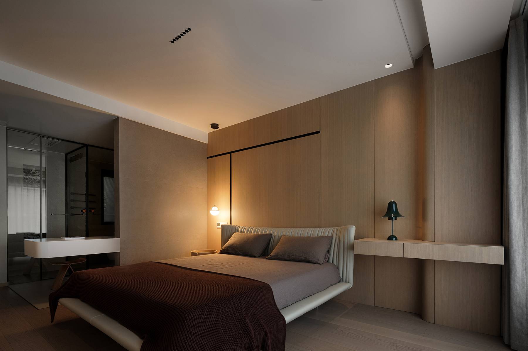空间整体以木质感和简白调为主,素朴的用色,纯粹的材质,与开阔的空间磨合,主人在设计之初,表示自己性格过于硬朗,希望通过室内大量圆弧的运用,来增加空间的温润感,让主人变得更加温和。每一处设计细节,都是代表主人