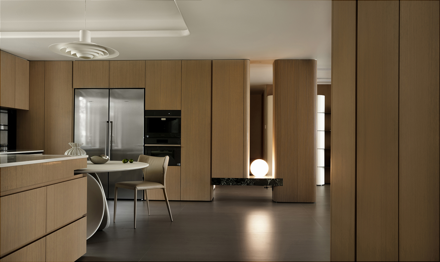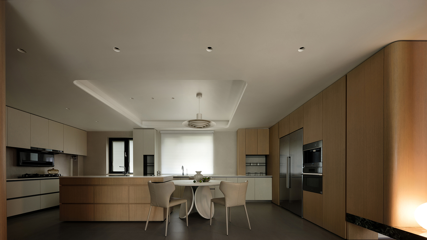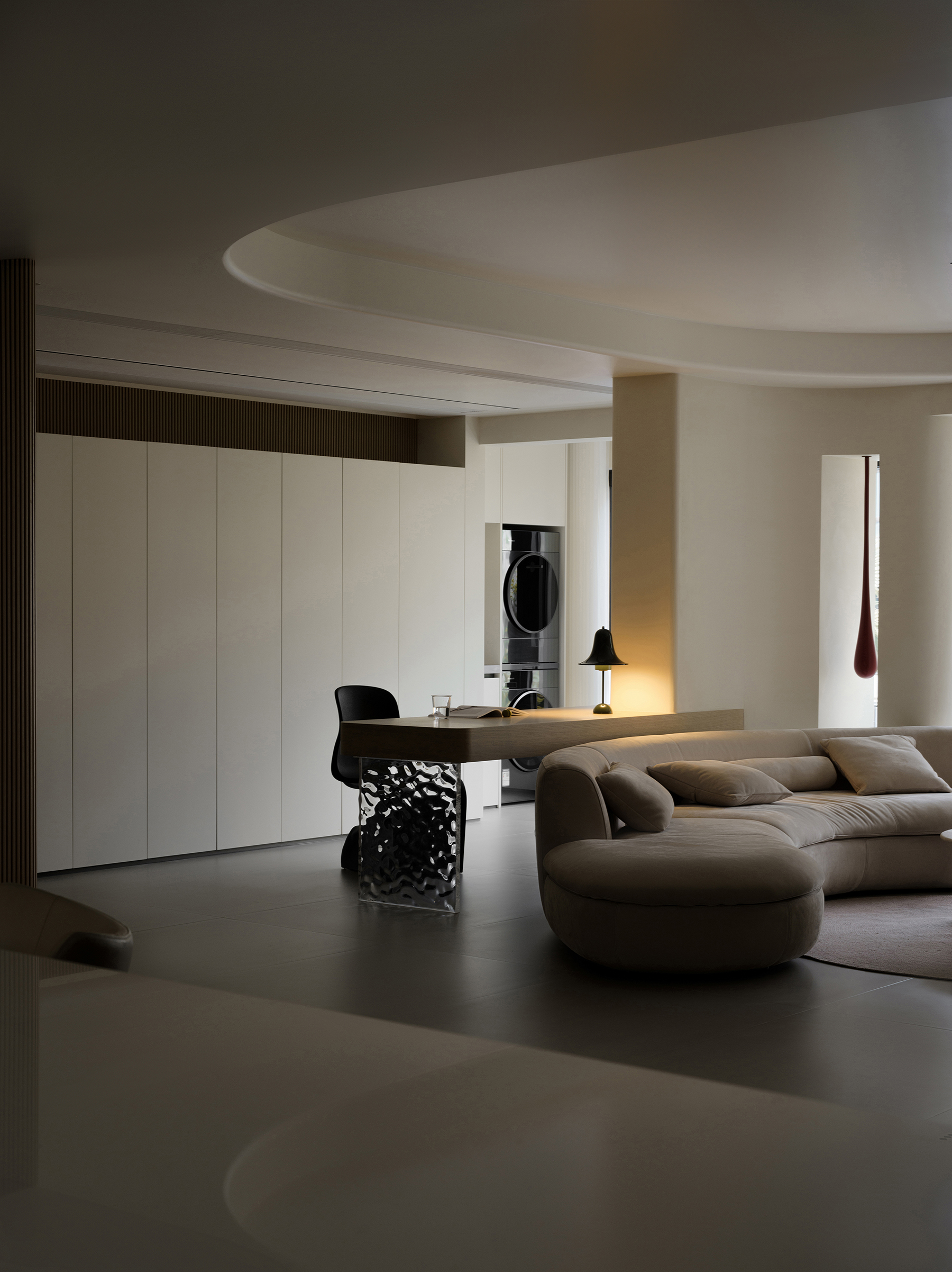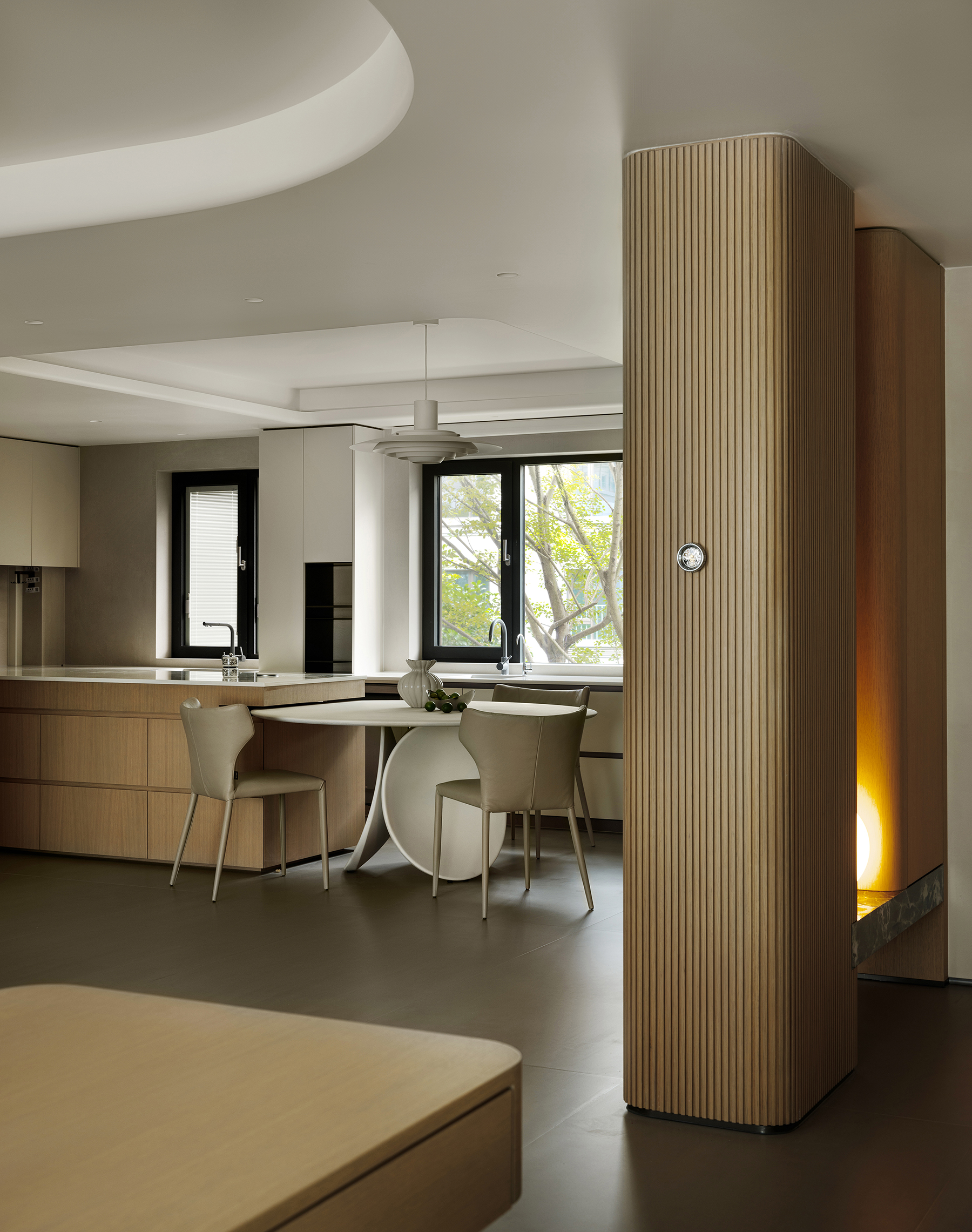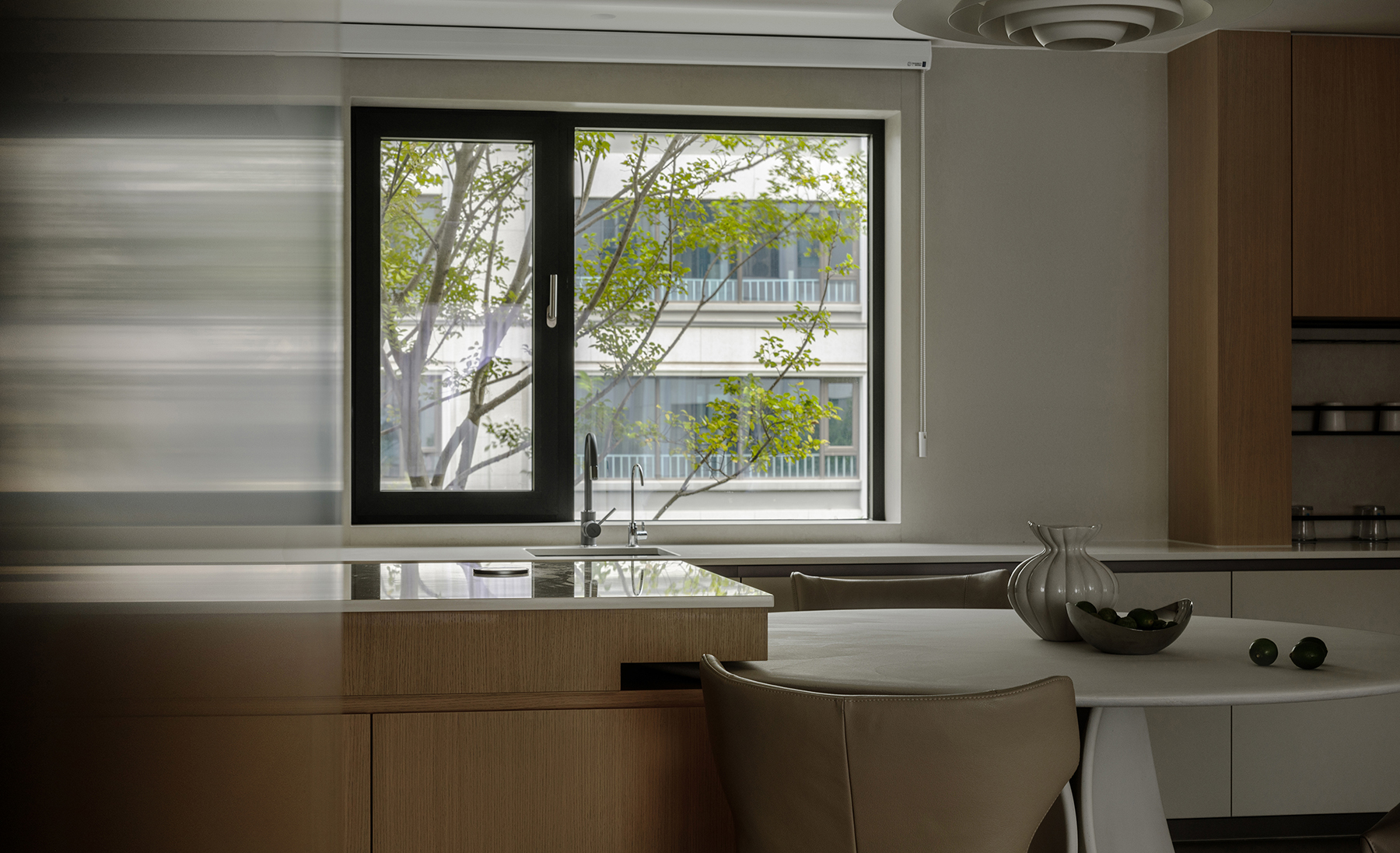 主要公共区域全部敞开互通,阳光透过超大窗户洒进室内,通透明亮,餐厨空间一体,增加了家人之间的互动,长岛台穿插圆餐桌的设计,让餐厨空间多了一份灵动。客厅原始承重柱部分打造成一个沙发背景结合书桌穿插的设计,让功能区有了界线,但又保证互通。集功能、美观、情绪空间于一体。功能区之间动线流畅,又环环相扣,亲密有序。以浅色点缀空间,在围合的场域内形成温暖的磁场,低饱和度的色温,经由光的洗礼,累加出空间柔和的印象。