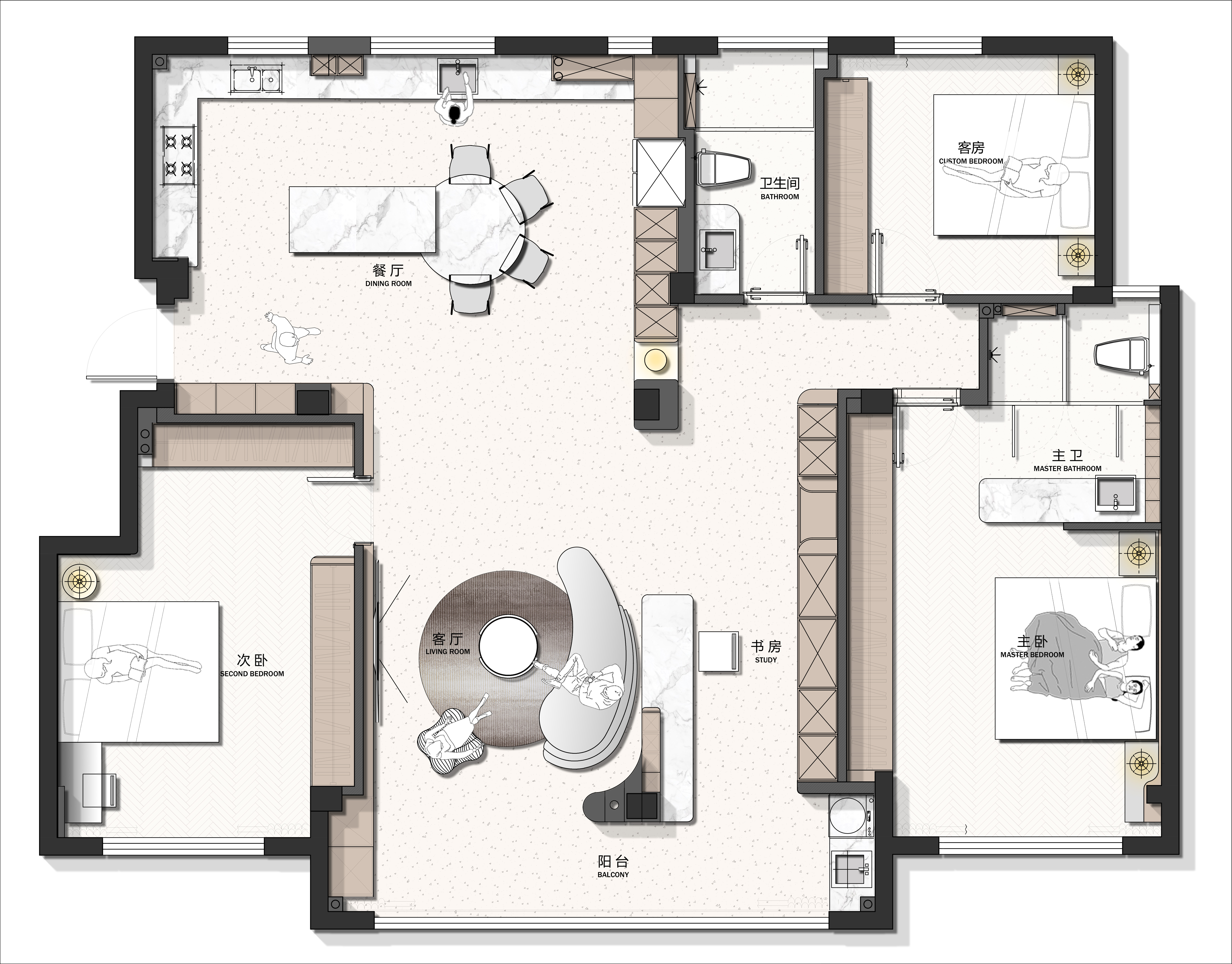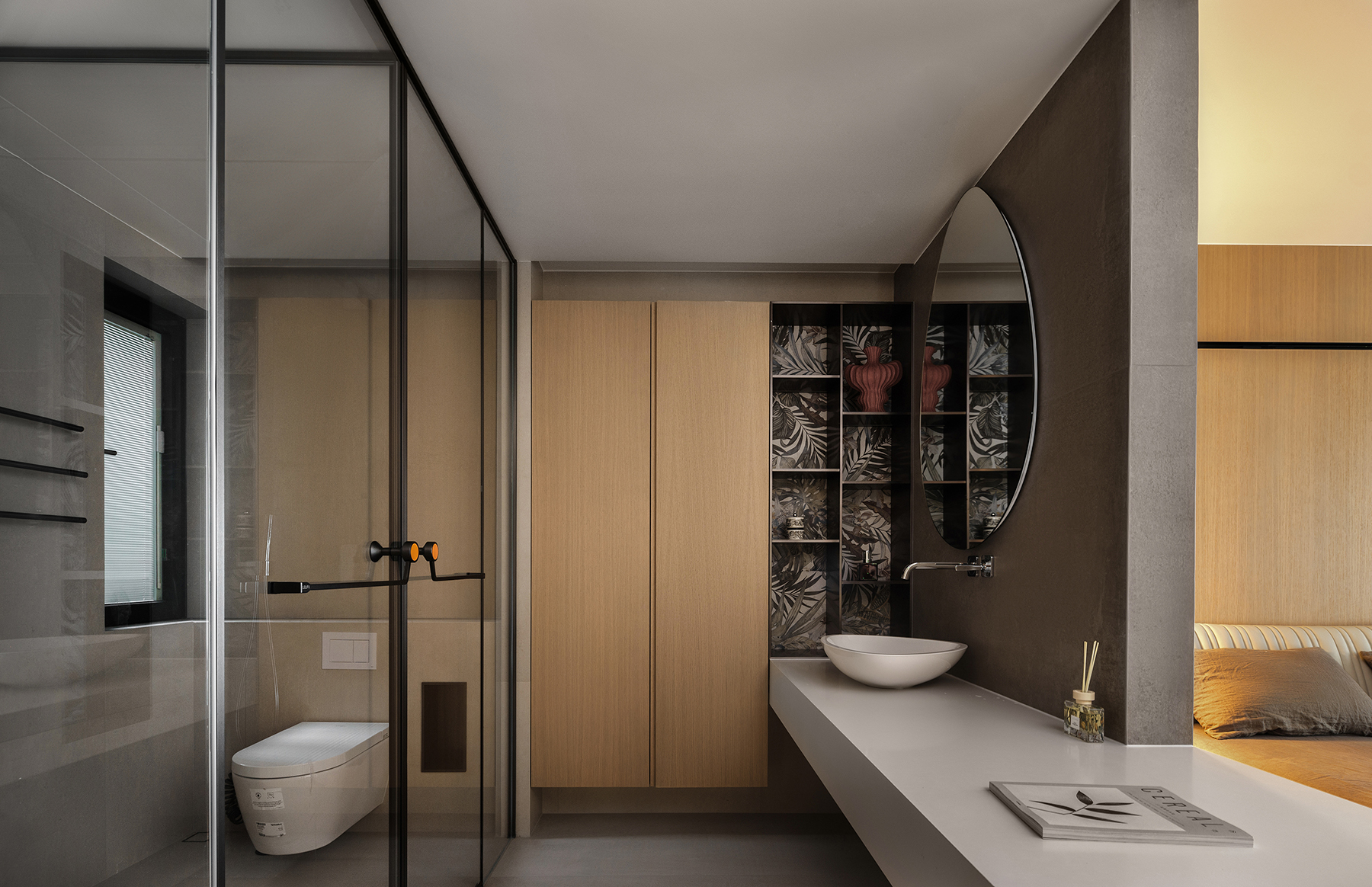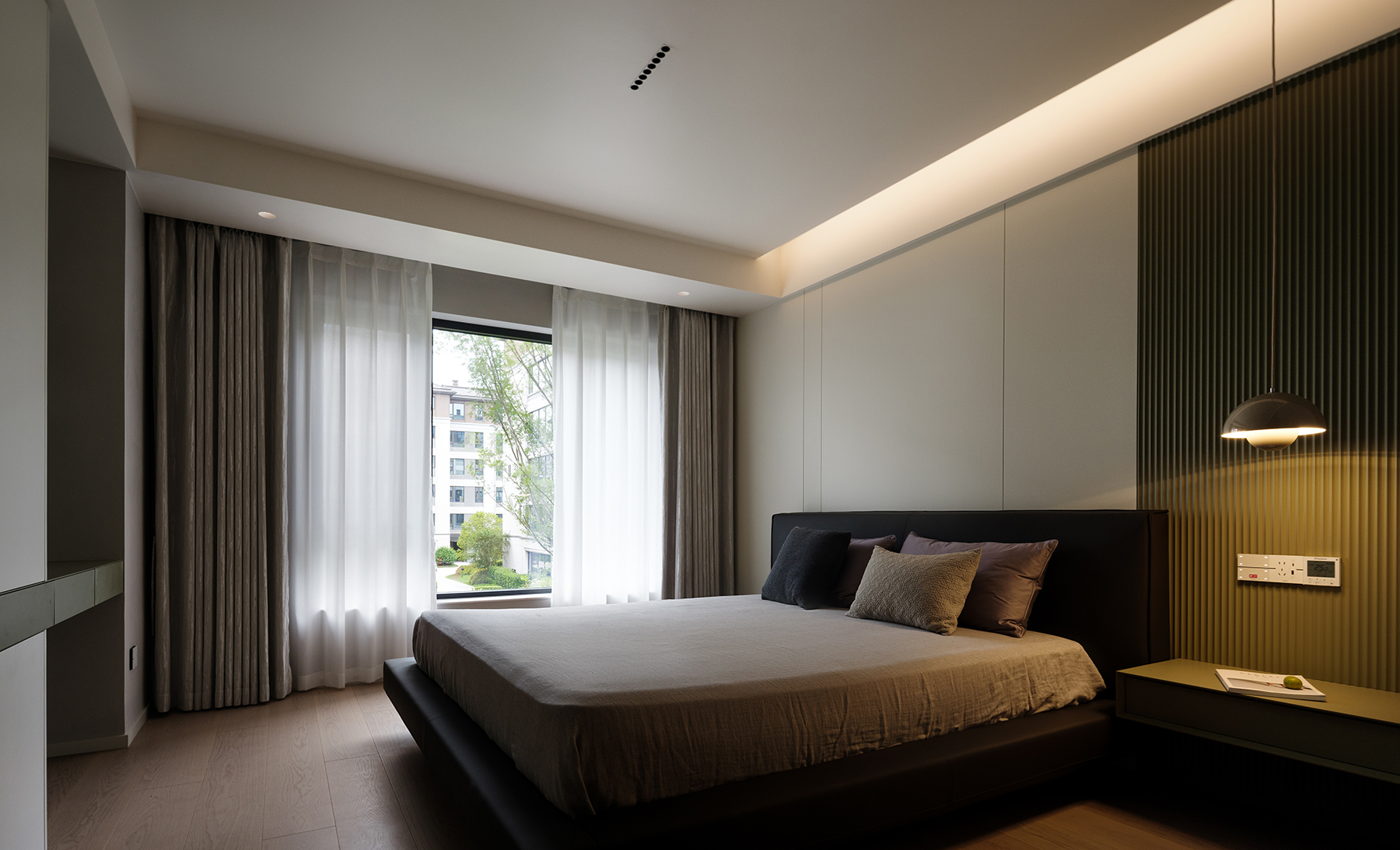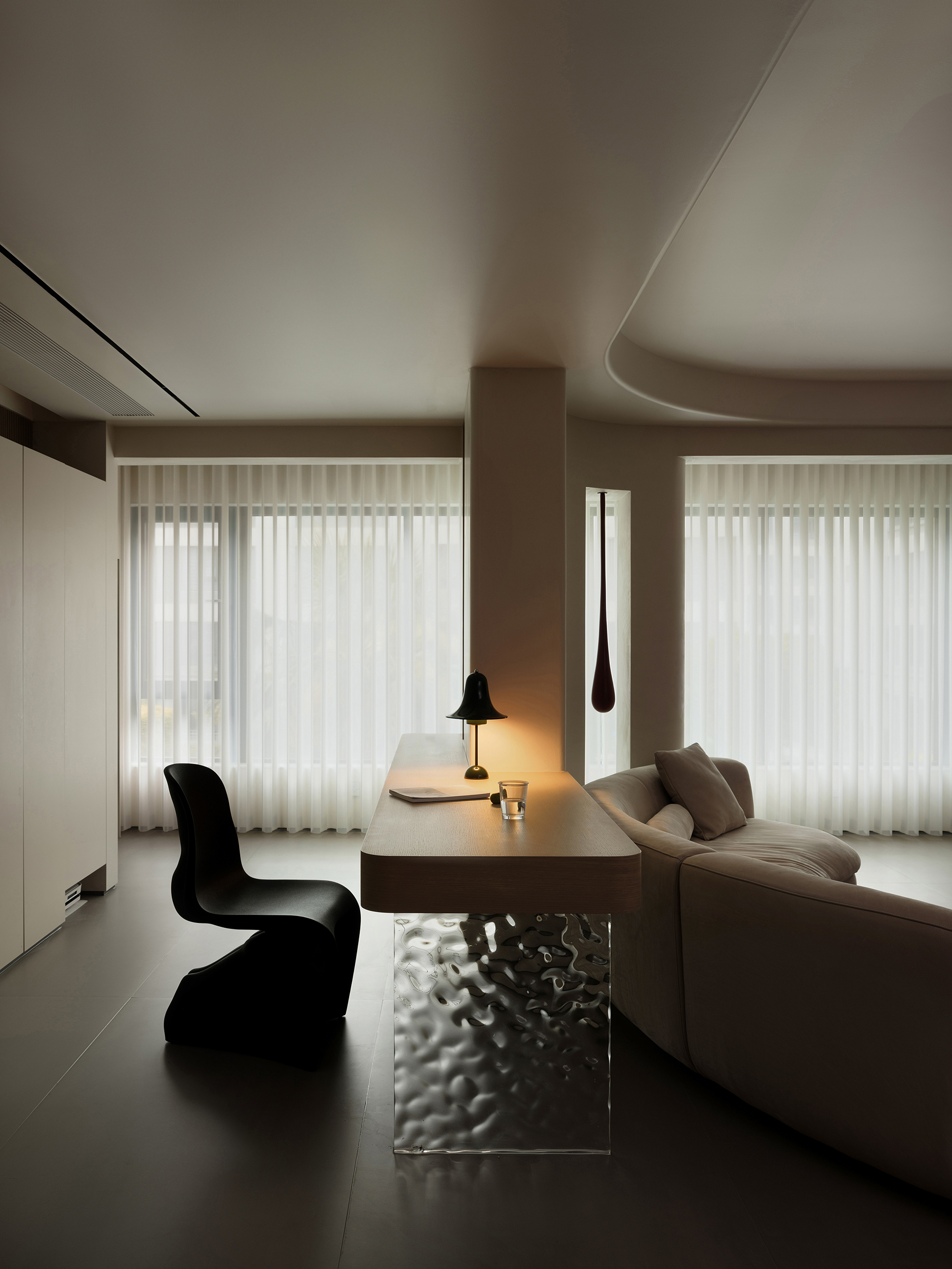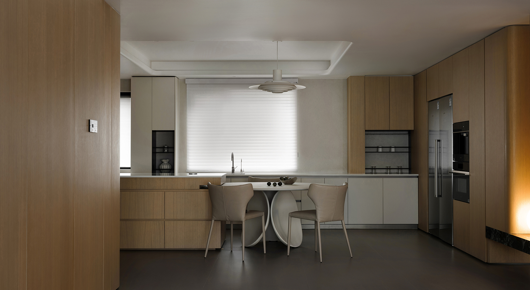 主要公共区域全部敞开互通,阳光透过超大窗户洒进室内,通透明亮,餐厨空间一体,增加了家人之间的互动,长岛台穿插圆餐桌的设计,让餐厨空间多了一份灵动。客厅原始承重柱部分打造成一个沙发背景结合书桌穿插的设计,让功能区有了界线,但又保证互通。集功能、美观、情绪空间于一体。功能区之间动线流畅,又环环相扣,亲密有序。以浅色点缀空间,在围合的场域内形成温暖的磁场,低饱和度的色温,经由光的洗礼,累加出空间柔和的印象。