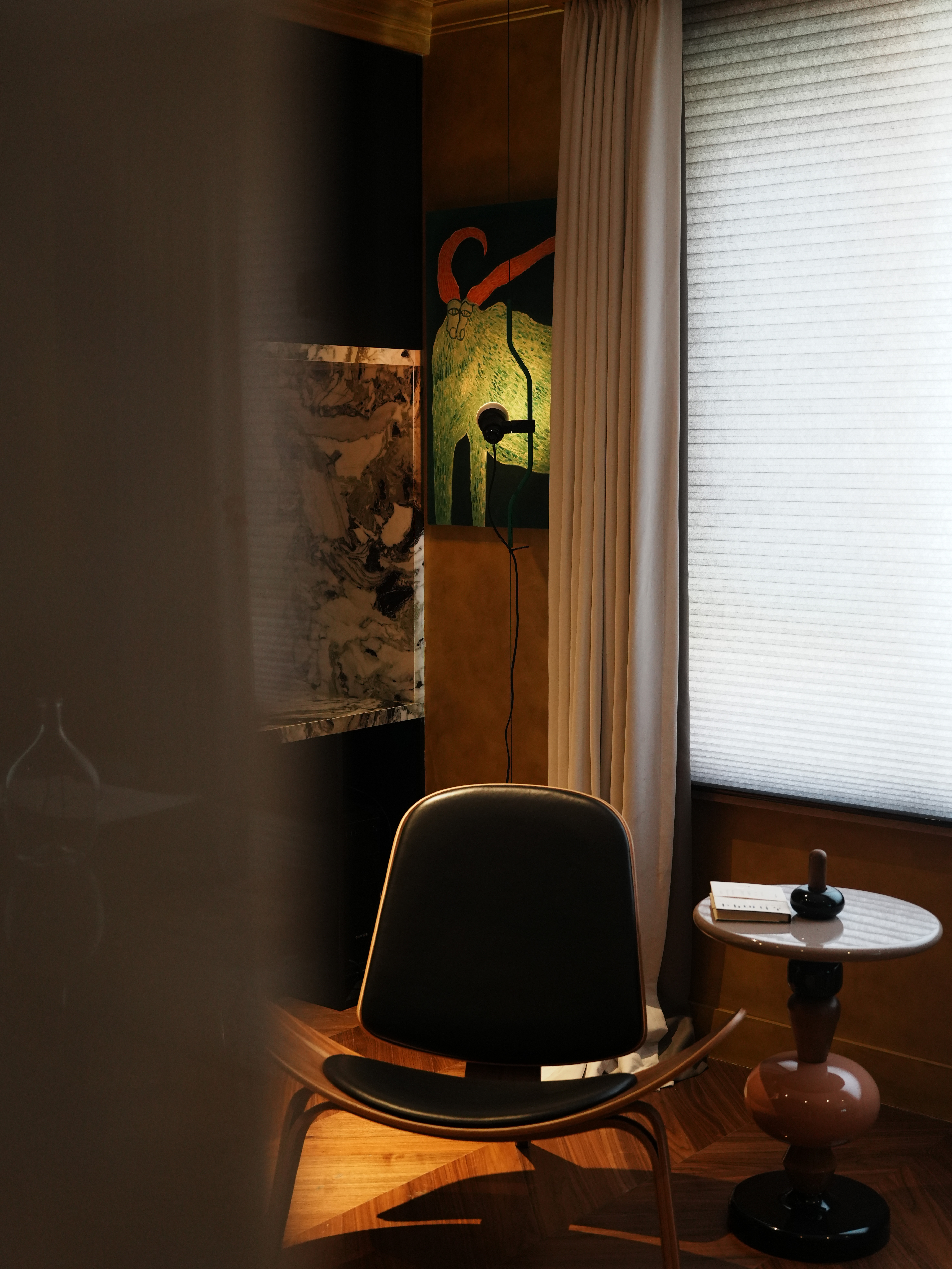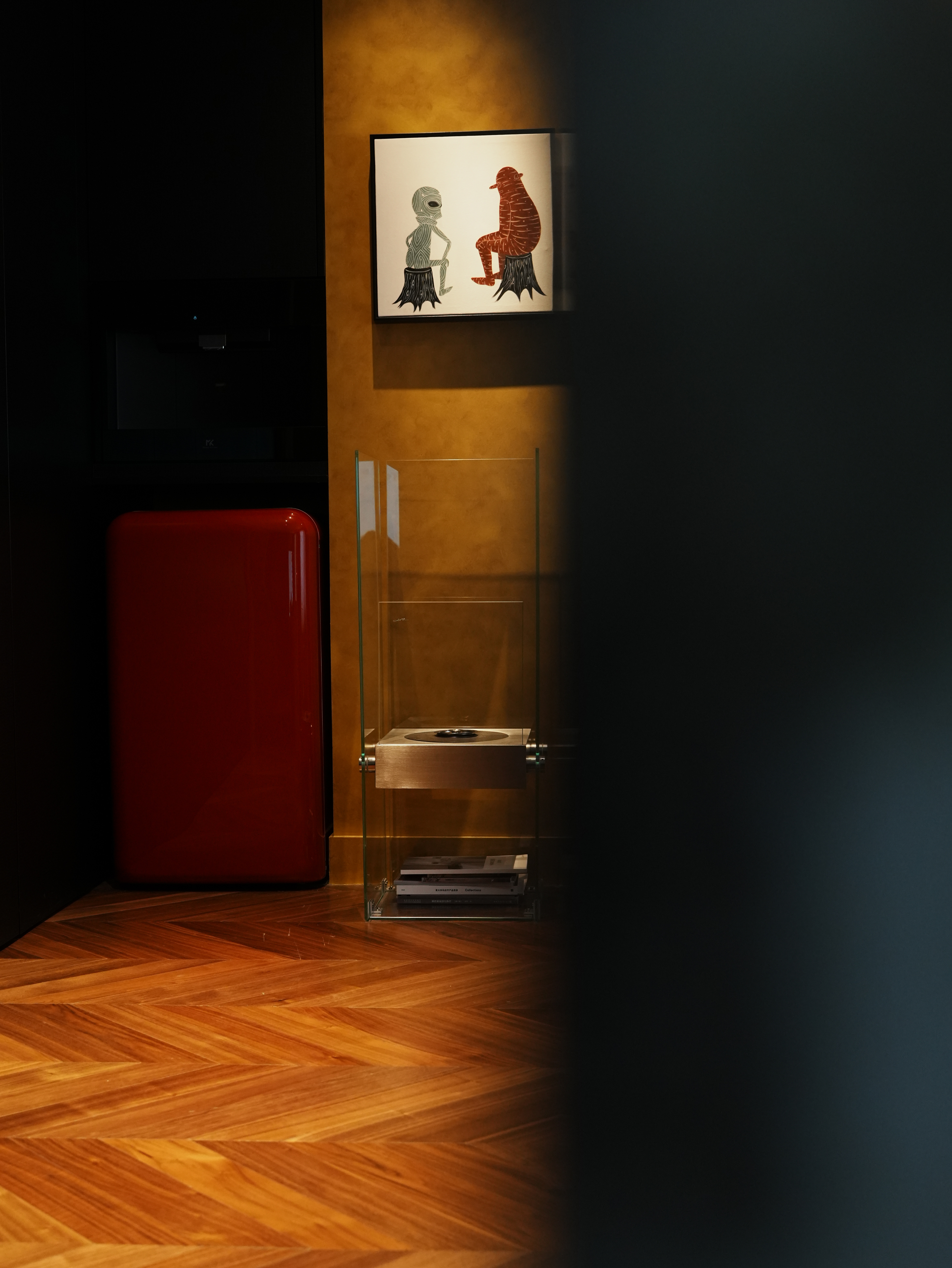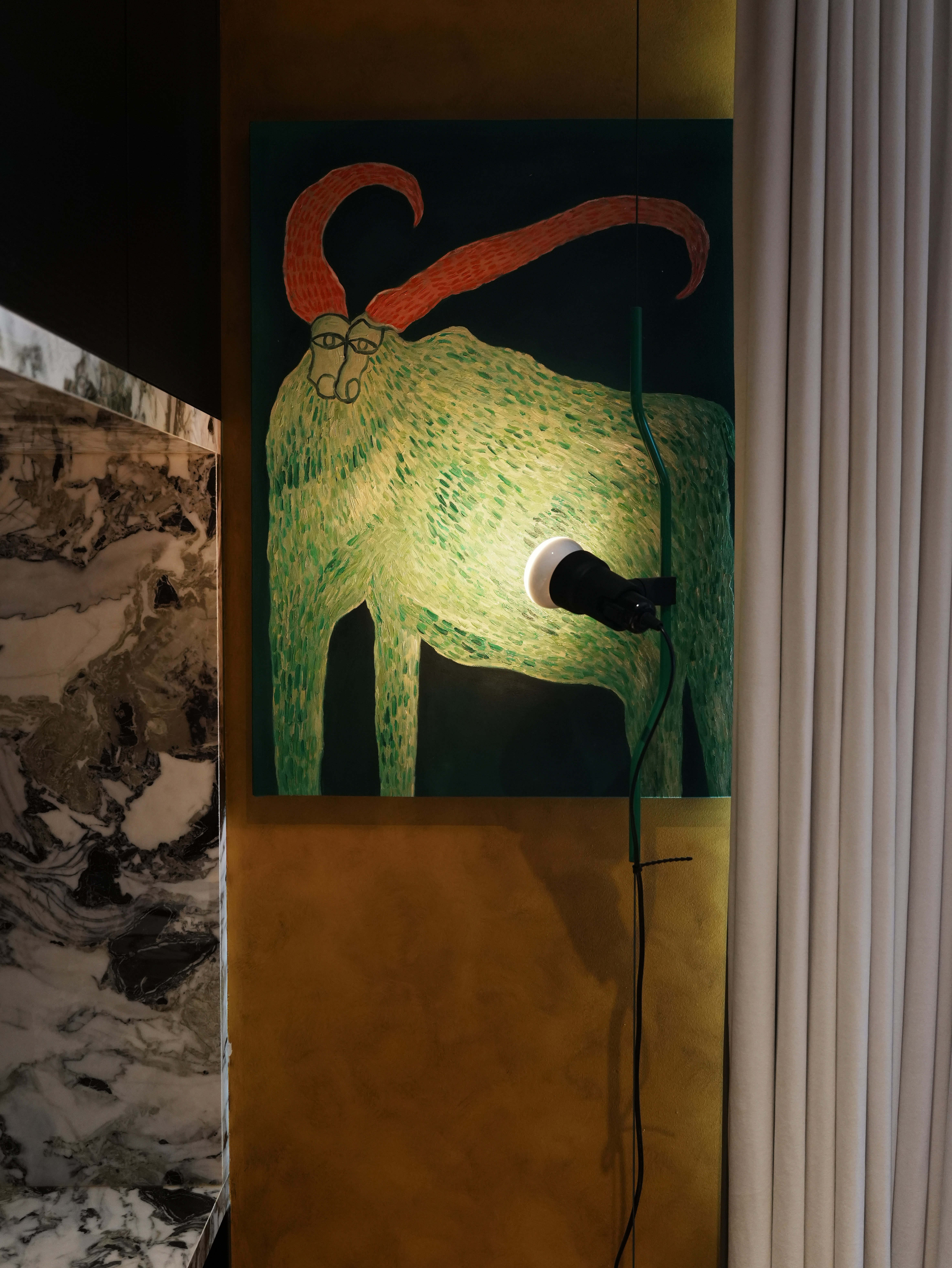 冷翡翠岩板、真火壁炉、红色水槽、“骨骼桌”亦或是墙上那副“平躺”的油画,每一处充满刻意,却让空间又别具一格和充满趣味性,这种不迎合又极具情绪感的氛围总是让人欲罢不能。
