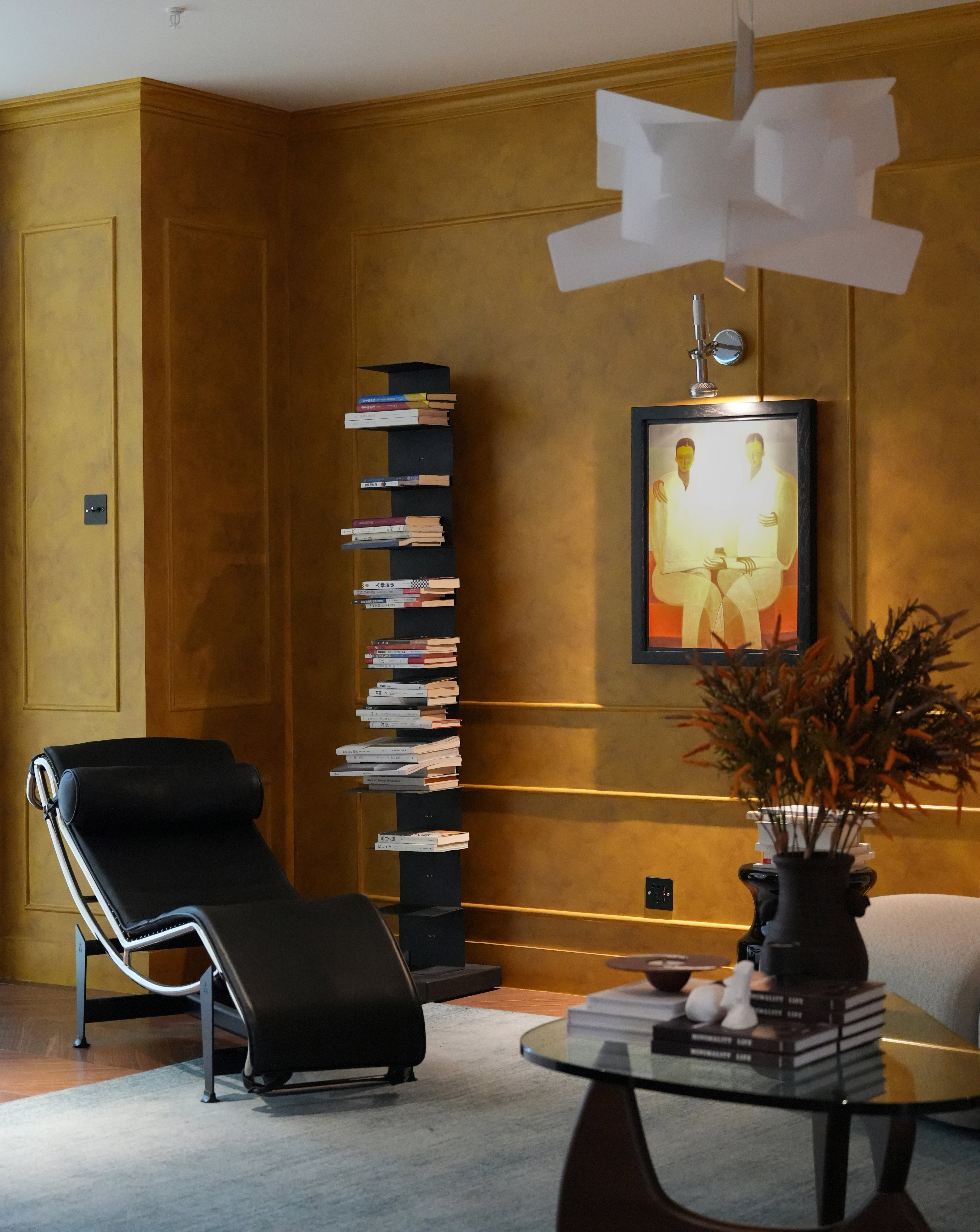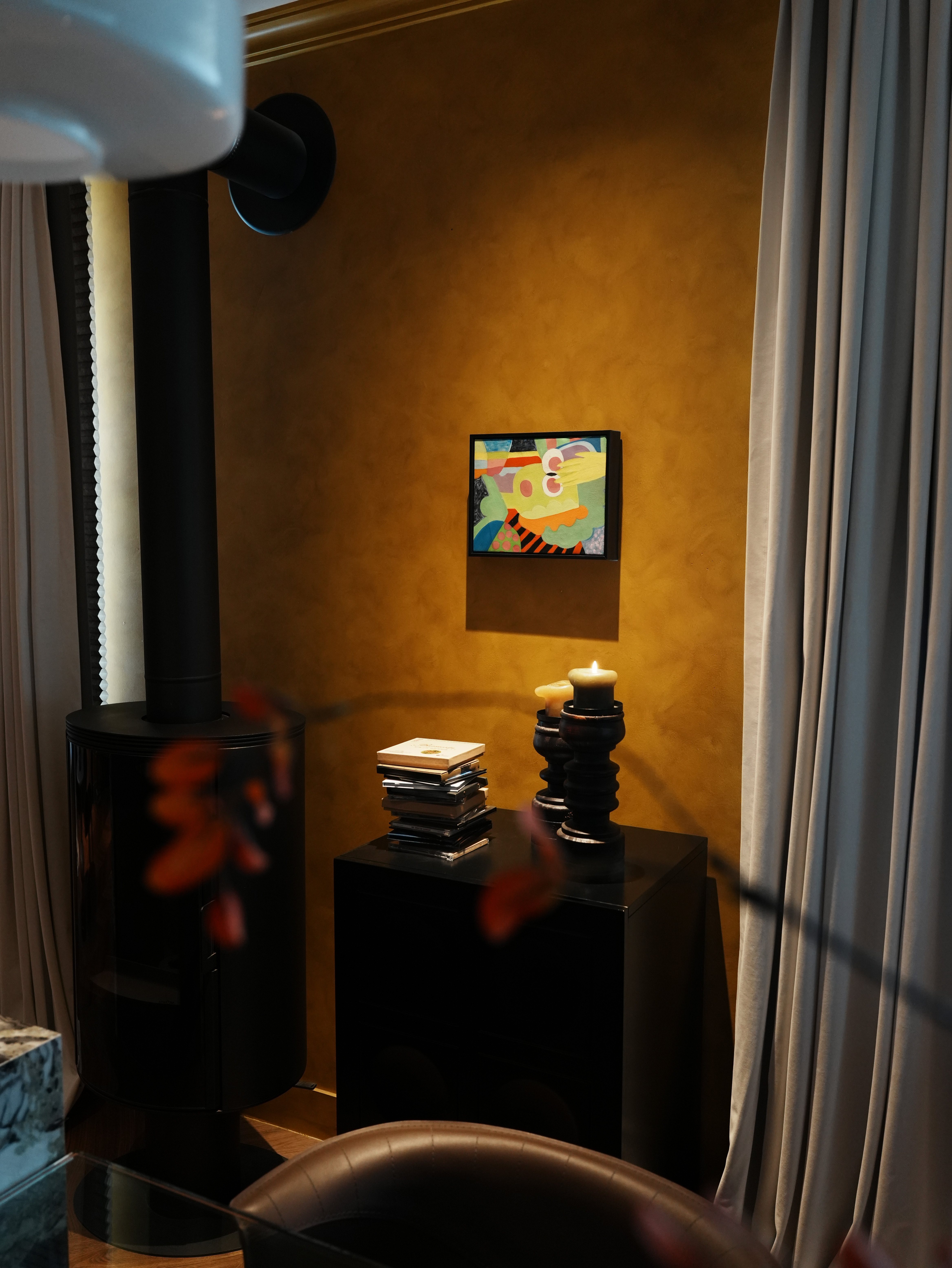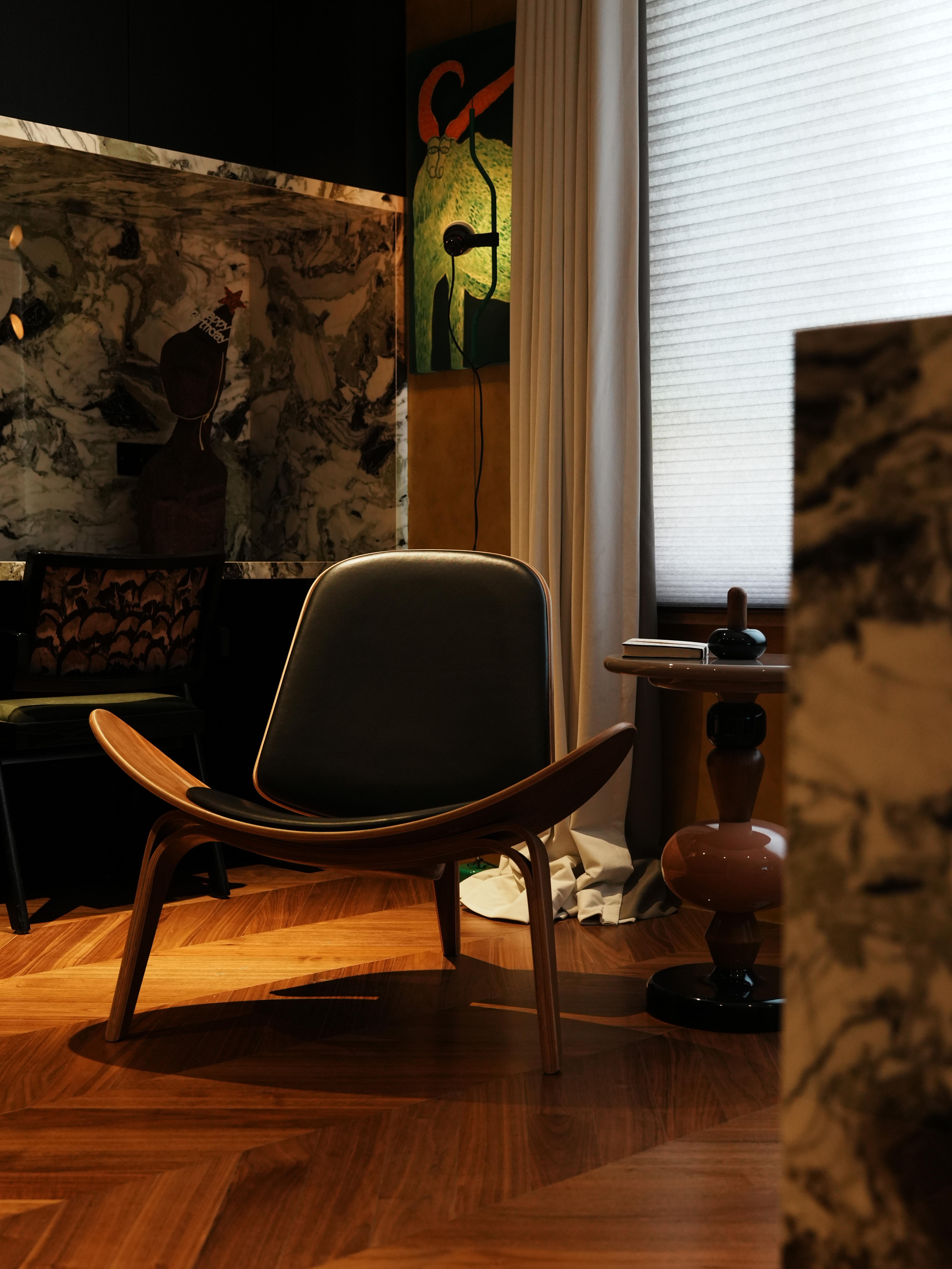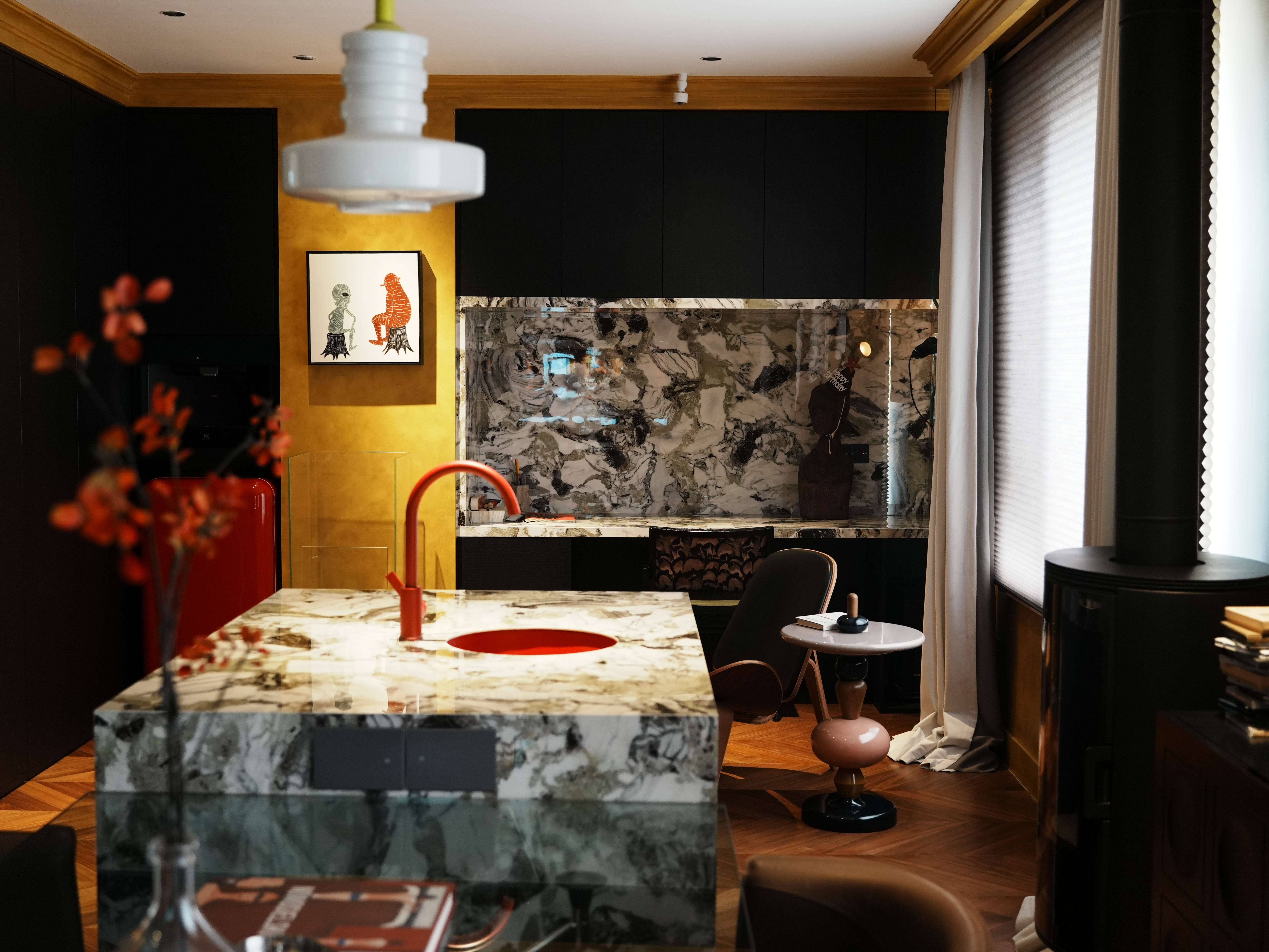 冷翡翠岩板、真火壁炉、红色水槽、“骨骼桌”亦或是墙上那副“平躺”的油画,每一处充满刻意,却让空间又别具一格和充满趣味性,这种不迎合又极具情绪感的氛围总是让人欲罢不能。