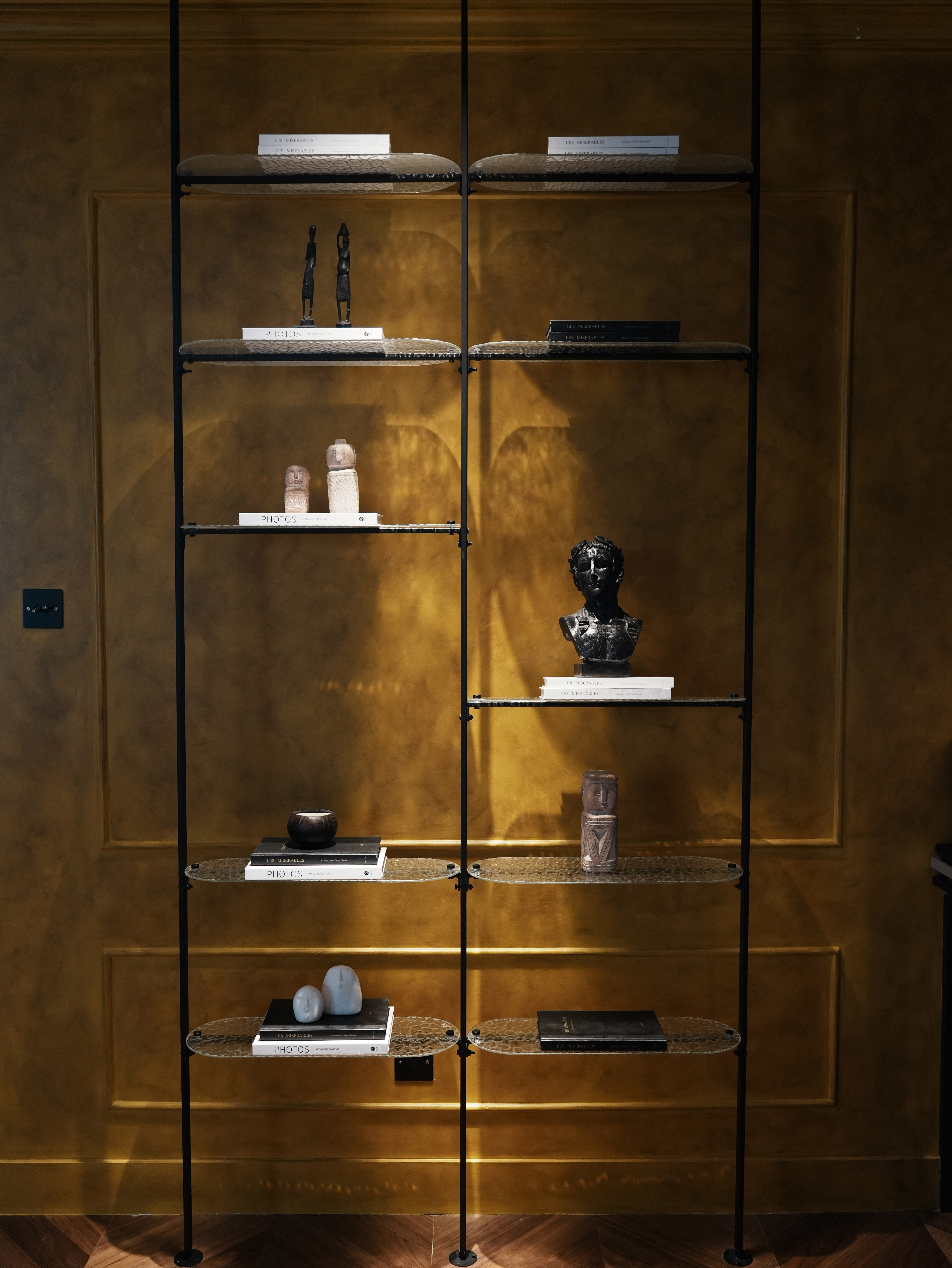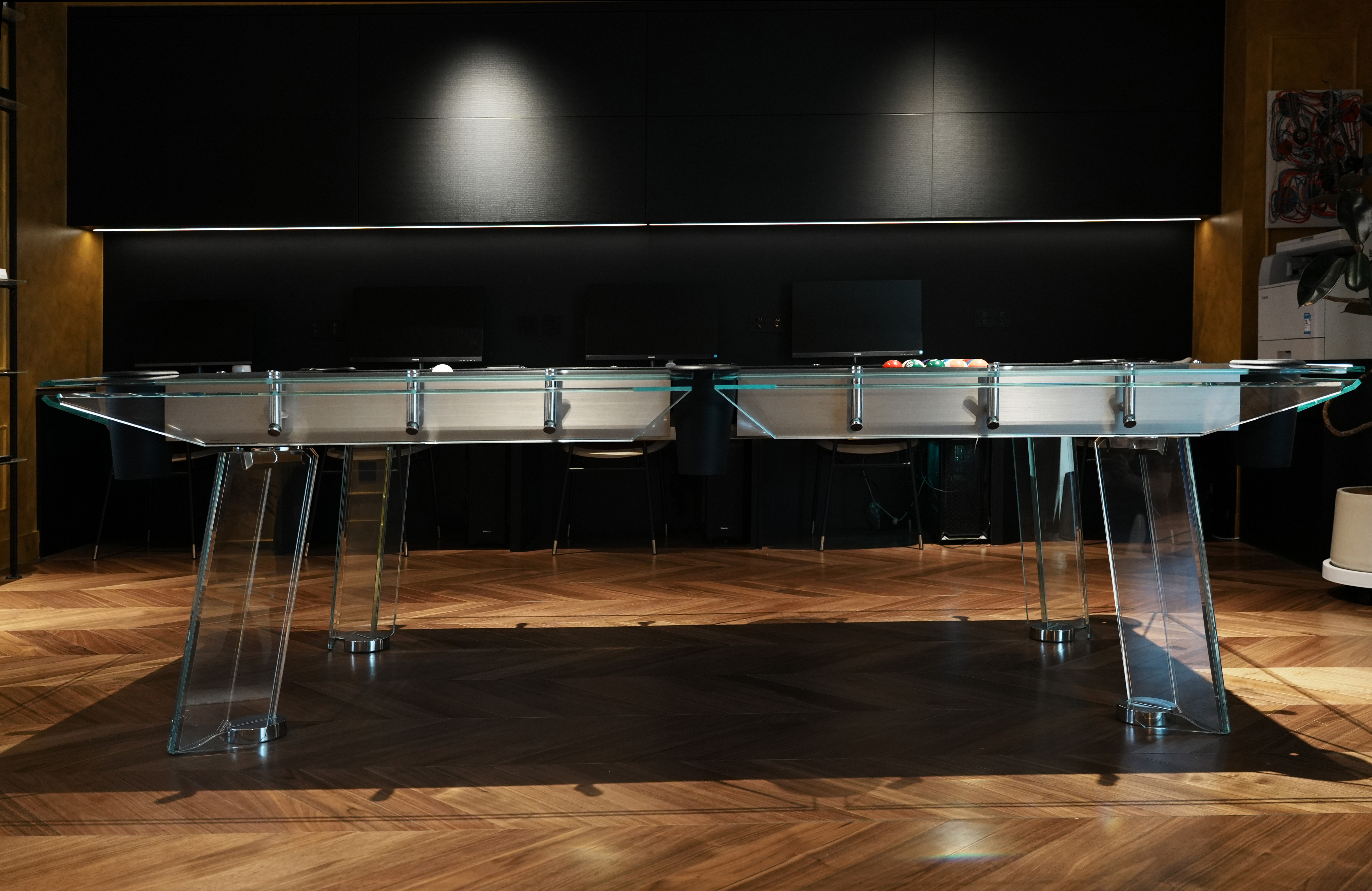 黑色墙柜代表了神秘、奢华,营造出一种深沉的氛围,通过纹理等细节造型赋予了它独特的艺术感。而玻璃材质台球桌更加通透,在灯光的照射下格外纯净通透,与其后的黑形成明暗反差。