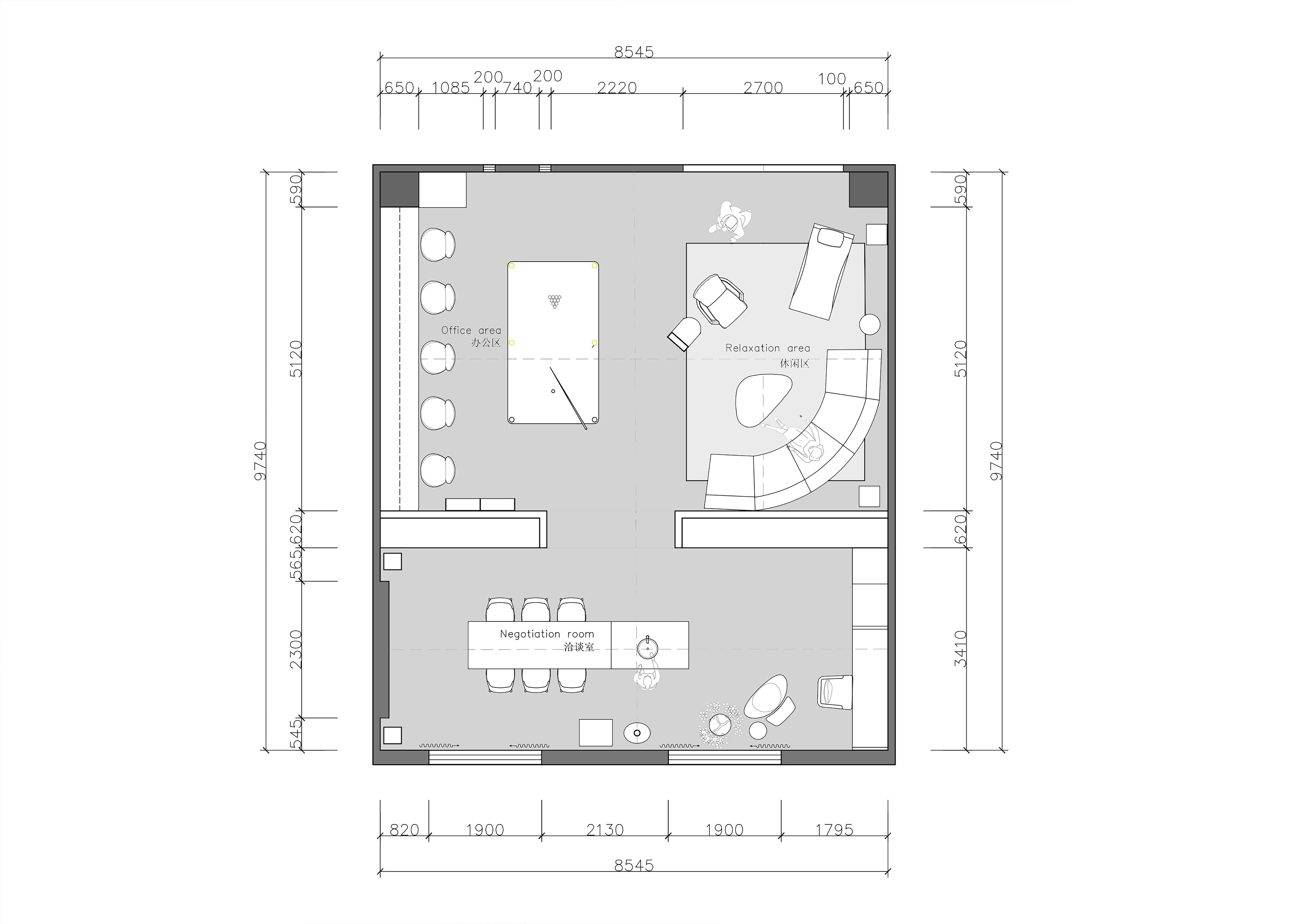 想做一个尽可能敞开式的空间感,所以只是做了两个大的分区,一个是洽谈区,一个是休闲区和办公区,放置了台球桌也是希望创造一个工作和娱乐不要有太强的界限感的空间。