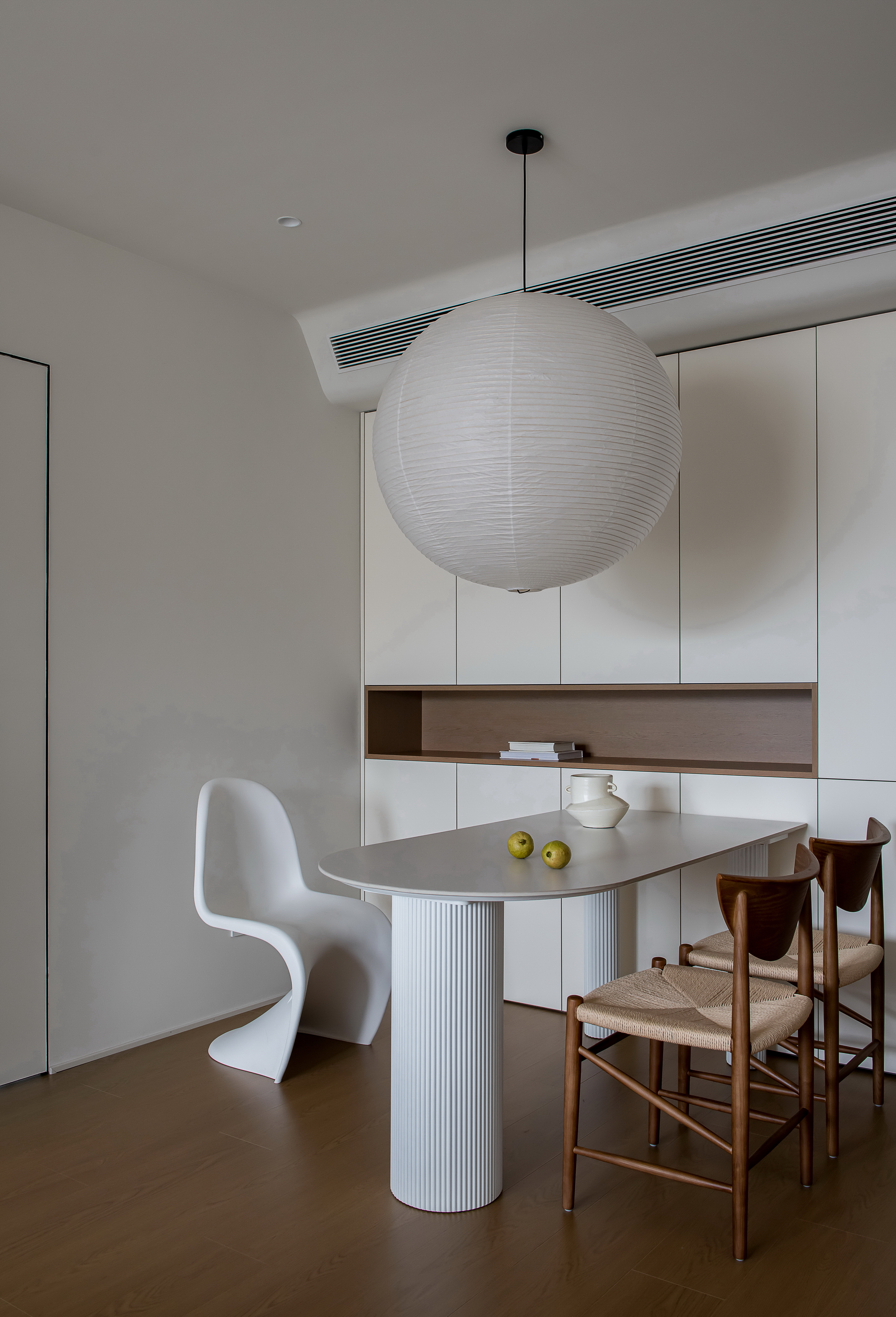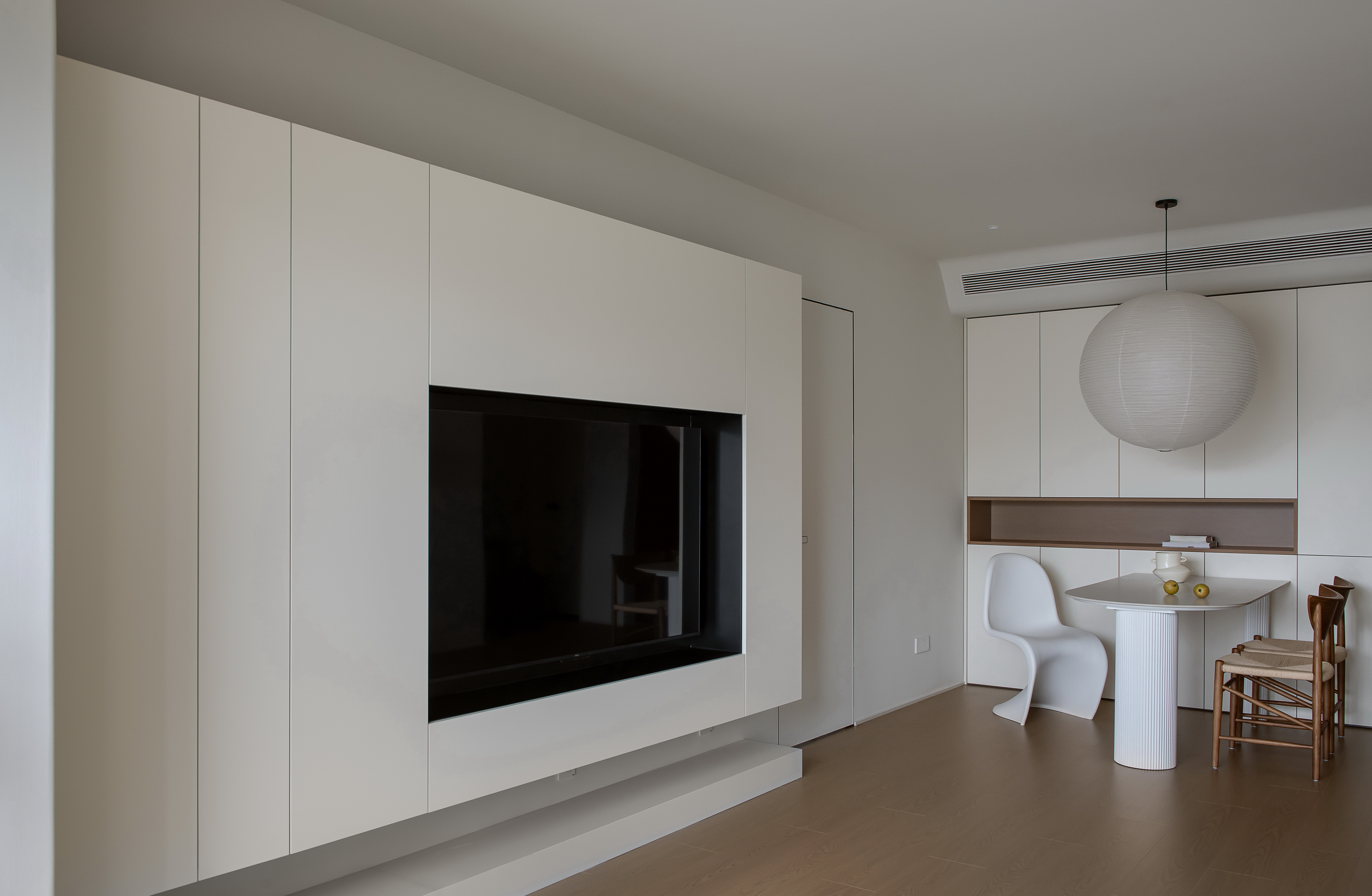 3、设计团队秉承不过度设计的理念,针对整个房屋布局及使用情况,重新设计了天花造型、照明系统及通风系统。取消了客厅原有的空调柜机,将天花设计为无主灯大平顶,并将空调设备完美的隐藏进天花内。空调出风口所在吊顶位置作了斜面设计,在营造高级感风格造型的同时,也解决了冬天使用暖风时热风向上漂浮的问题,使用合理巧妙的设计手法增加客厅美观度和空间感。