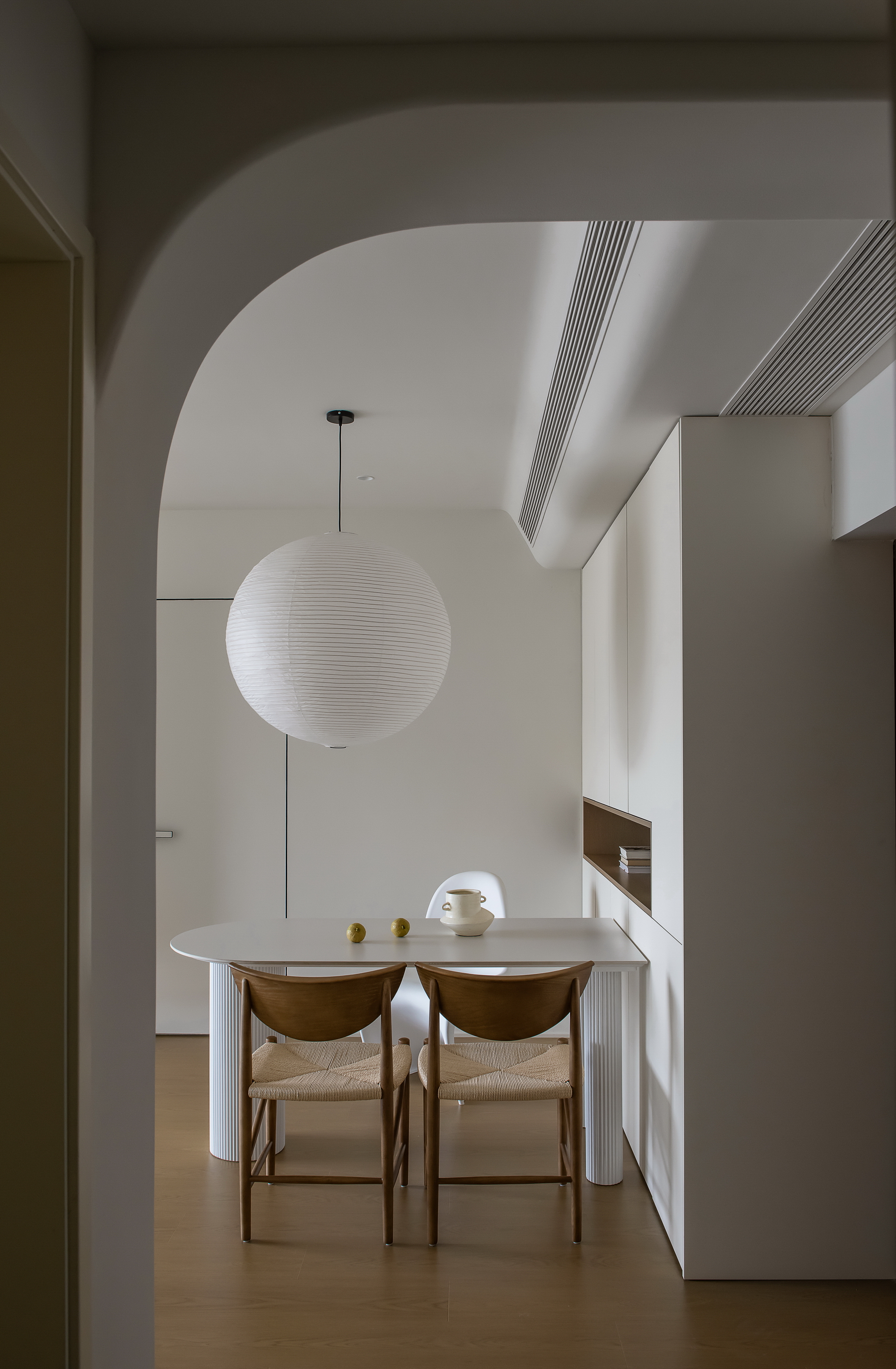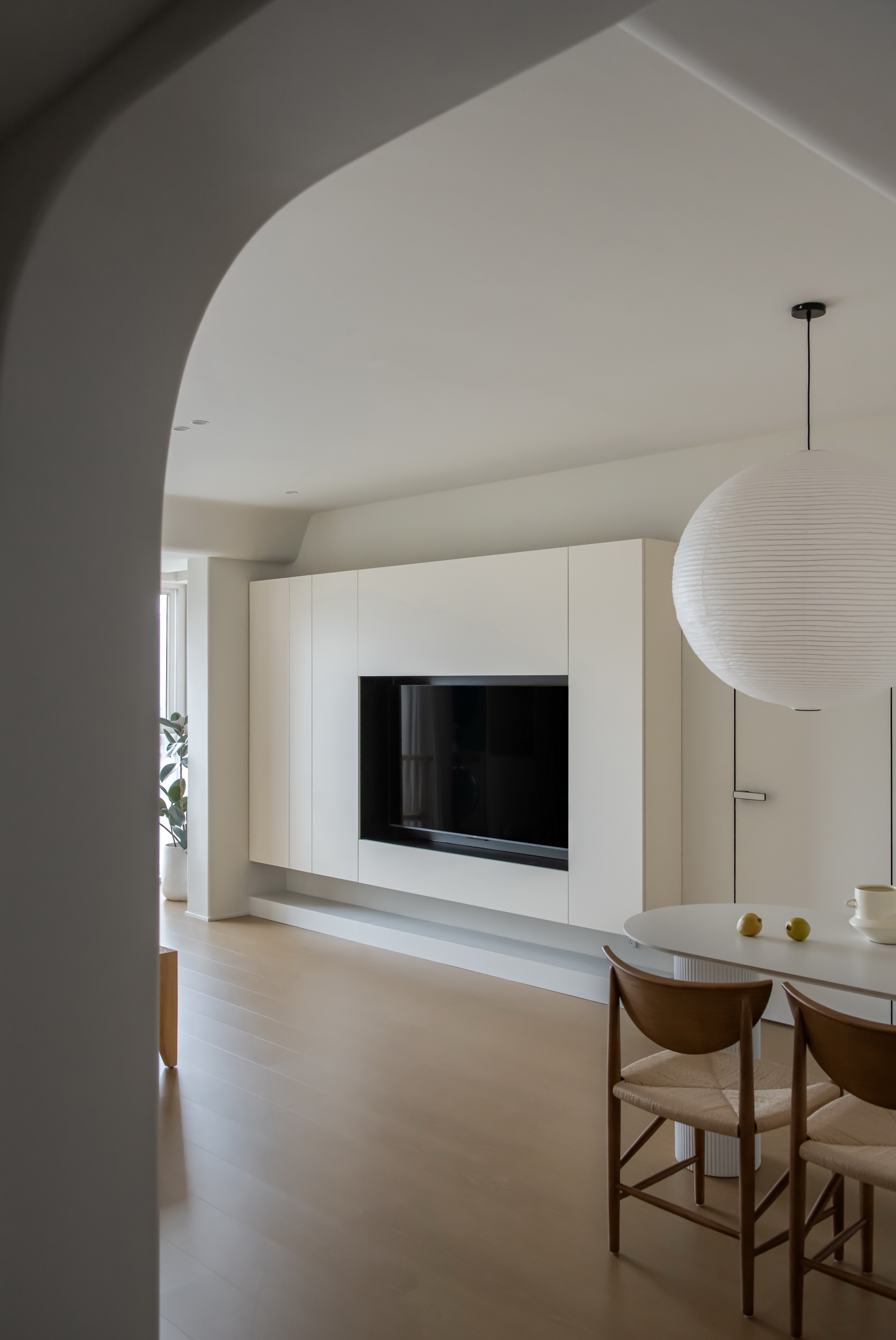 空间布局:1、考虑到家有小朋友,墙面阳角均进行了圆弧设计,与吊顶的弧形造型相呼应。厨房门口垭口亦做了弧形处理,墙顶面米色乳胶漆一体通刷增加空间反射光强度。