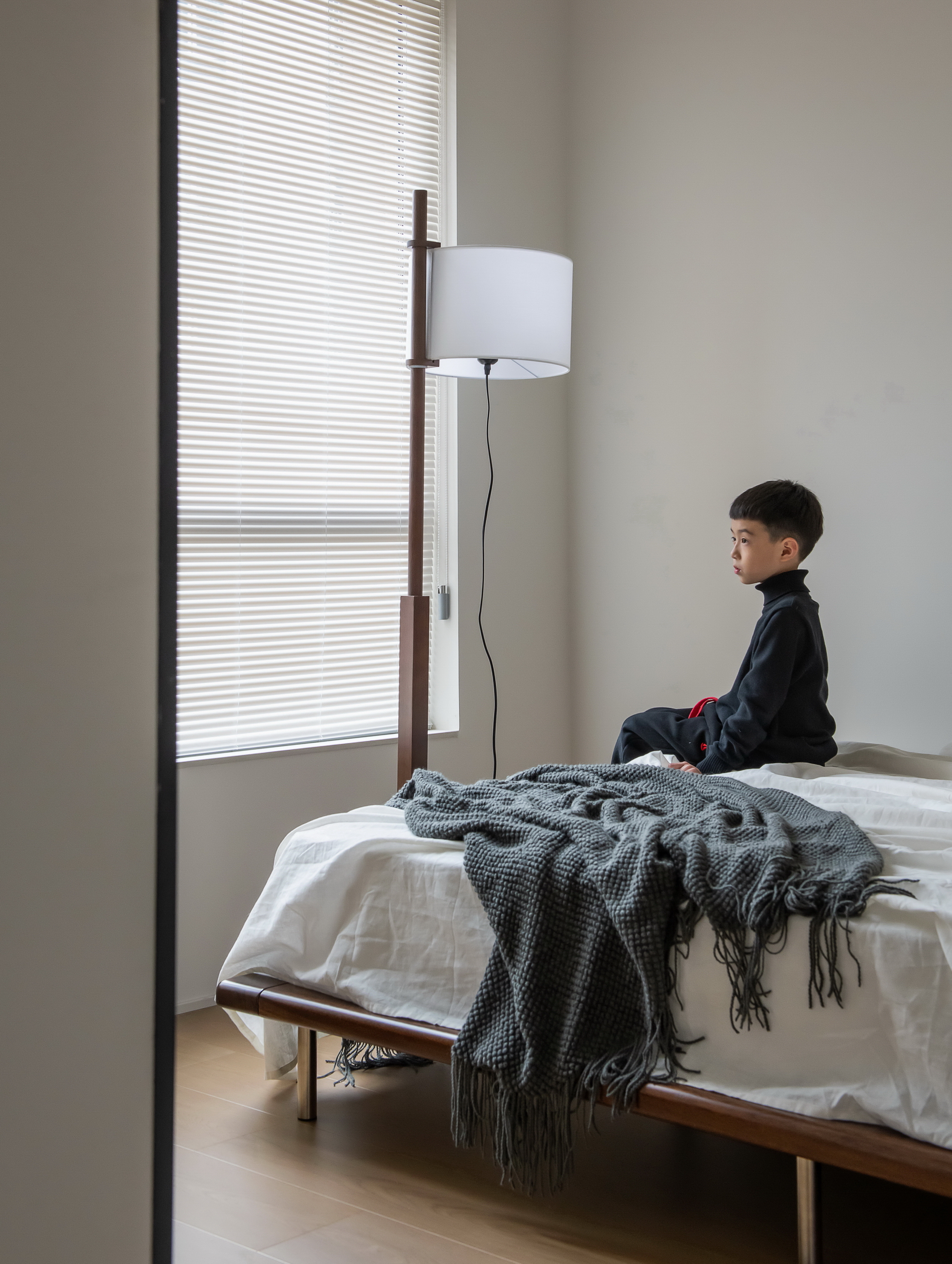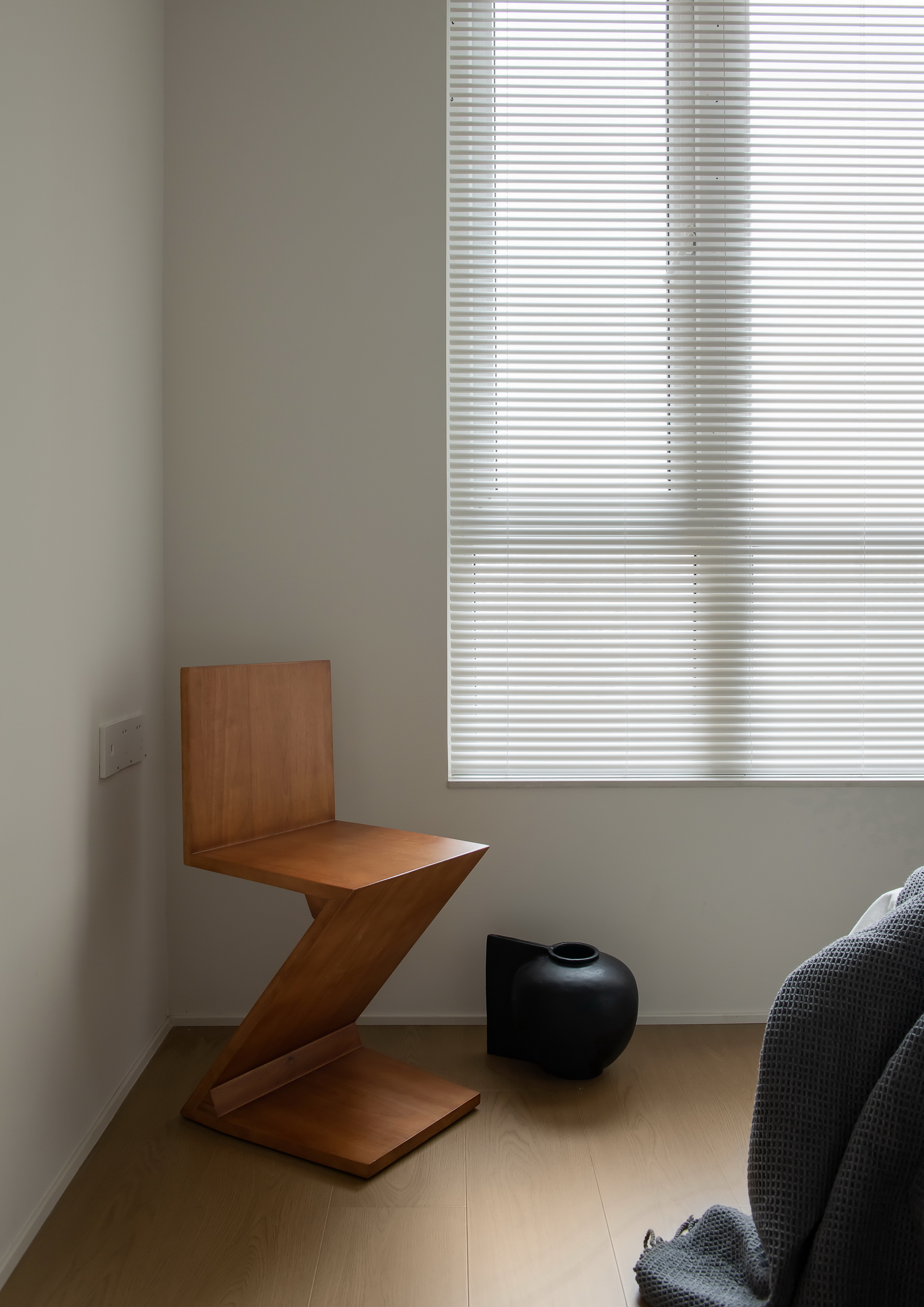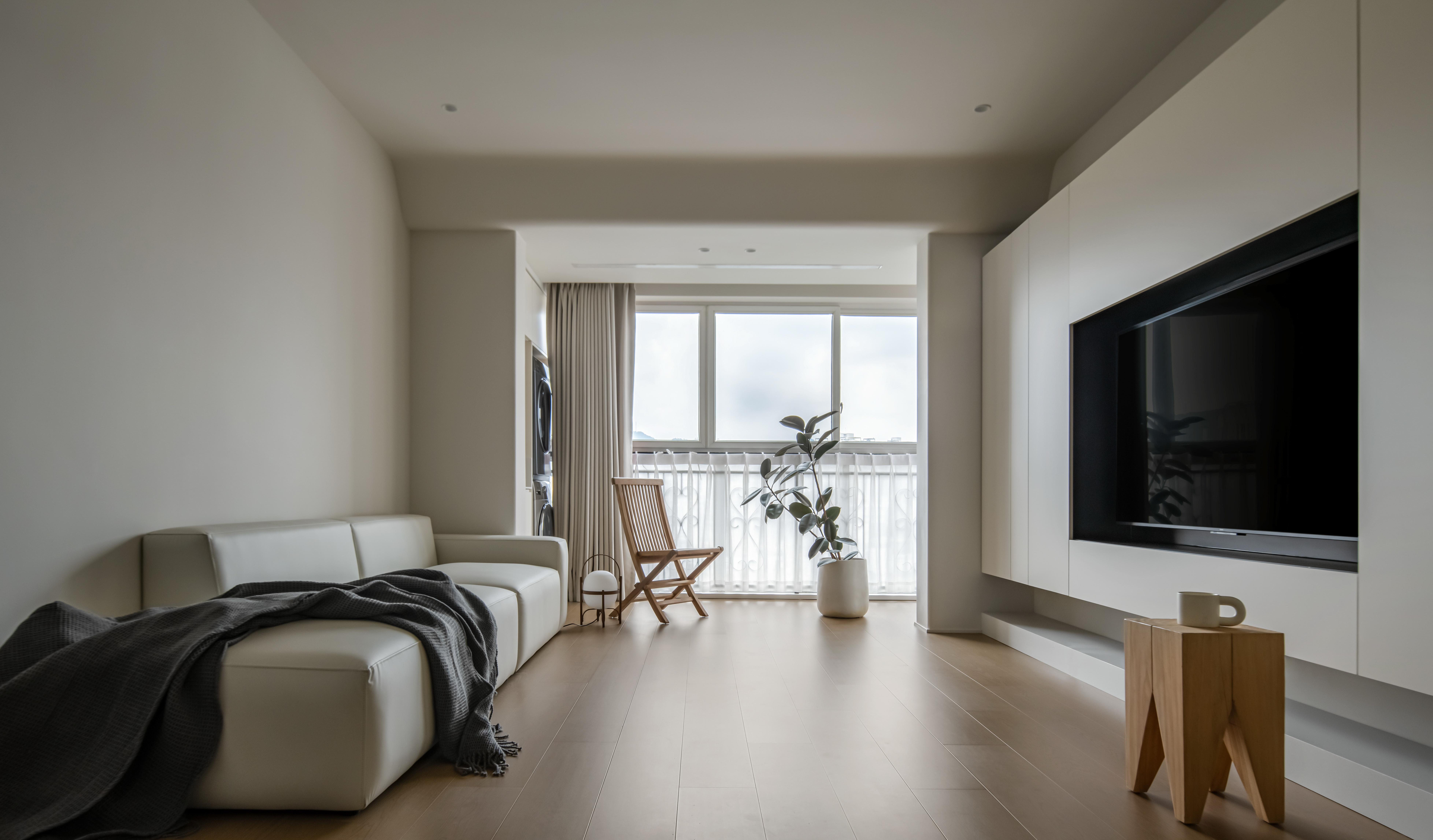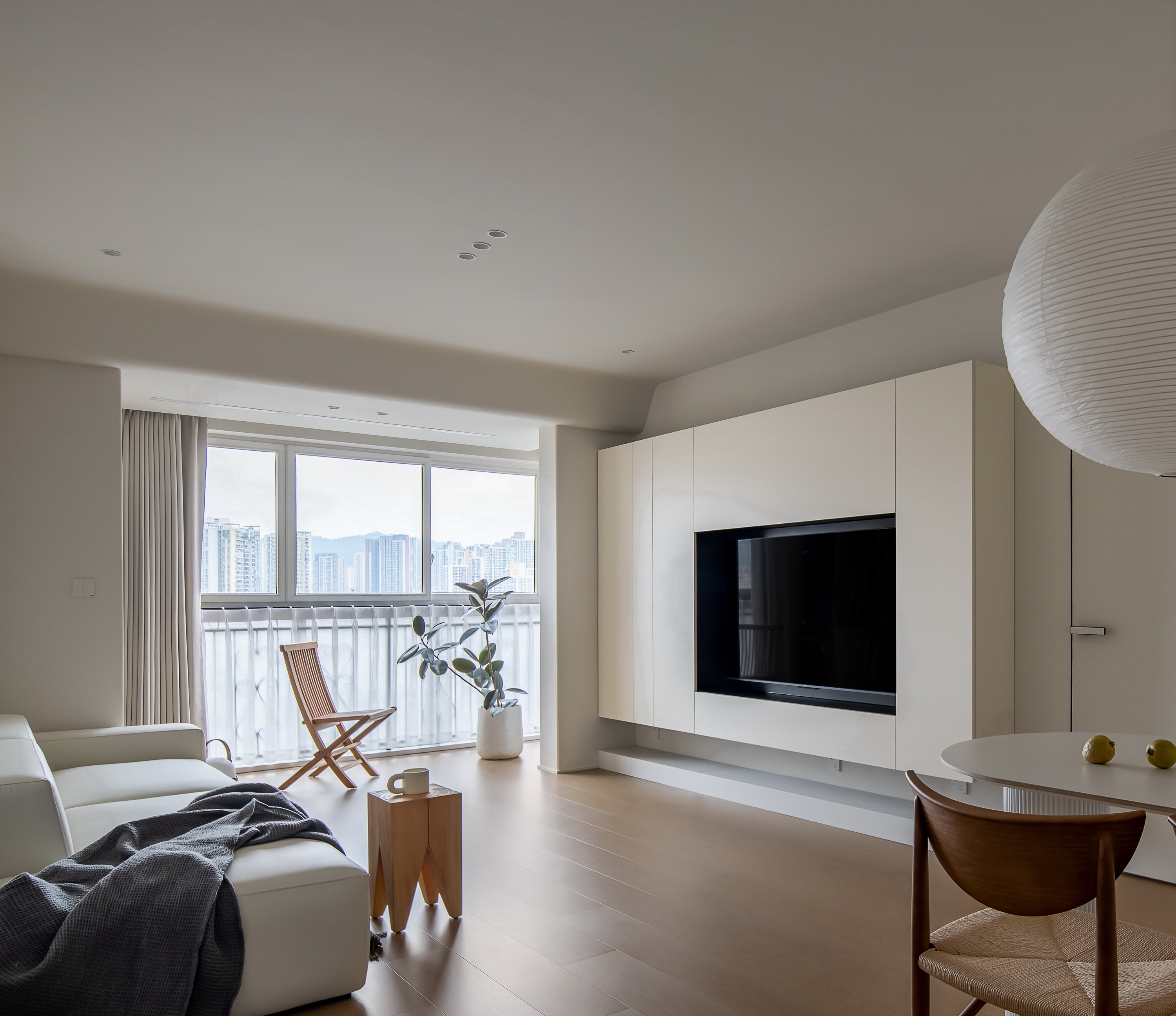 2、针对采光及通风问题,设计团队决定拆除原客厅与阳台之间的塑钢门连通两个空间,尽量引入更多的自然光线及新鲜空气进入室内。对原有的落地窗采用固定半高纱帘的设计方式解决了对面楼宇的对视问题,在保护隐私的同时又能获取最佳的采光,阳台两侧的卧室窗子则通过百叶窗帘的设计来达到相同的目的。
