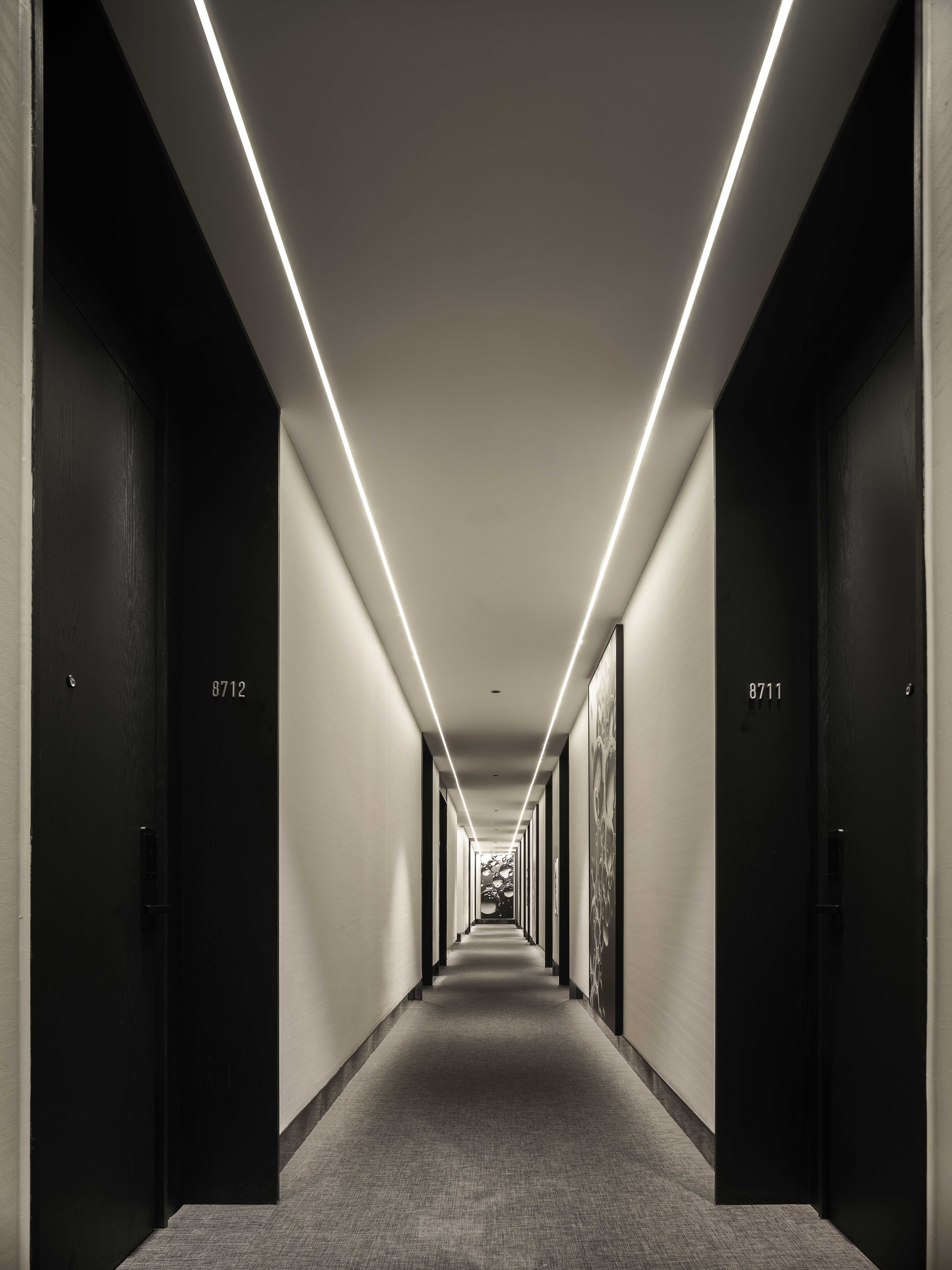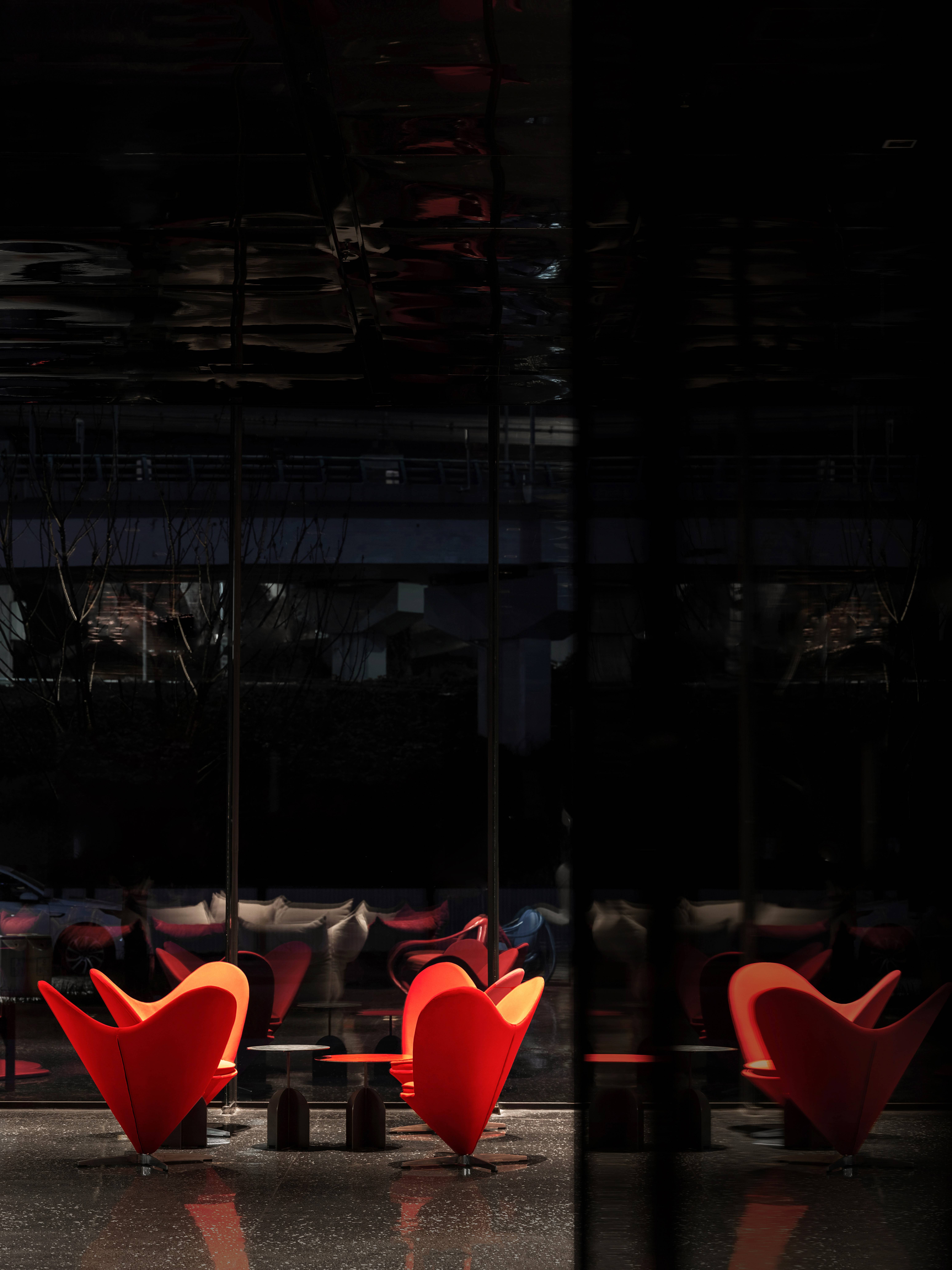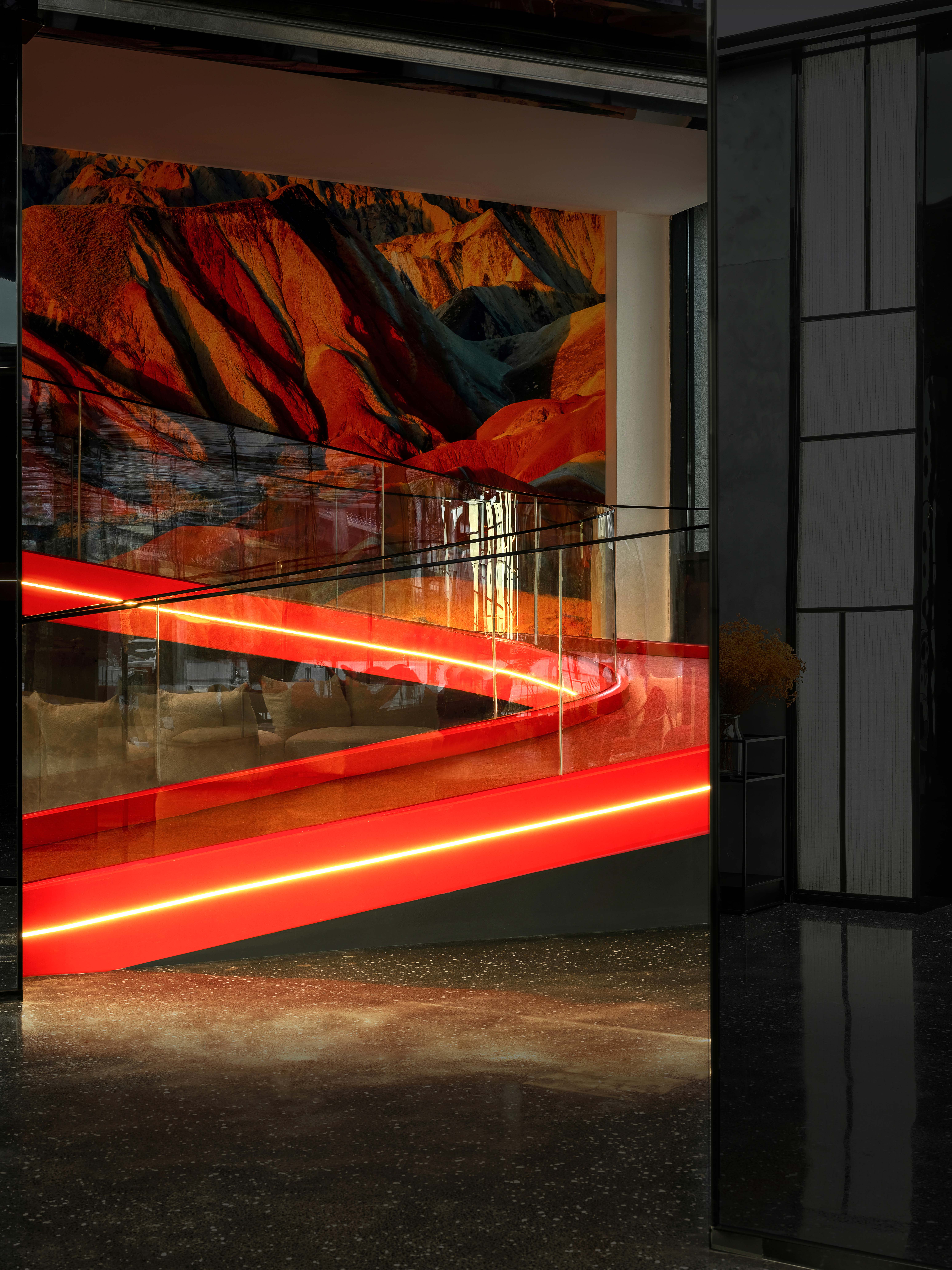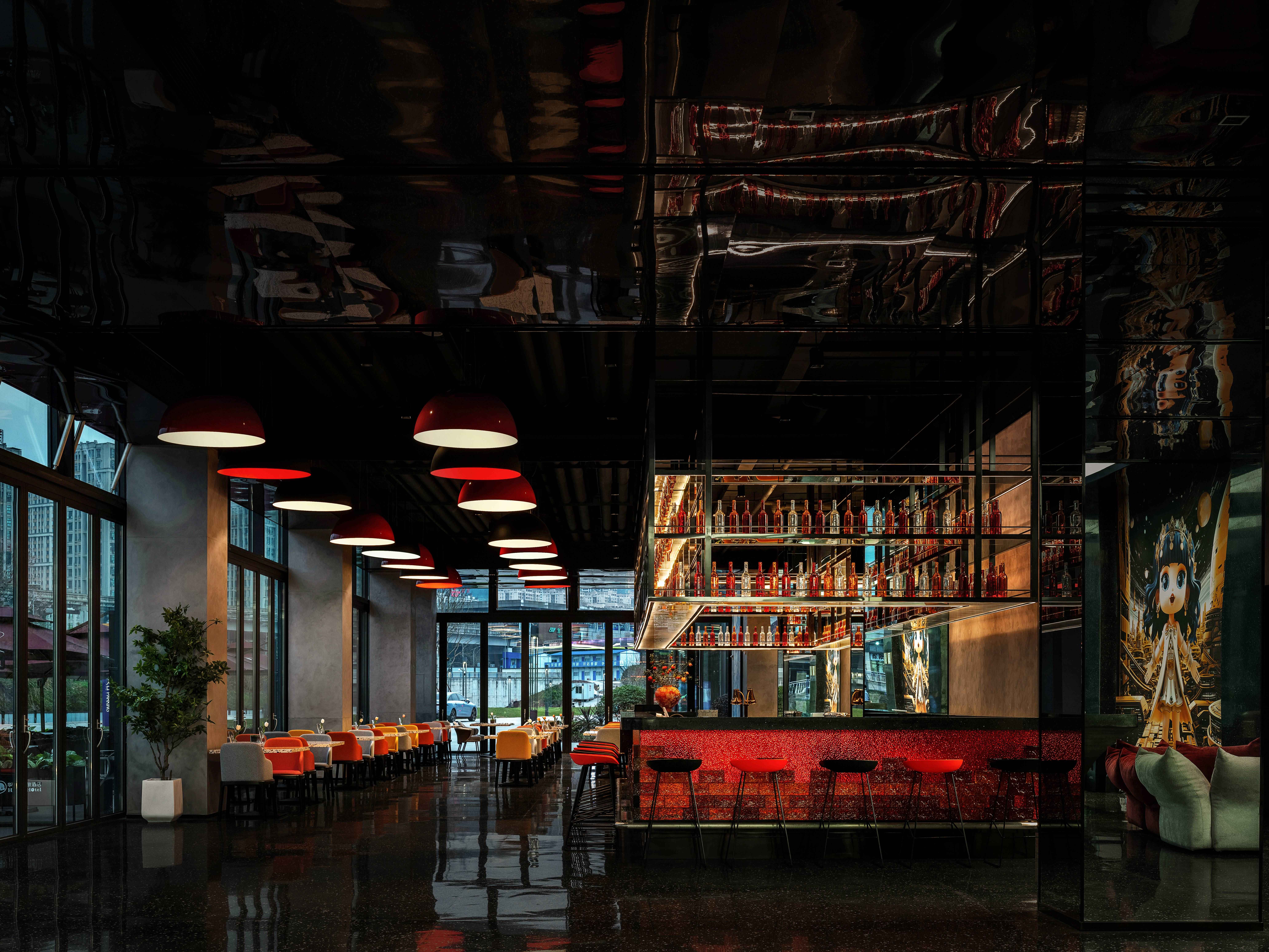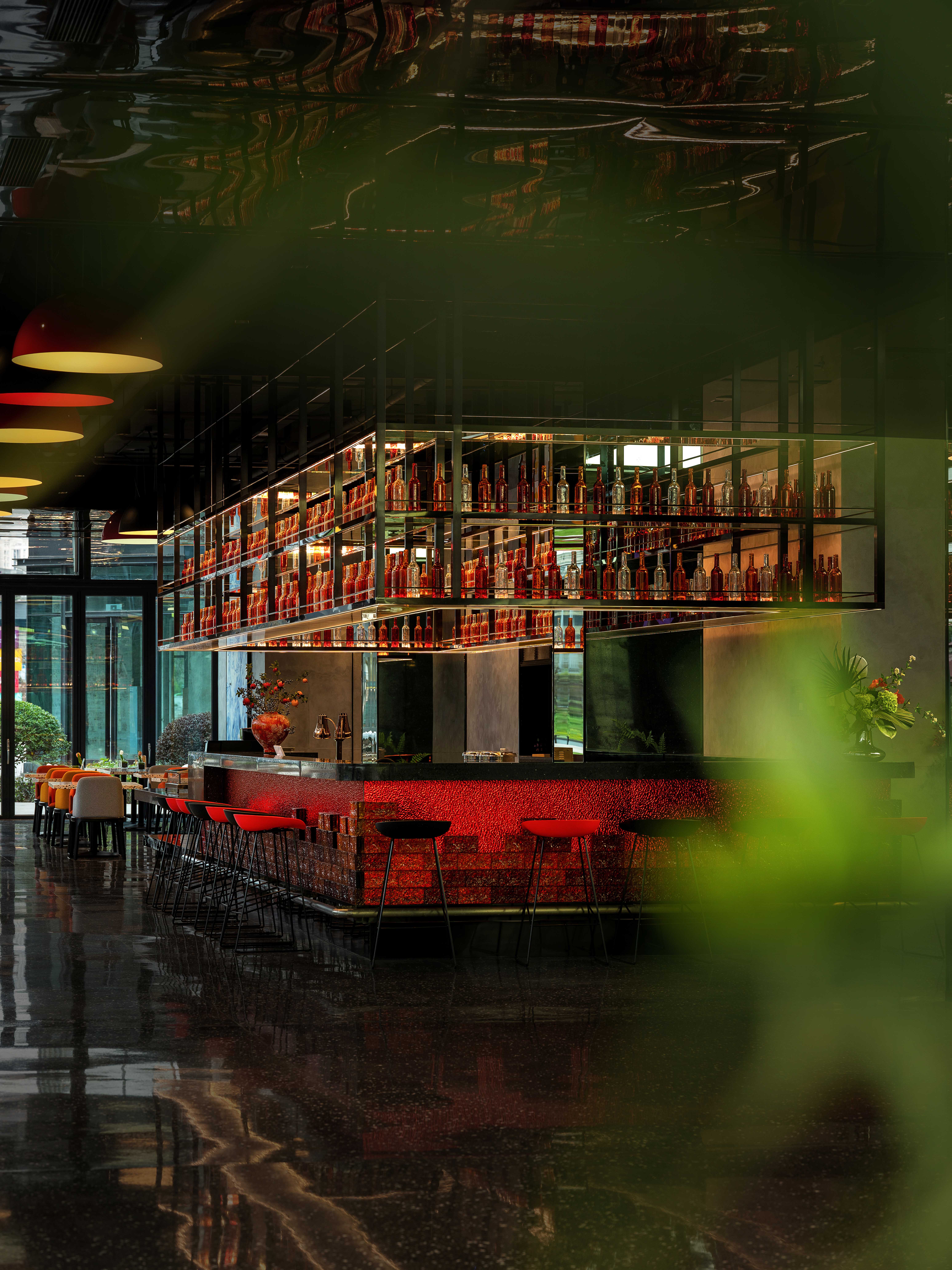 空间布局:大堂空间节奏轻巧而紧凑,前台、接待区、酒吧和ADD餐厅在空间节奏上无缝衔接。吧台区与接待区实现了空间联动,流线型的艺术联廊既有艺术性又具备连接空间的功能性。