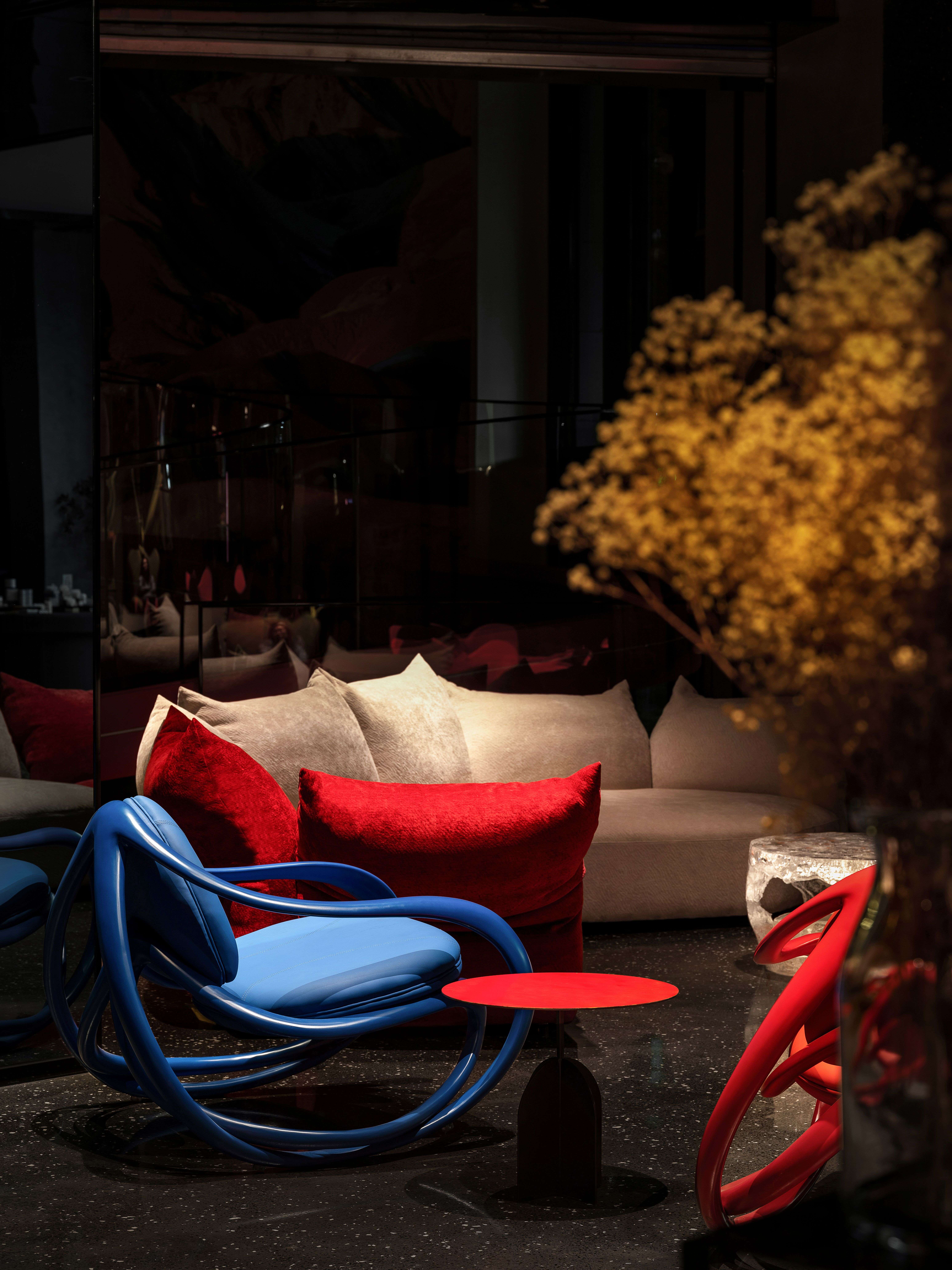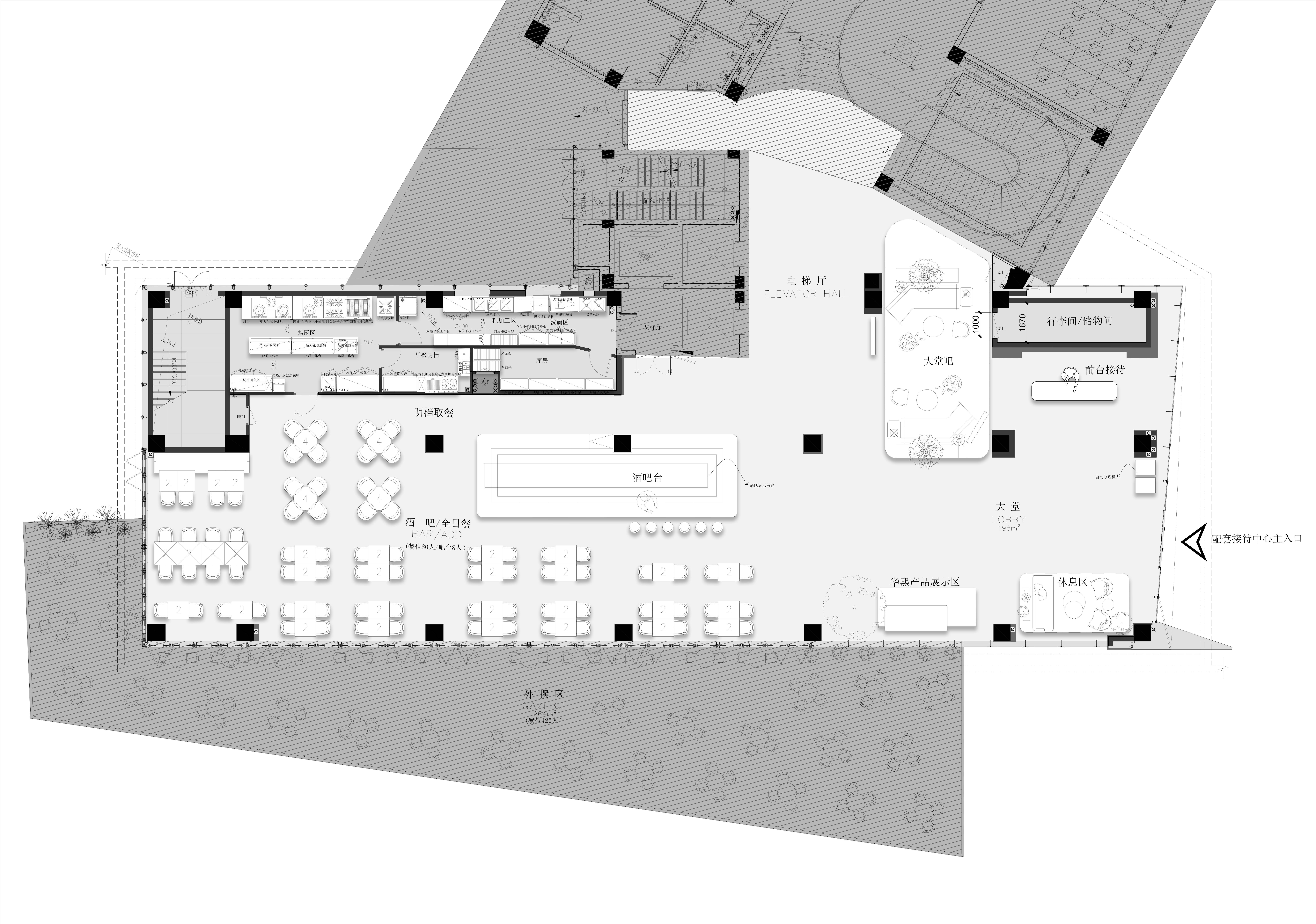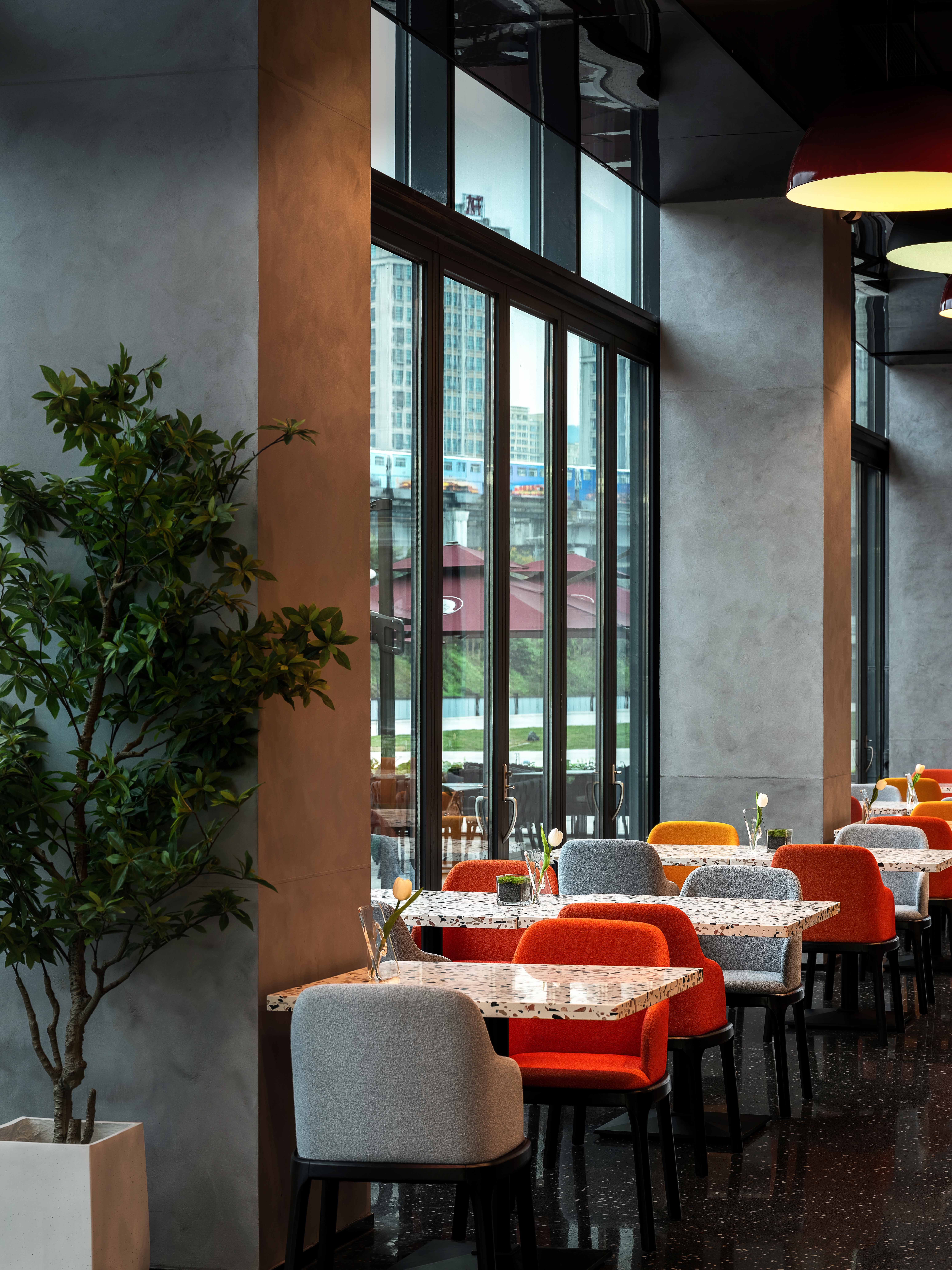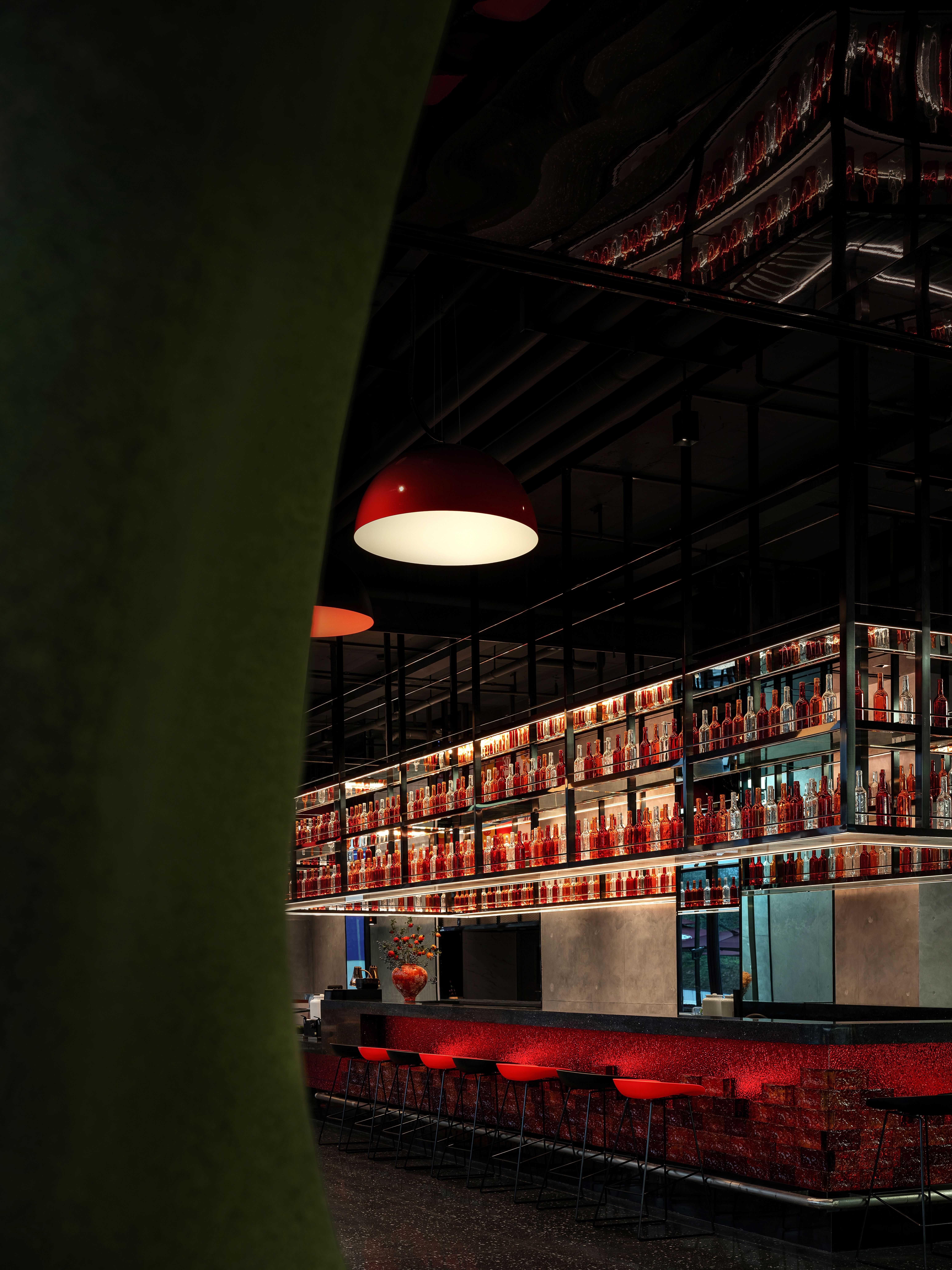 空间布局:大堂空间节奏轻巧而紧凑,前台、接待区、酒吧和ADD餐厅在空间节奏上无缝衔接。吧台区与接待区实现了空间联动,流线型的艺术联廊既有艺术性又具备连接空间的功能性。