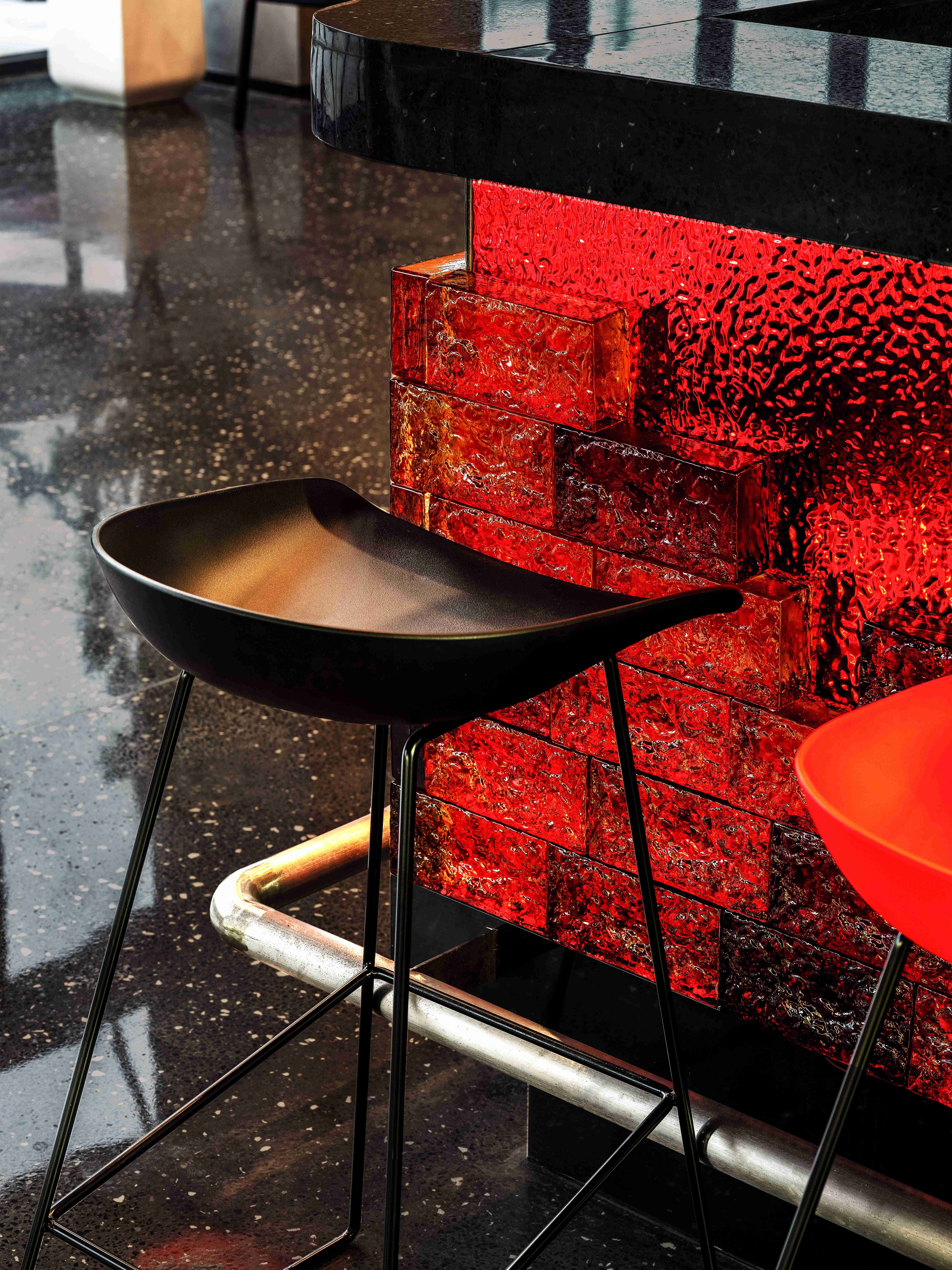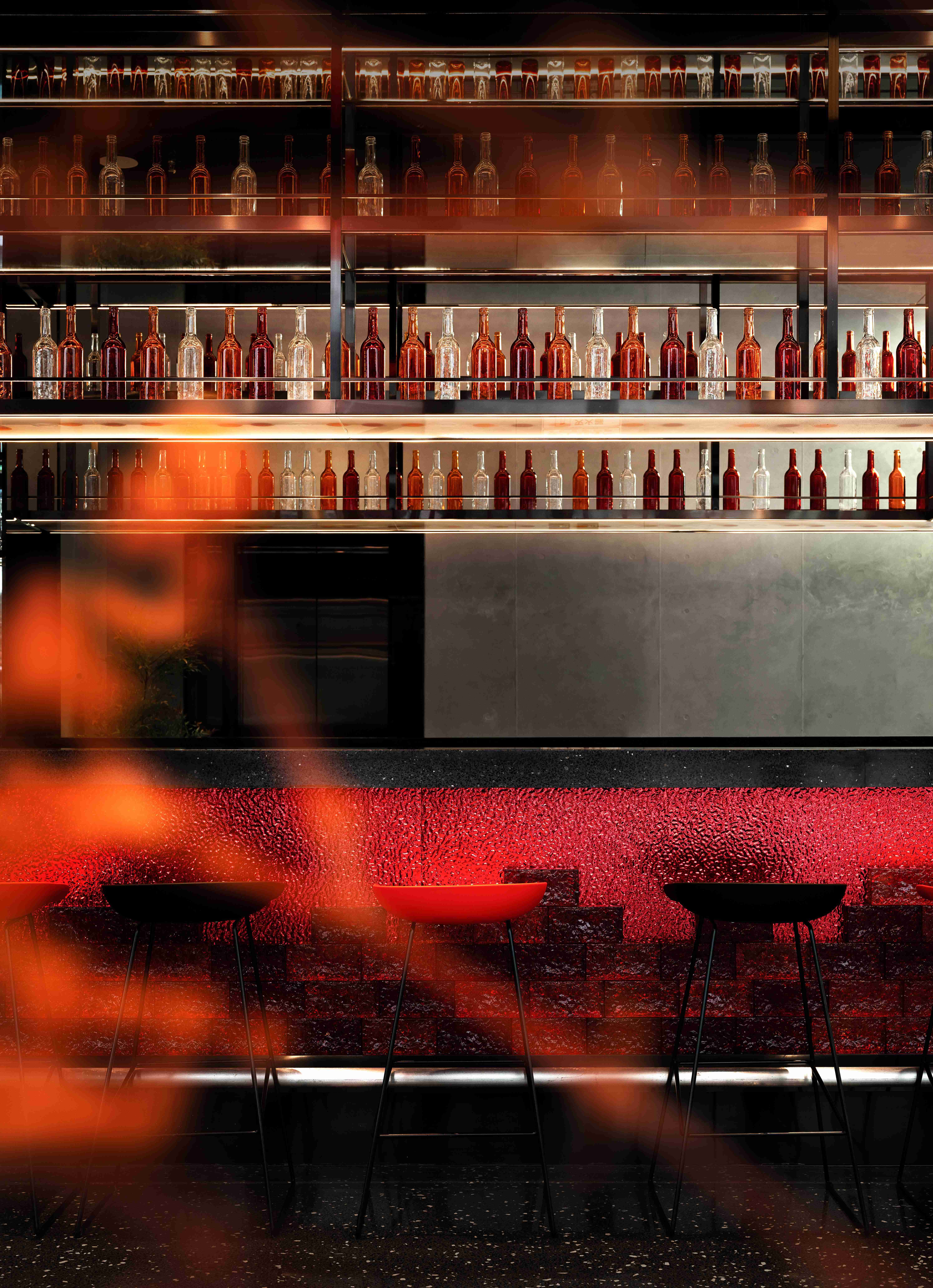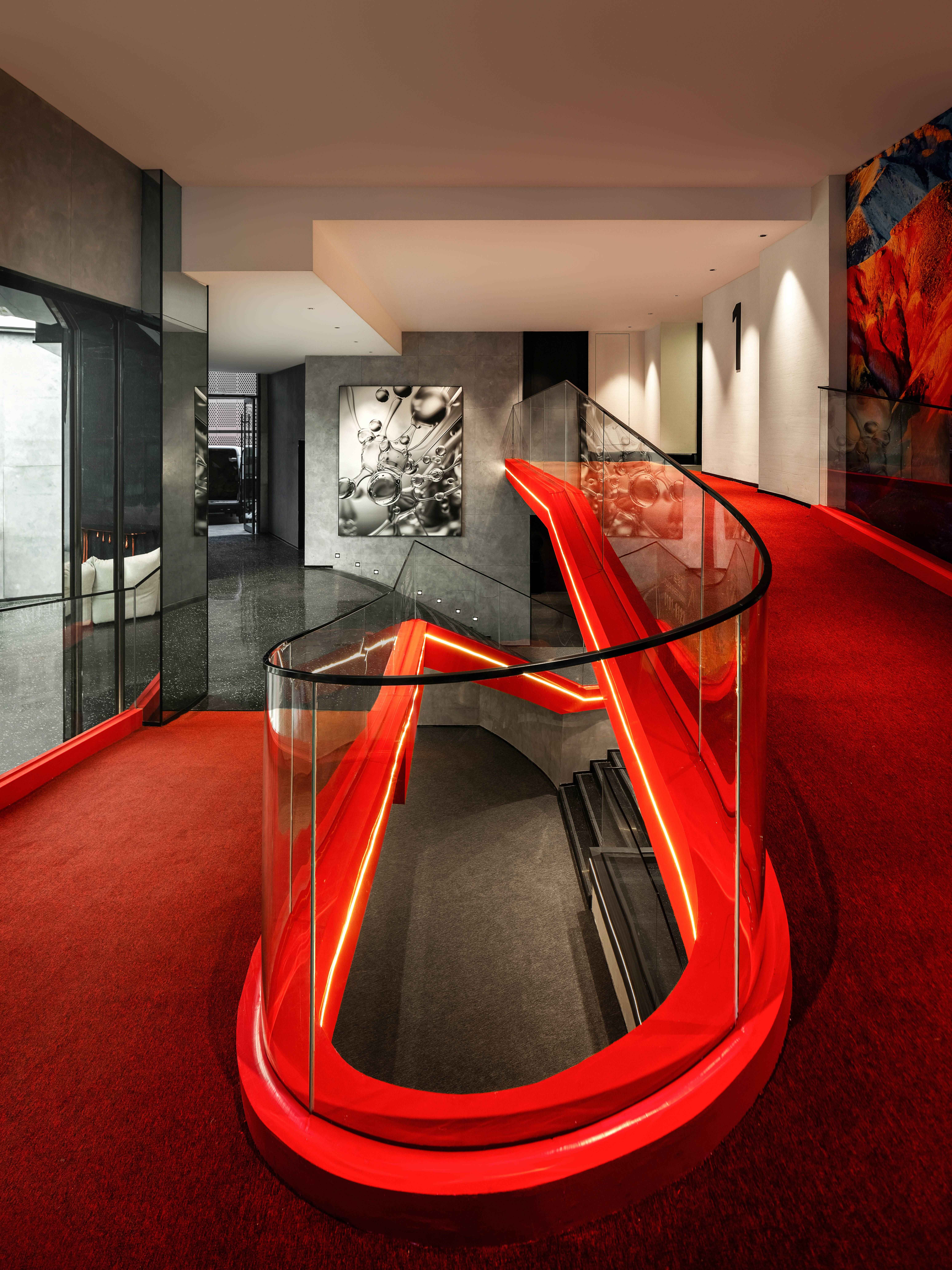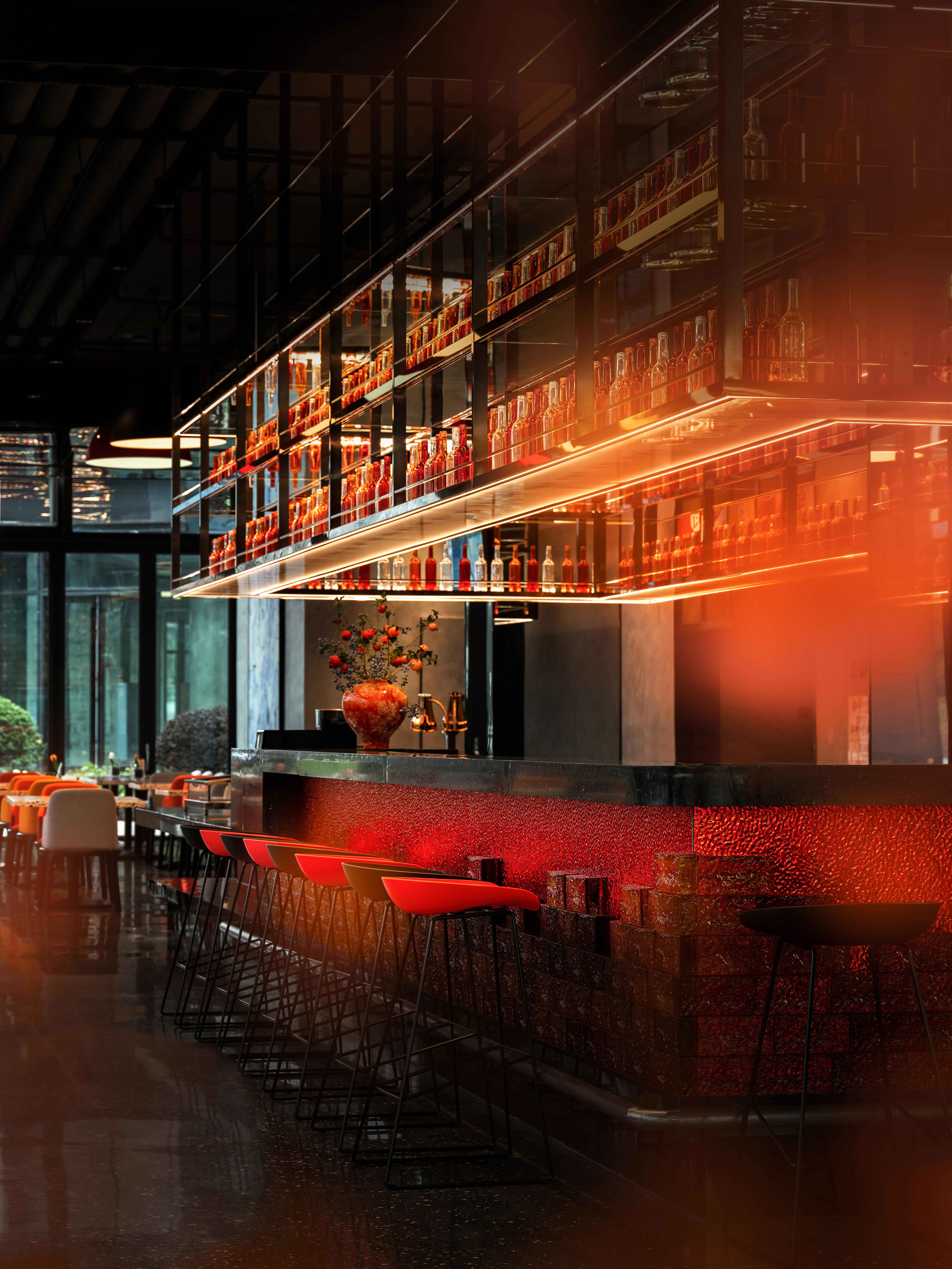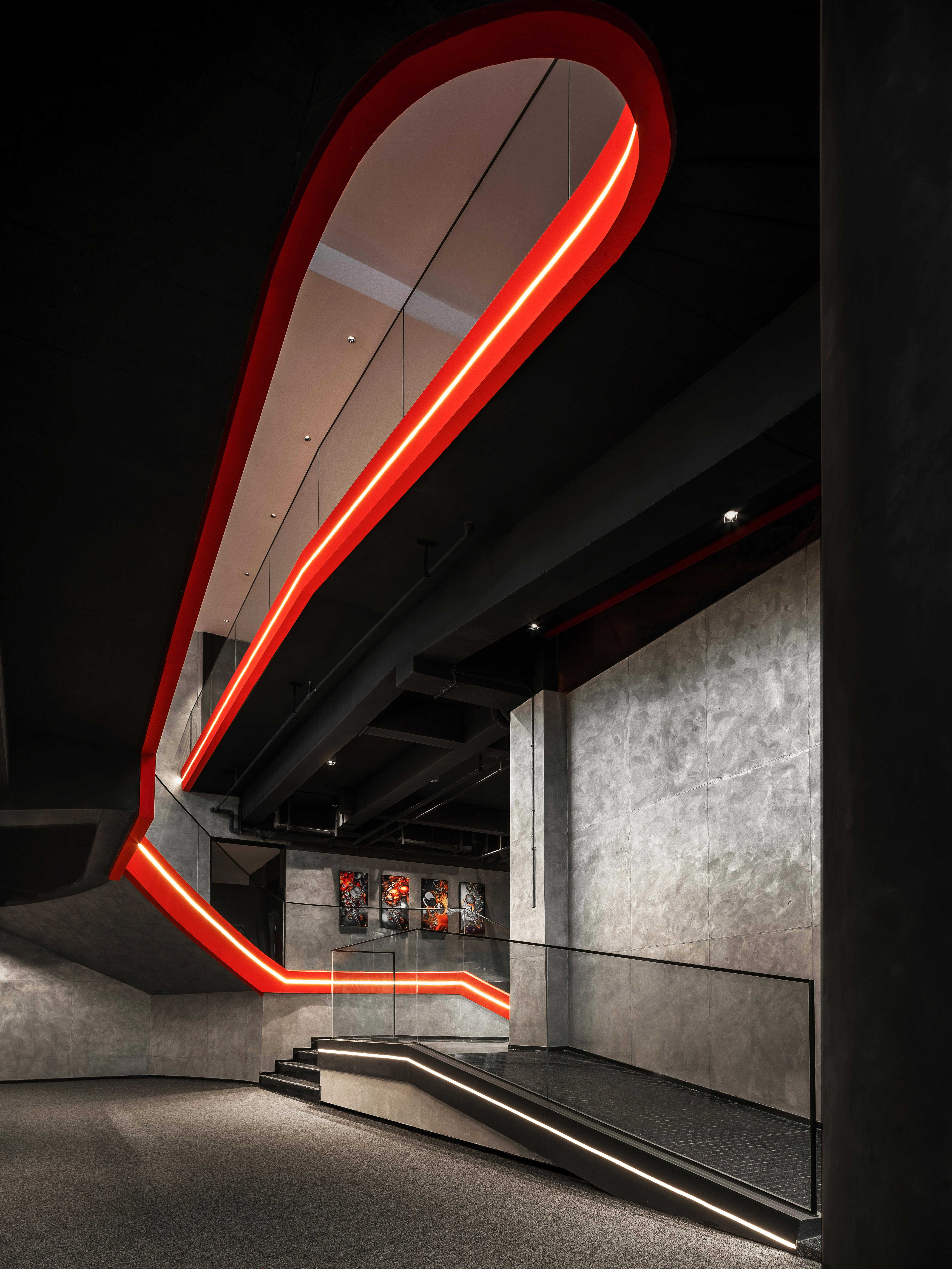 空间布局:大堂空间节奏轻巧而紧凑,前台、接待区、酒吧和ADD餐厅在空间节奏上无缝衔接。吧台区与接待区实现了空间联动,流线型的艺术联廊既有艺术性又具备连接空间的功能性。