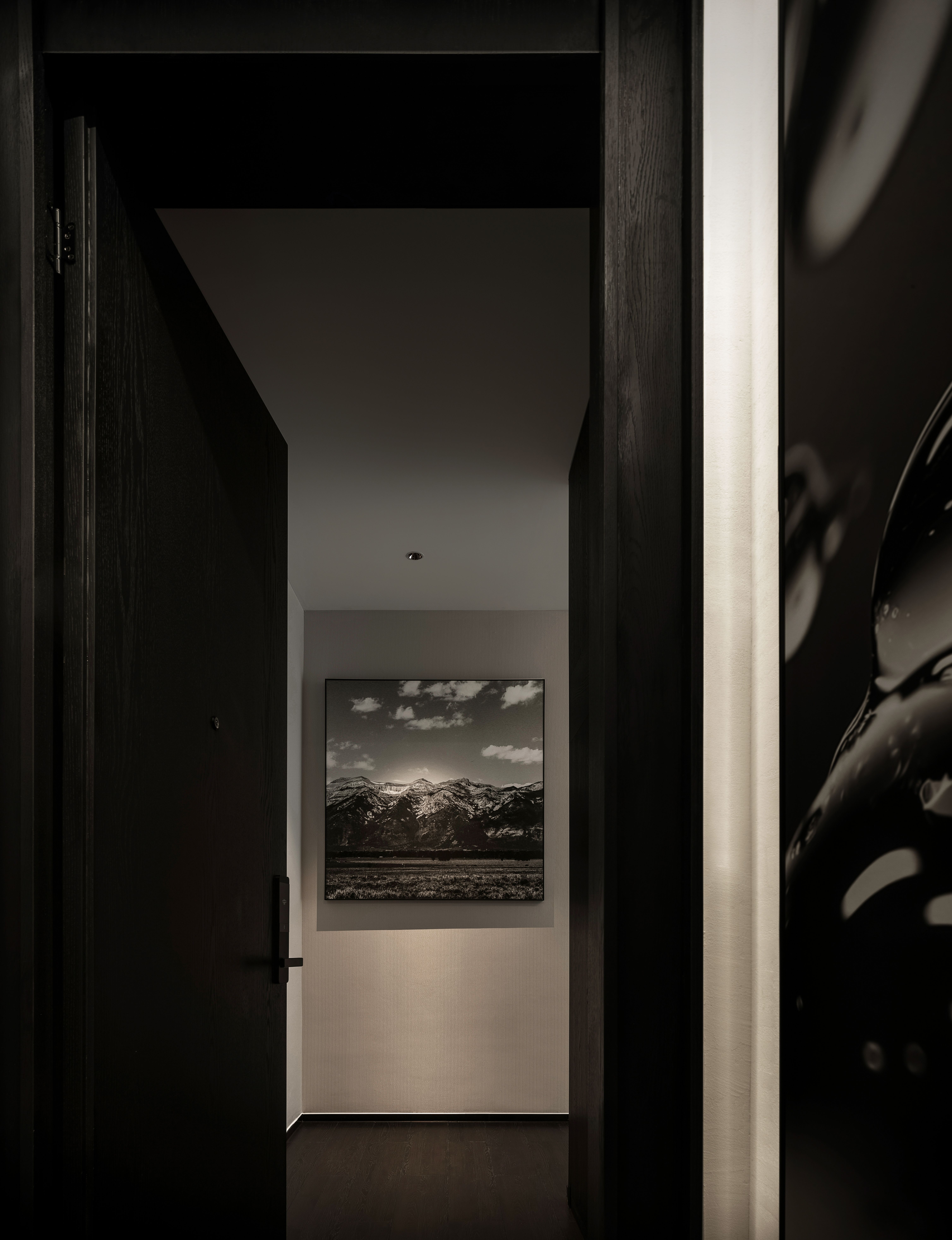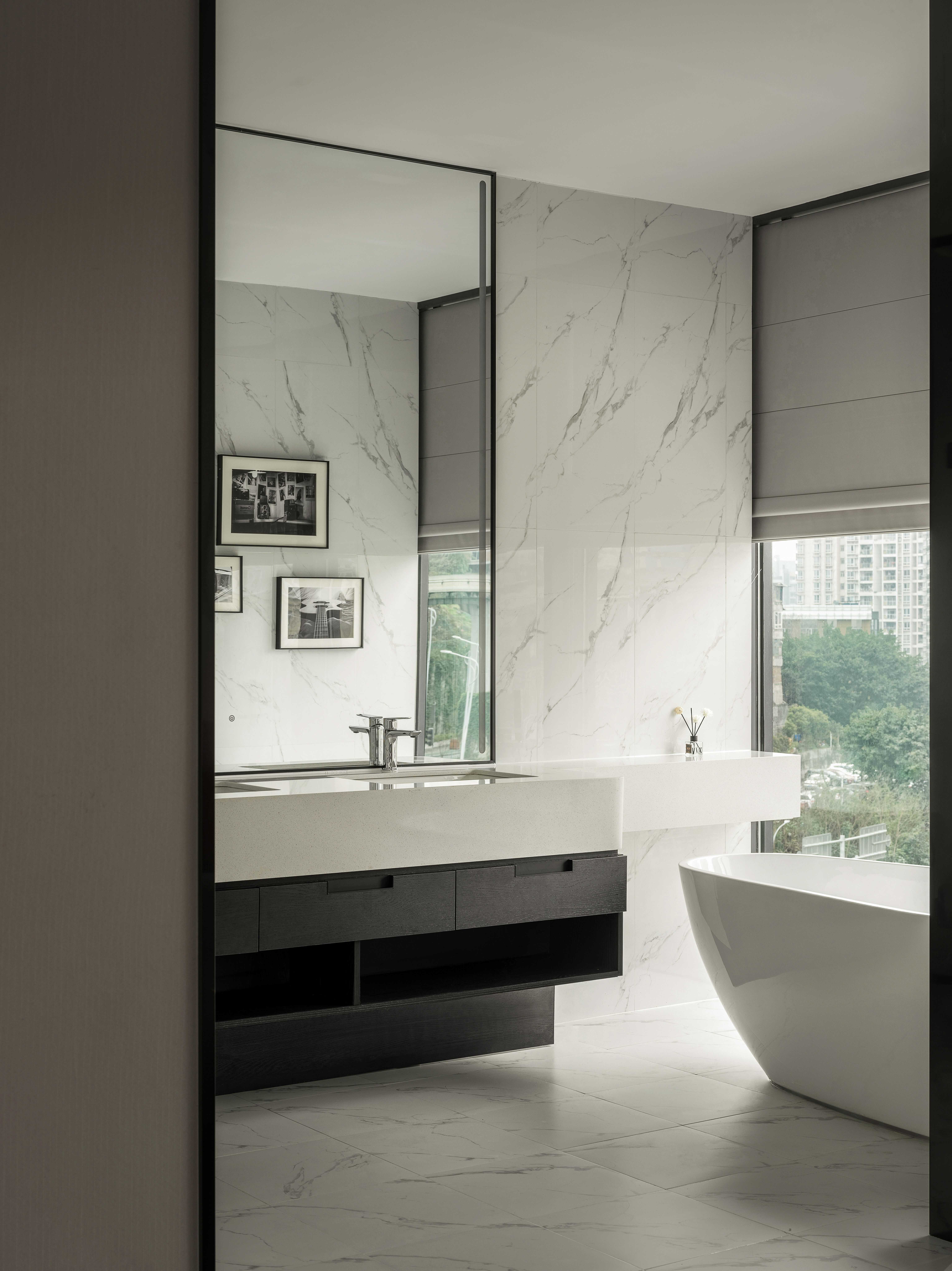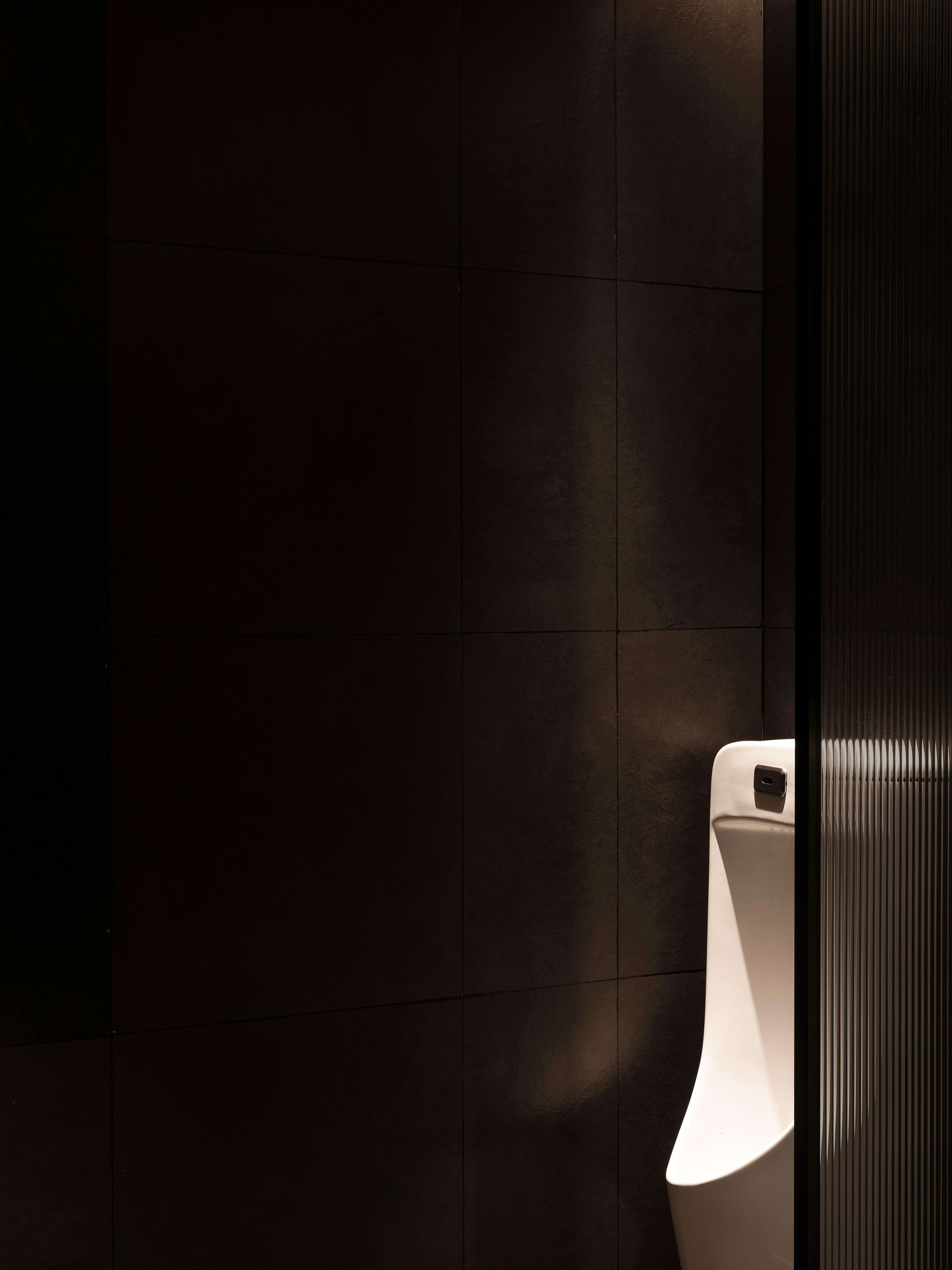 设计选材:公区全空间墙面材质使用了清水混凝土材质,天花顶面采用有律动质感的黑色镜面,地面则是与之形成鲜明对比的水磨石。