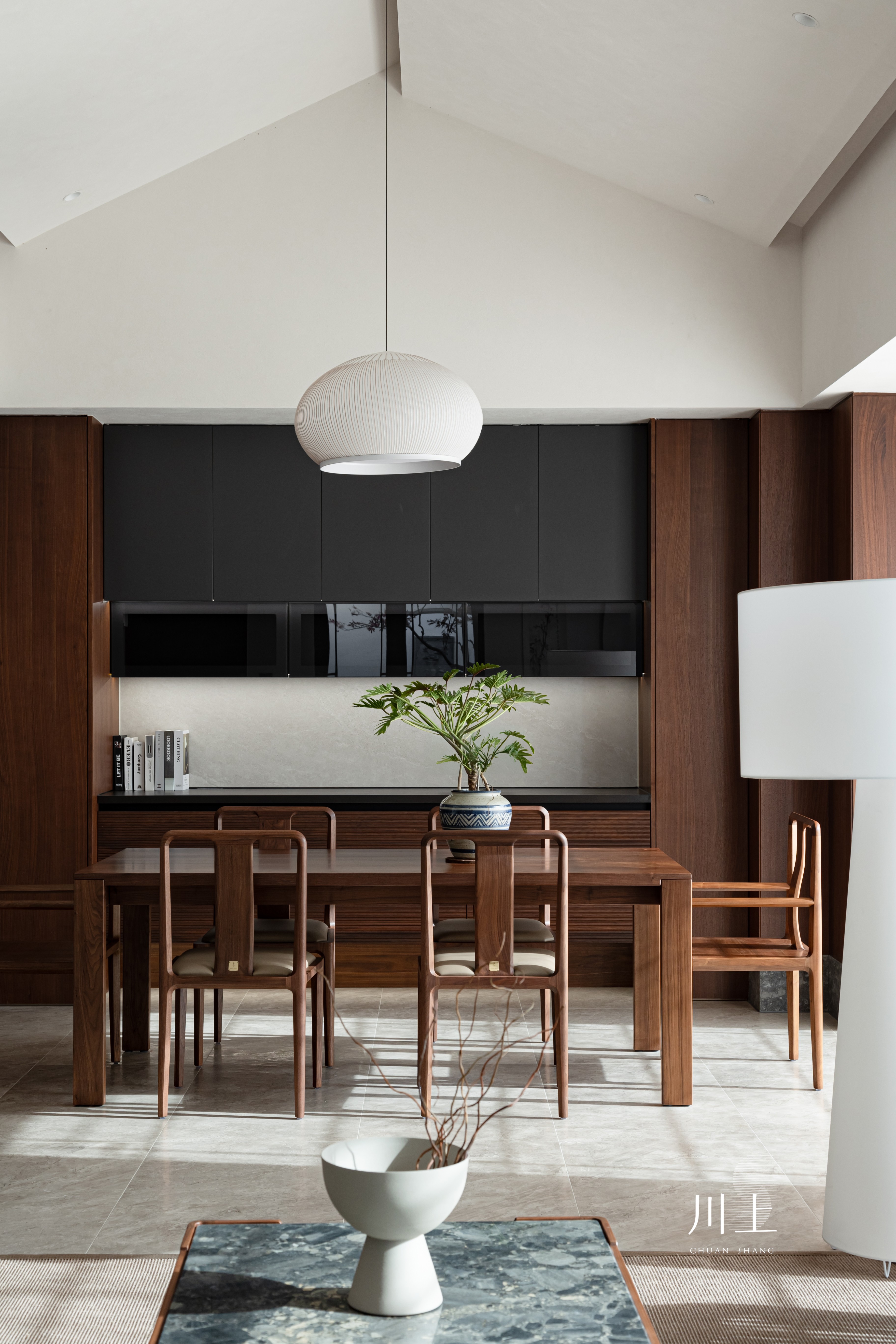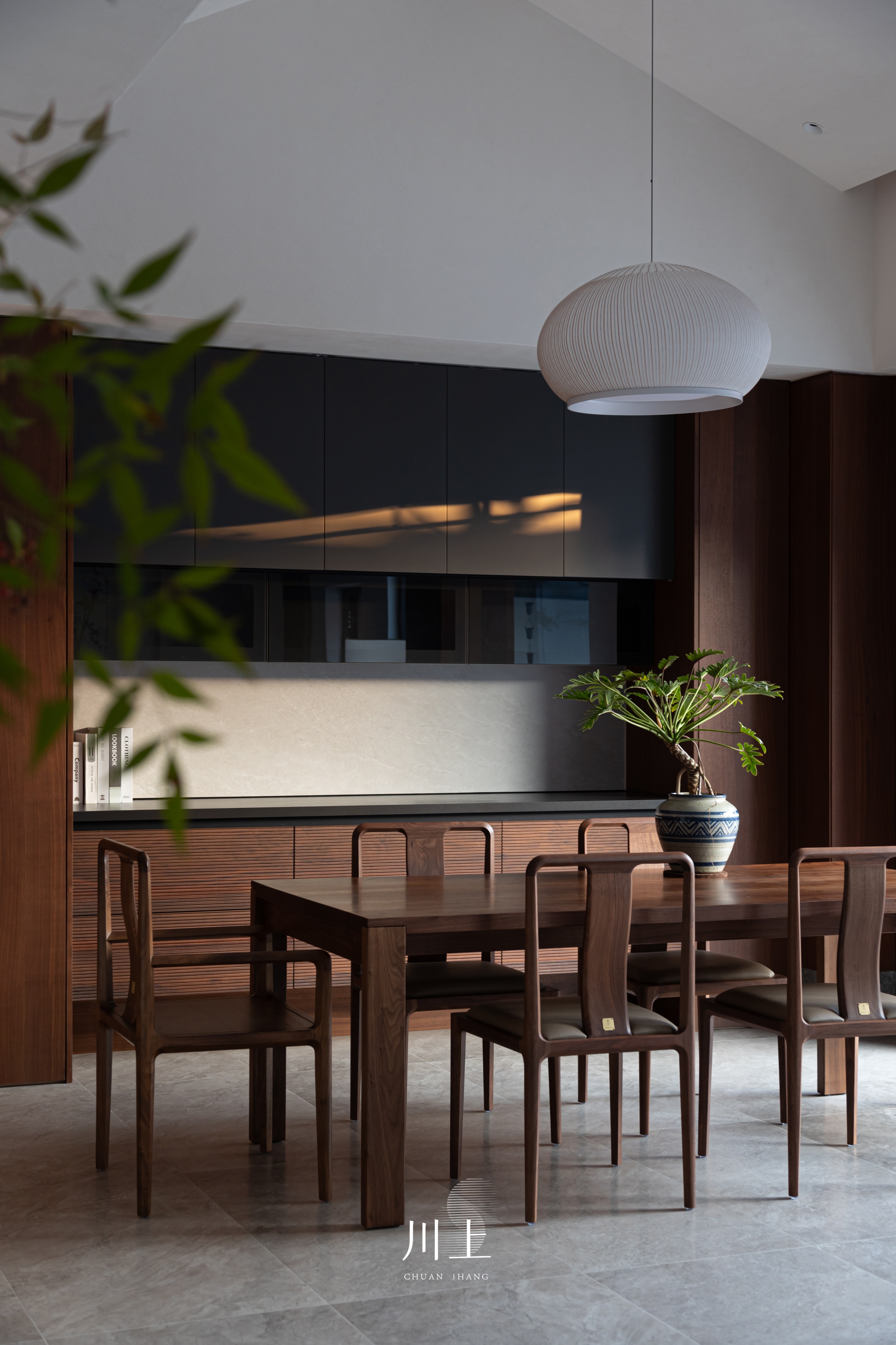 进退有度,是国人的处世之道。餐厅与开放式的厨房居于空间一隅,整体连绵成一体,进退有度的立面与柜体无缝衔接,将功能性分区的各类收纳、设备妥善安置。