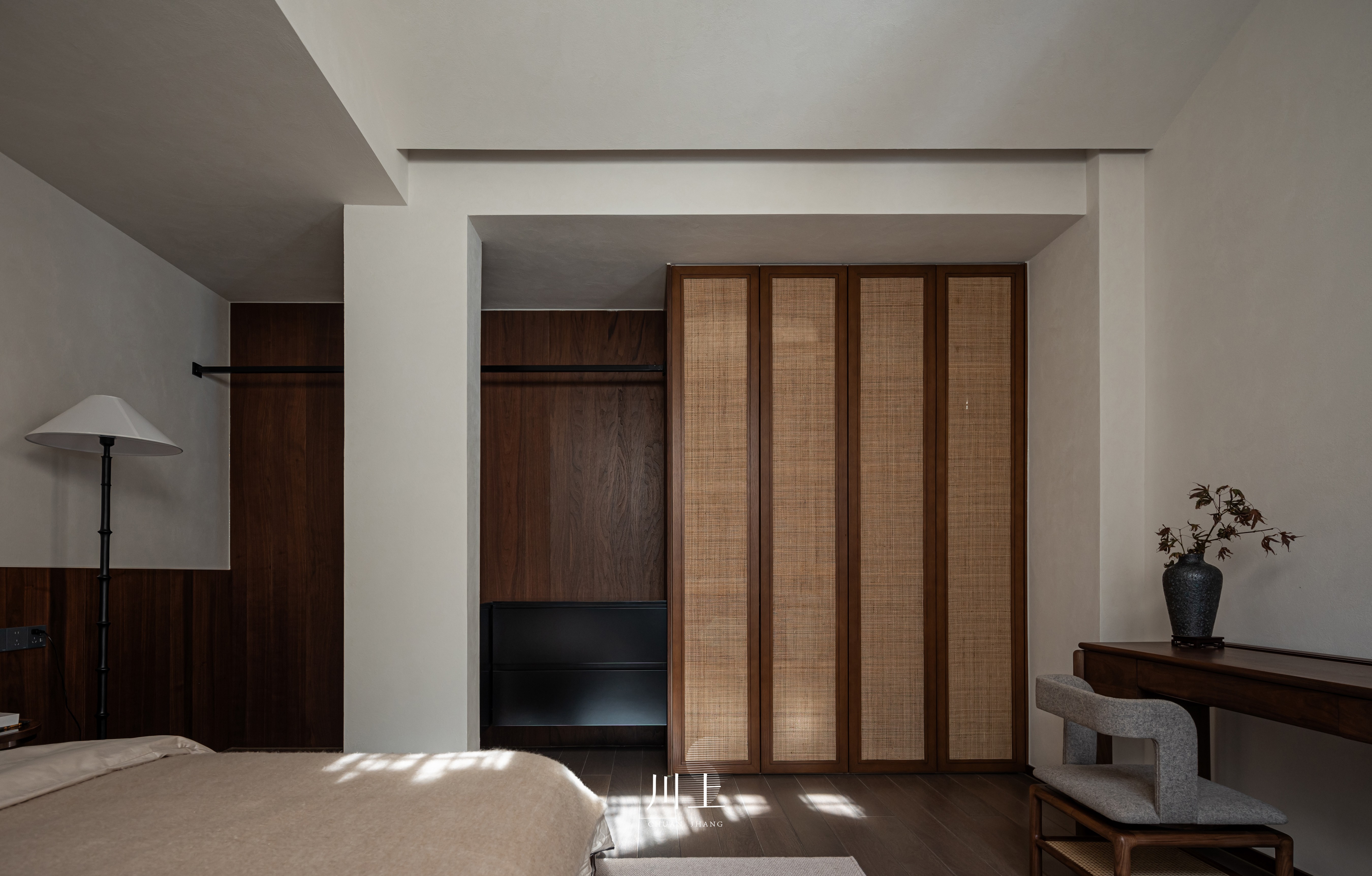 松竹生虚白,阶庭横古今。竹,品性高洁,虚怀若谷,是君子的化身,古往今来都深受文人墨客的喜爱。次卧床头的墨竹落地灯,便是精挑细选而来。藤制衣柜与开放式的挂衣杆,则将中式的内敛与现代的张扬结合的恰当好处。开合有度,隐逸有度。时序流转,一器一物皆成雅韵,于动静之间入君佳梦。