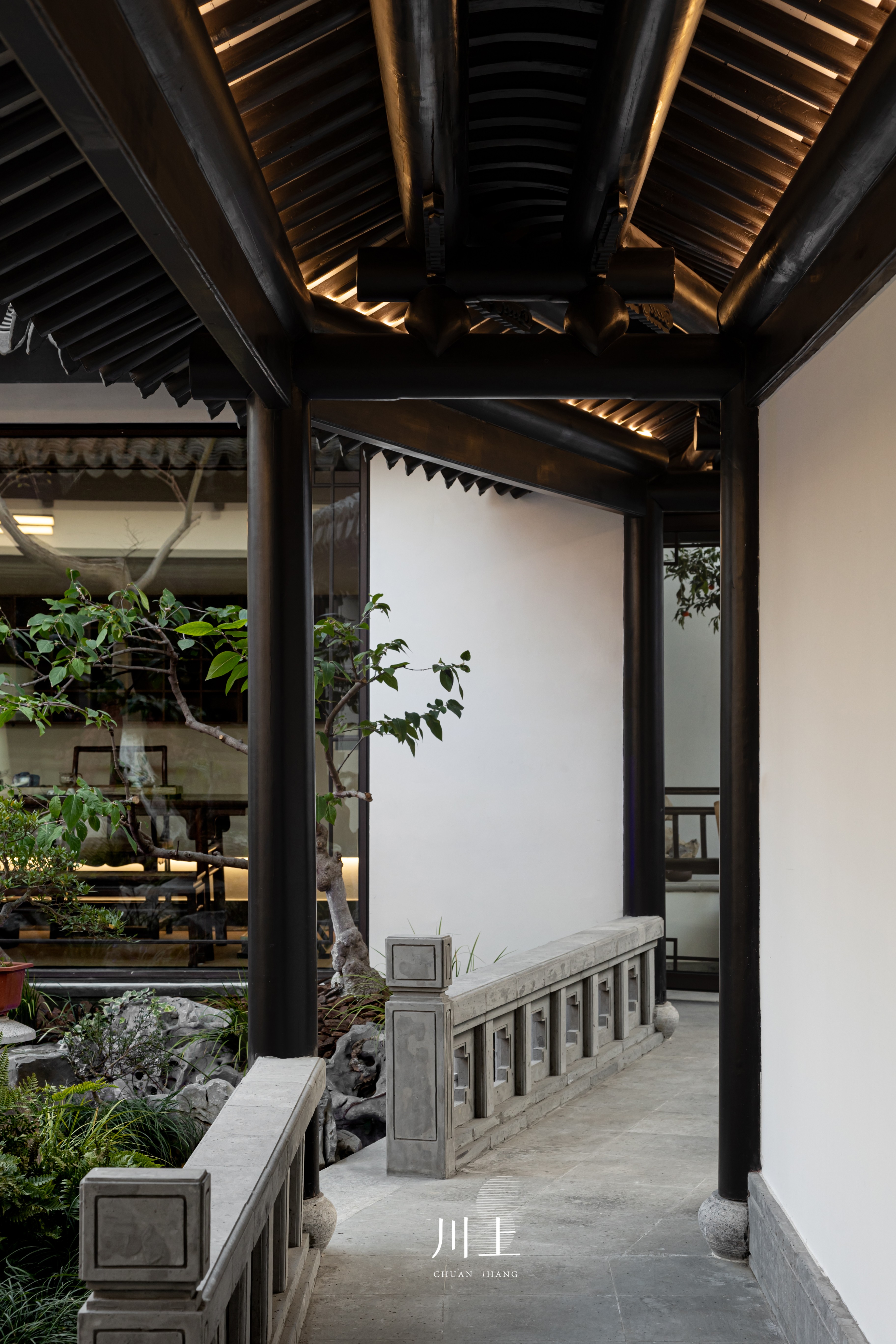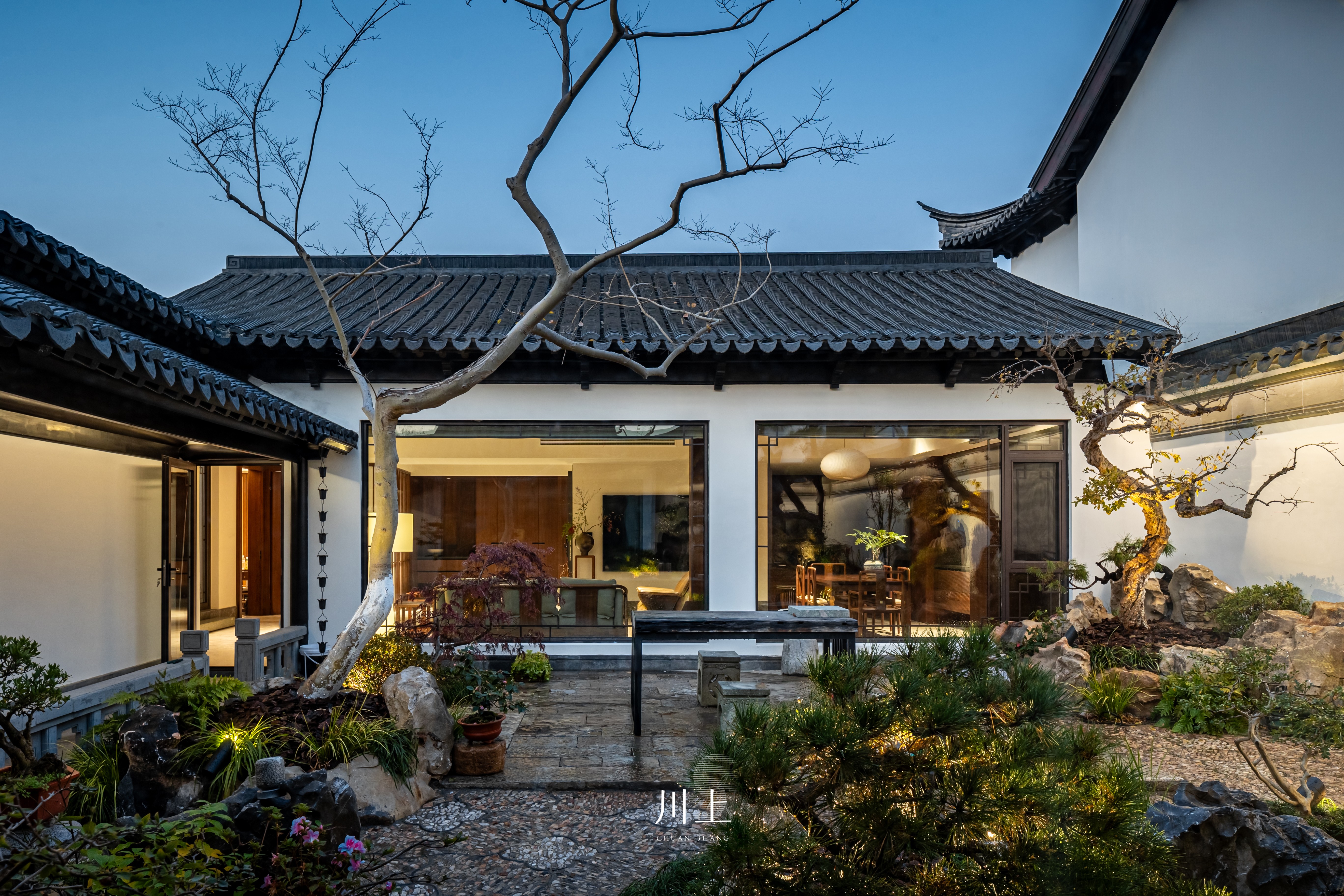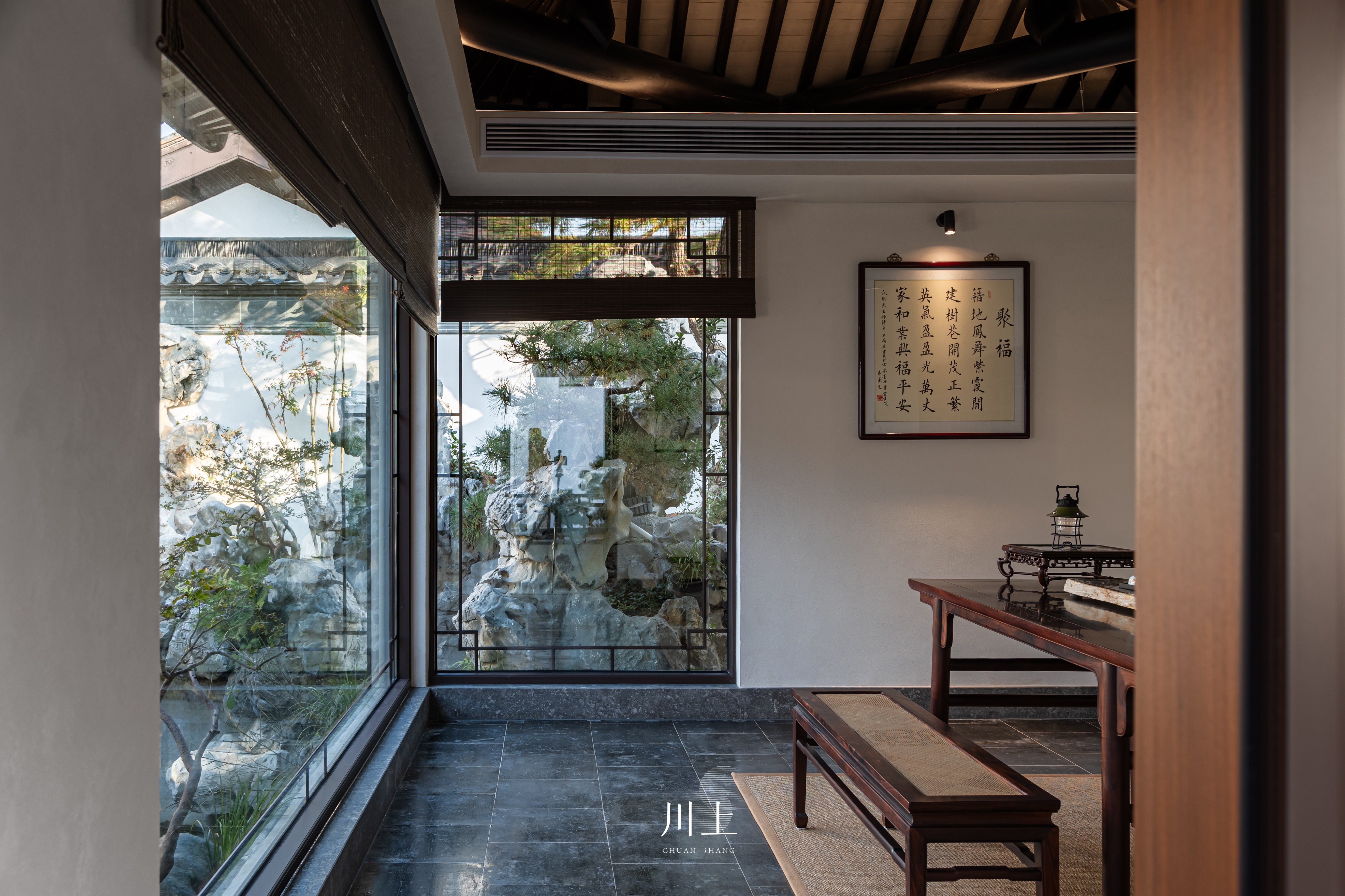 叠石、理水、繁树、亭榭......构筑起花木葳蕤、锦鲤戏水的园林雅集。曲径通幽,移步异景,无论是在院内闲庭信步、还是在室内倚窗近观,这一派檐上春秋、庭院深深的东方意象都令人无限陶醉。