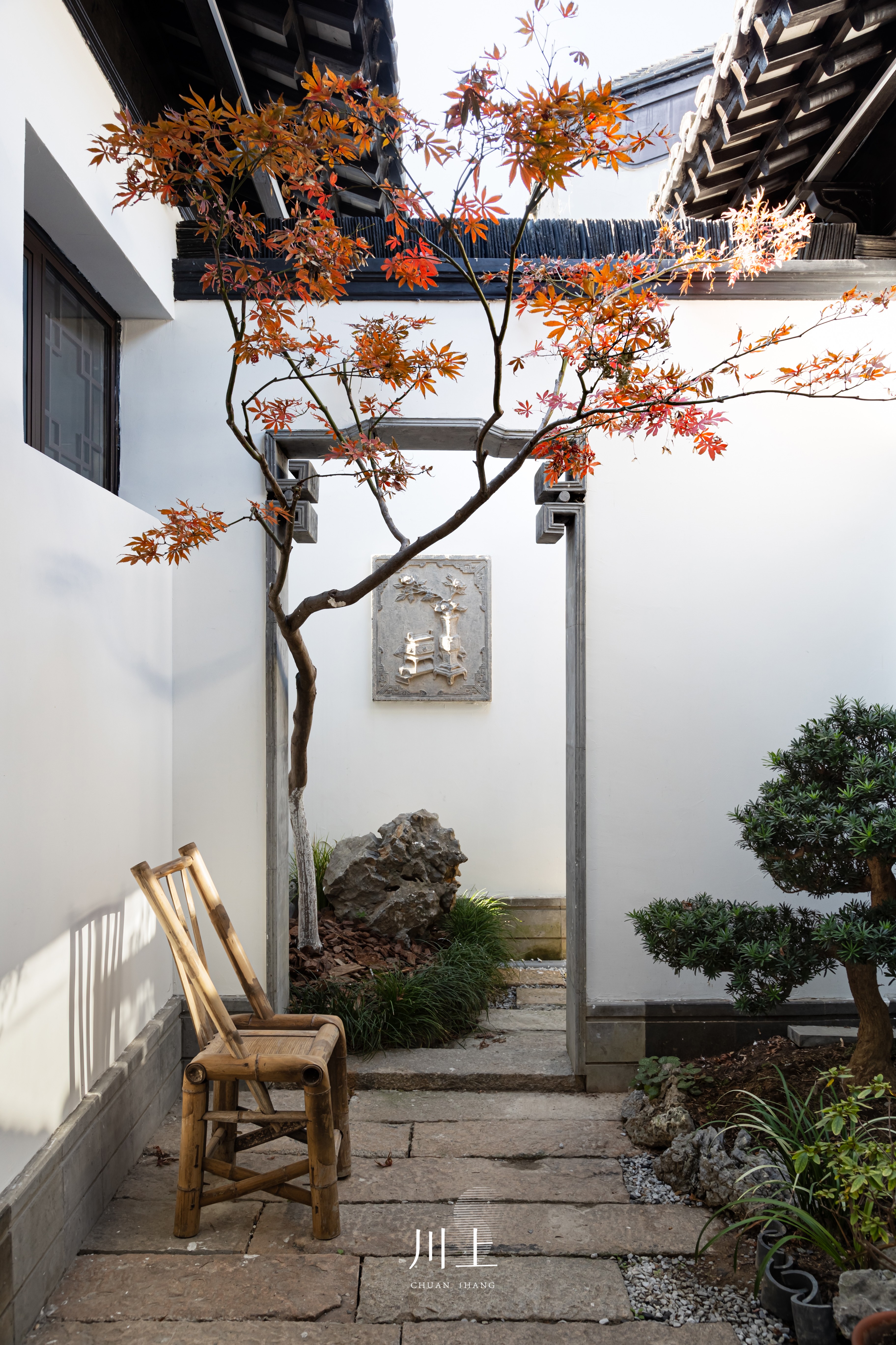 巷门、院门、宅门,三进制的院落格局,再现东方传统的归家礼序。霜叶如丹、松柏苍翠,在留白的幕墙之上生出肆意的色彩与姿态,而这幅画卷却又四时不同、朝夕各异,令每一次的驻足观赏都充满了新意和惊喜! 暖融的午后,一张拙朴的小竹椅便可享受一段“偷得浮生半日闲”的恬静光景。