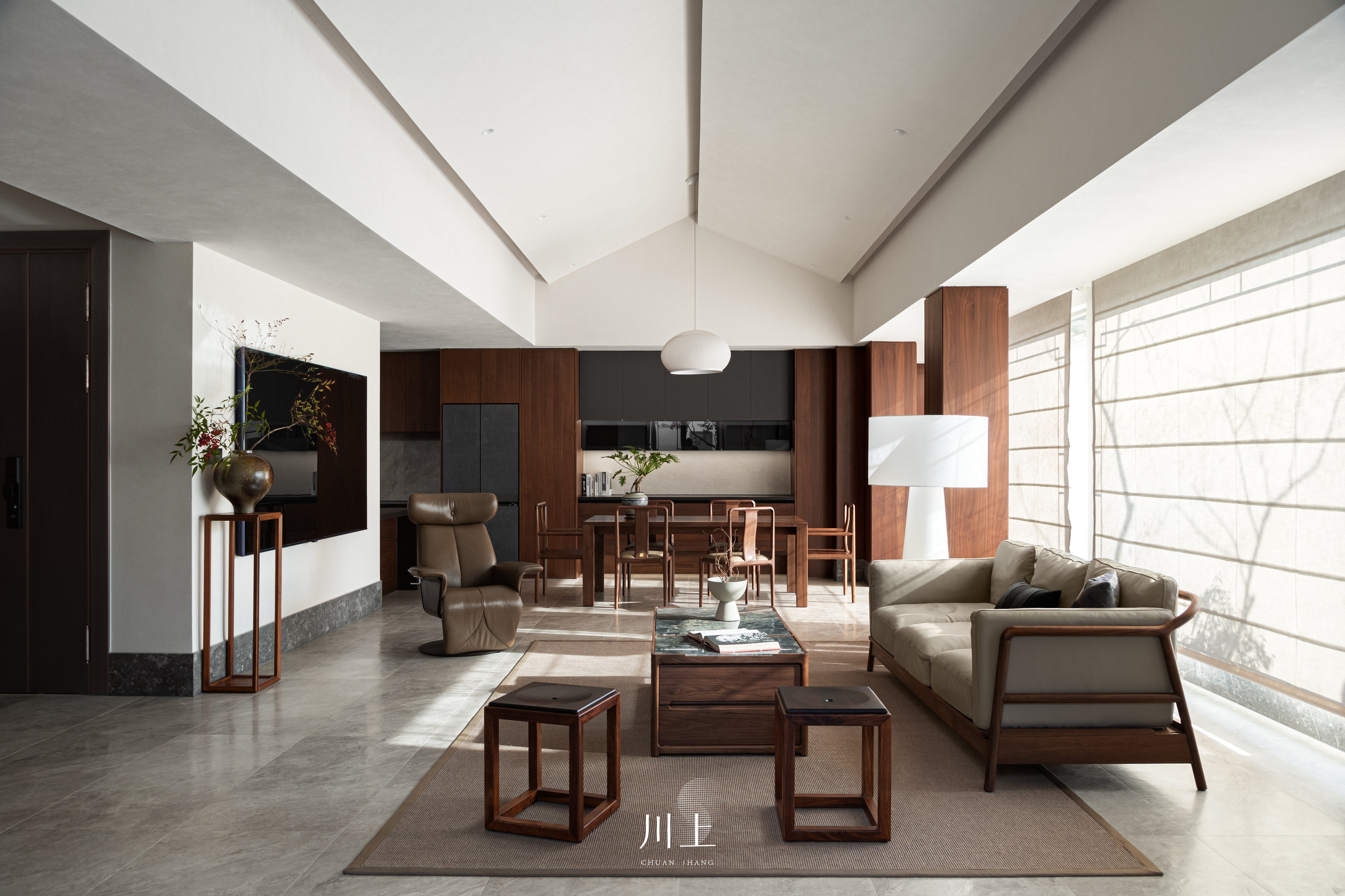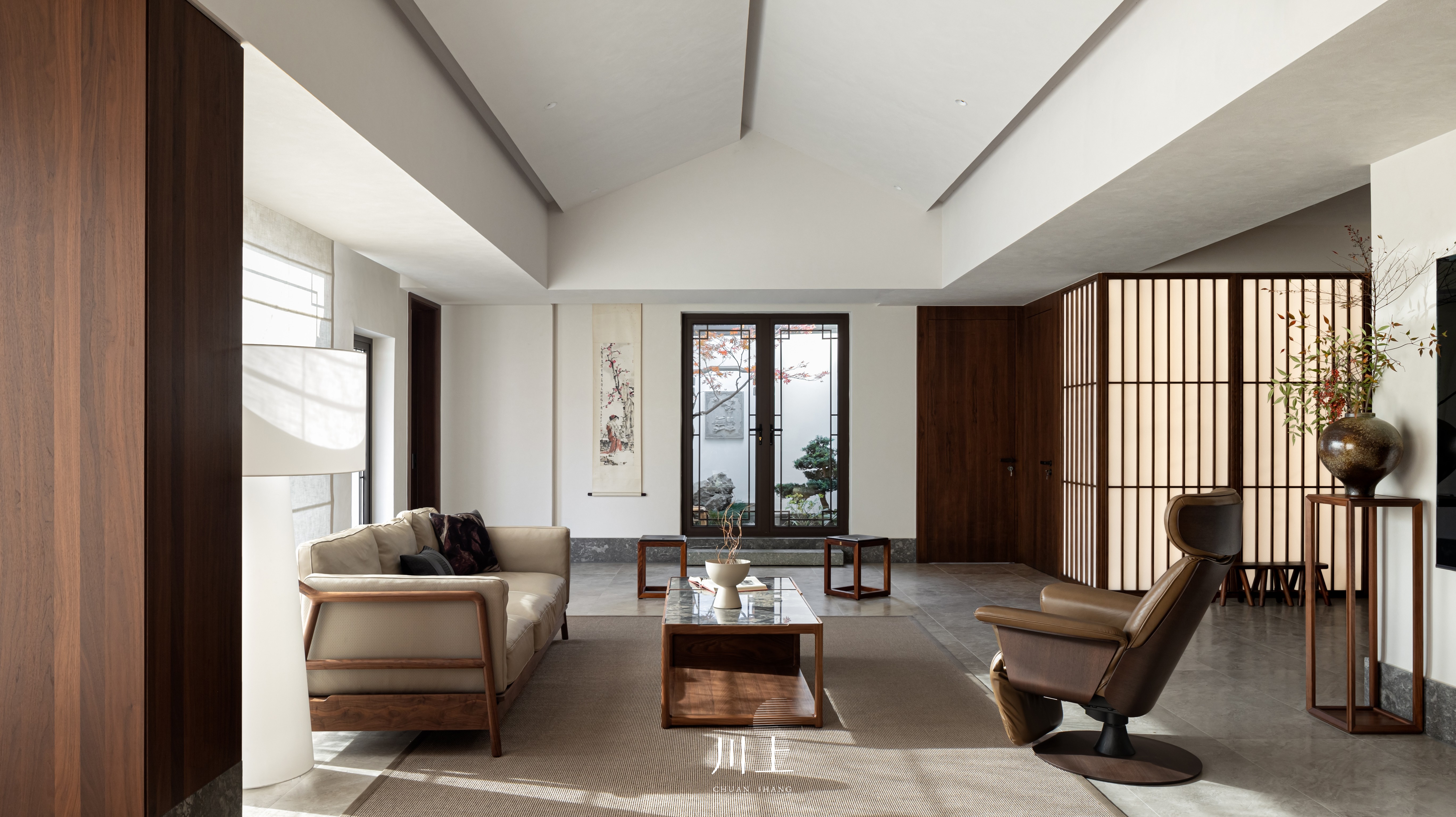 独特的中式坡顶,尽显东方韵律的气度与魅力。设计师将简约的现代线条与之结合,蜕变成诗意且极富层次的风雅典范。