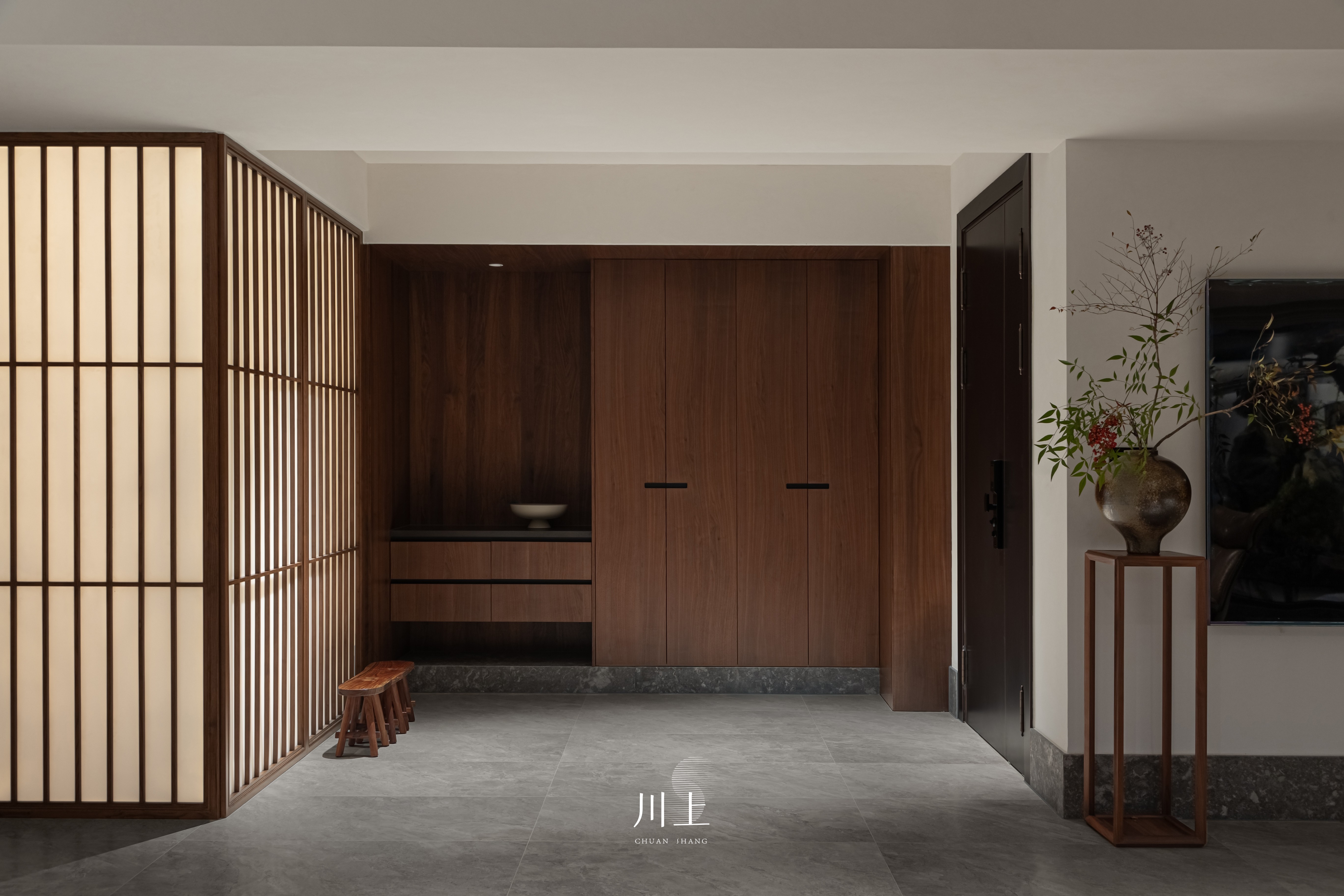 从古至今,国人就十分注重入户的隐私,玄关历来讲究“藏风聚气”“先抑后扬”。摒弃繁复的端景设计,设计师施之以创新。发光的中式格栅,线条简约、比例得当,充满着秩序的美感。观感方面,似透却不漏,改善了传统墙体或护墙带来的空间闭塞感,又保证了私密性。自然的胡桃木色调,与细腻的石材纹理,阐释生活的不俗之美。嵌入式隐形拉手精细有味,以“减法设计”将线性美学融入东方风韵,整个玄关空间素雅有序而又意境无穷。