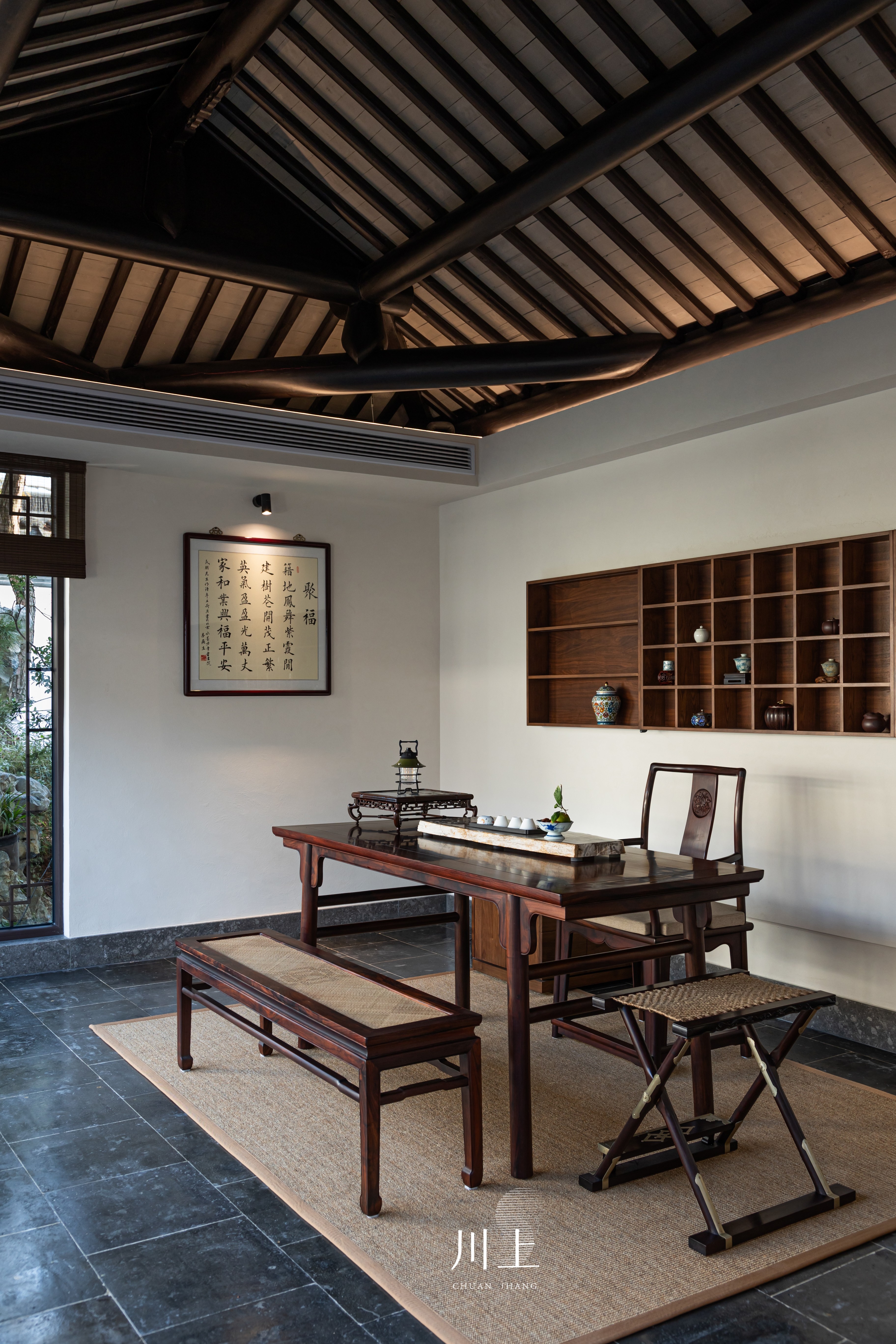 茶从口中入,道至心间生。打造一间至简至雅的中式茶室,是每个爱茶之人心中所求。茶室还原旧时的木构屋顶,映衬着这一方茶桌,更显古趣十足。墙上的博古架展陈了主人收藏的各种茶器,每一只都玲珑有致、颇有故事。随兴而至,玩古鉴真、煮茶品茗、挥毫泼墨......这方小小天地总能让人收获洗涤内心般的空明澄澈。