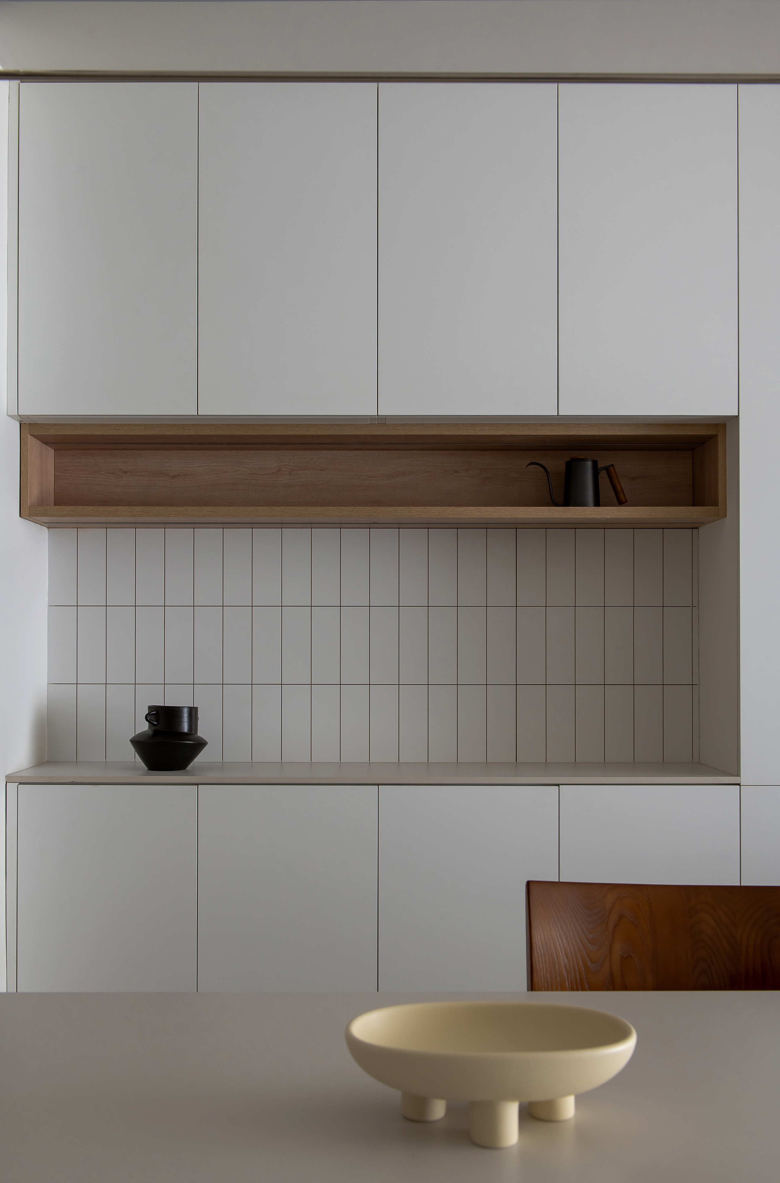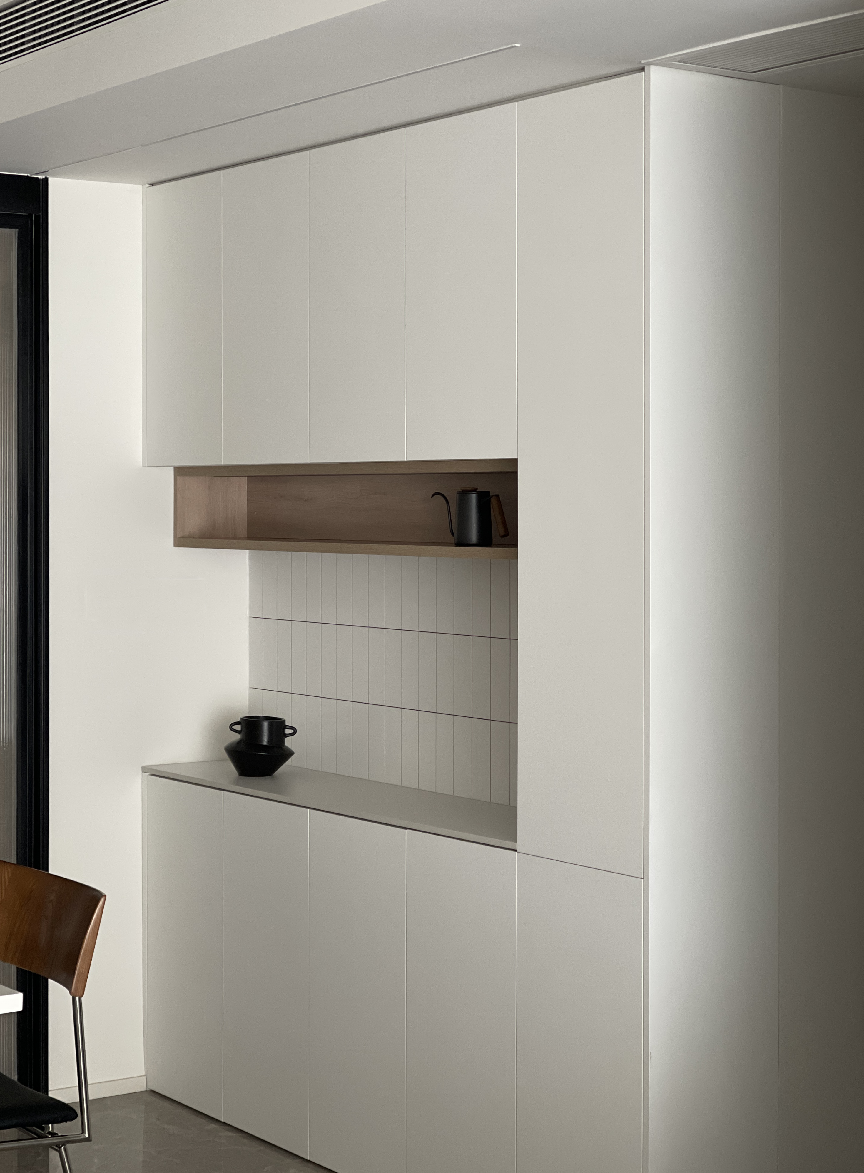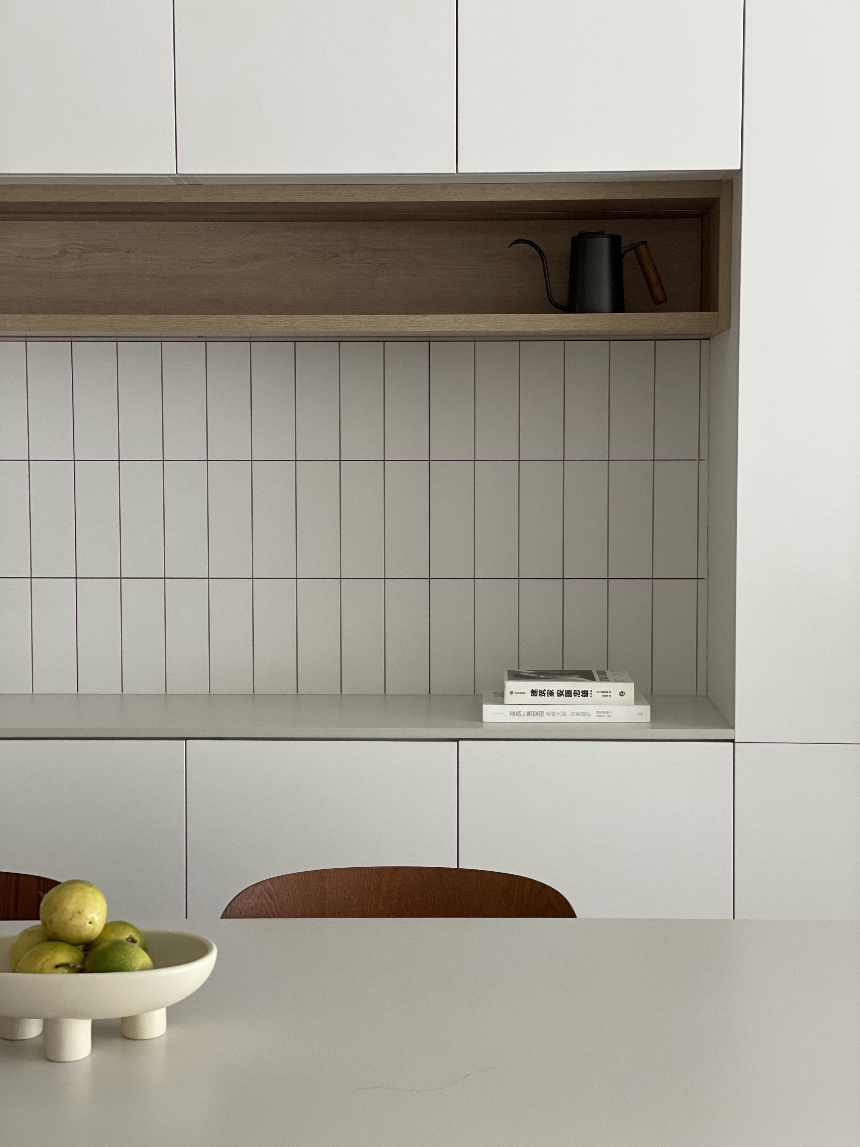 2、餐边柜墙面小白砖的使用增添了温馨舒适的氛围,与黑色东方元素的装饰品形成对比,通过简洁的线条和最少的装饰来实现功能性和美观性的平衡。