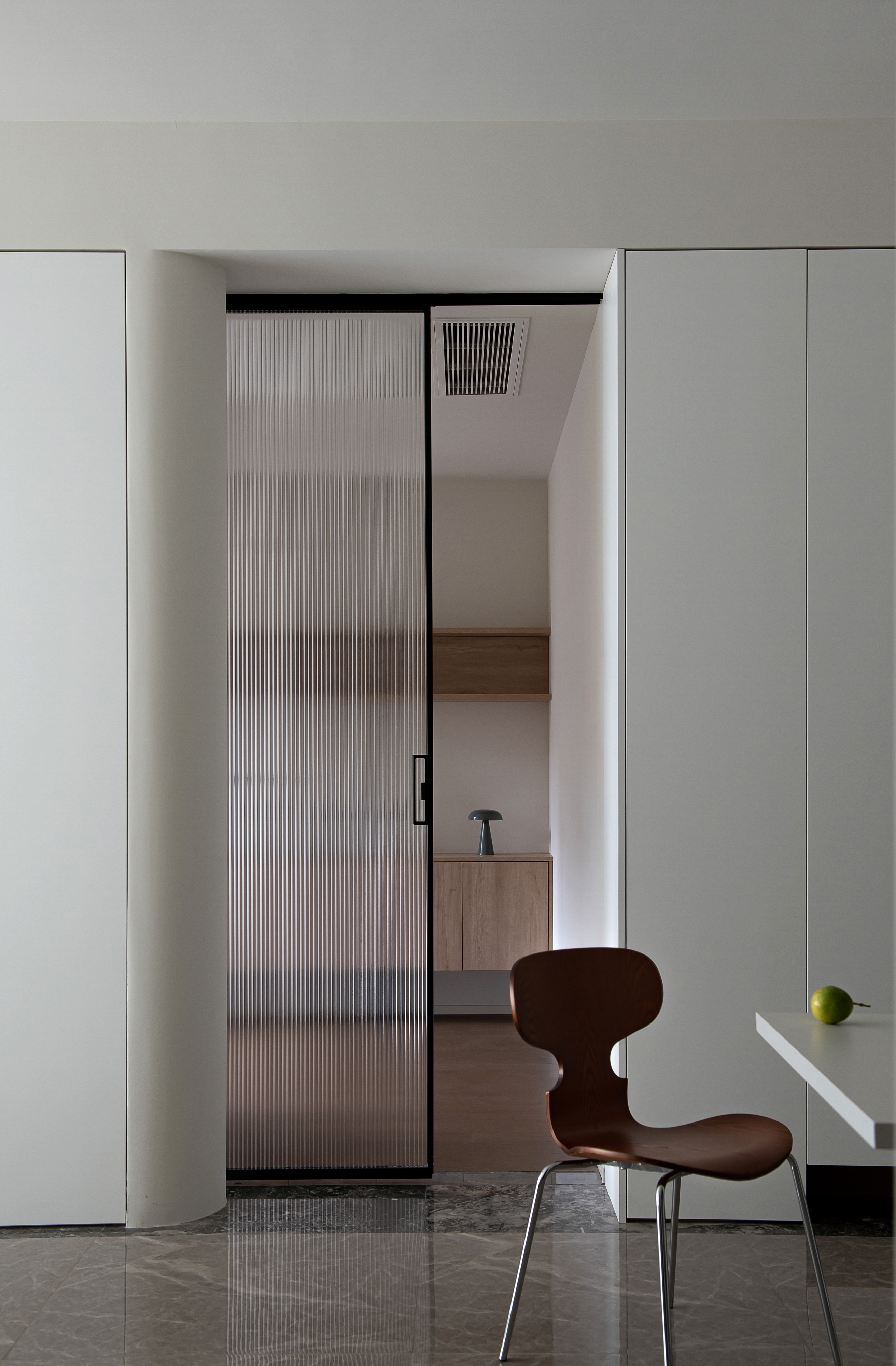 空间布局:1、我们将客厅和书房间的隔墙拆除,用满墙电视柜来代替隔墙,将书房门替换成长虹玻璃滑门,以达到客餐厅和书房自然光互补的目的。同时也让书房和客餐厅形成心理和视觉上的联通,客餐厅不再是一个方正且狭窄的空间,而是一个多元复合且充满趣味的空间。滑门完全打开时书房是客餐厅的一部分,滑门关闭时则成为一个私密的多功能房间。