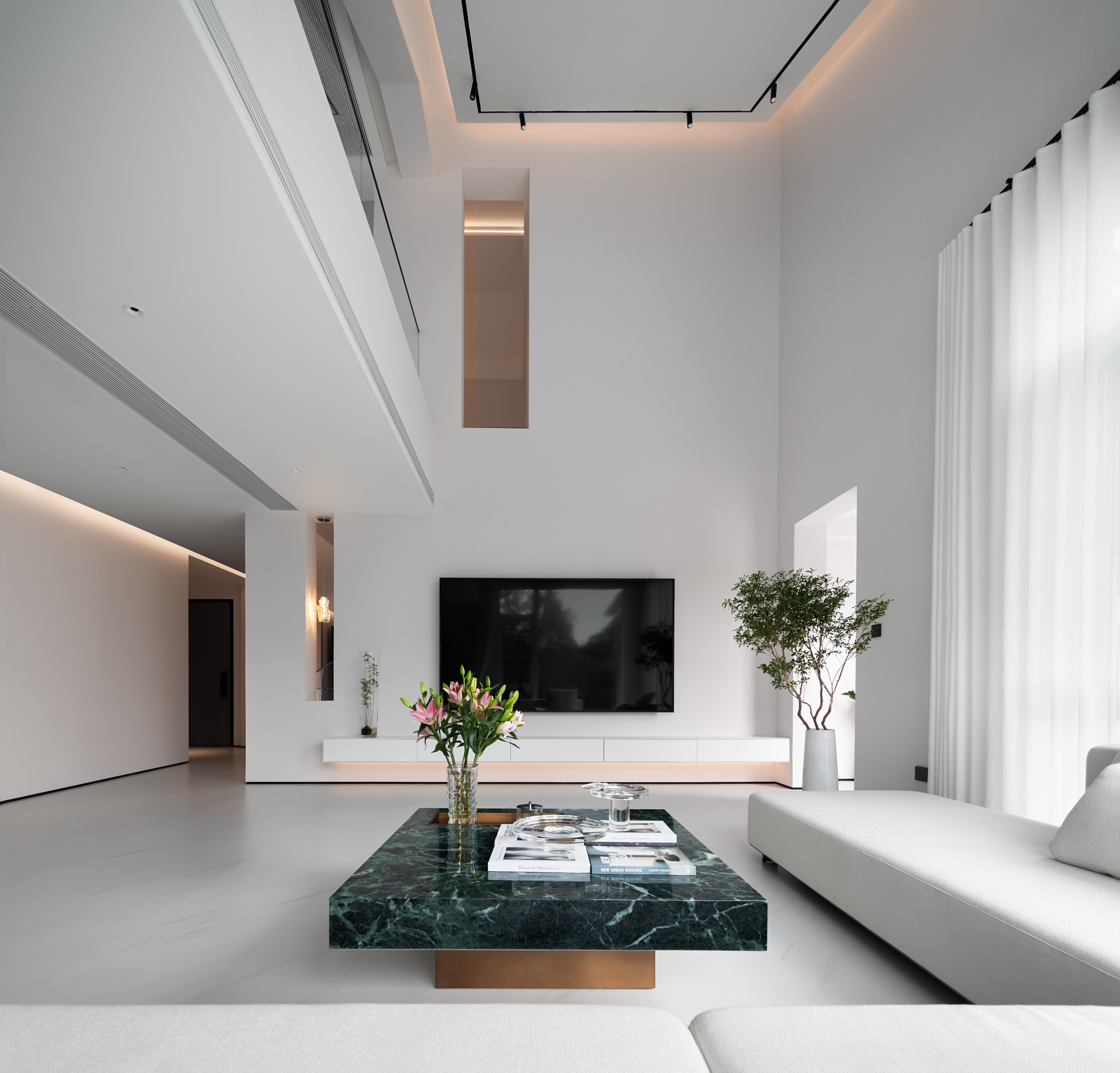 空间意境:设计旨在以舒缓的节奏和和谐的空间布局,满足当代生活需求,营造一处内外协调、身心放松的居所。进入客厅,挑高设计显著提升了空间的通透感和明亮度,为居者营造开放与自由的生活氛围。