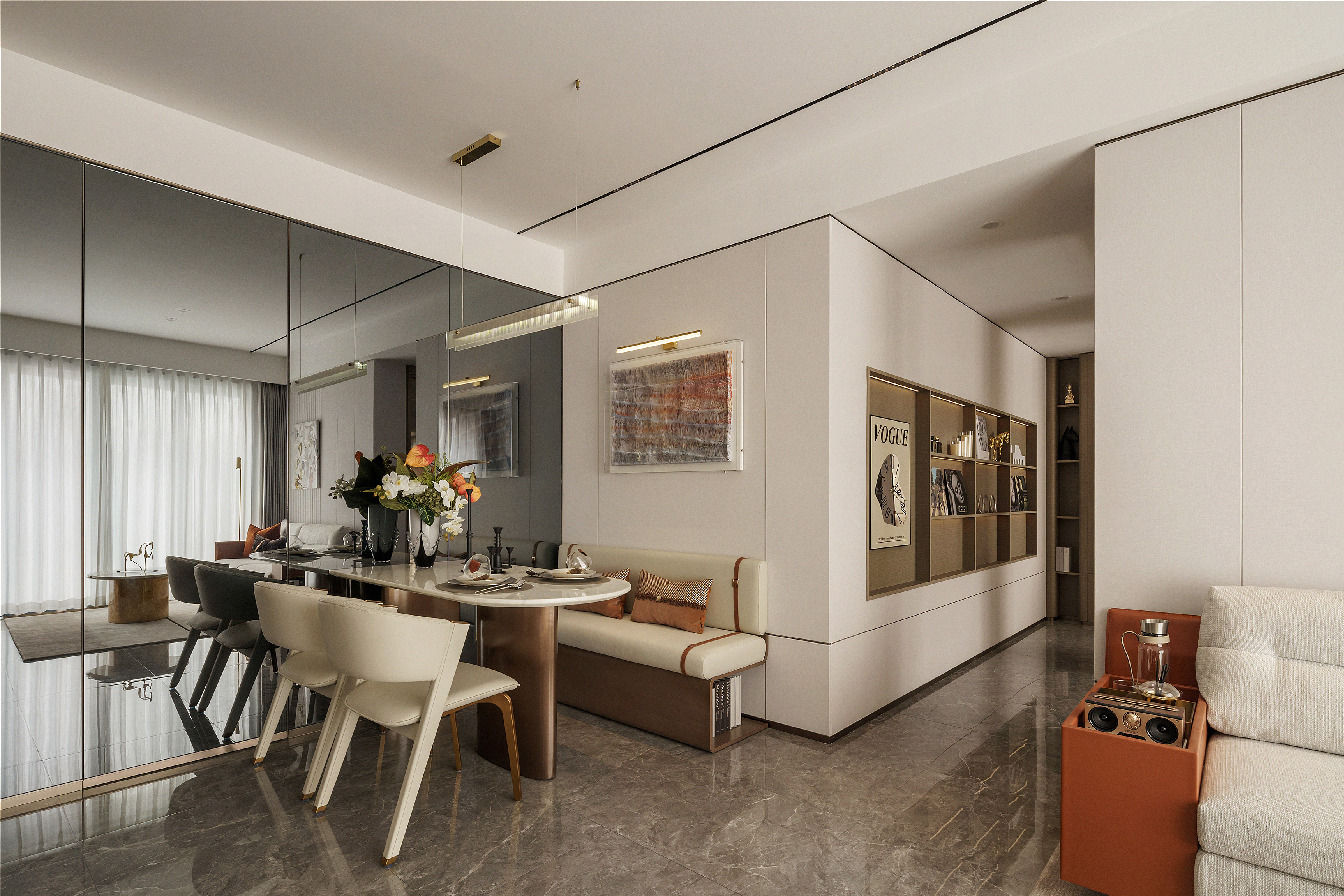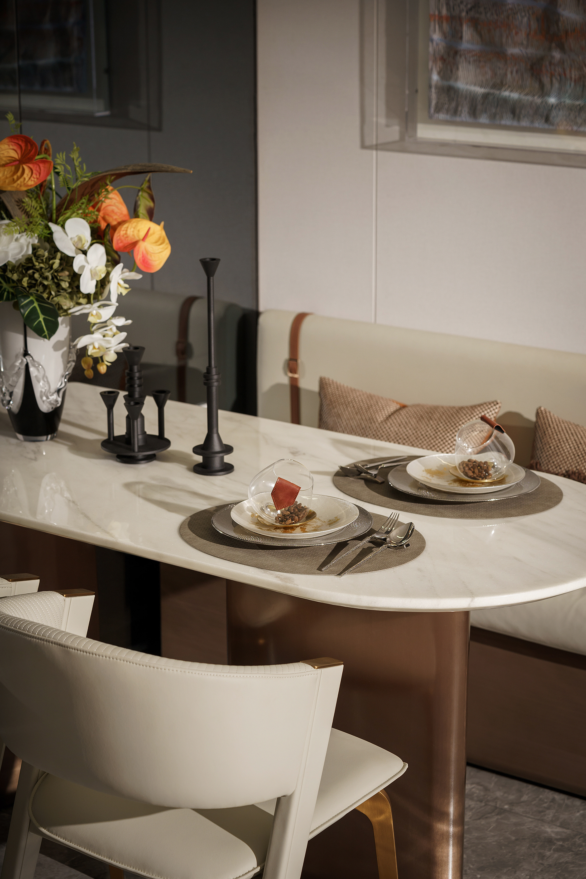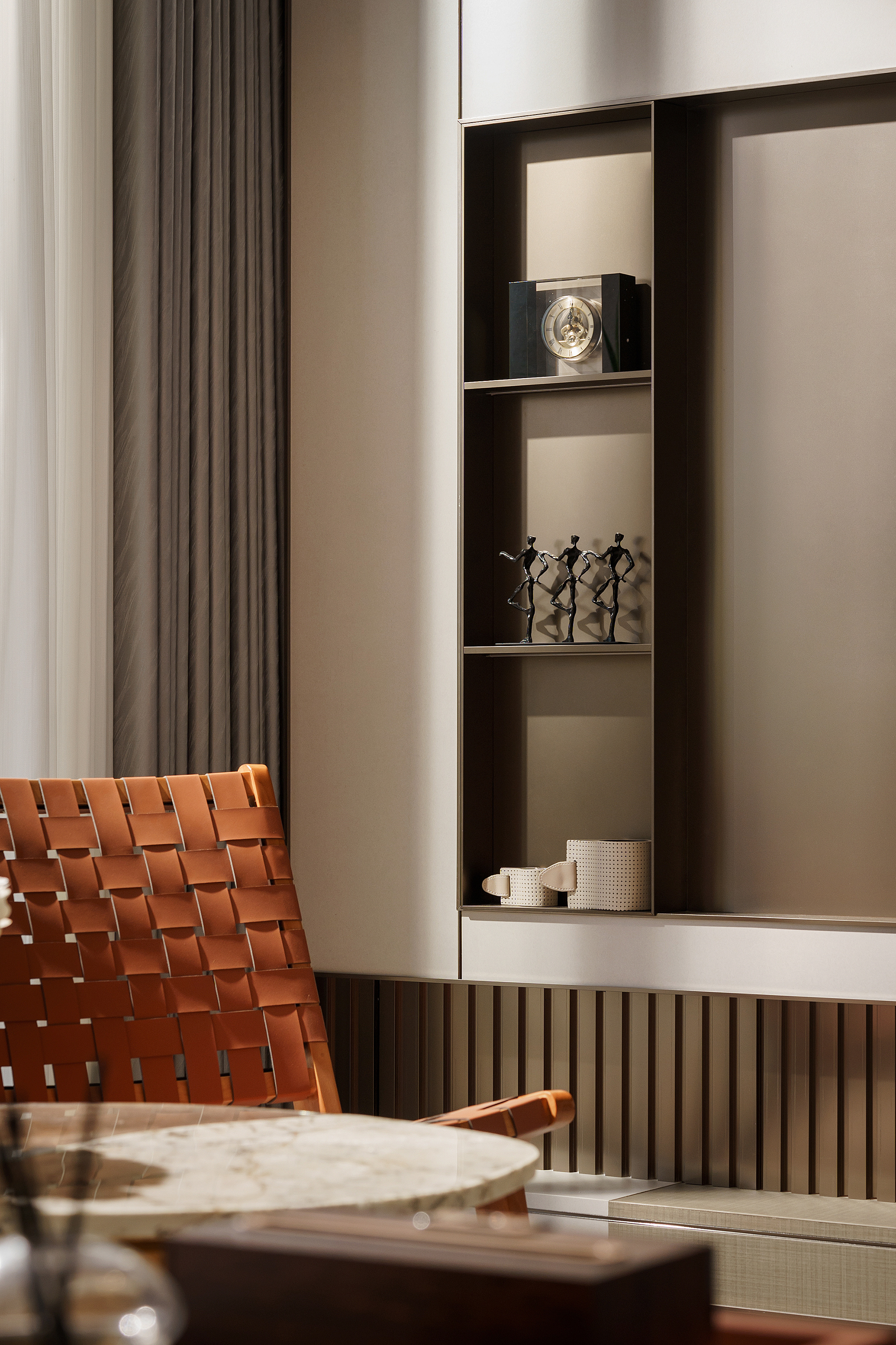 设计选材:提取橙赭色为主色调,优雅高贵是它的代名词。灰棕与柔金的交融,在空间中延展出不同色彩的层次与肌理。皮革的柔软与金属、大理石等元素的结合,碰撞出无限的奢华与精致。