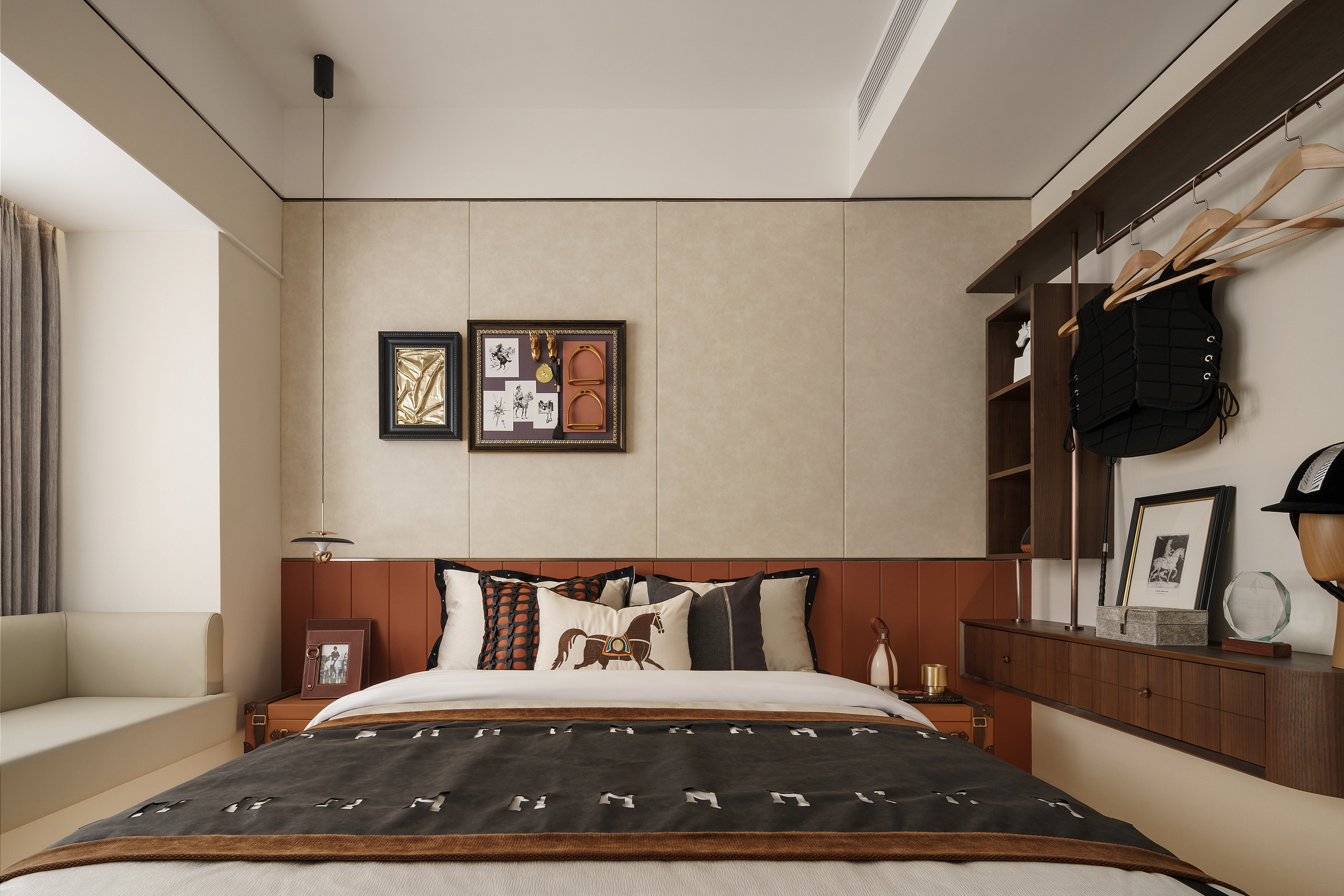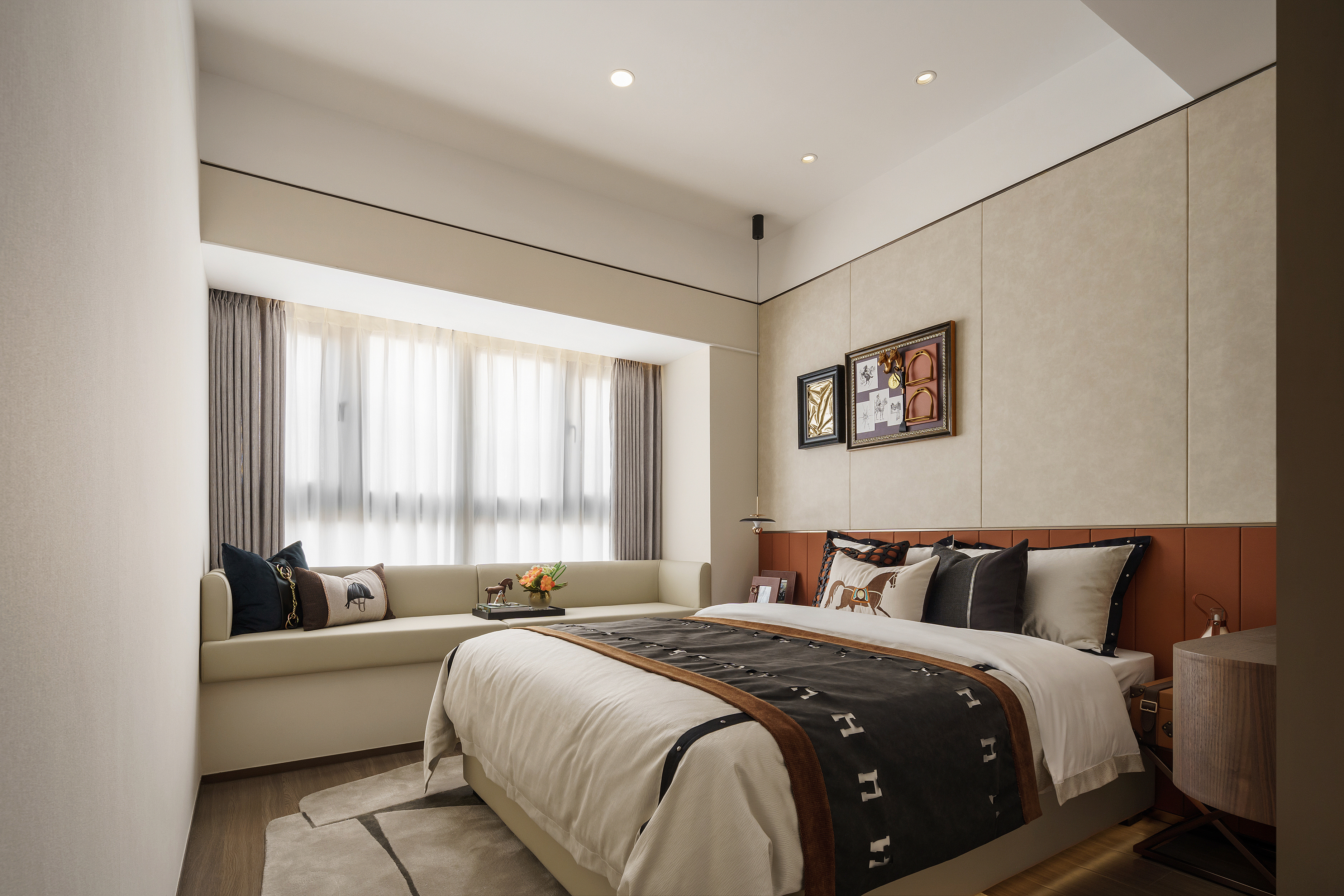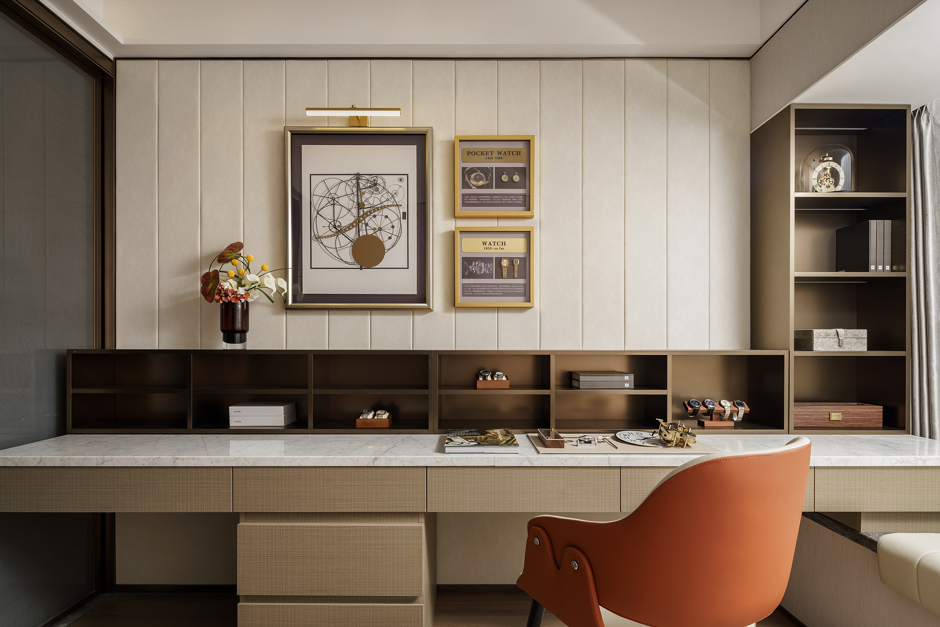 设计选材:提取橙赭色为主色调,优雅高贵是它的代名词。灰棕与柔金的交融,在空间中延展出不同色彩的层次与肌理。皮革的柔软与金属、大理石等元素的结合,碰撞出无限的奢华与精致。