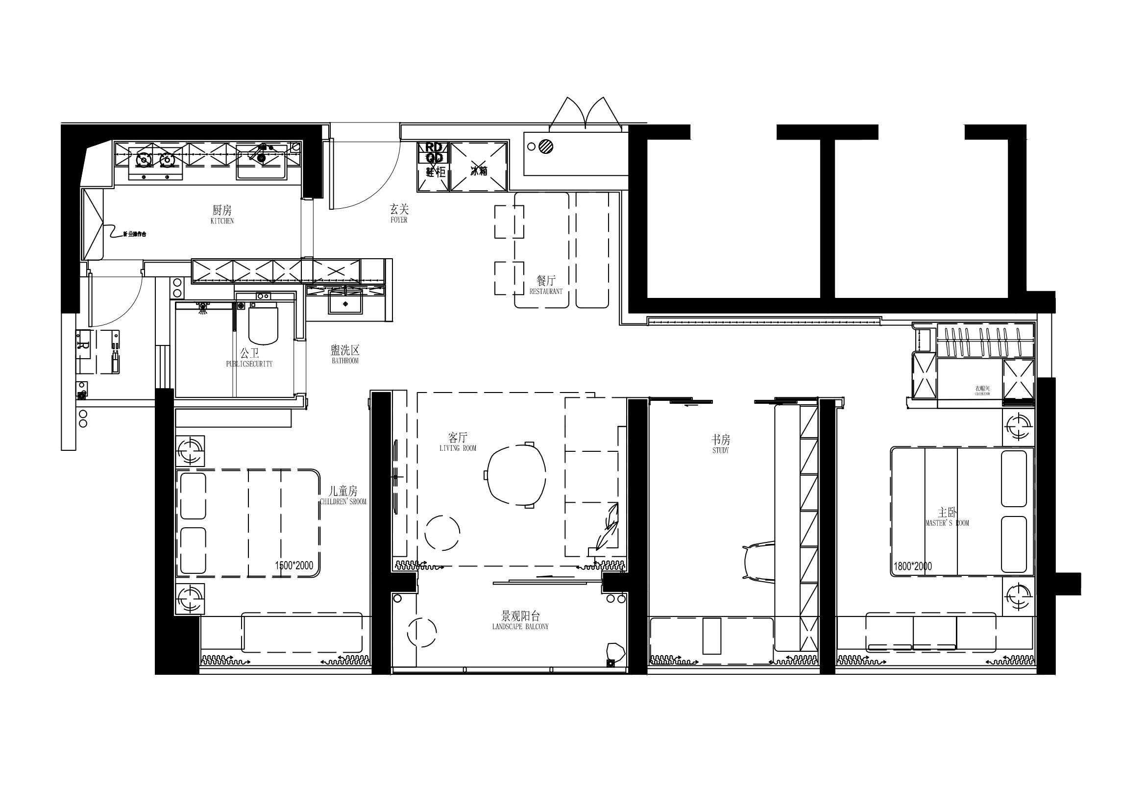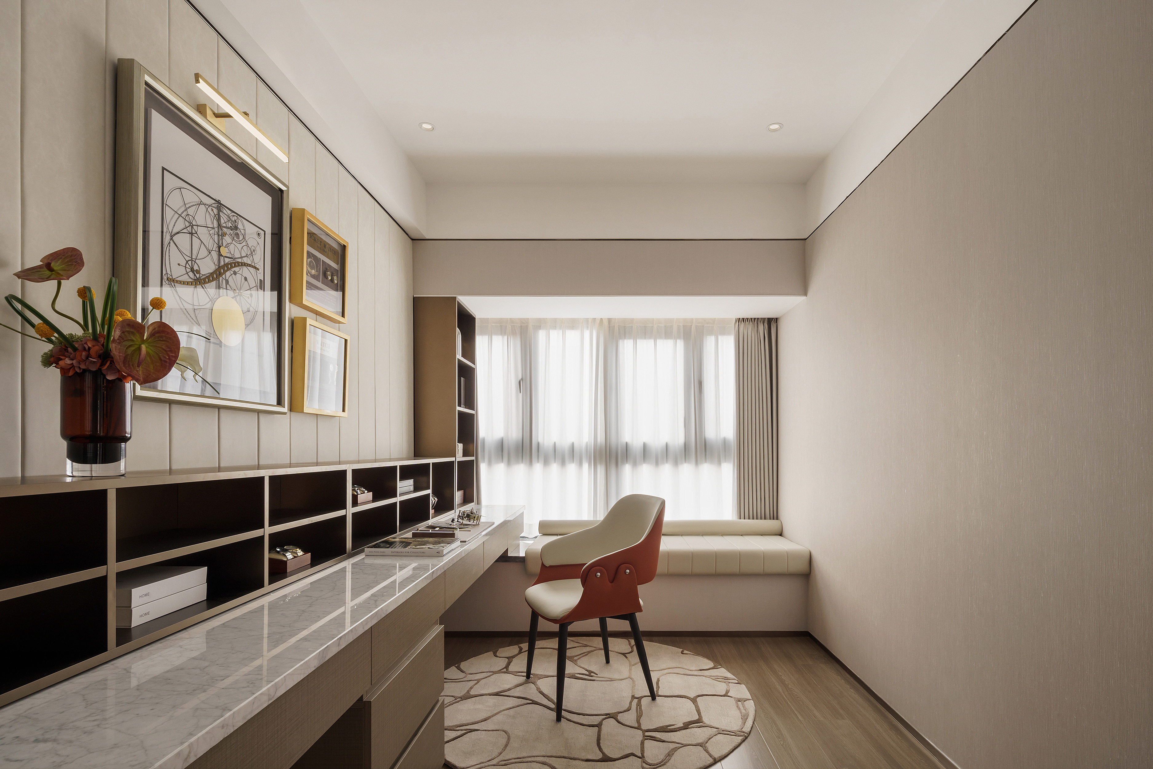 空间布局:满足日常功能的使用,同时设置了书房的功能分区,让业主在家也能满足办公的功能使用,同时也能在书房辅导孩子作业,实现寓教于乐的功能。
