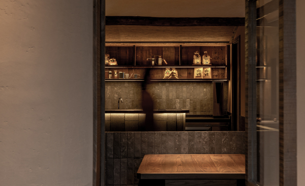 暖场空间的基本元素是炭烧木、水洗石、稻草漆,一束光照进来,透过框景跃然域内。室内与自然环境融为一体,增强了空间自然的美感,为食客提供一种心灵的慰藉和温暖的归属感。