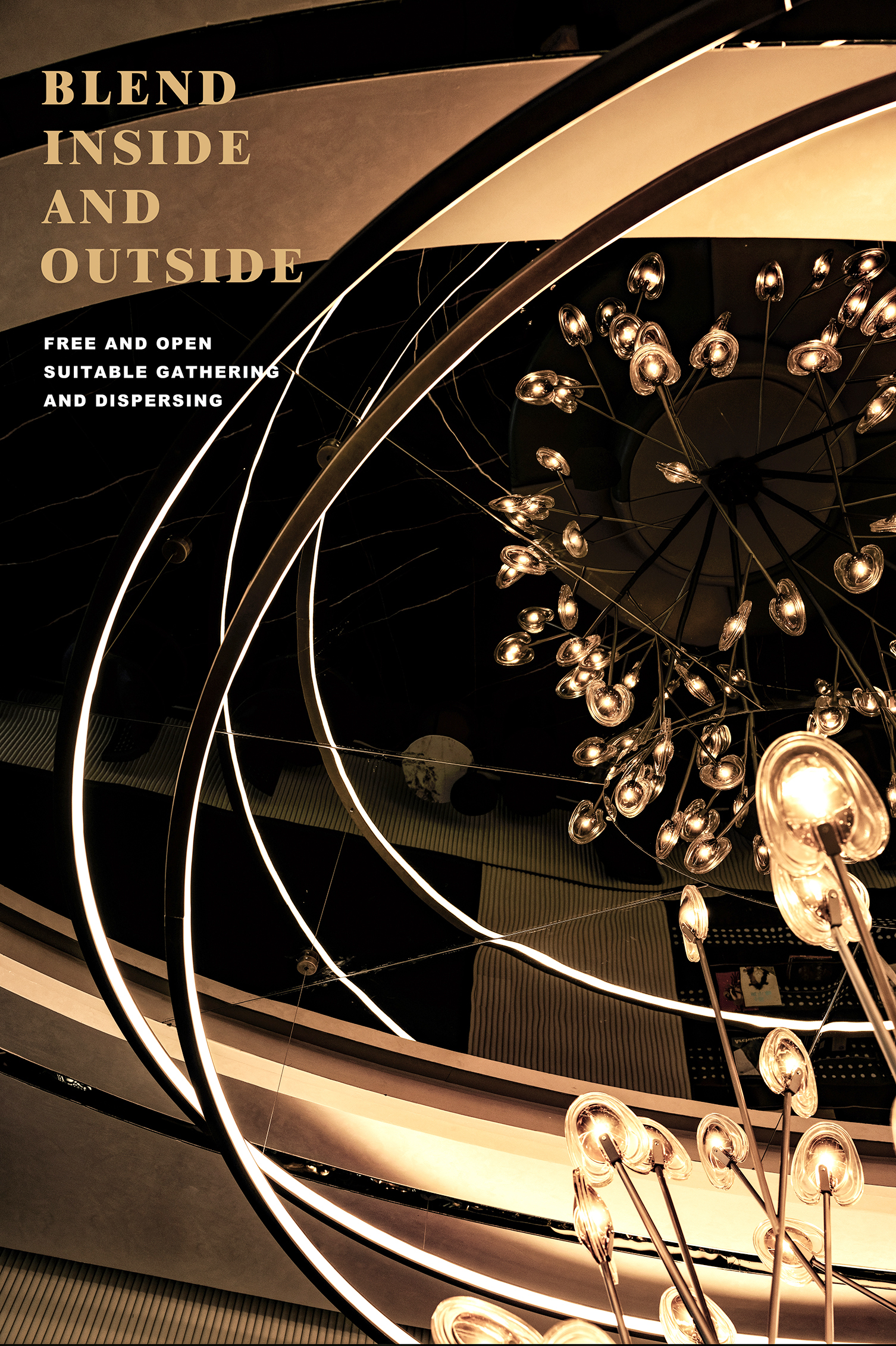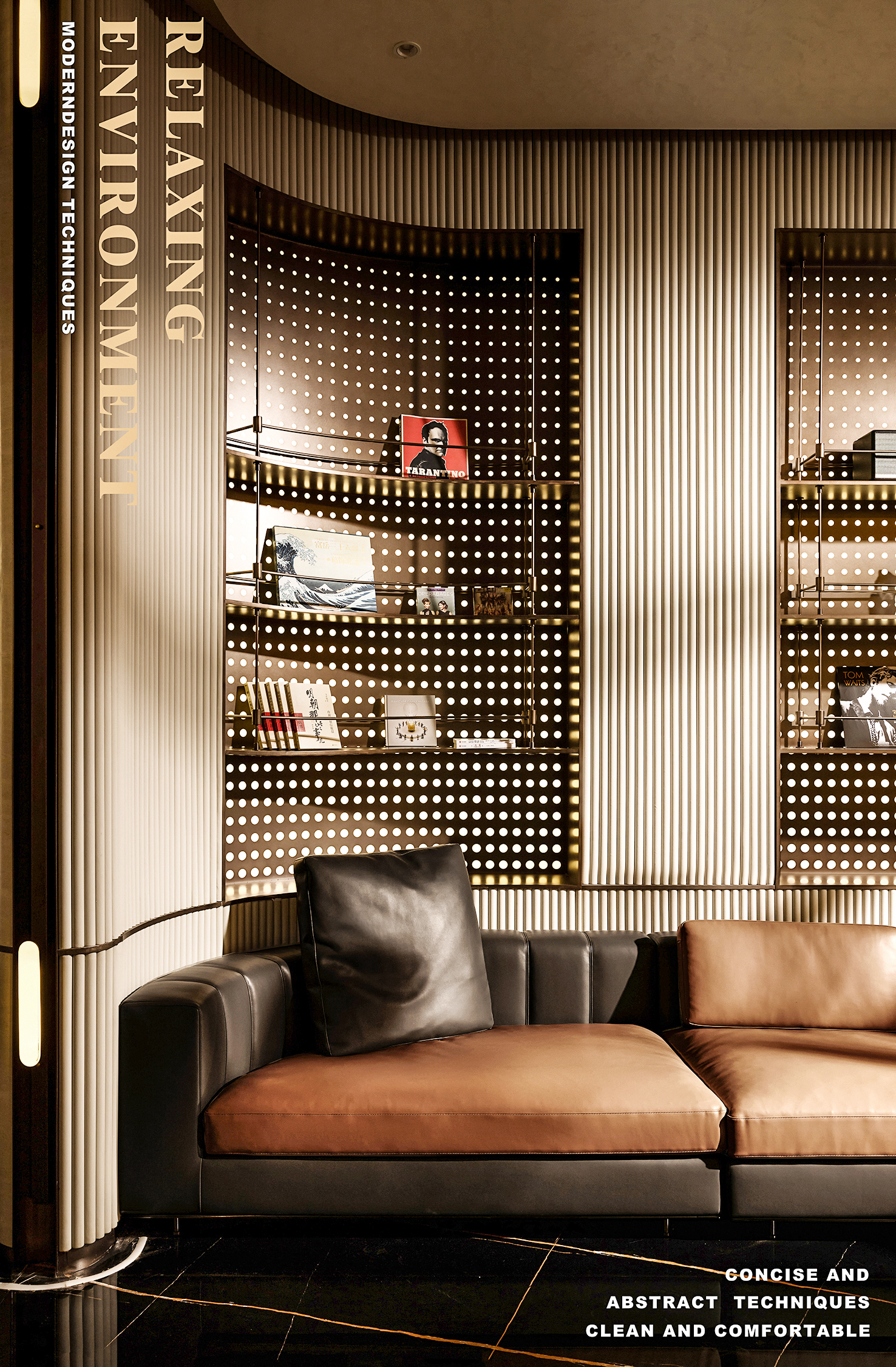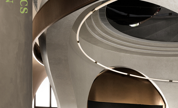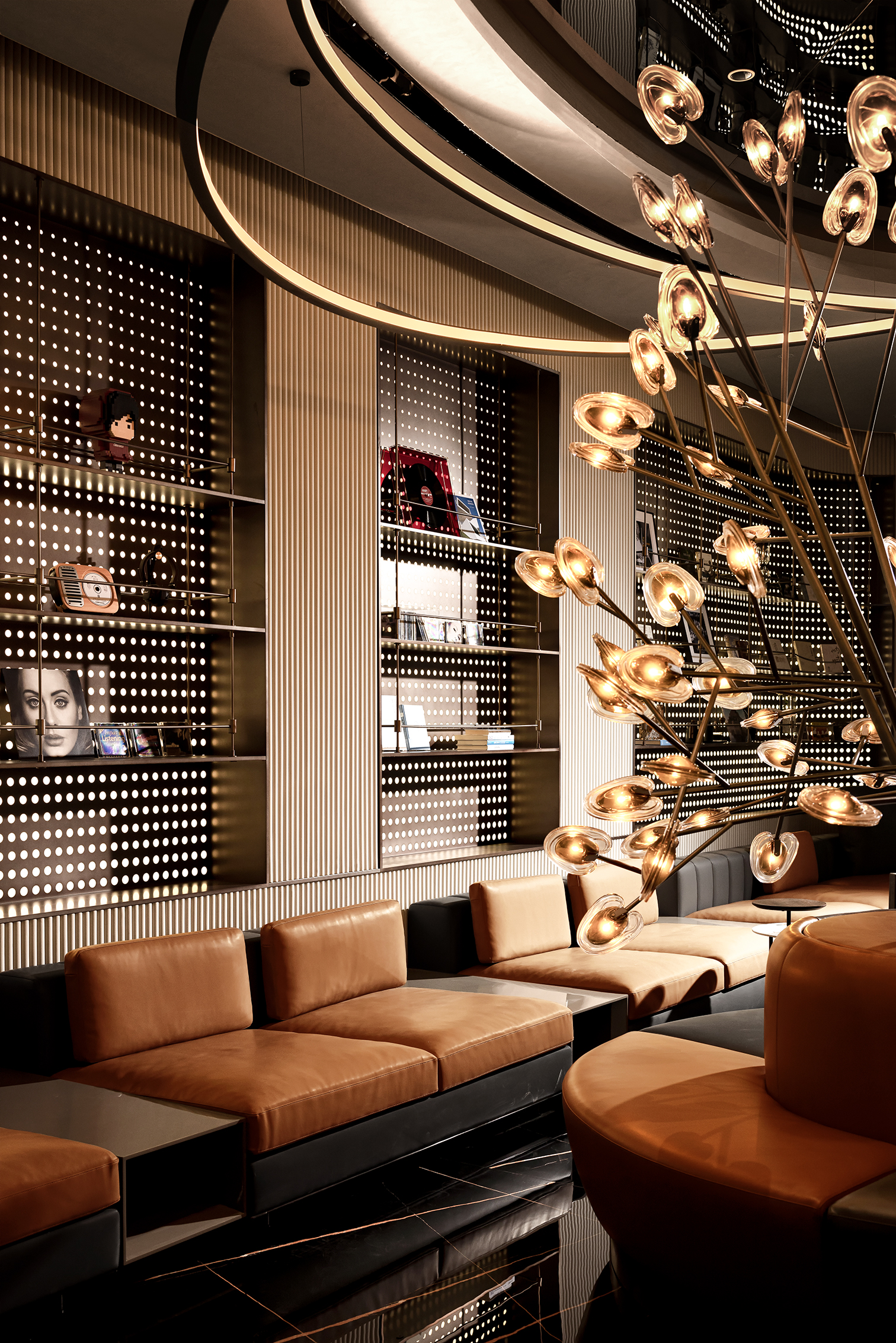 空间意境:空间体验具有多重感知性,灵动的弧形线条消除坚硬感,给予人温和又不失锐利的和谐感,也与场景的音乐生活主题相契合。