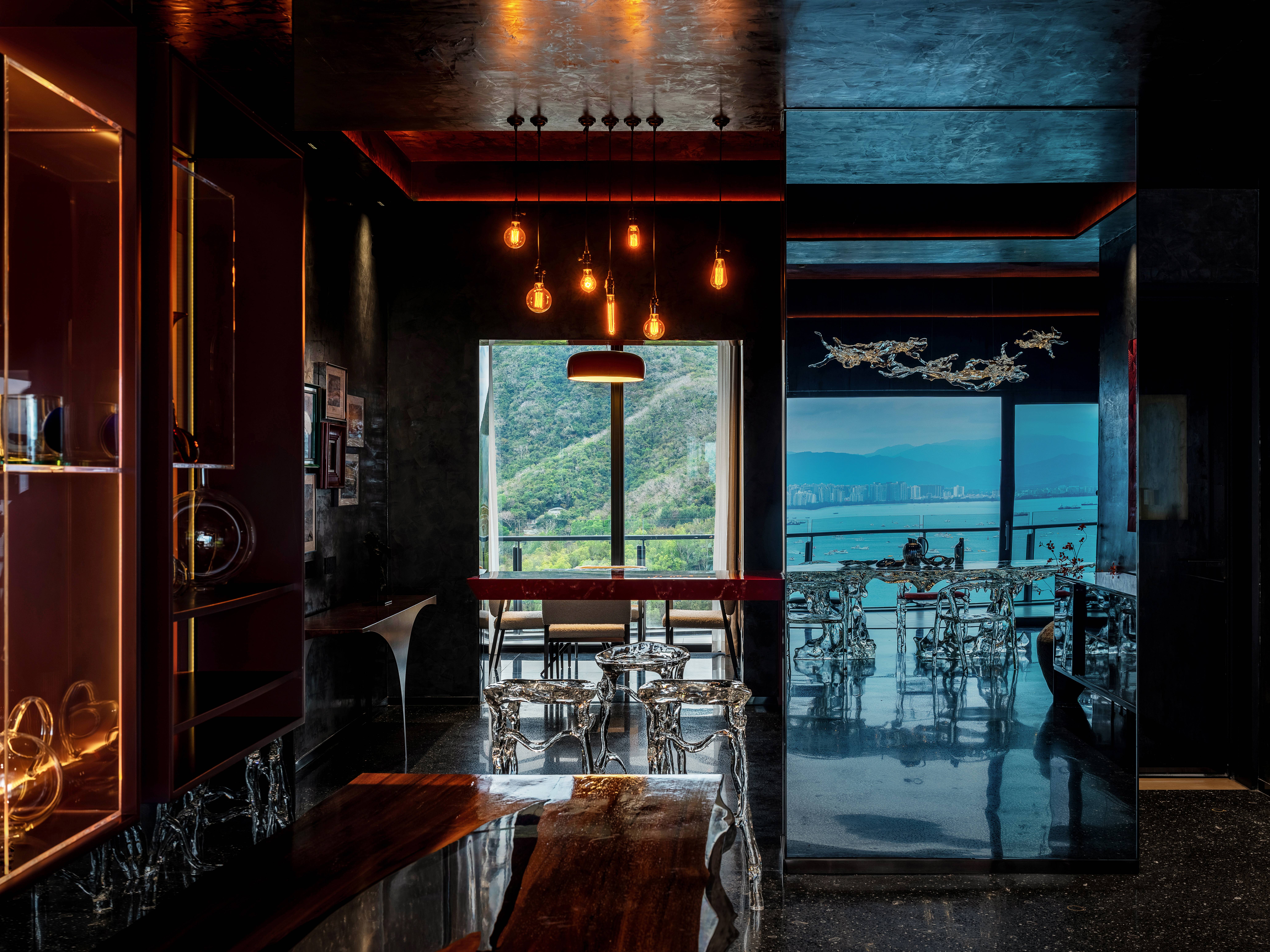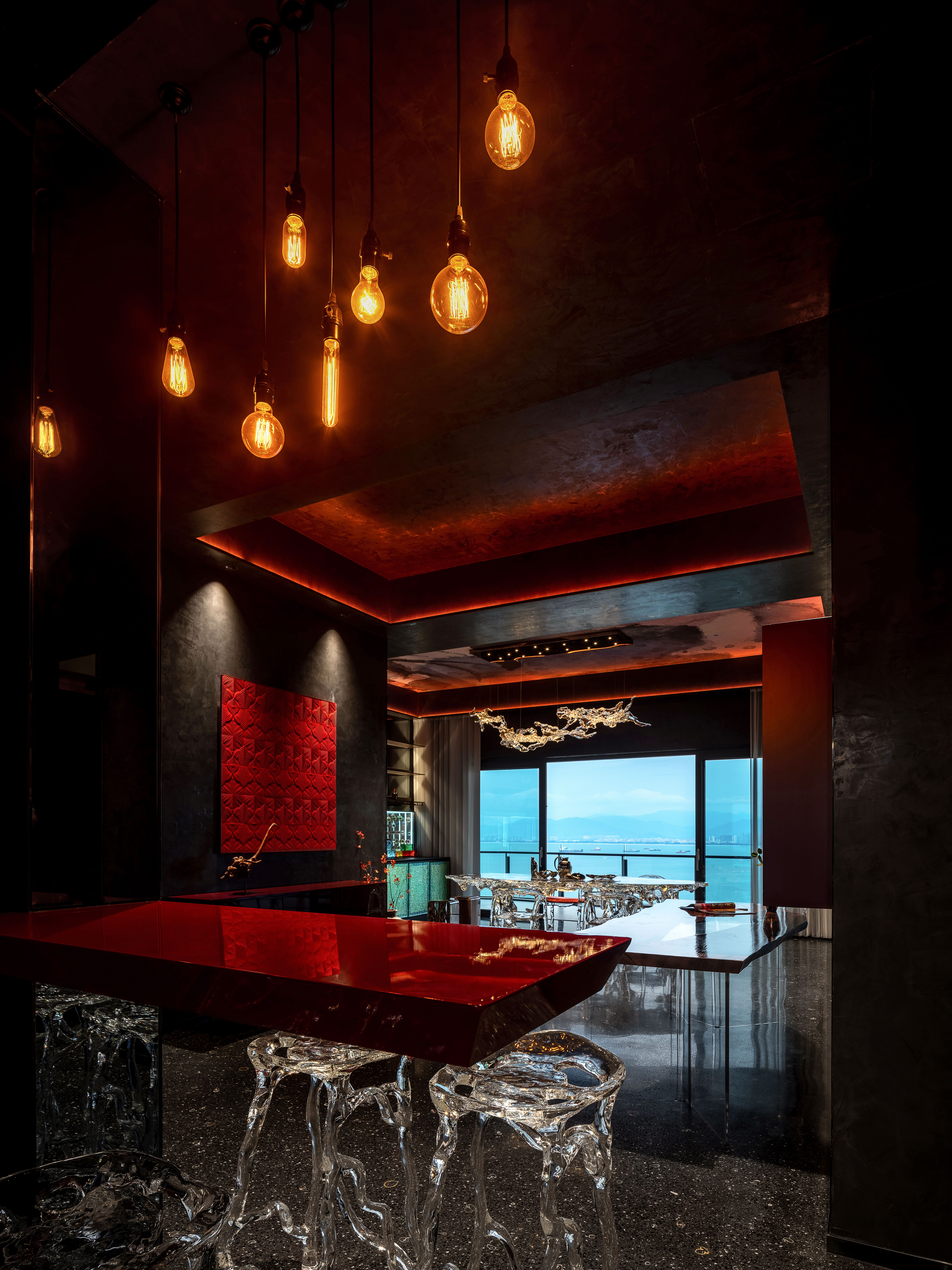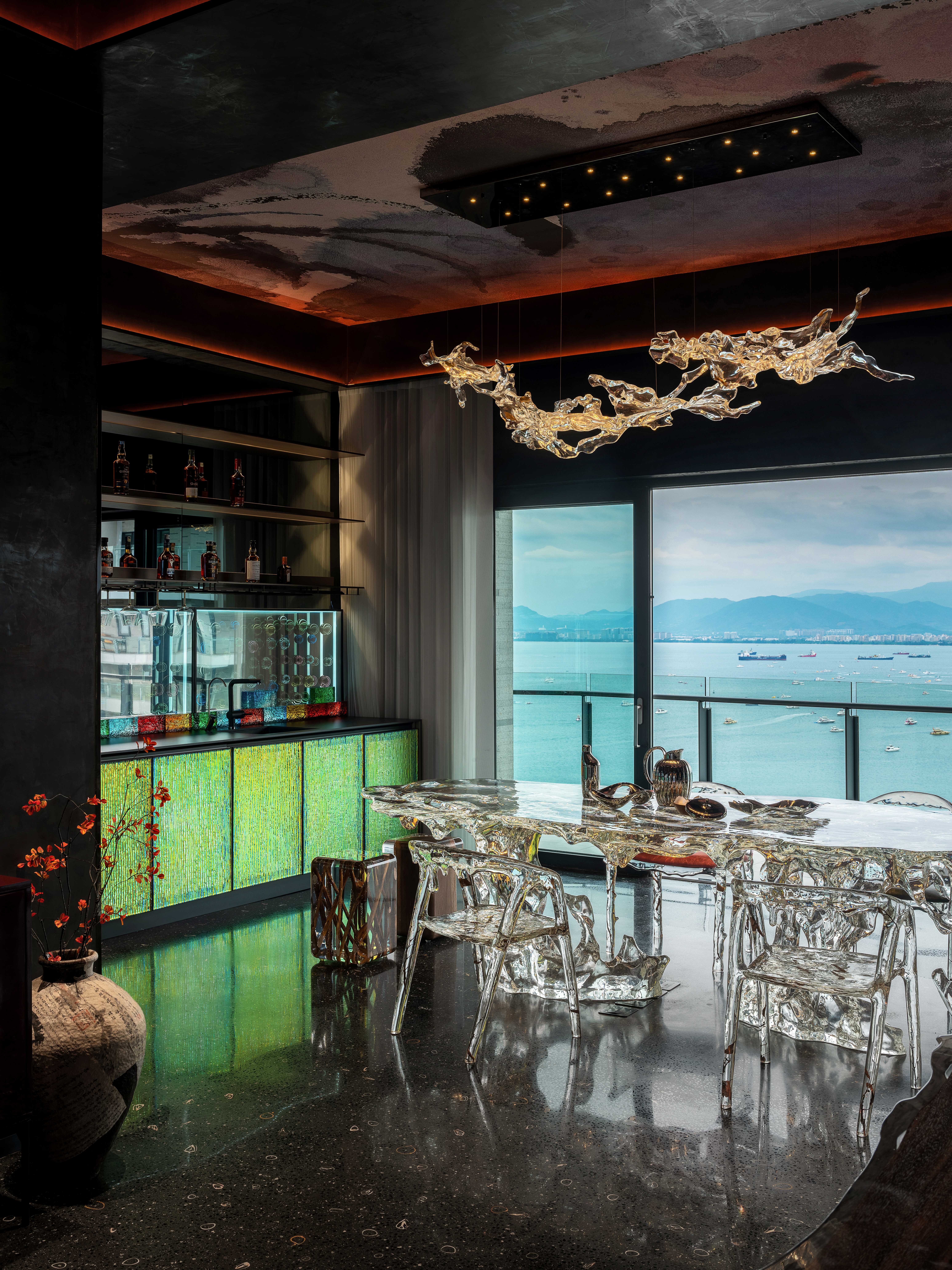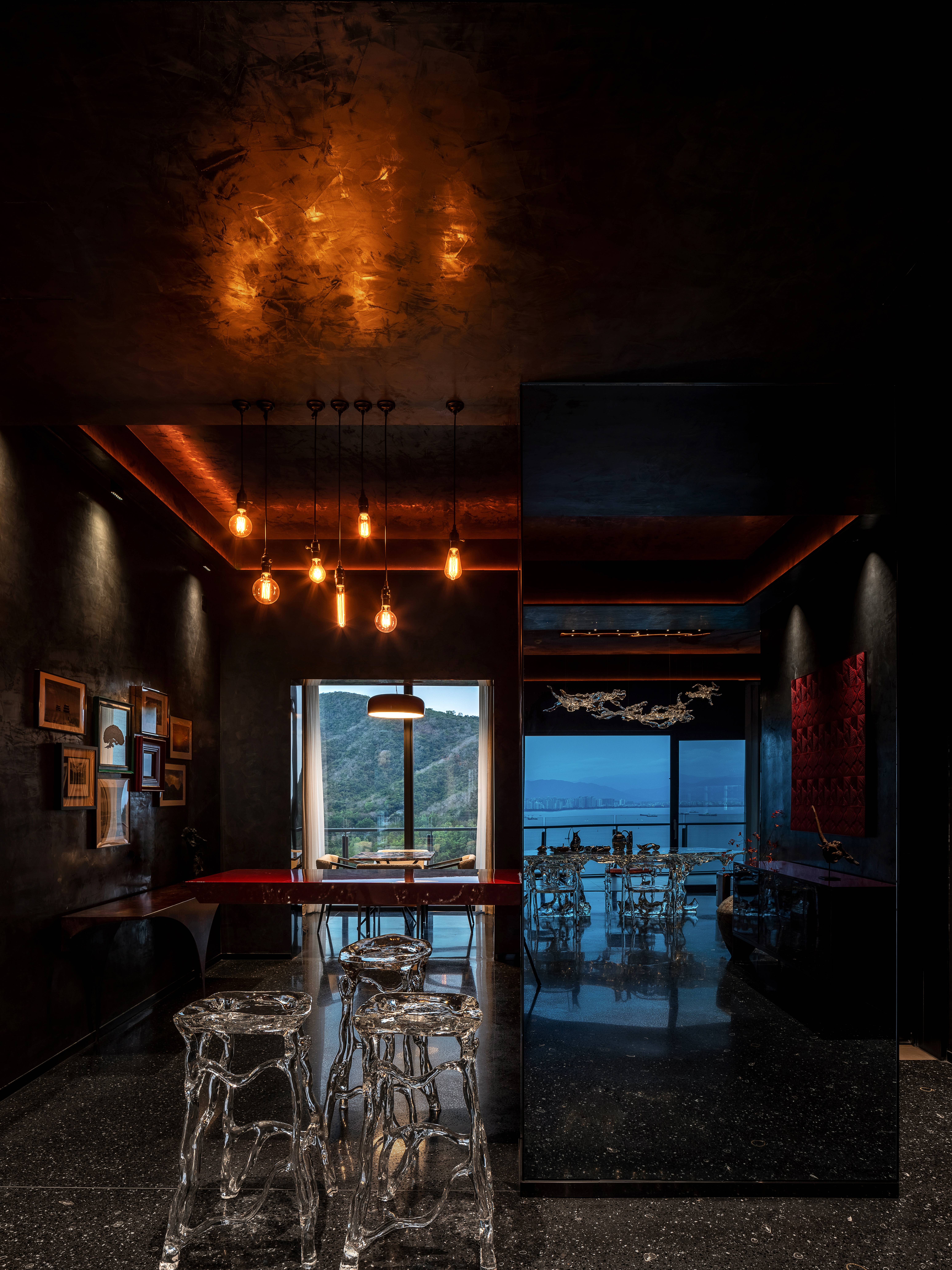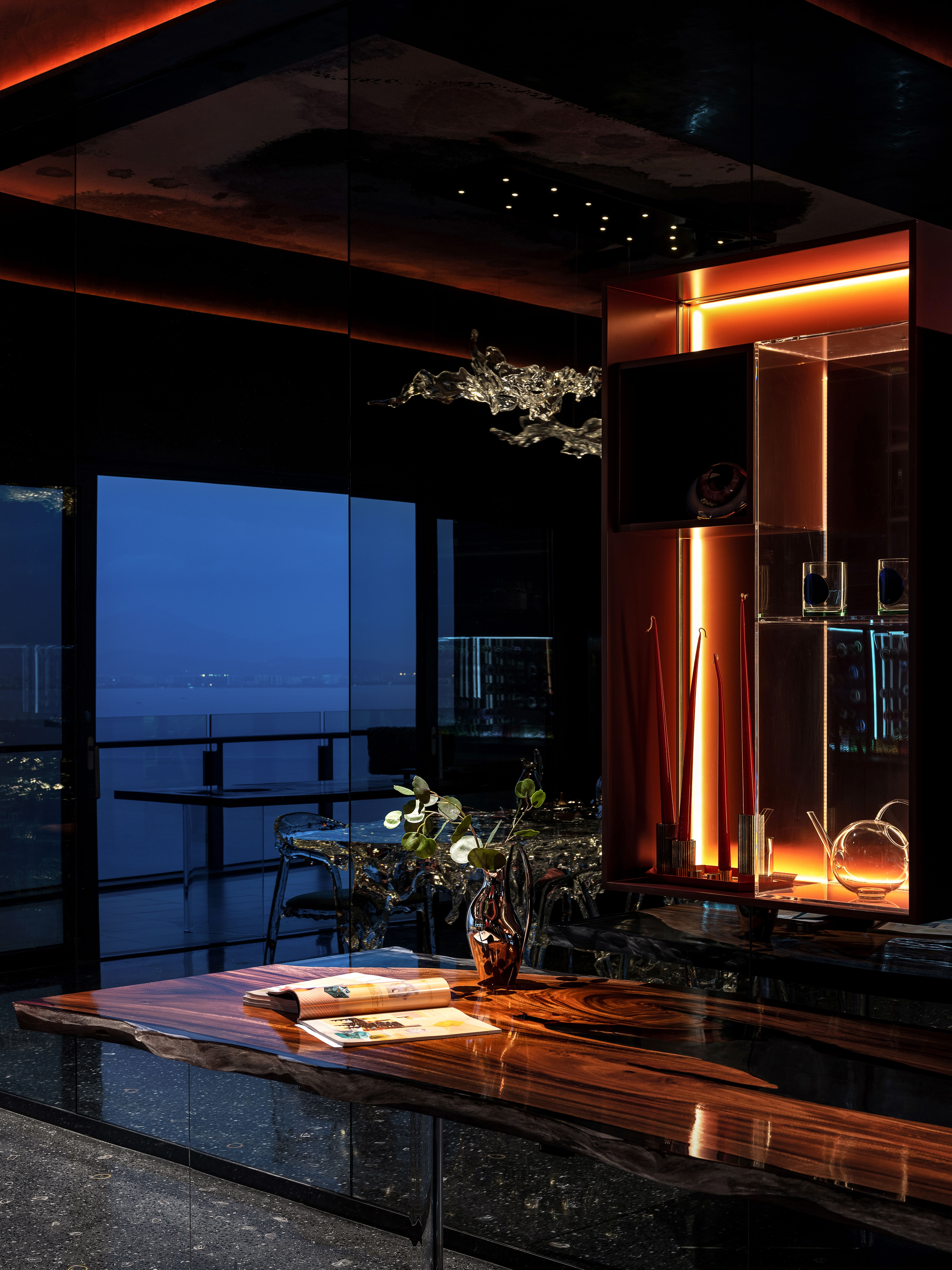 空间布局:“暗海幽居” 在空间布局方面大胆创新,突破传统。以开放式通透布局为主,拆除客厅、餐厅与临海观景区域间的封闭隔断,使空间视野无阻,室内外无缝衔接,让人时刻畅享大海盛景。运用悬浮式设计划分功能区,悬浮木质吊顶塑造海浪礁石之态并区分空间高度,玻璃隔断维持通透,各区域既独立又交融,似海陆相依。借巧妙家具摆放与规划构建海景聚焦线,沙发、餐桌朝海排列,搭配玻璃栈道通道,引导人们深入海景核心,步步贴近大海,强化人海的视觉与情感纽带。