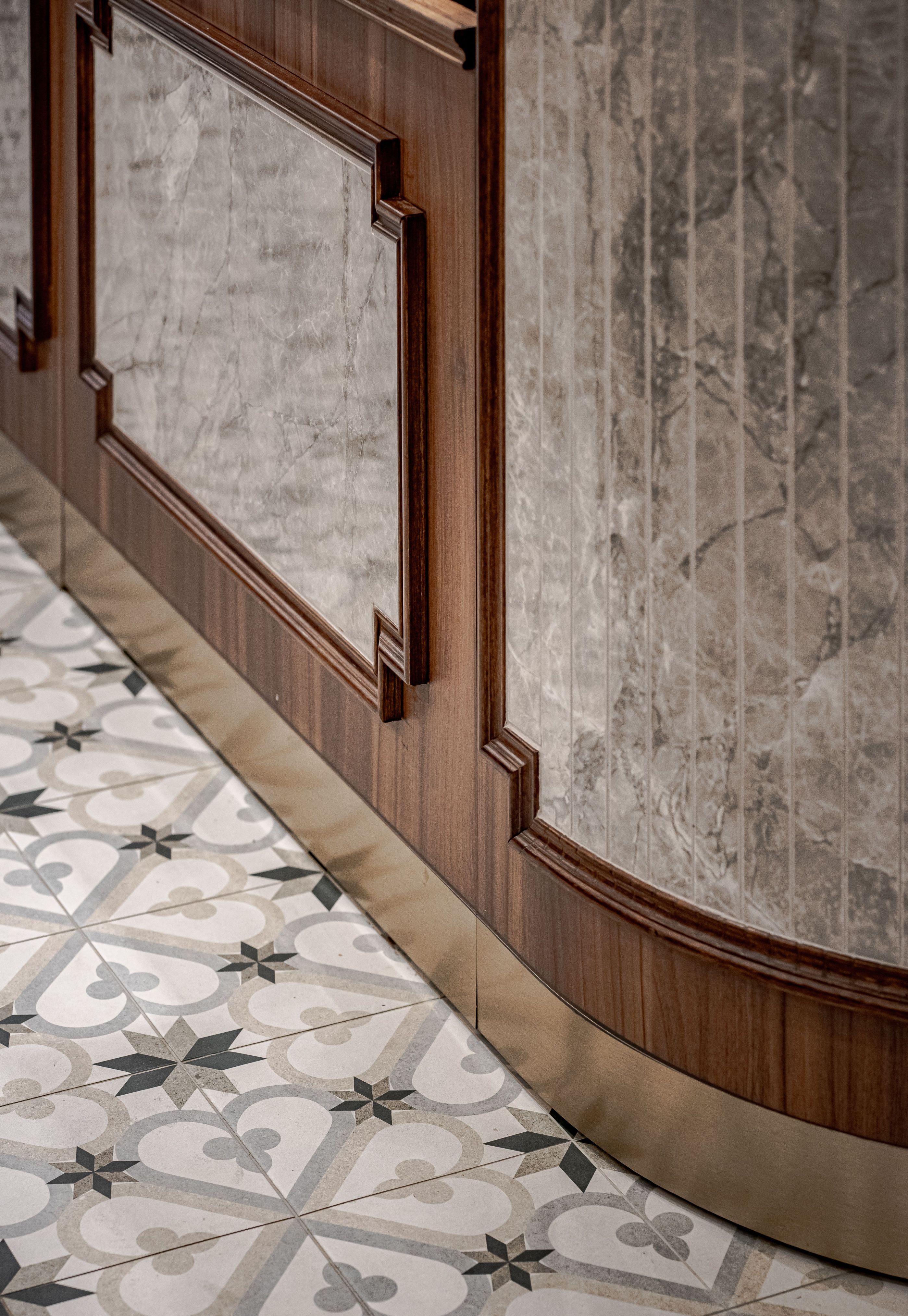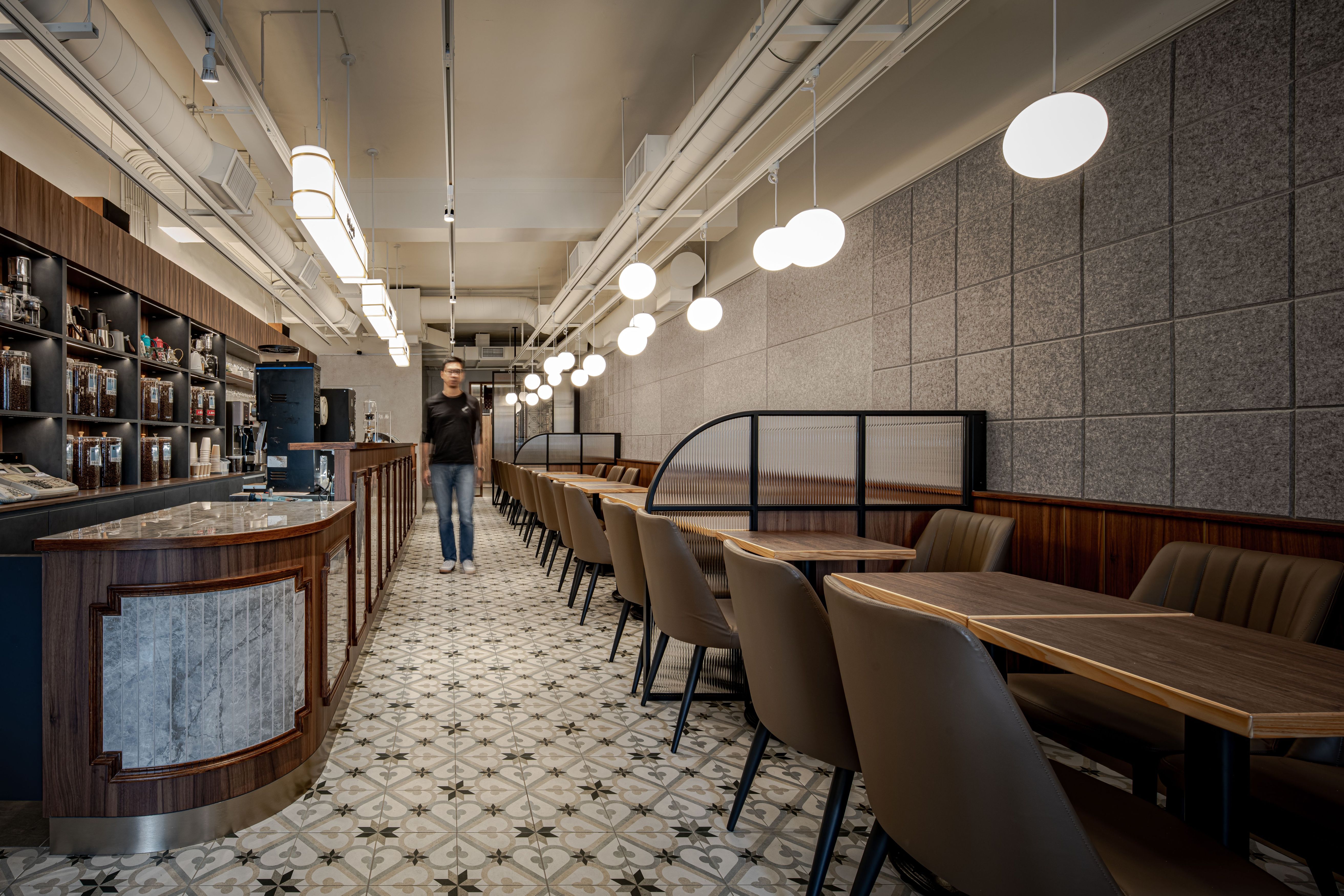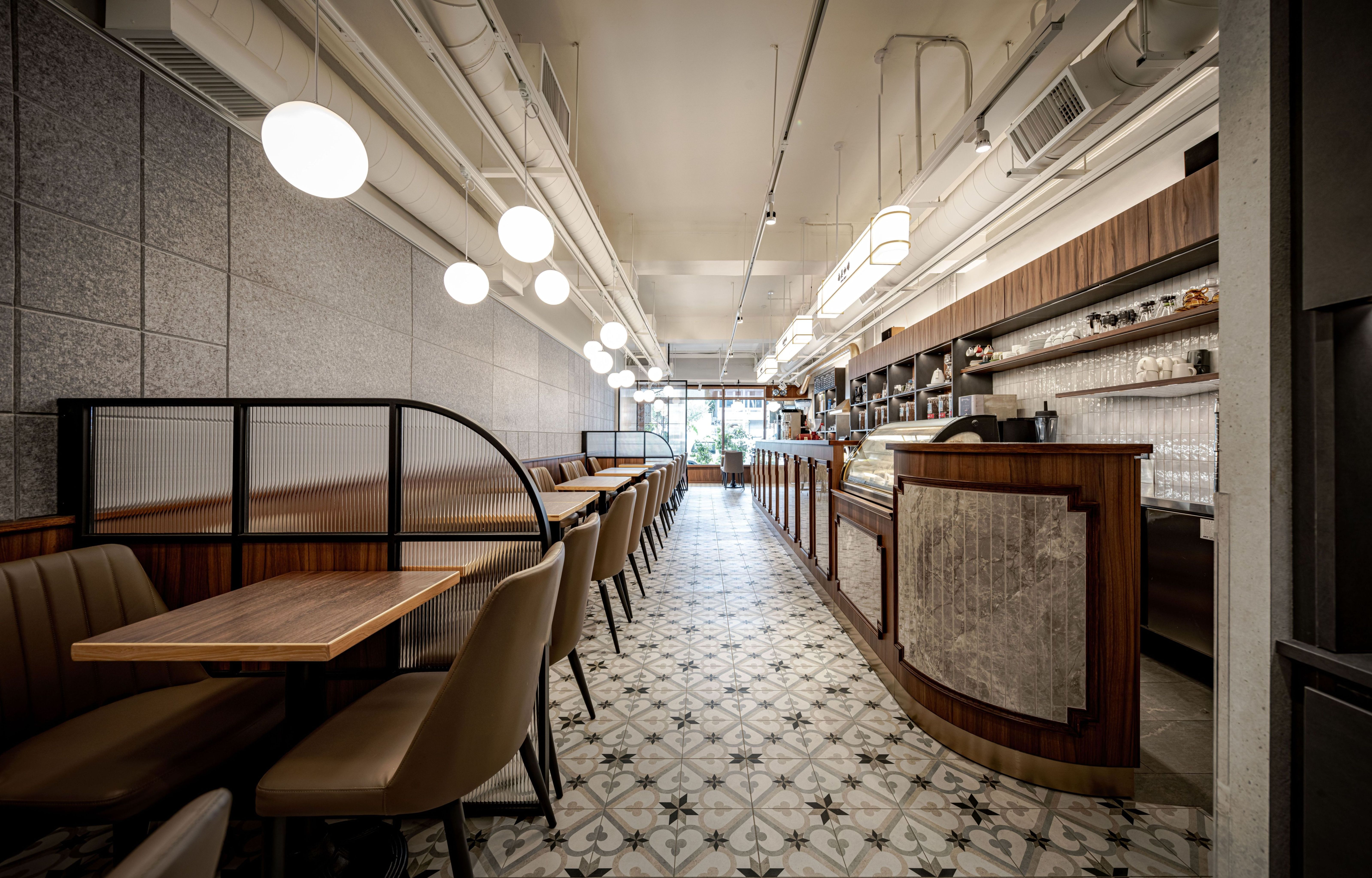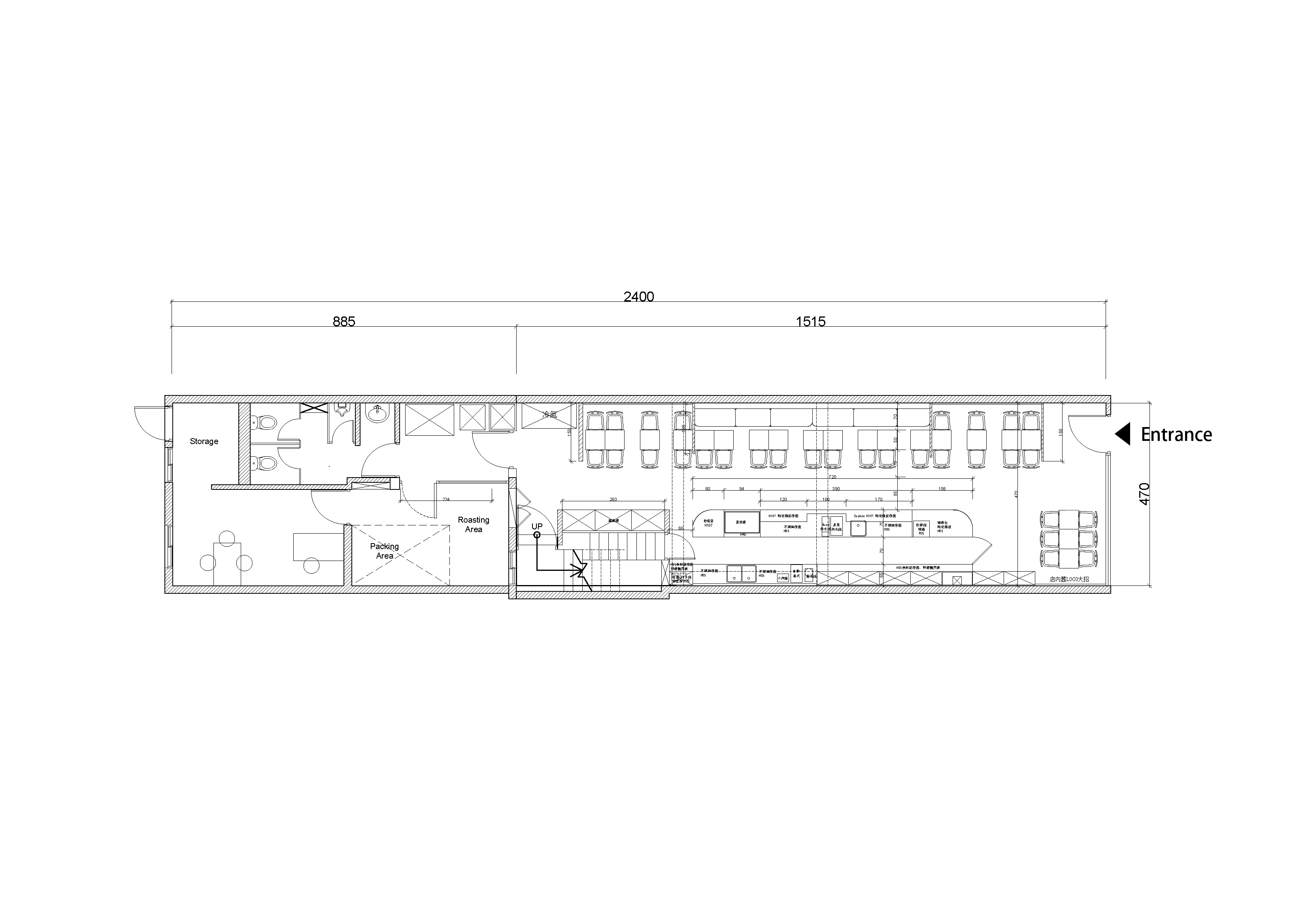在平面布局上,受限于传统透天店面的狭长空间,我们特别在材质性格于垂直高度上增加了轻重层次之分,浓墨重彩的语汇发生在吧台高度以下,以多种硬木纹、石材、复古线板及花砖地板等表现特色,使狭长的座位区增加了品尝咖啡时的安定感;而中上层高度则相对轻巧简约,并以当代常见的白色天花收顶,以此在狭长的店面空间中创造更多层次。