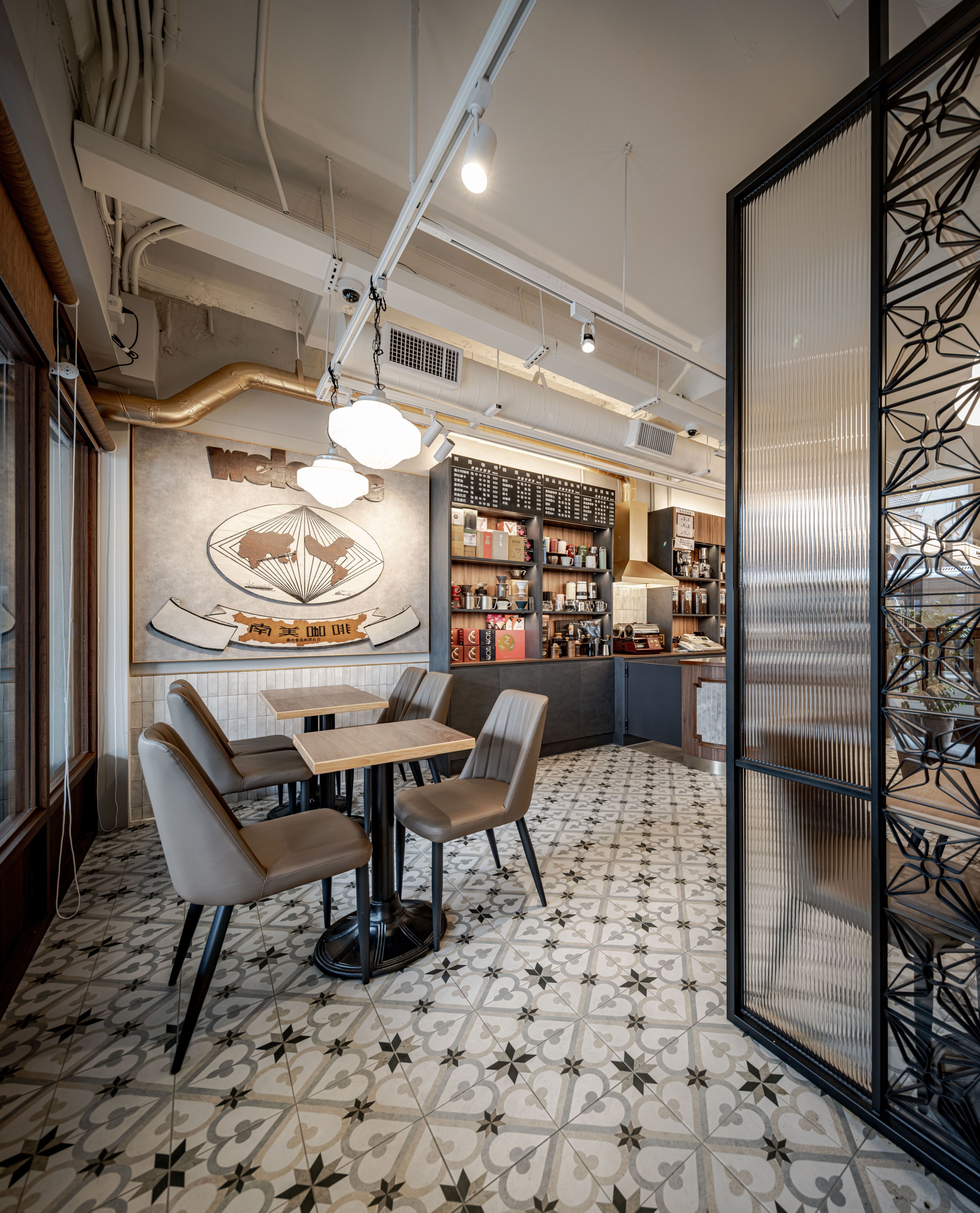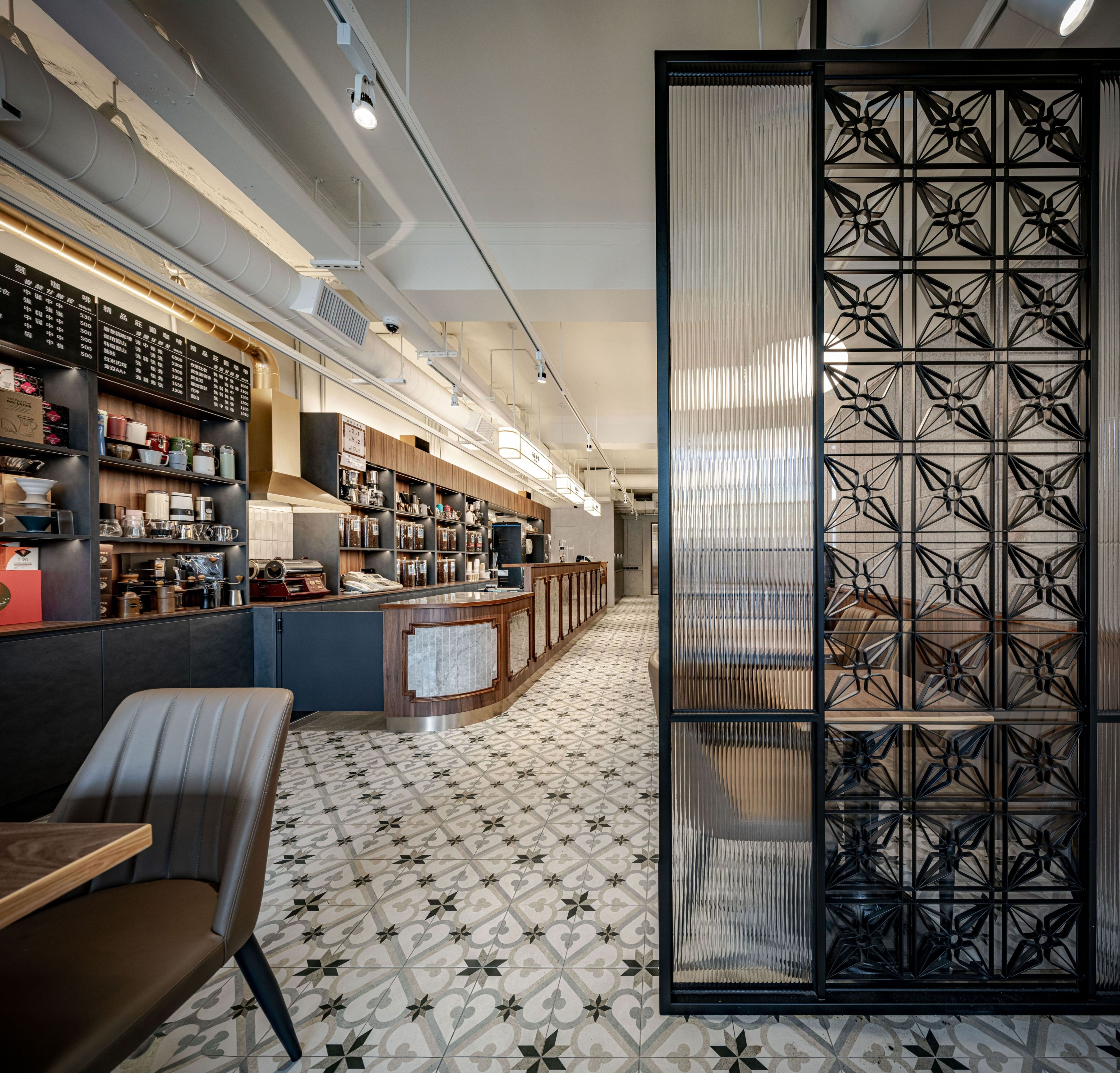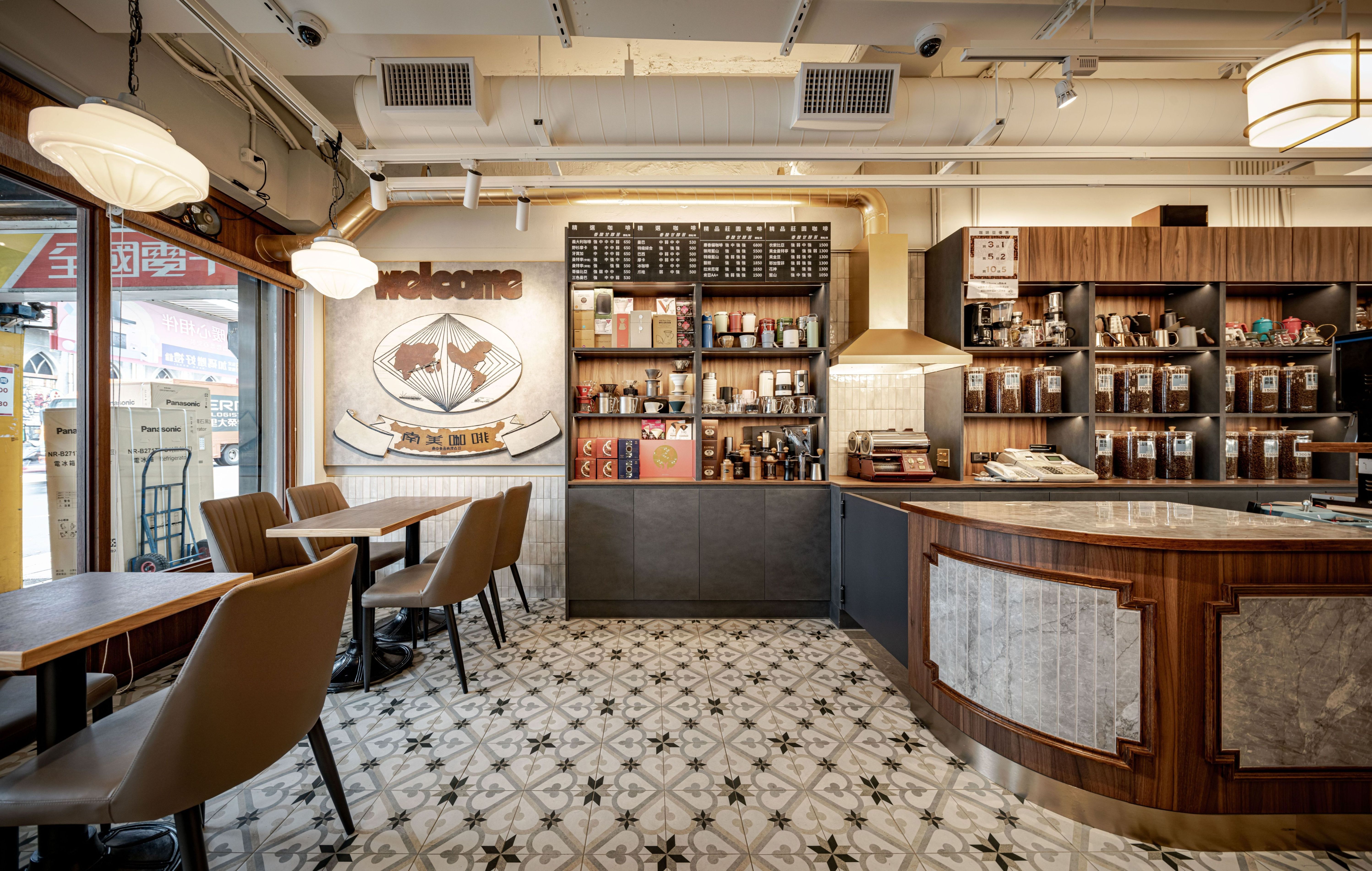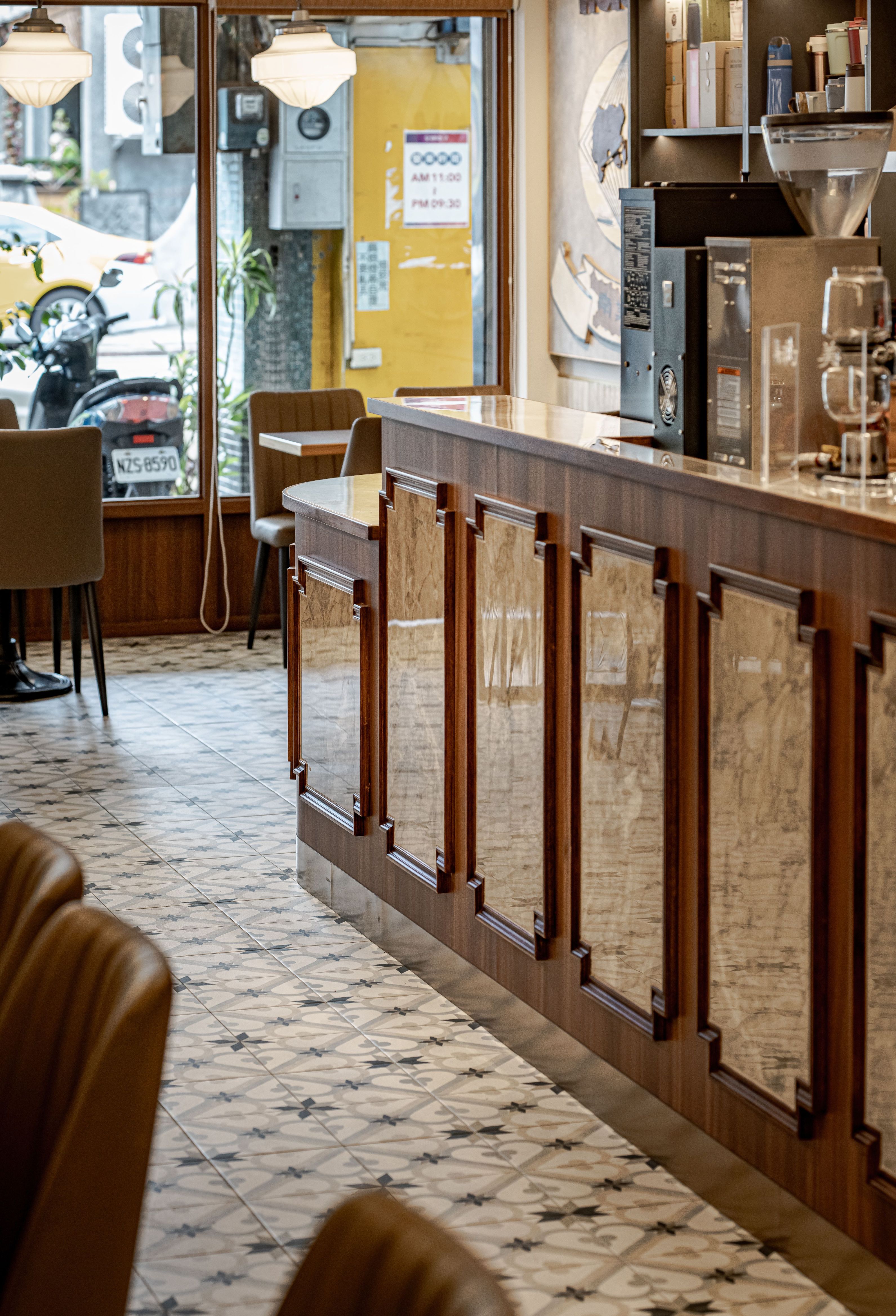 在美学上,我们透过很明确地分析过程确立的风格定位,由于咖啡贸易史与殖民文化有着密切的关系,且士林地区又属台北市发展较慢的区域,街道仍保有明显地70~80年代之台北城市风貌,经过与客户的多番研究讨论之后,最终混合了老店初创时期的台北一般街巷建筑语汇以及殖民风格的装饰质感,将铁花窗、复古印花地砖、复古手工釉面壁砖、白雾玻璃灯具、东南亚硬木色调复古等元素一并整合,混搭半世纪前的台湾街巷印象与折衷的殖民主义风格,保留了店内几样数十年历史的老件装饰,甚至以桧木复刻了五十多年前第一代的招牌设于店内,让老顾客们彷佛沉迷在年轻时的旧时代当中,却又没有明确地时代感,使整体氛围洗炼而弥新。
