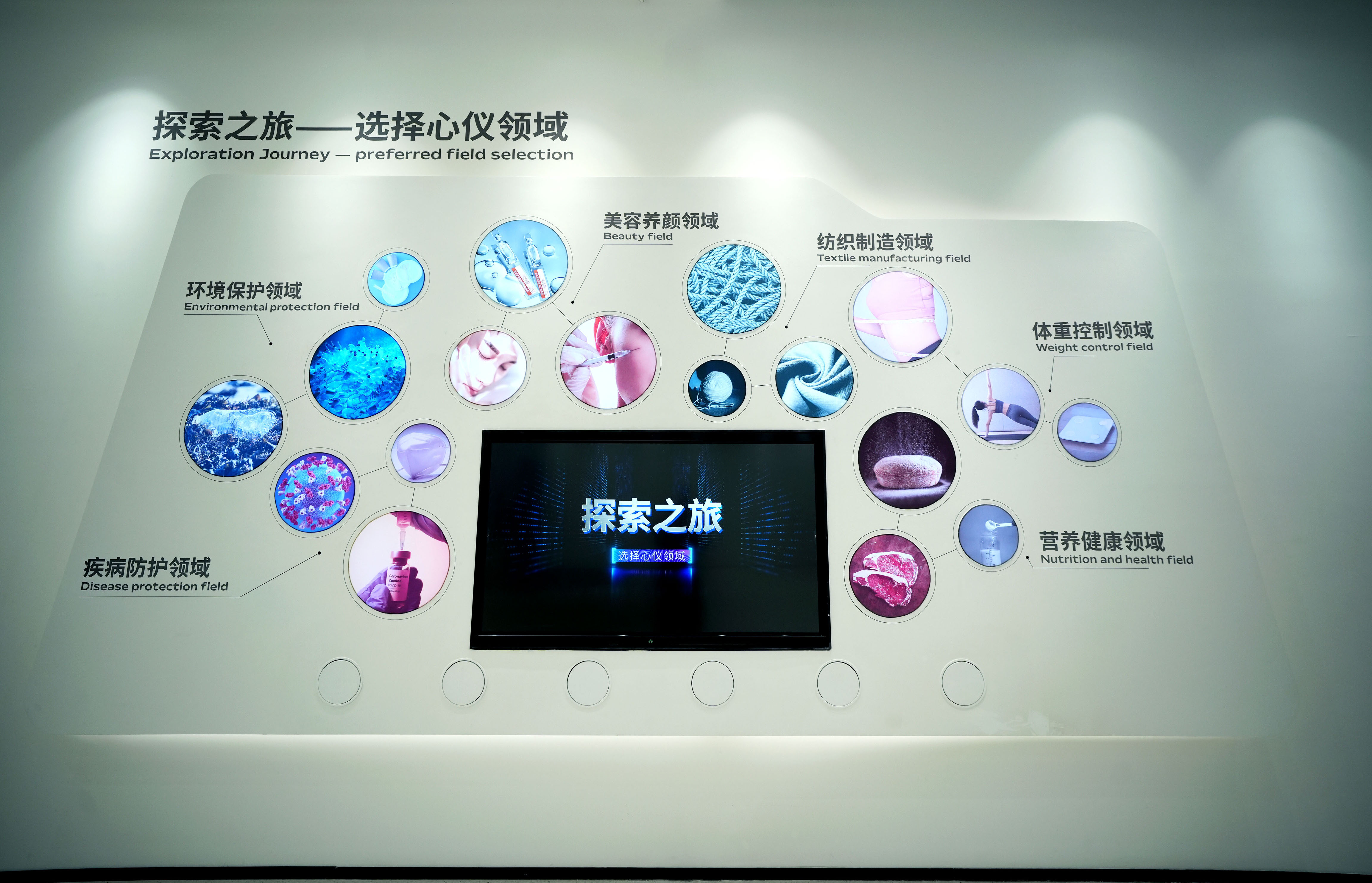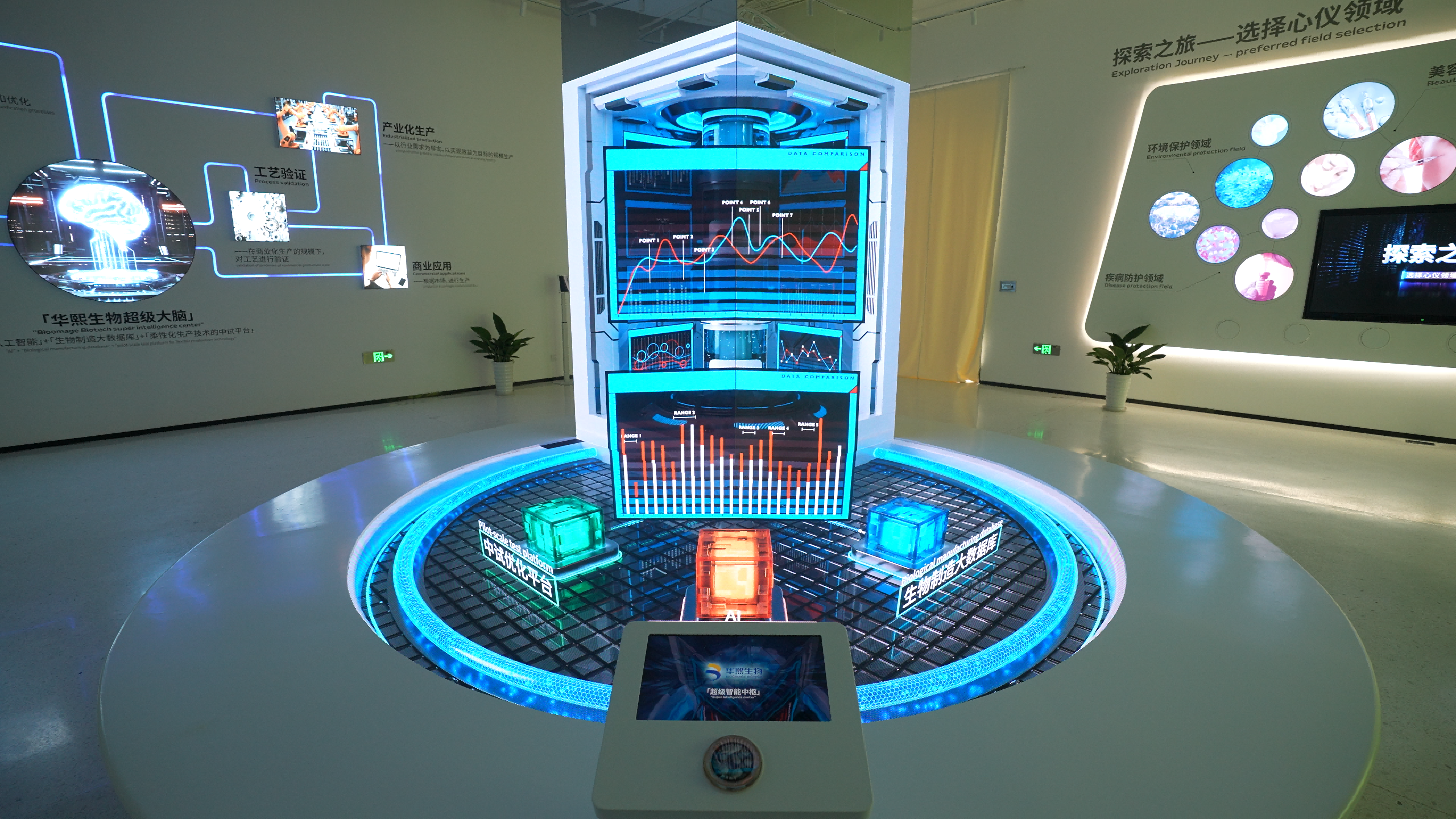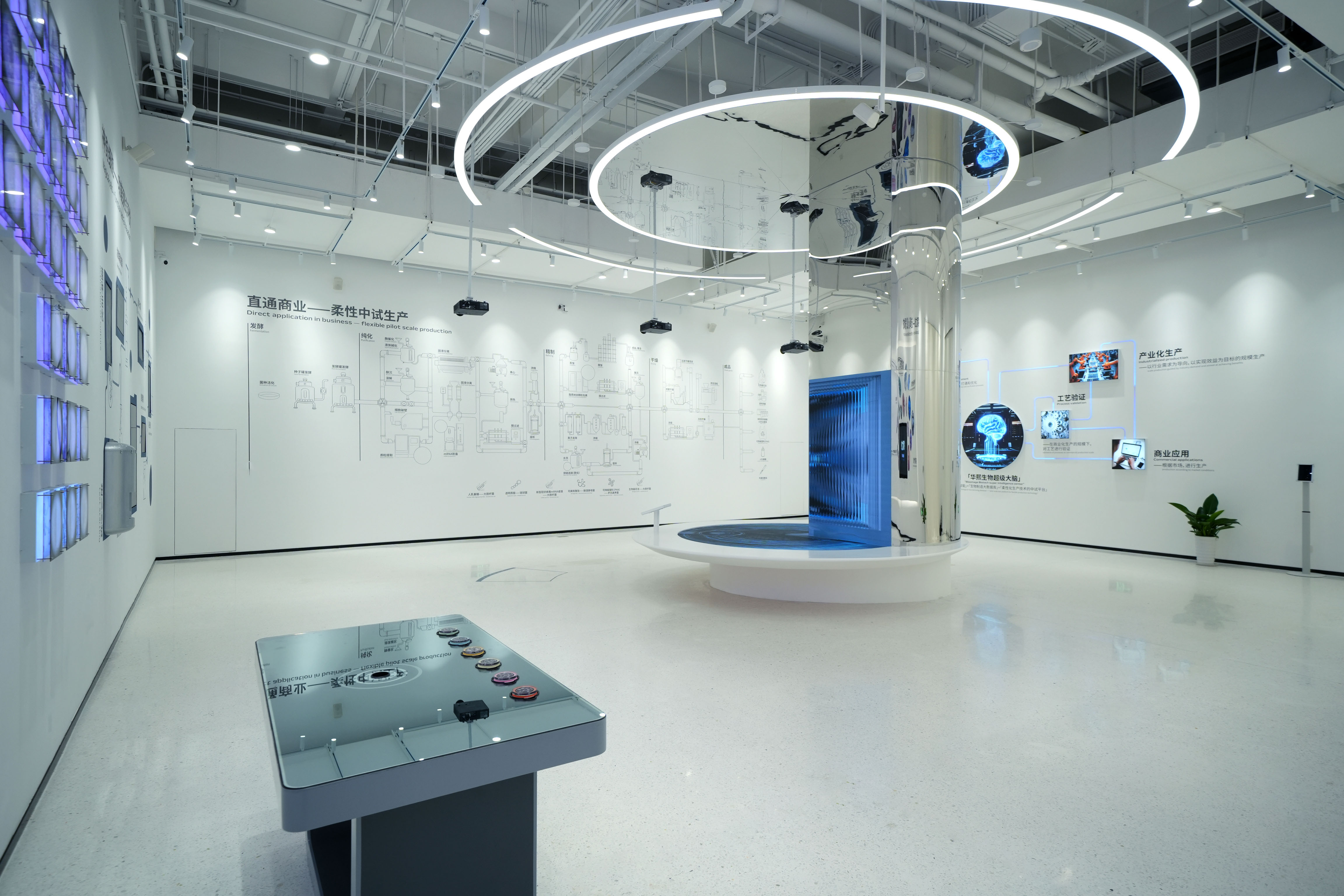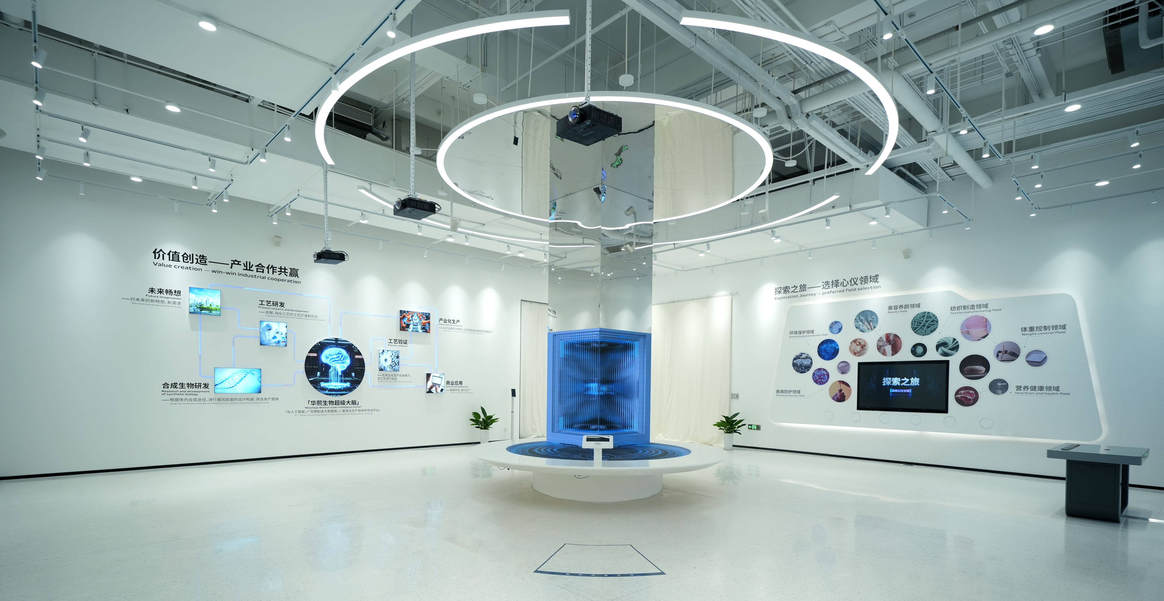 空间意境:空间以白色为主调,营造出简洁、高雅的科技氛围。7 米高挑空裸顶,赋予空间开阔感与通透感,与 5 米高的沉浸暗空间相互映衬,形成强烈的明暗对比,增强空间层次感与视觉冲击力。通顶数字灯箱打破常规展示界限,以动态光影呈现生物科技信息。试剂瓶状展台独具创意,将展示道具与生物元素巧妙融合。DNA 圆环科幻空间塑造出充满未来感的生物科技情境,智能中枢控制台展现科技智能操控魅力。霍格沃斯中试工艺互动投影墙通过沉浸式投影技术,将复杂工艺以生动形象的方式呈现,菌种构建墙及数字交互道具进一步提升互动体验深度,中沉浸式暗 CAVE 投影暗空间更是凭借其环绕式投影与暗环境营造,让参观者仿佛置身于生物微观世界与宏观科技场景的交融之中,带来前所未有的奇幻体验。