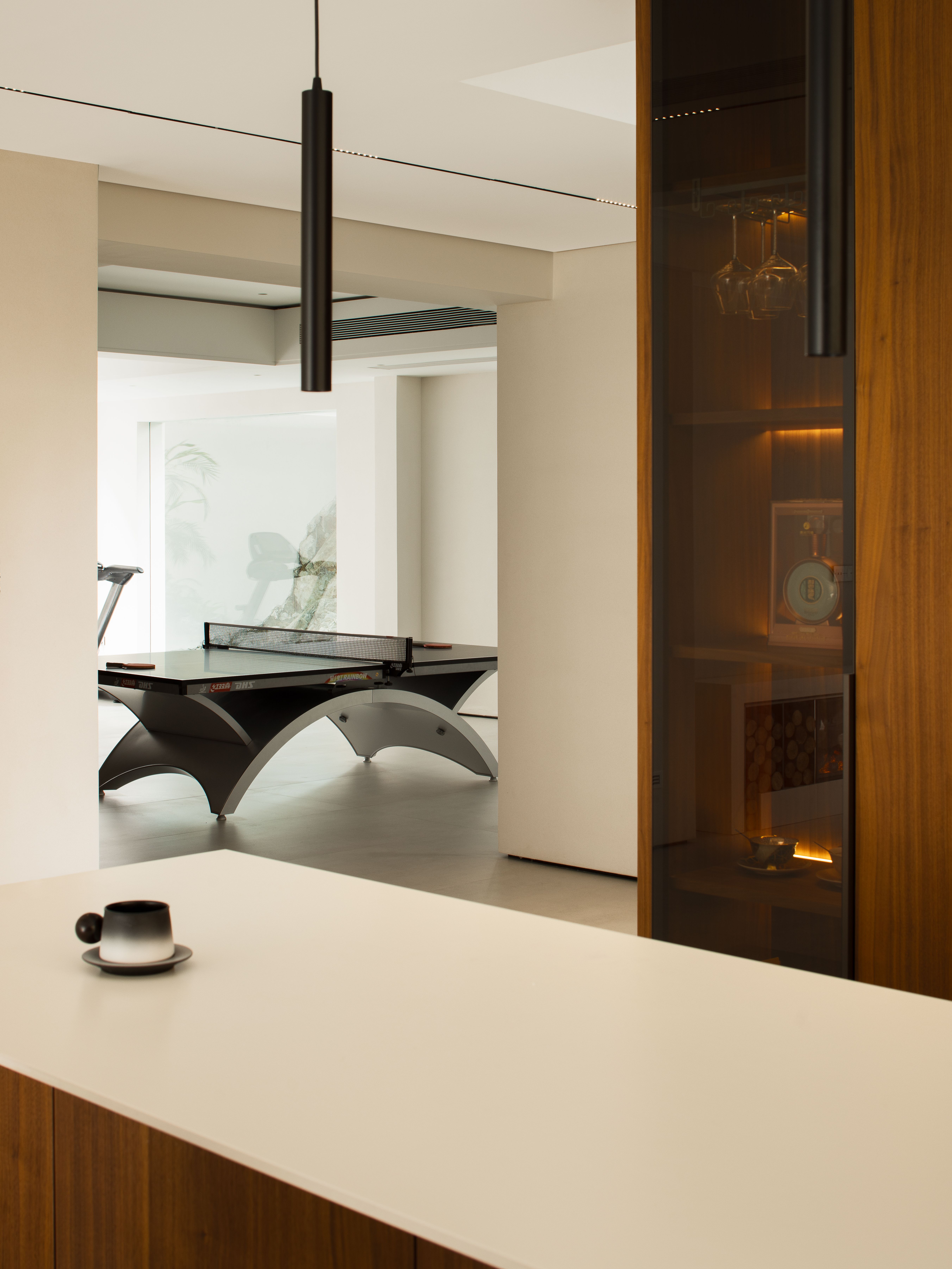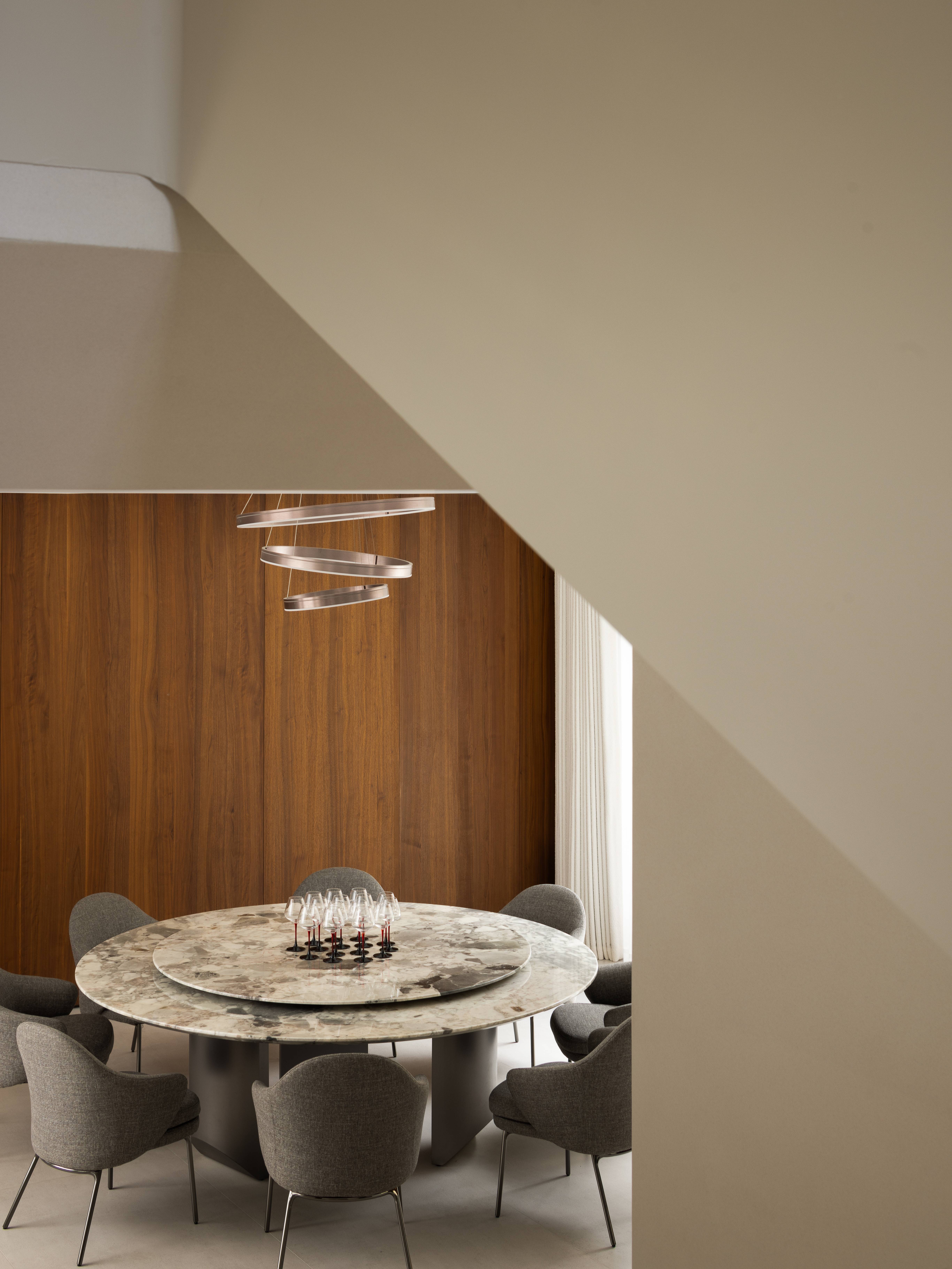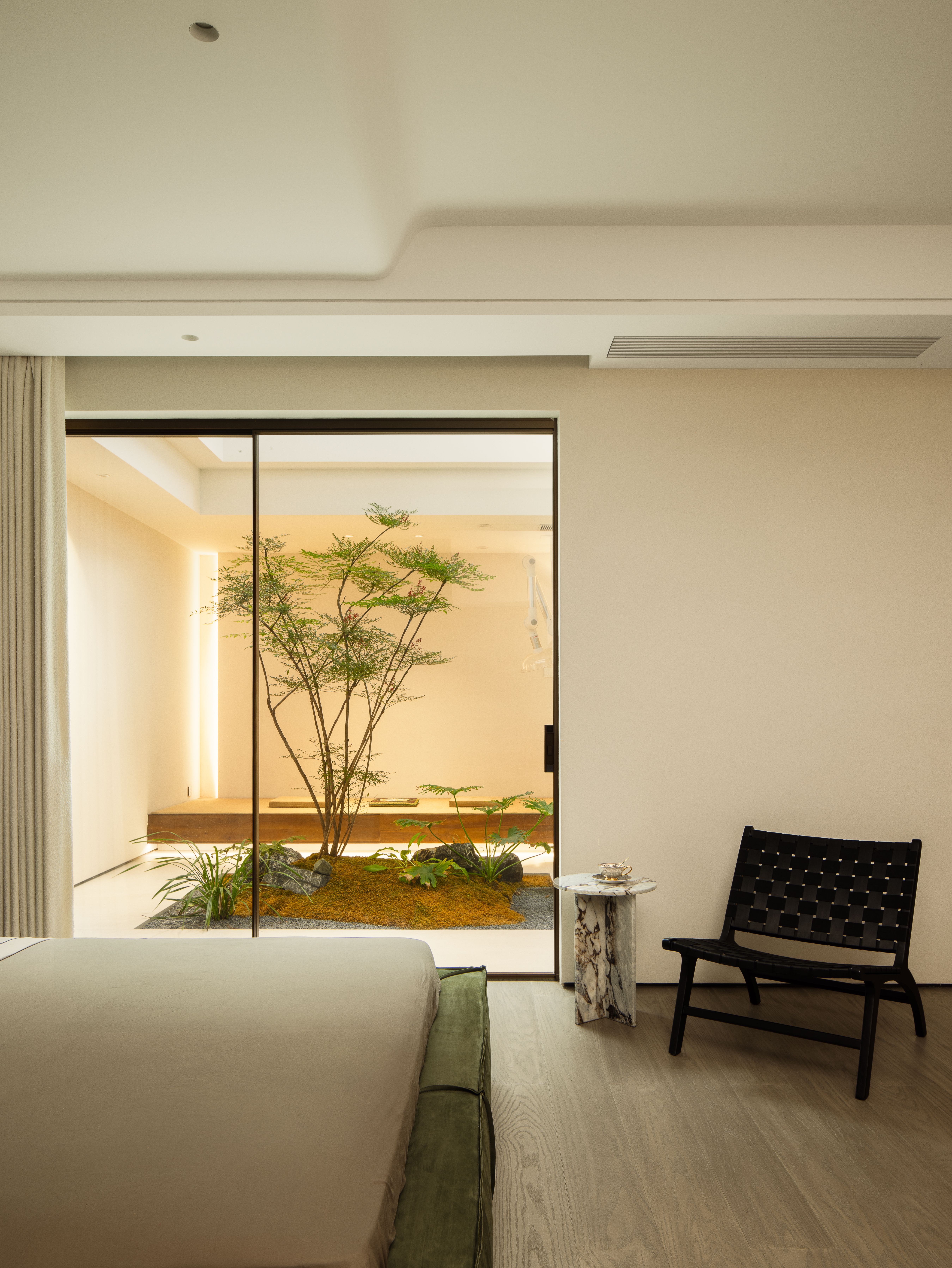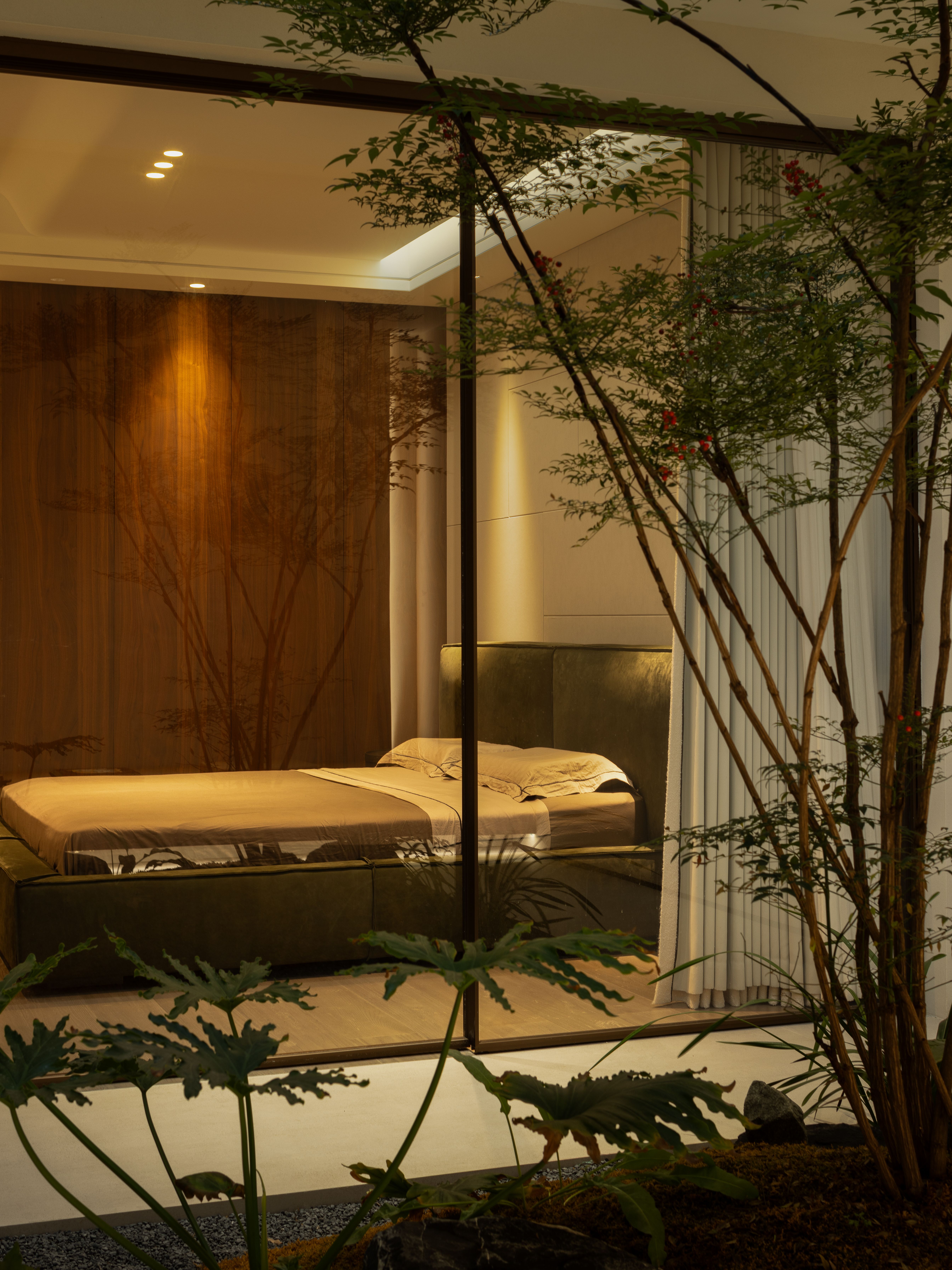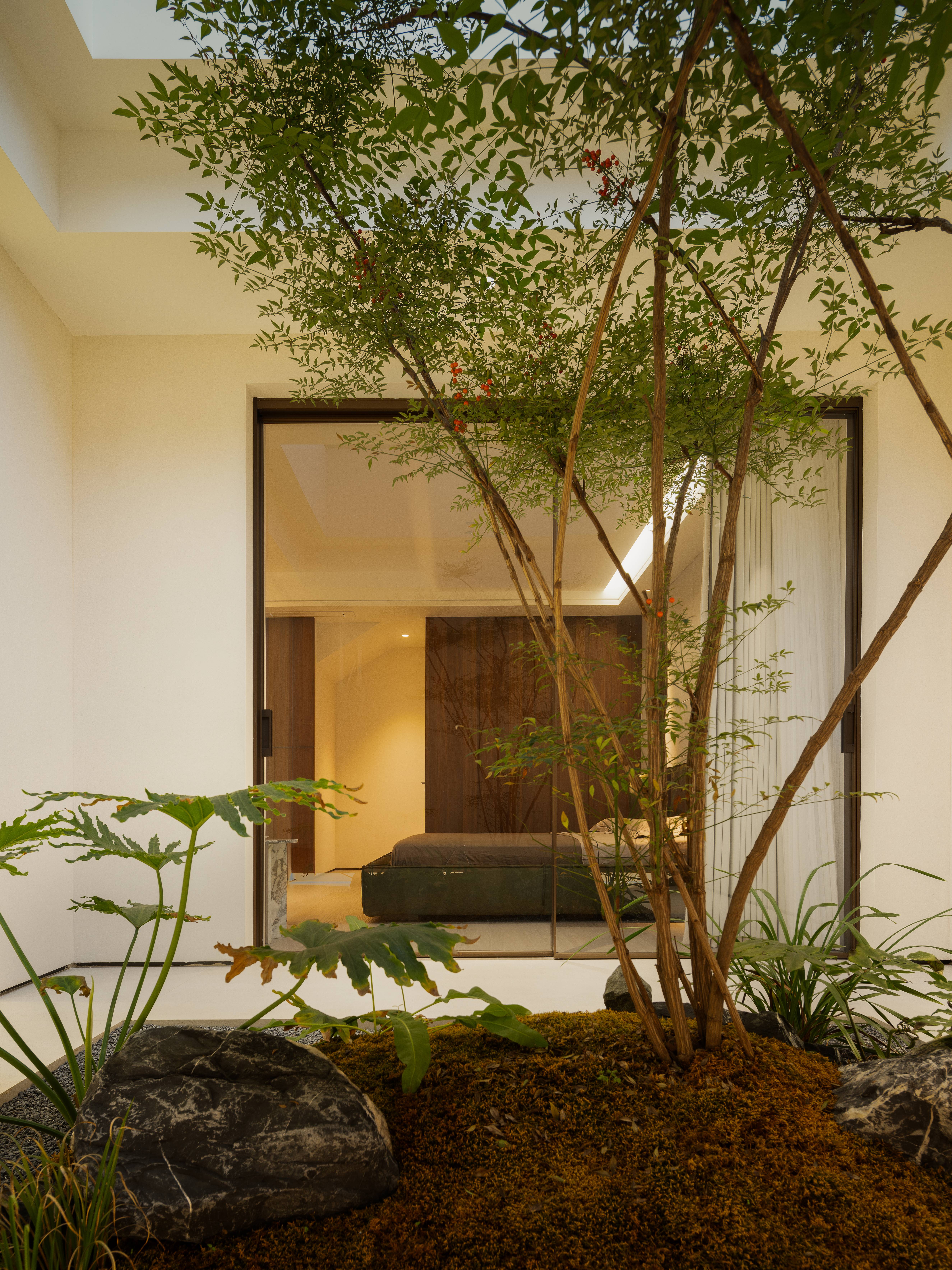 空间布局:01-天成景融,空间在材质、结构和光线的汇聚下形成可以传达情绪的场域。驻足于此处感受最原始的美感,不盲目寻觅如何保存最真实时刻,旨在融合一切之前做好对自然肌理的保护和留存,这是最恰到自然的入户视角。02今风映意,充分利用空间的整体性与色彩的碰撞感,在不经意间穿透中式记忆,繁而不乱。03山岚与现,活动室不仅作为生活的衍生,更可以含融多种情景对话,用设计巧妙开启自然与空间的连接,轻松自在的氛围瞬间绽放。不对任何休息时间做固定预设,让一切自然而然的成就。04绿意禅心,新栽竹子满庭阴,闲绕栏干月色沈。越过玄关即从繁华隐入静谧,映射在玻璃上的是松风山林,光影之下是精心布排的当代设计,这是有意设计的一场东方美学与现代文明的碰撞。