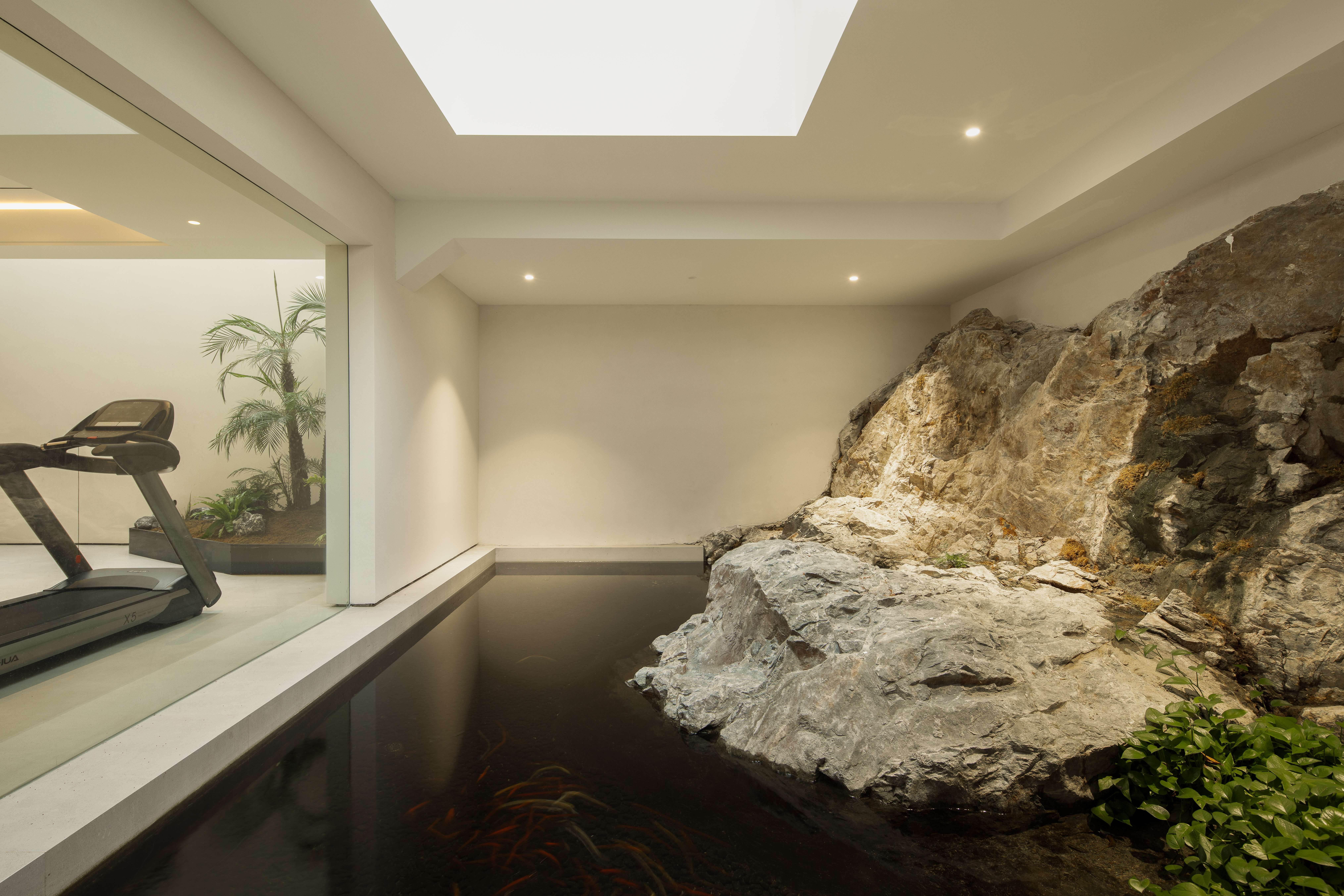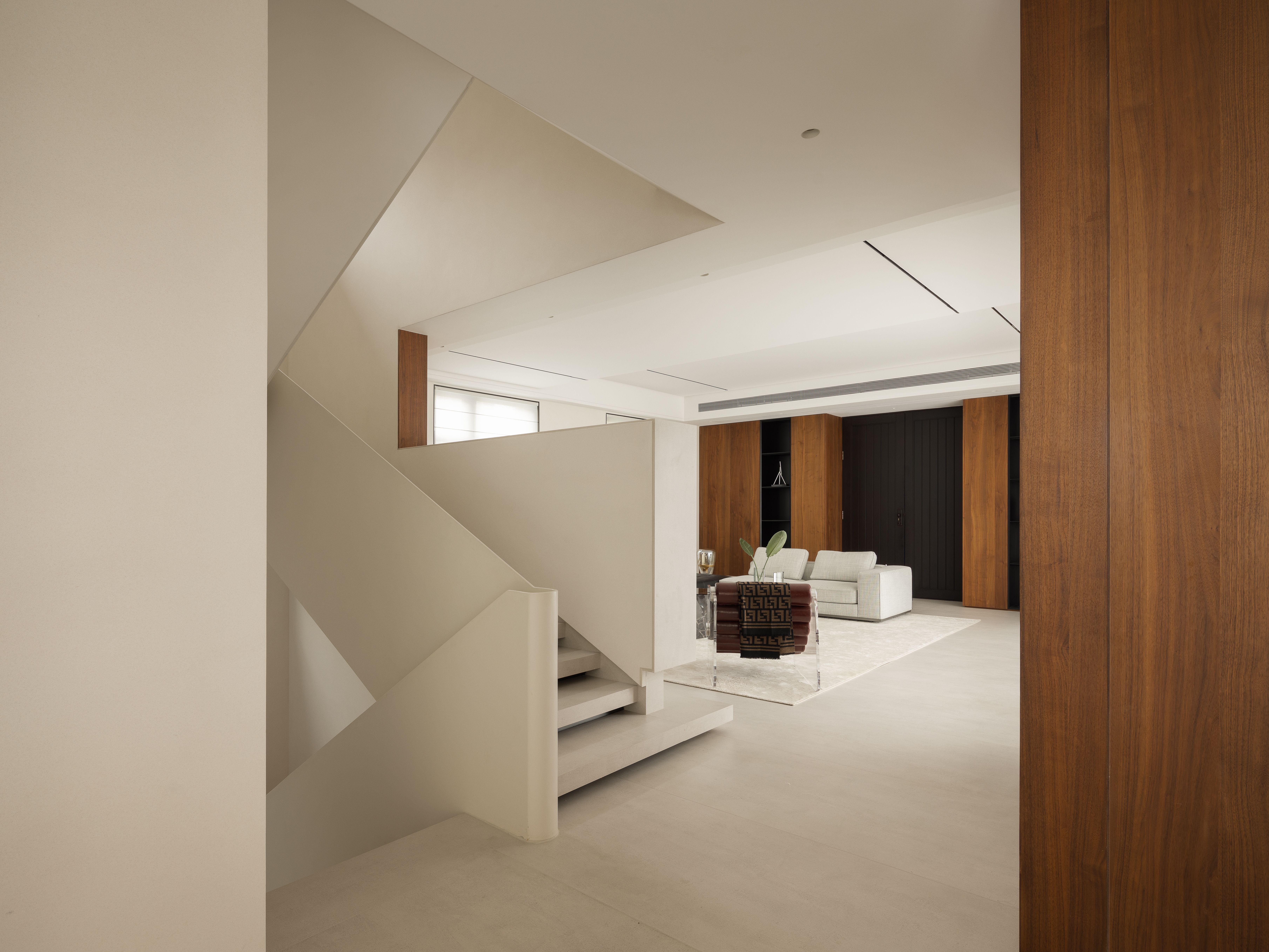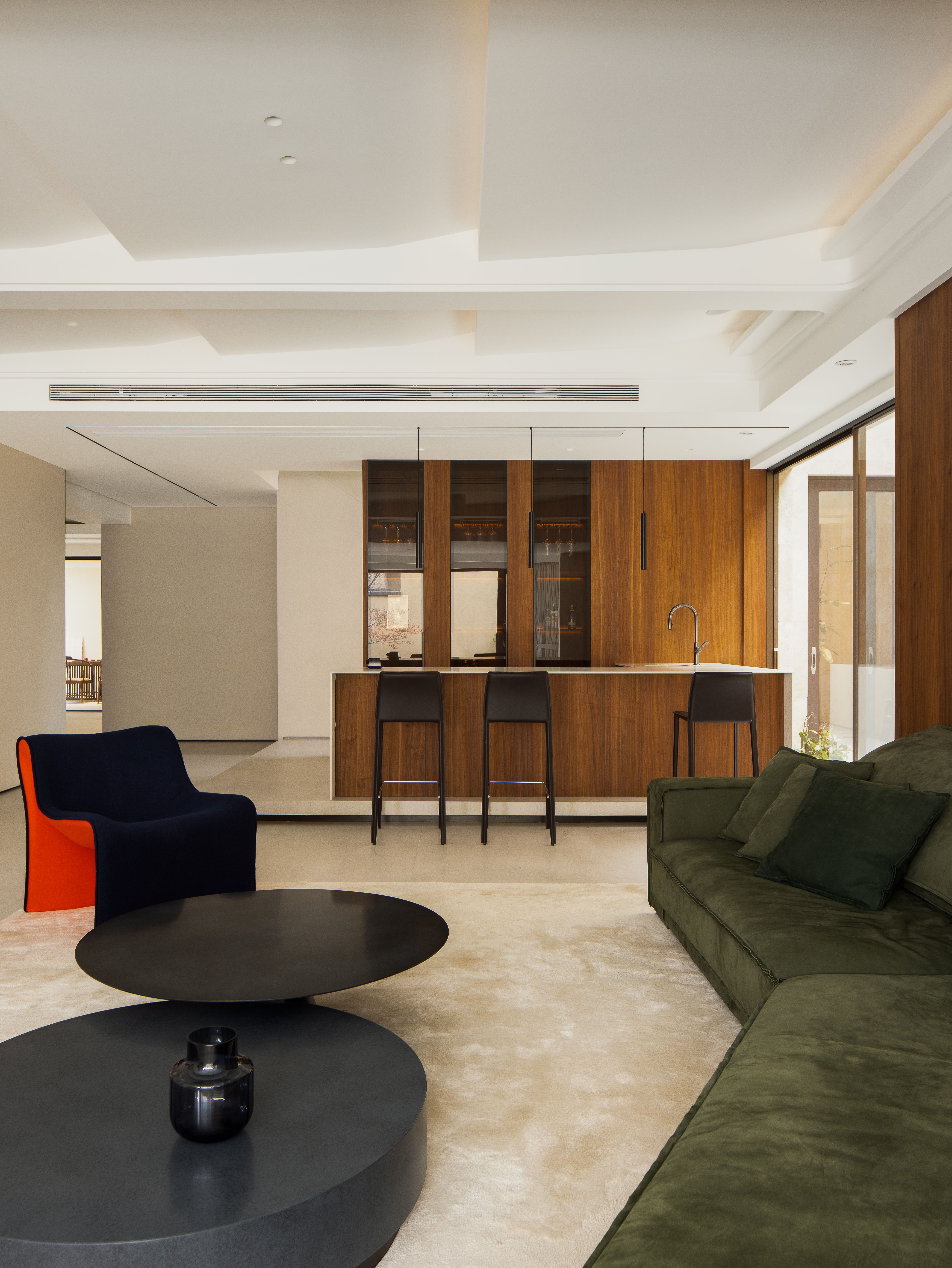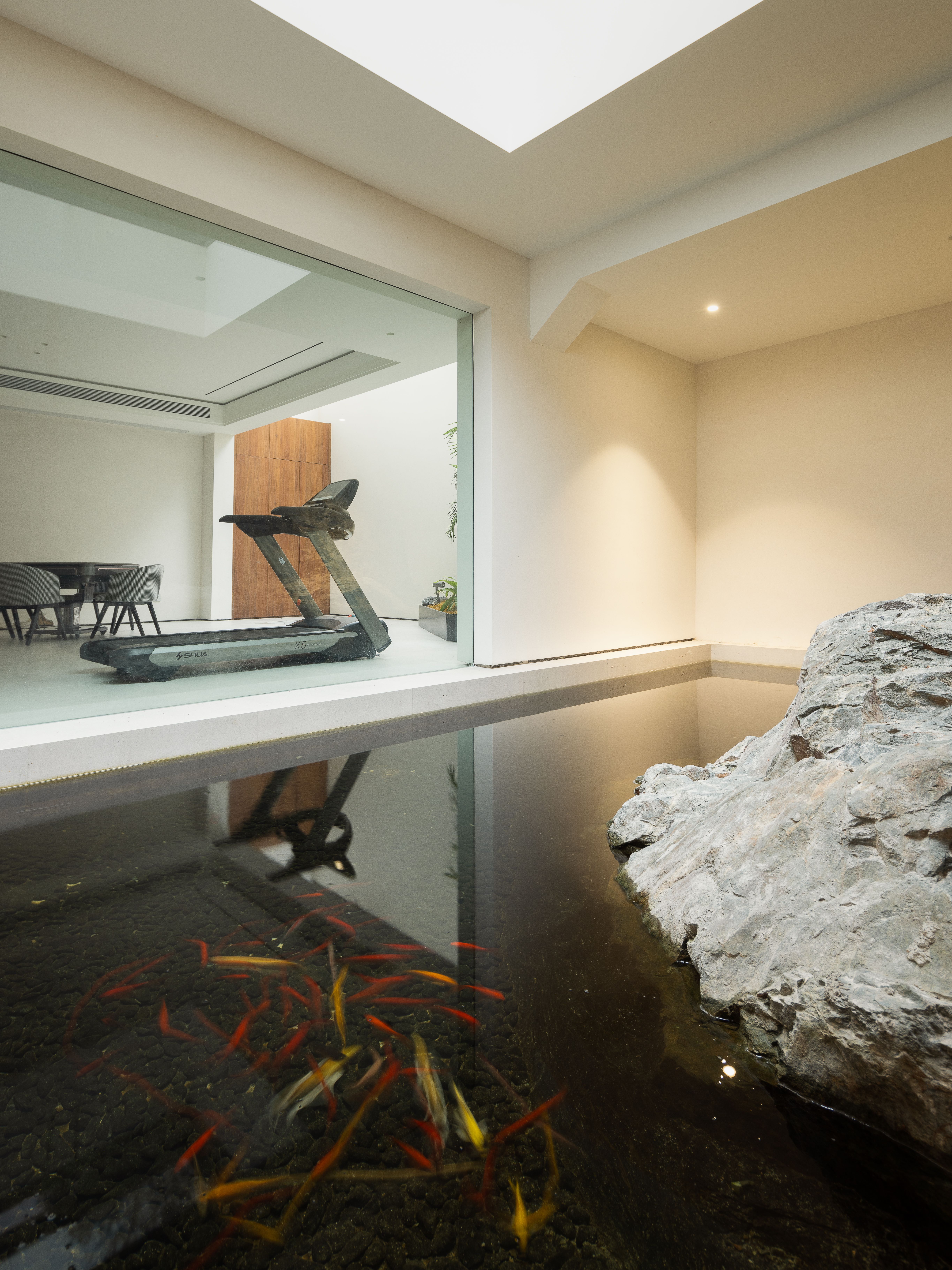 空间布局:01-天成景融,空间在材质、结构和光线的汇聚下形成可以传达情绪的场域。驻足于此处感受最原始的美感,不盲目寻觅如何保存最真实时刻,旨在融合一切之前做好对自然肌理的保护和留存,这是最恰到自然的入户视角。02今风映意,充分利用空间的整体性与色彩的碰撞感,在不经意间穿透中式记忆,繁而不乱。03山岚与现,活动室不仅作为生活的衍生,更可以含融多种情景对话,用设计巧妙开启自然与空间的连接,轻松自在的氛围瞬间绽放。不对任何休息时间做固定预设,让一切自然而然的成就。04绿意禅心,新栽竹子满庭阴,闲绕栏干月色沈。越过玄关即从繁华隐入静谧,映射在玻璃上的是松风山林,光影之下是精心布排的当代设计,这是有意设计的一场东方美学与现代文明的碰撞。
