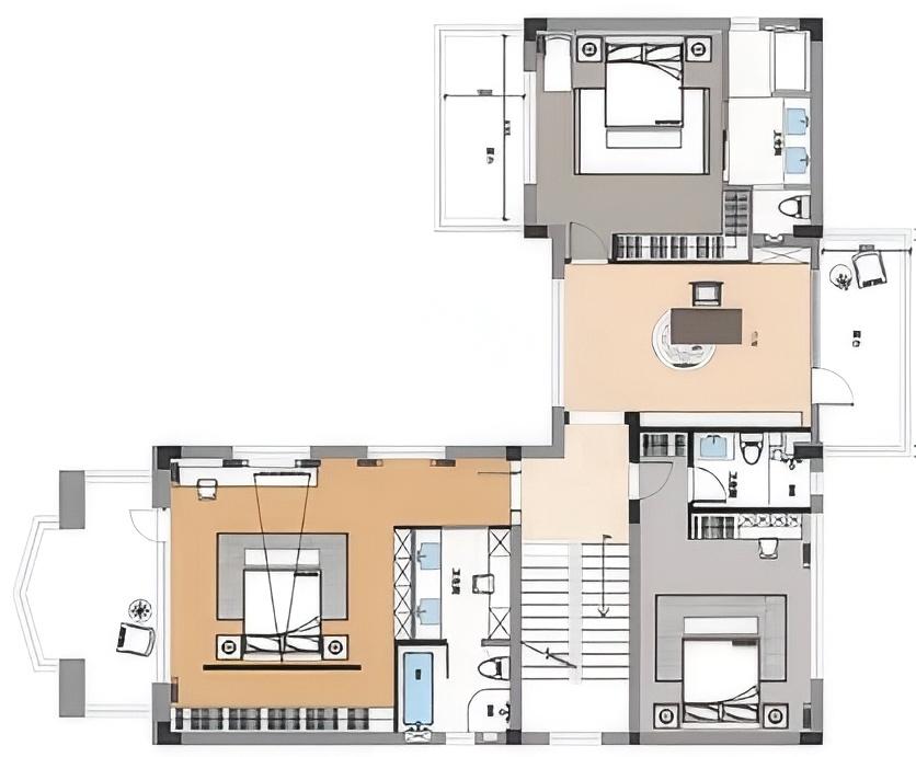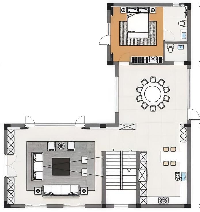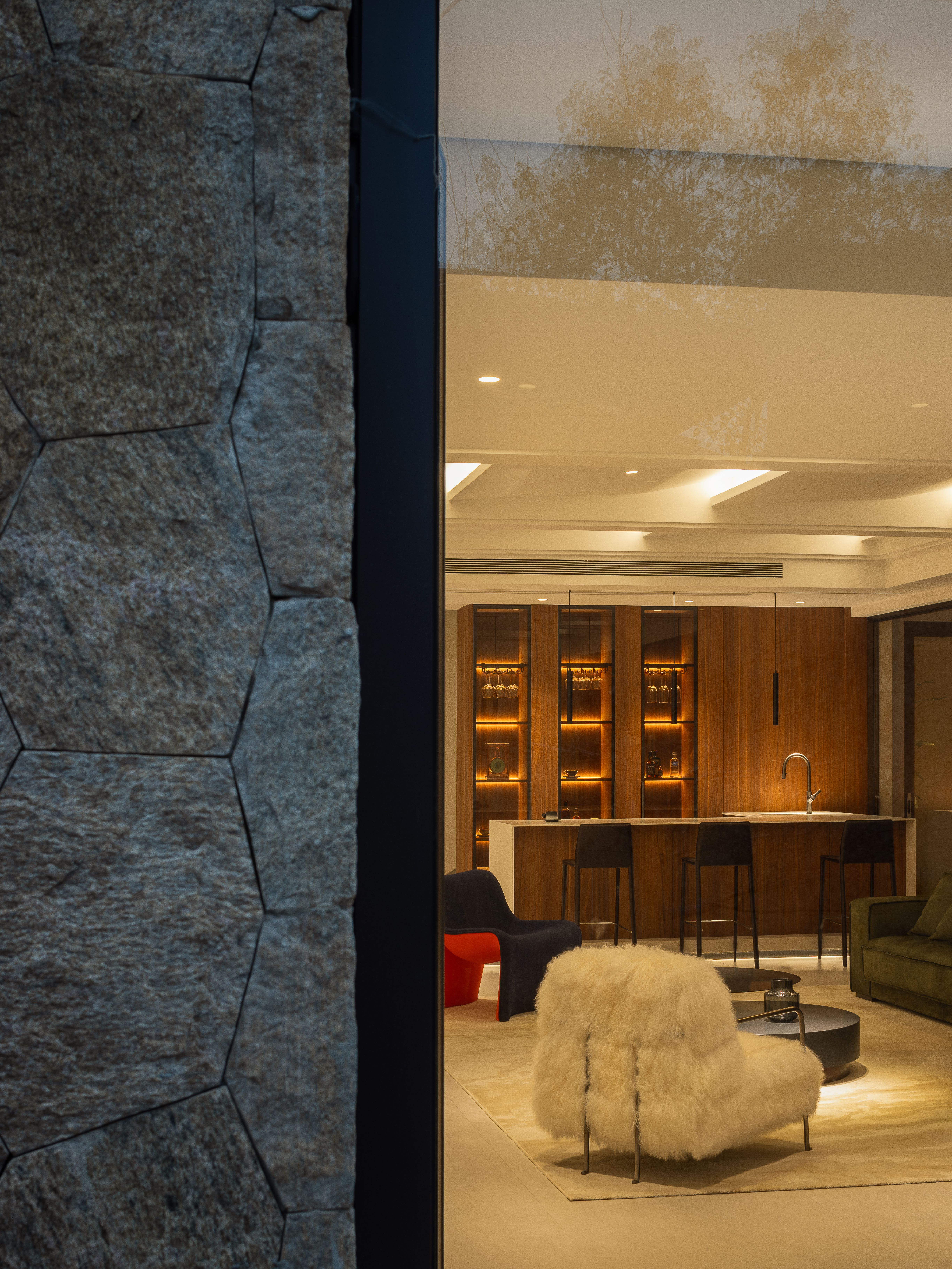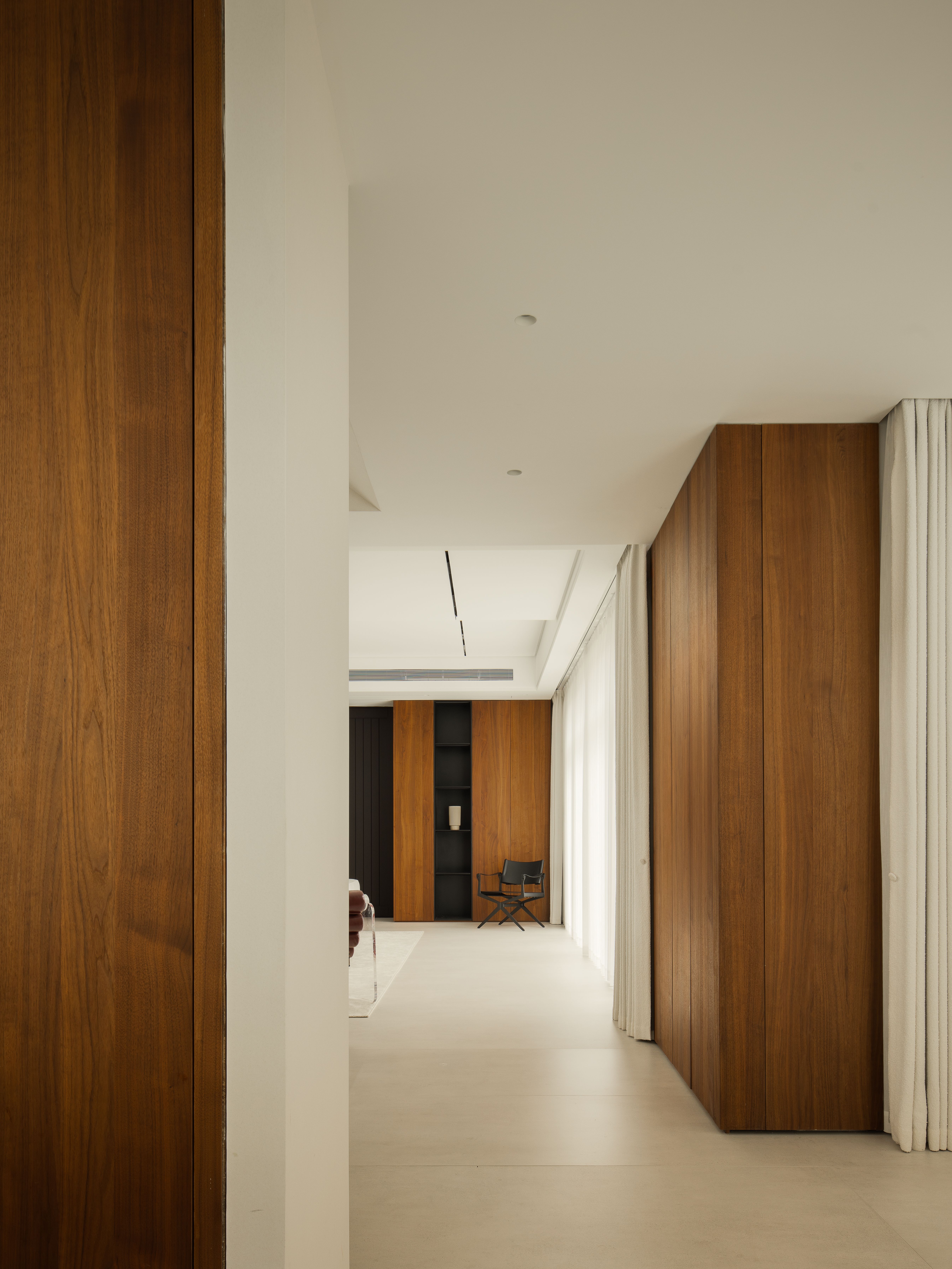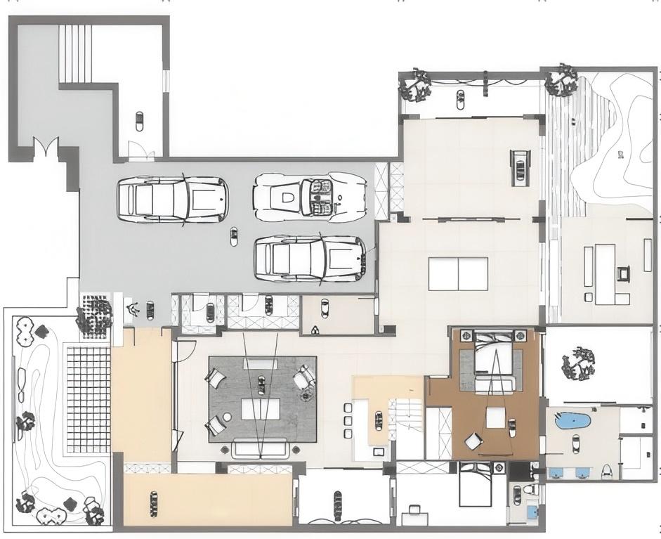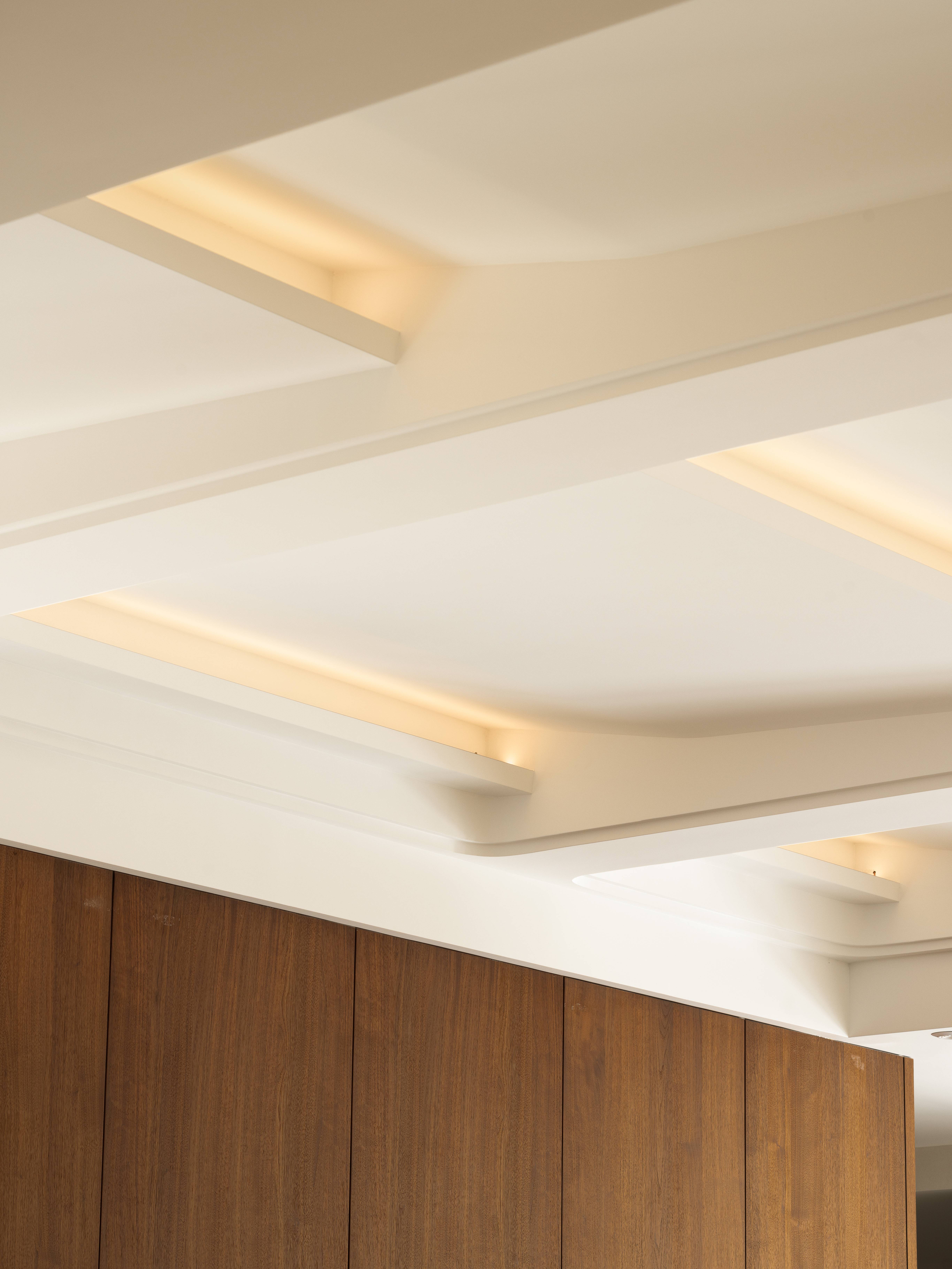 空间布局:01-天成景融,空间在材质、结构和光线的汇聚下形成可以传达情绪的场域。驻足于此处感受最原始的美感,不盲目寻觅如何保存最真实时刻,旨在融合一切之前做好对自然肌理的保护和留存,这是最恰到自然的入户视角。02今风映意,充分利用空间的整体性与色彩的碰撞感,在不经意间穿透中式记忆,繁而不乱。03山岚与现,活动室不仅作为生活的衍生,更可以含融多种情景对话,用设计巧妙开启自然与空间的连接,轻松自在的氛围瞬间绽放。不对任何休息时间做固定预设,让一切自然而然的成就。04绿意禅心,新栽竹子满庭阴,闲绕栏干月色沈。越过玄关即从繁华隐入静谧,映射在玻璃上的是松风山林,光影之下是精心布排的当代设计,这是有意设计的一场东方美学与现代文明的碰撞。