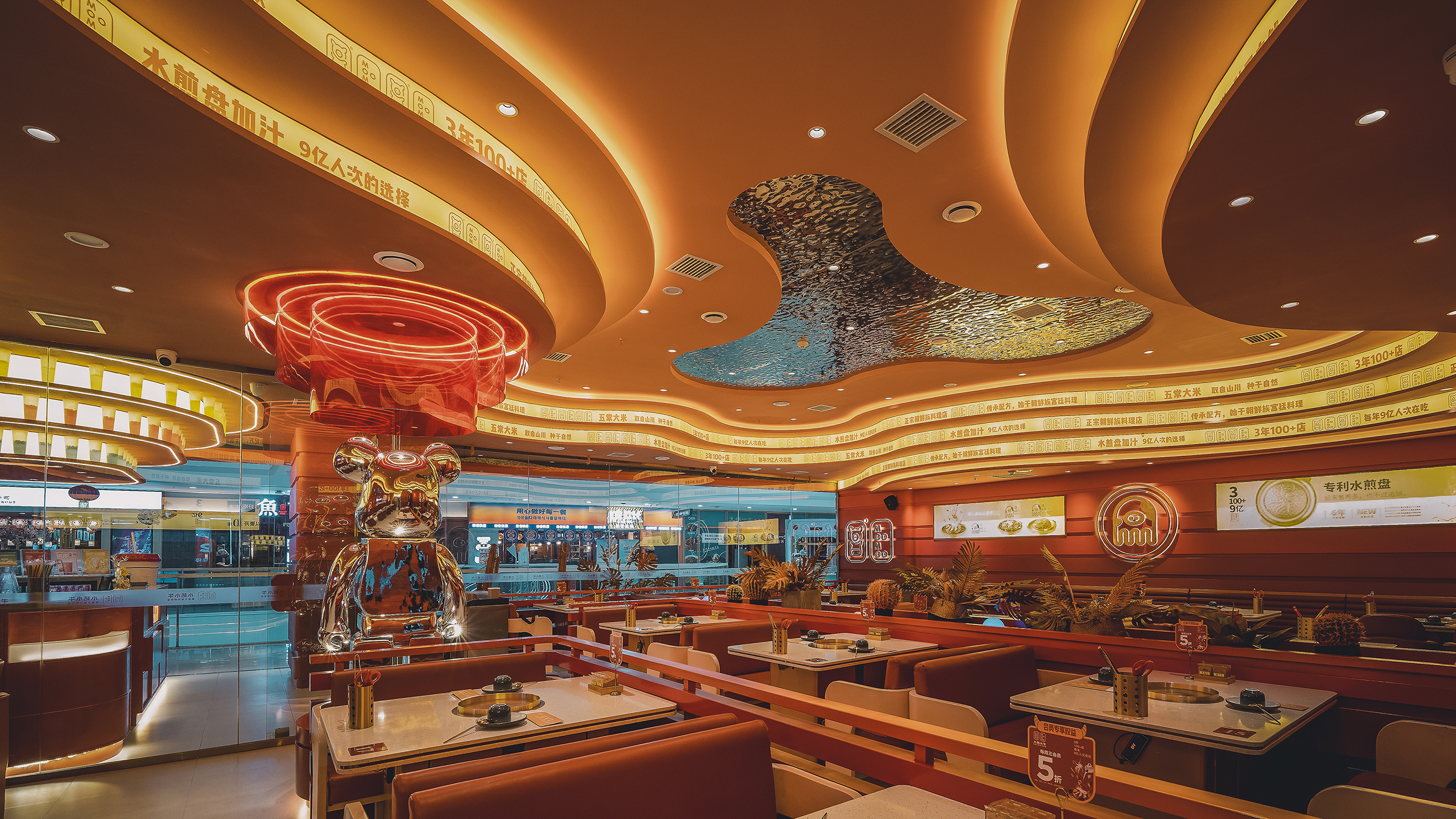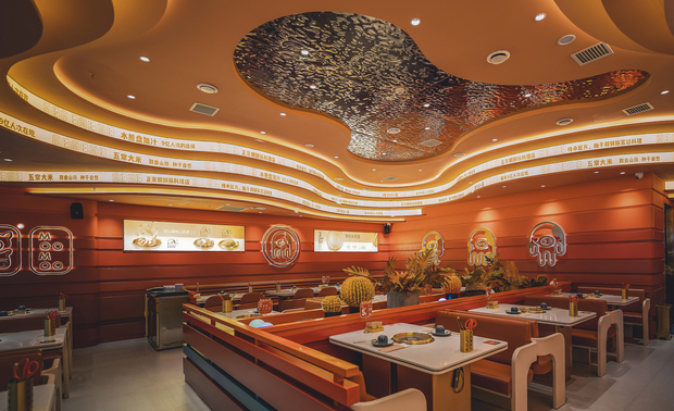 空间意境:整个空间无论是墙面和天花都运用了线条的表现手法,相互融合,天花大型流线型设计,使方形空间更加柔和视觉上打破了方形就餐环境的单一性。