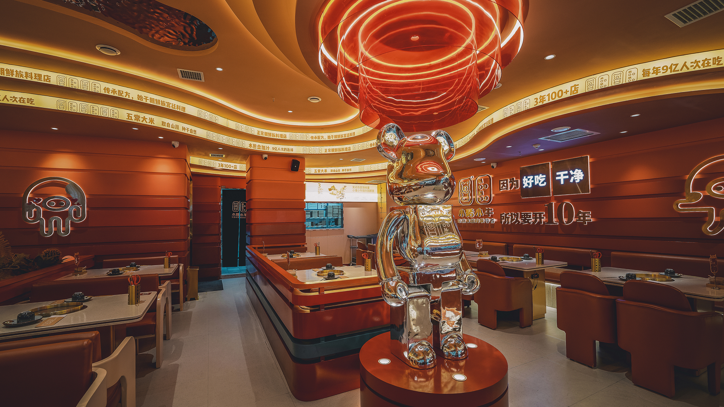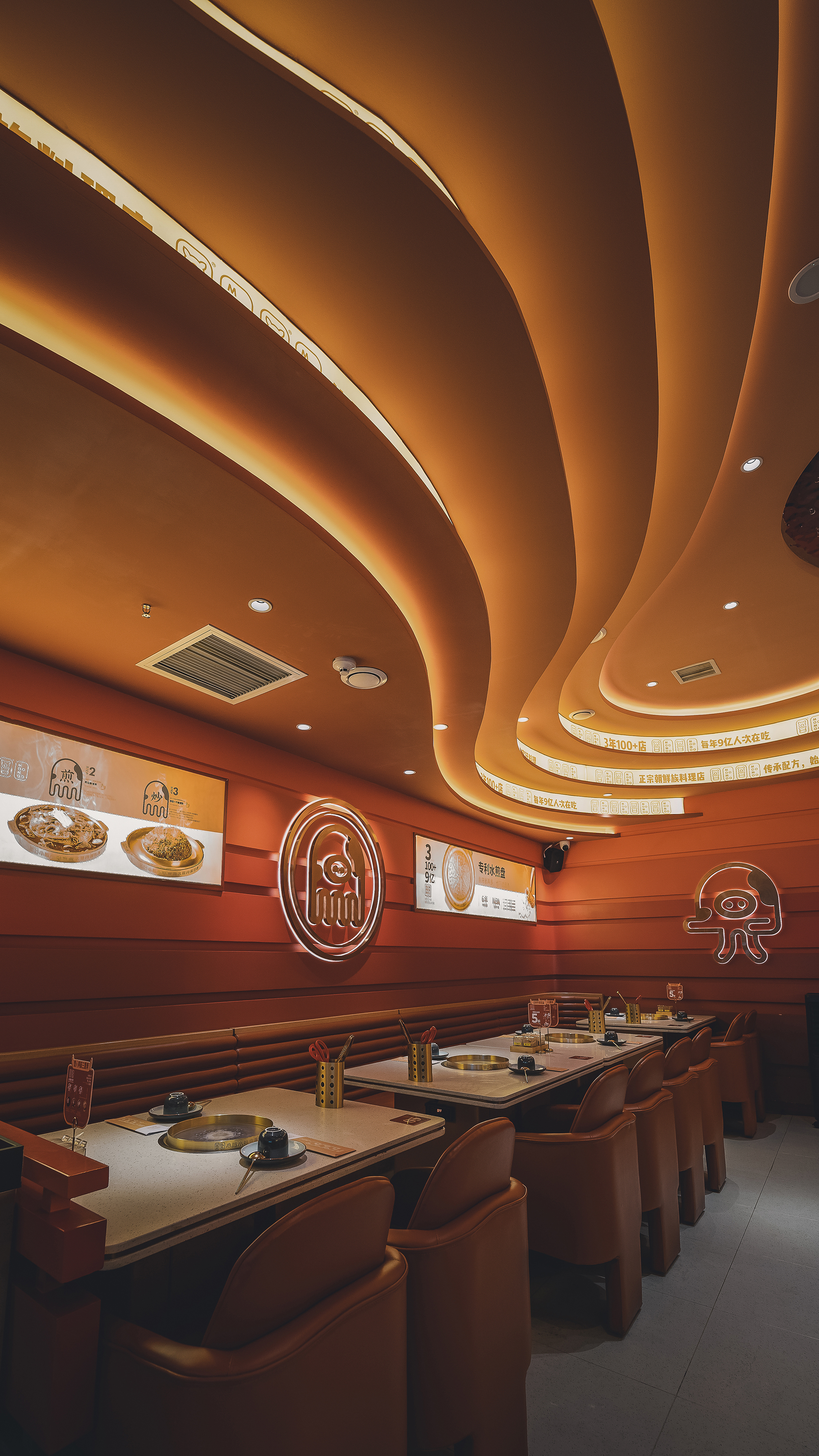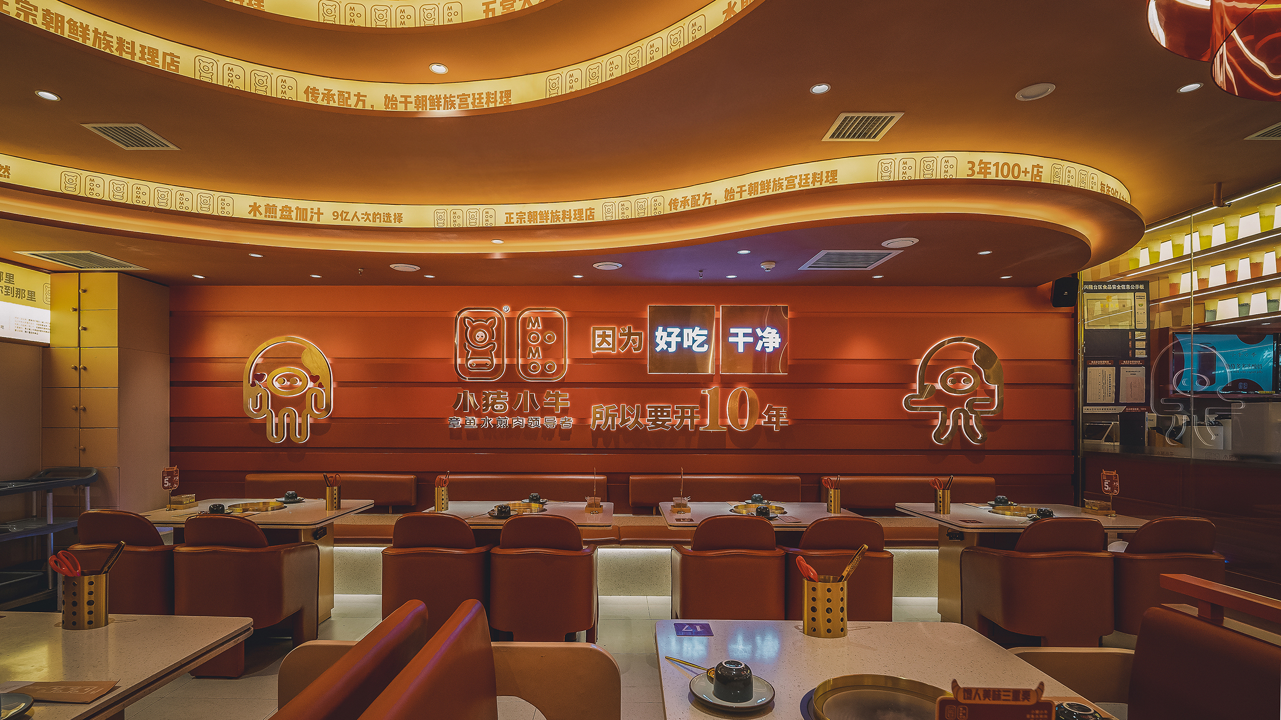 项目定位:小猪小牛作为全国连锁品牌,正如它的Slogan所说的"章鱼水煎肉的领导者"一直是行业的领导者。开级店延续了小猪小牛的品牌,以主题色渐变系列为主色调,融合了年轻感流线型的设计,让品牌与时俱进。
