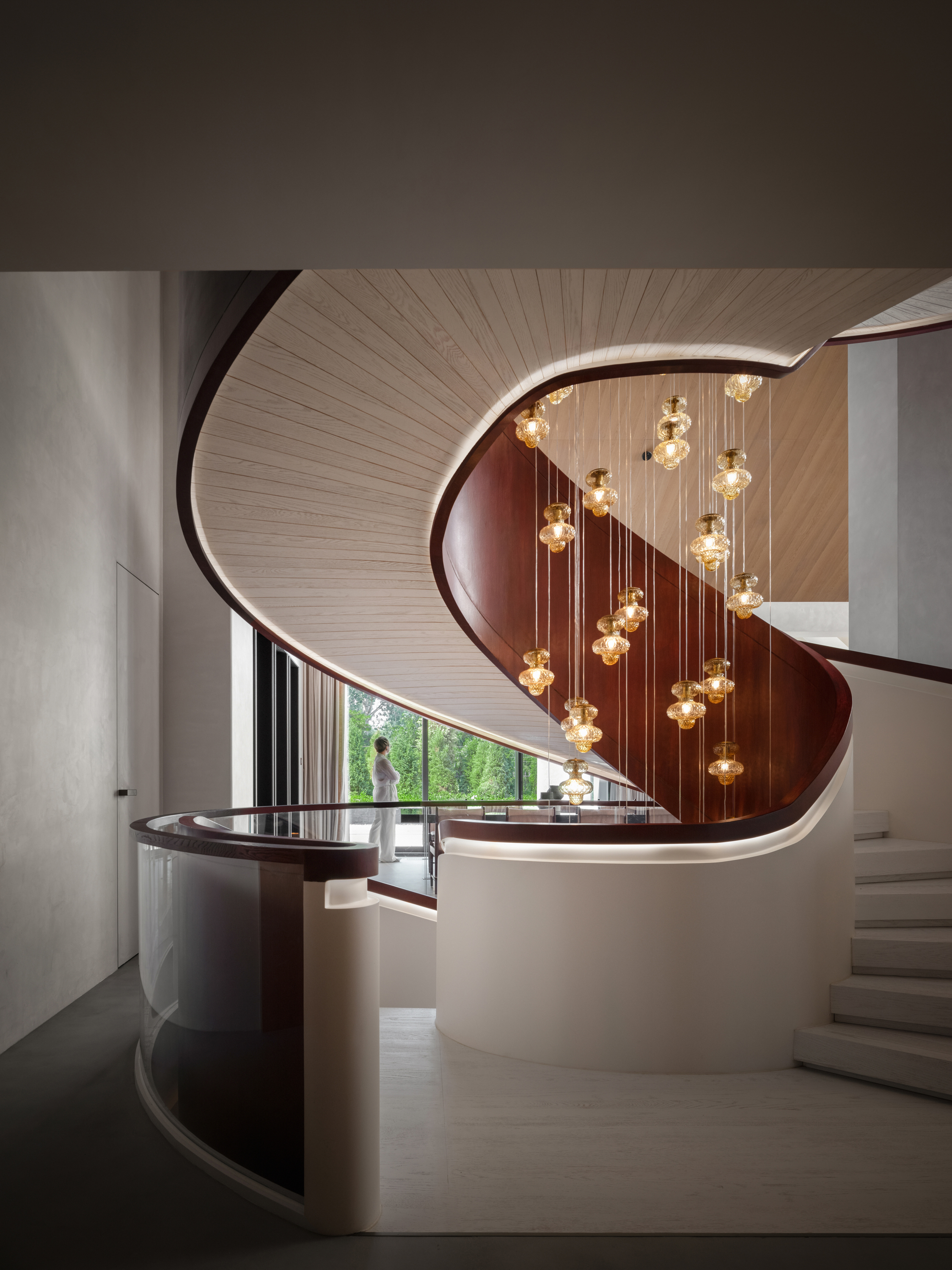 楼梯设计灵感来自“建筑界女魔头”扎哈·哈迪德对曲线与弧线的极致造诣,曲面解构主义淋漓尽致的运用,让空间有大开大合的气势,灵动至极具穿透力。 -