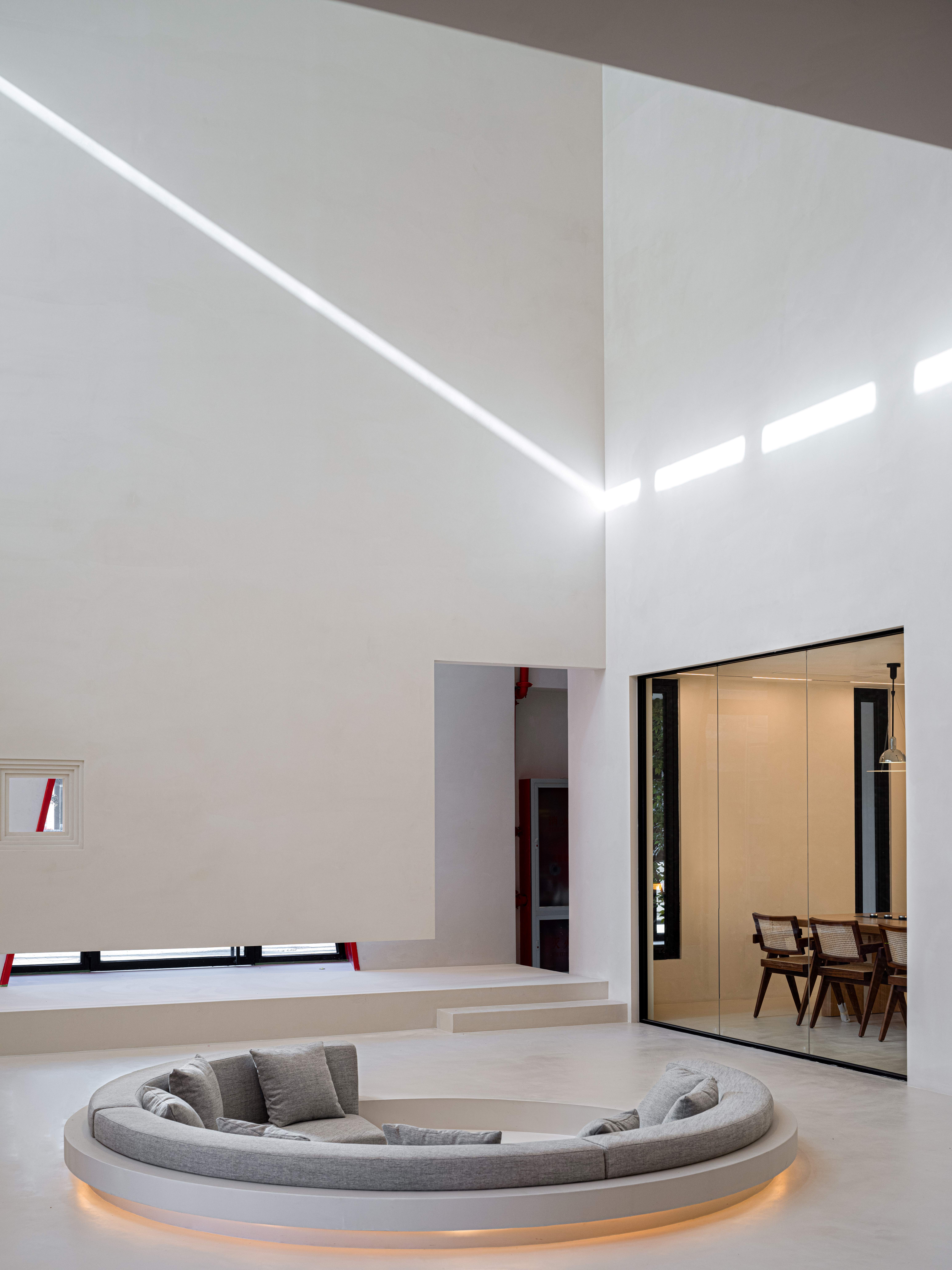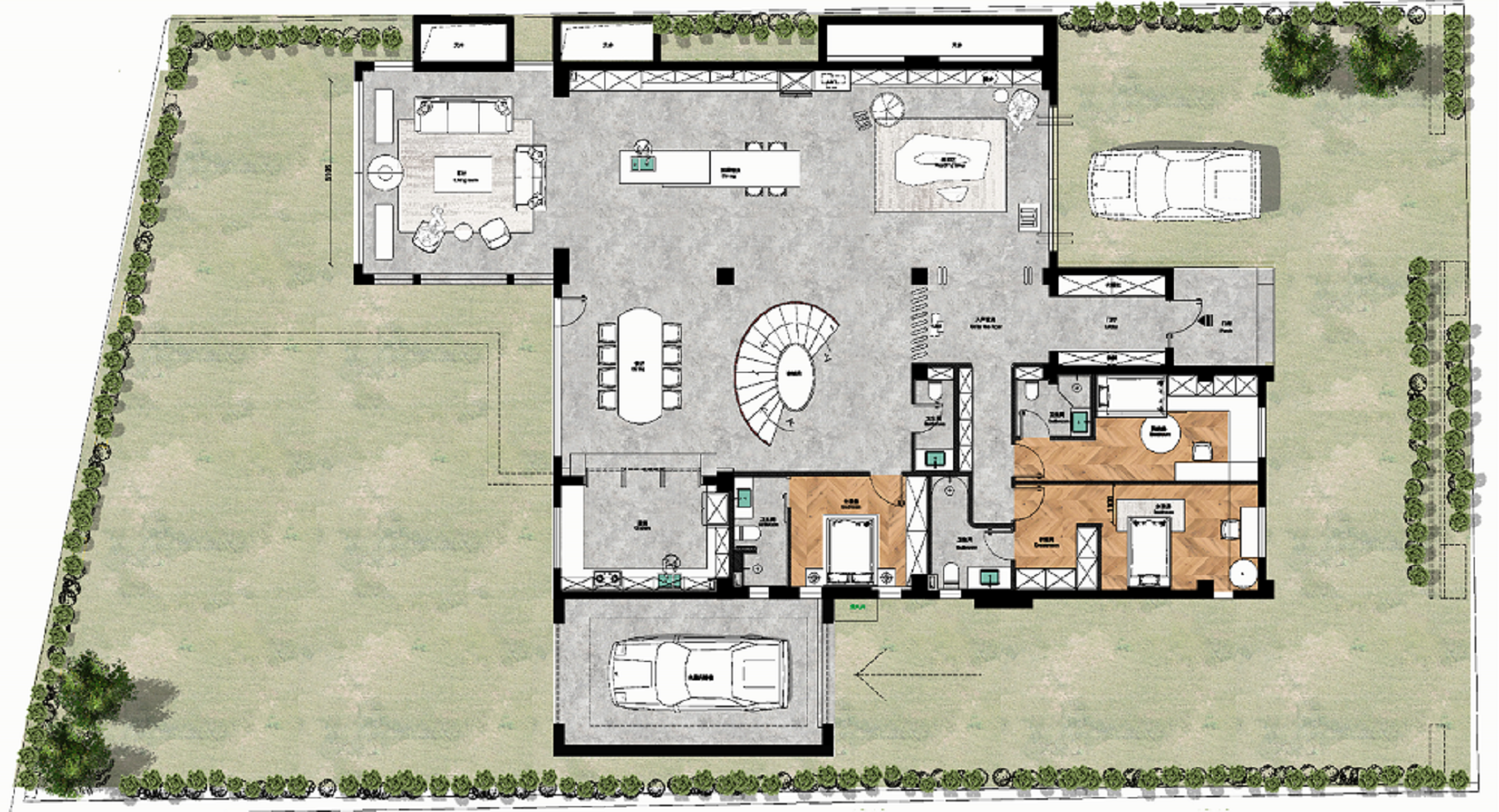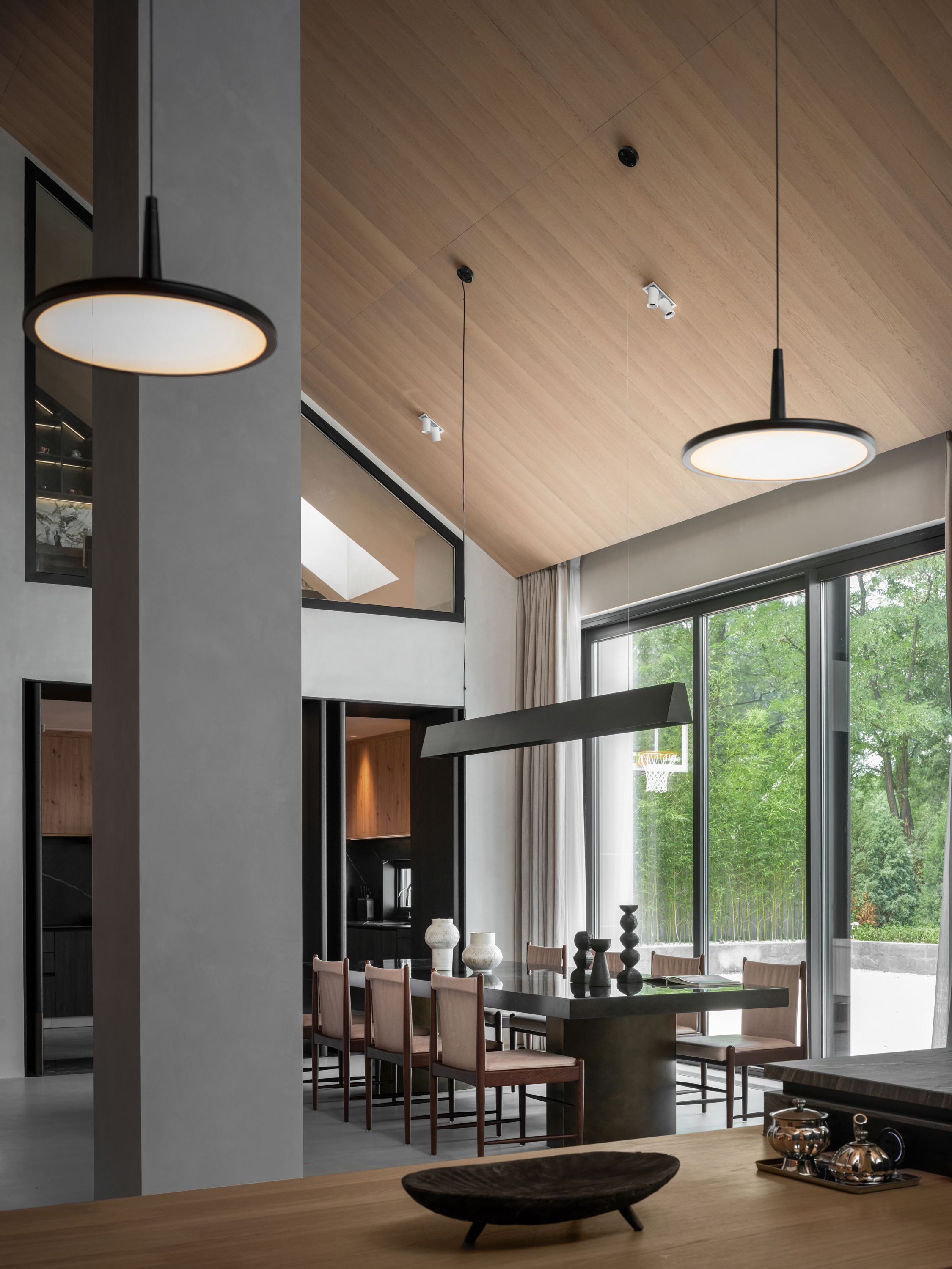 空间布局:客厅引入户外的开放氛围,贯穿整栋建筑的玻璃窗,也最大限度地打通室内外的连接,实现全景式无视觉阻碍的MAX观景体验,以轻盈纯粹的视觉感受,打造室内天然氧吧。