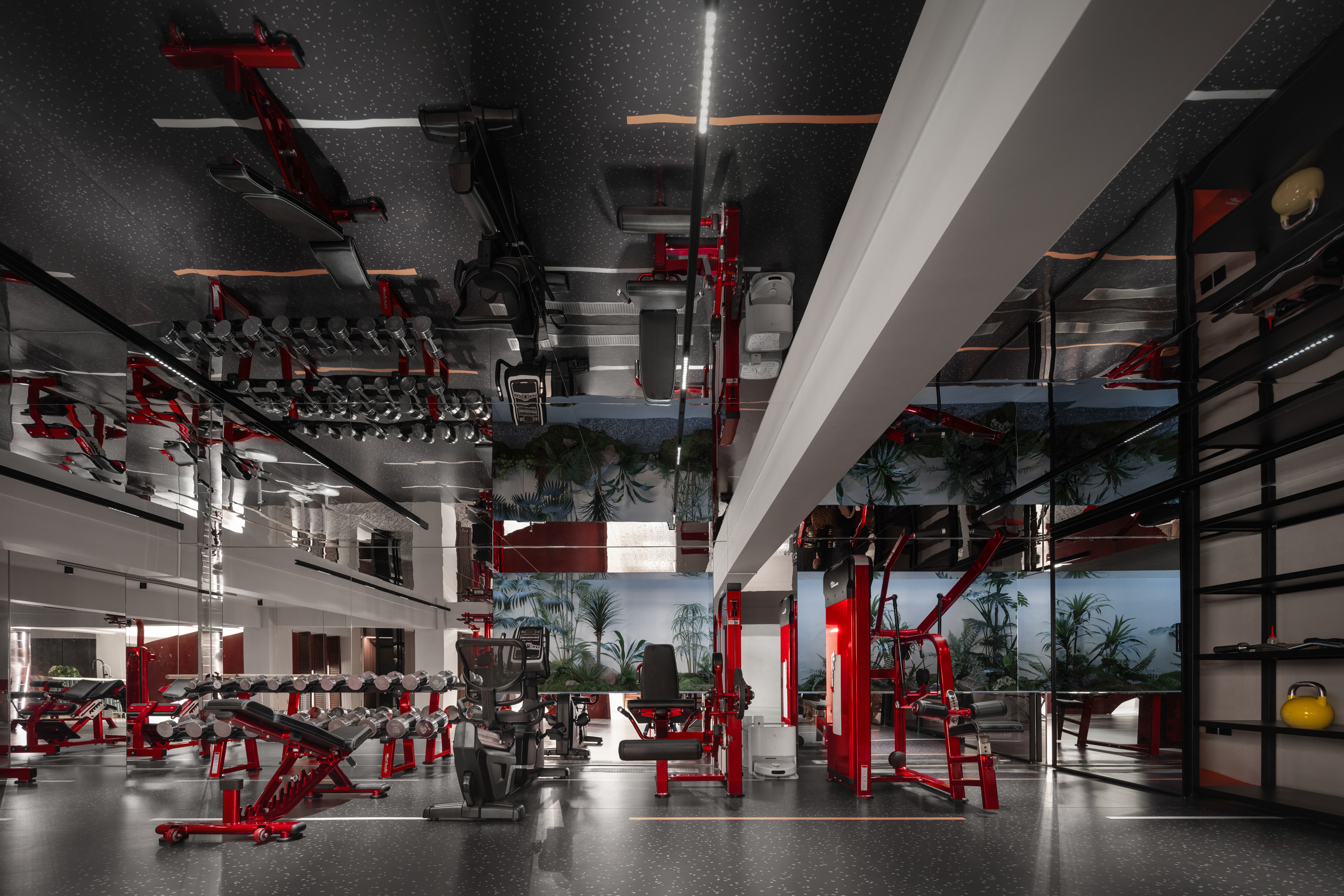 设计选材:地下室原本会沉闷,但以反射的不锈钢镜面材质作为顶部饰面倒映出下方的健身区,外部的流动的世界被反射进金属表皮,让景象每一刻都是崭新的,从而在健身之余带来更好的视觉体验。
