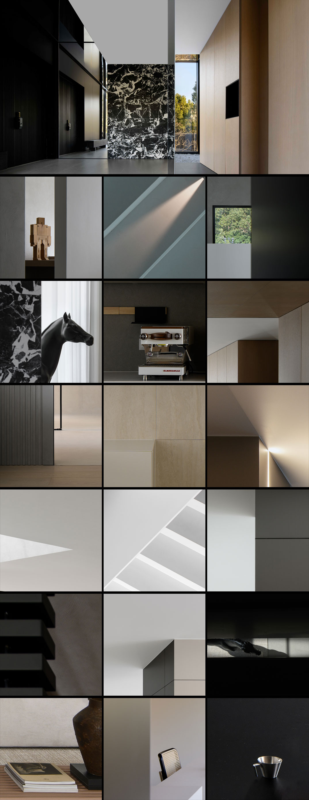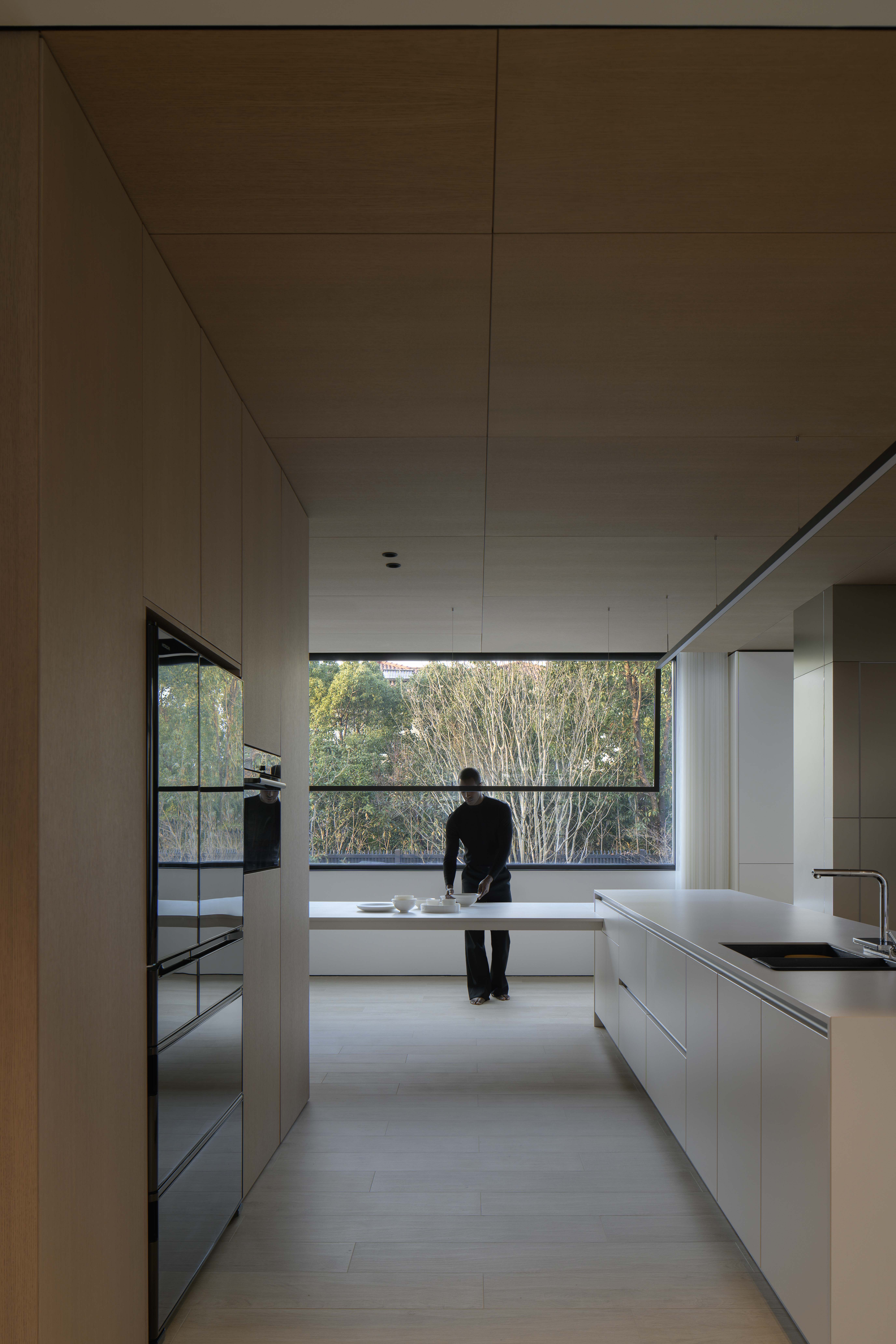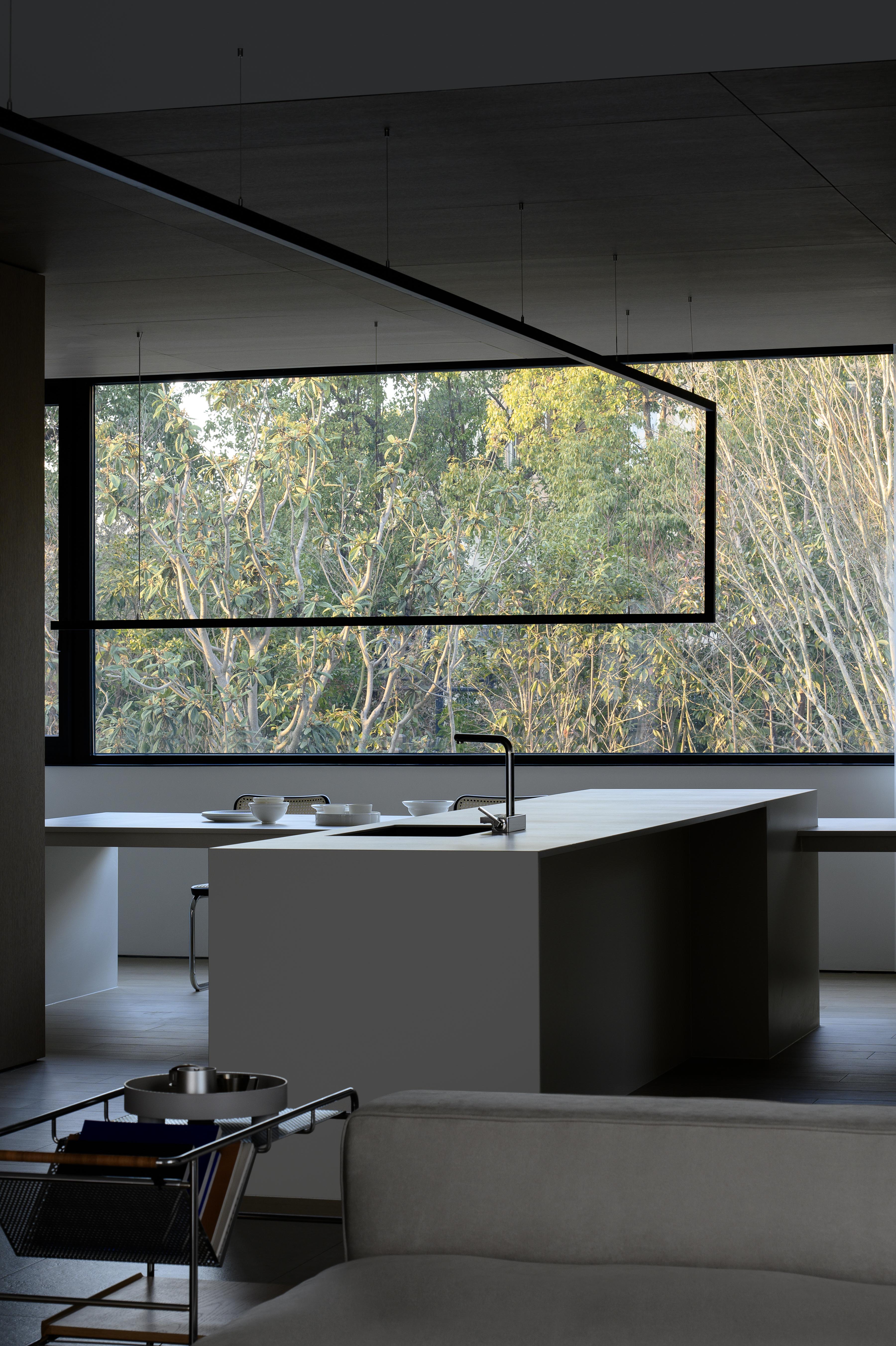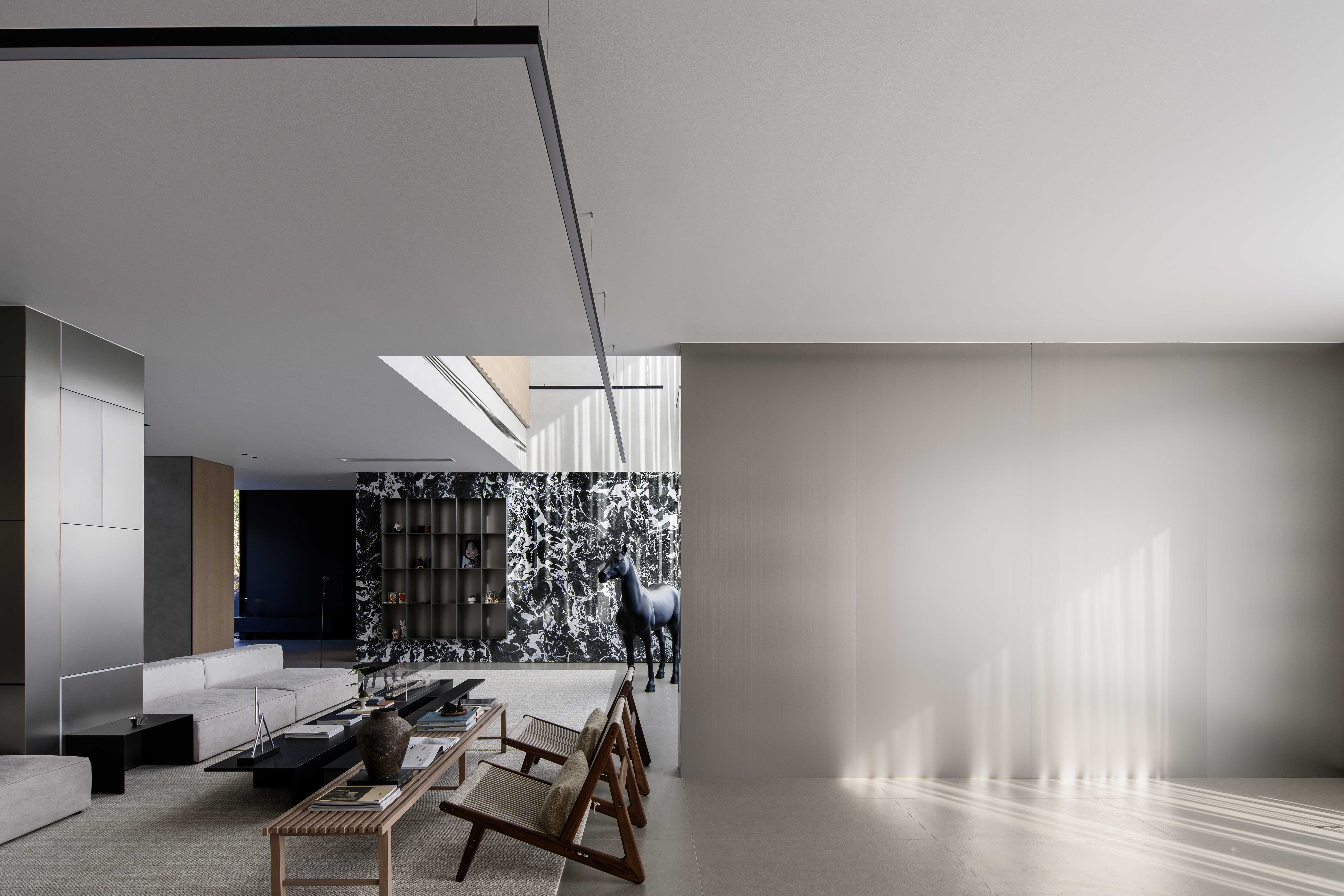 项目定位:本项目定位为一处远离城市喧嚣的度假宅,旨在打造一个既具现代艺术感,又能提供宁静生活的空间。极简现代主义的外观与1000㎡的花园相得益彰,为居住者提供私人、舒适的避世之地。整体设计突出空间的艺术感与功能性,注重居住者的隐私与自然亲近感。