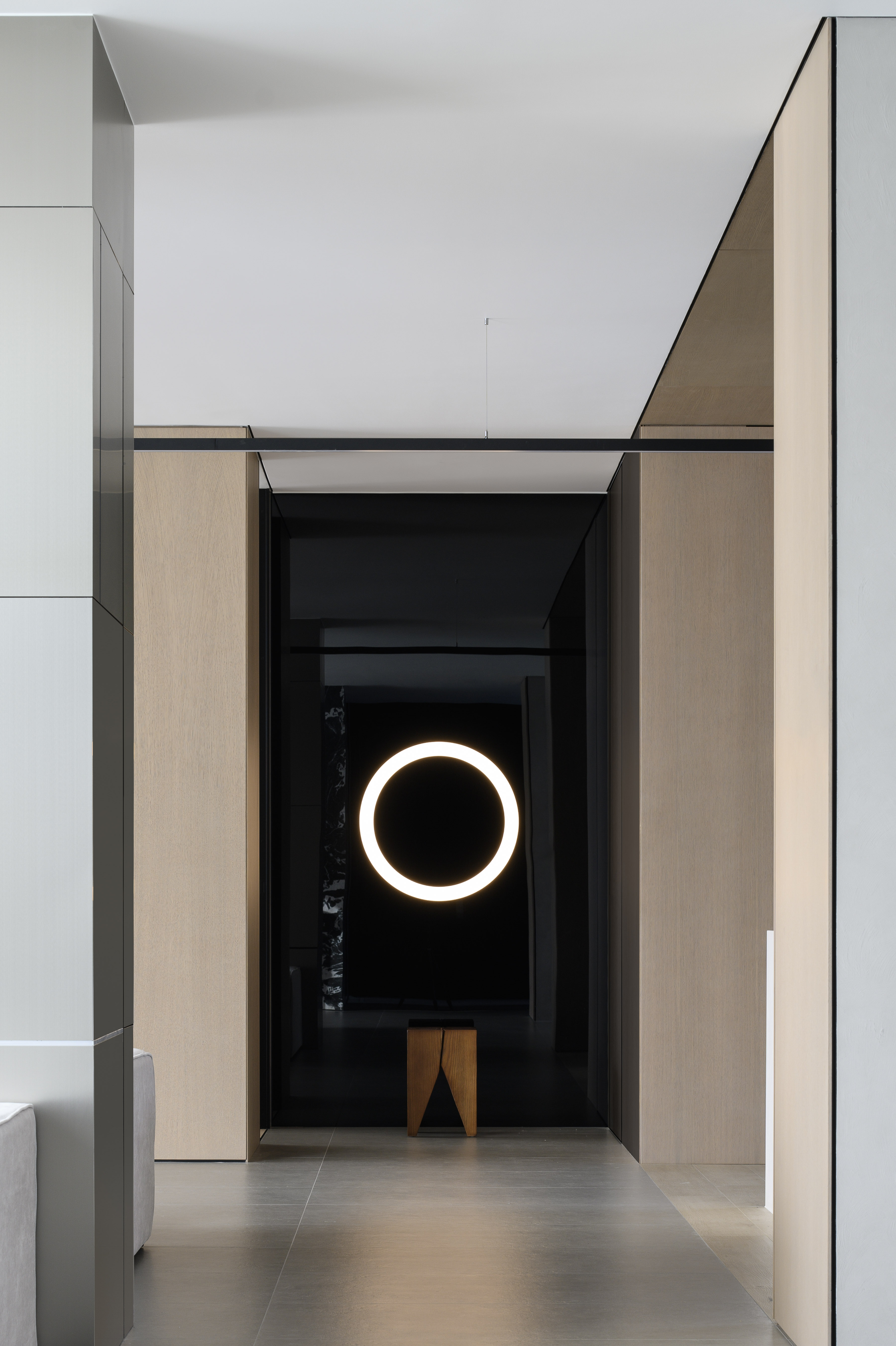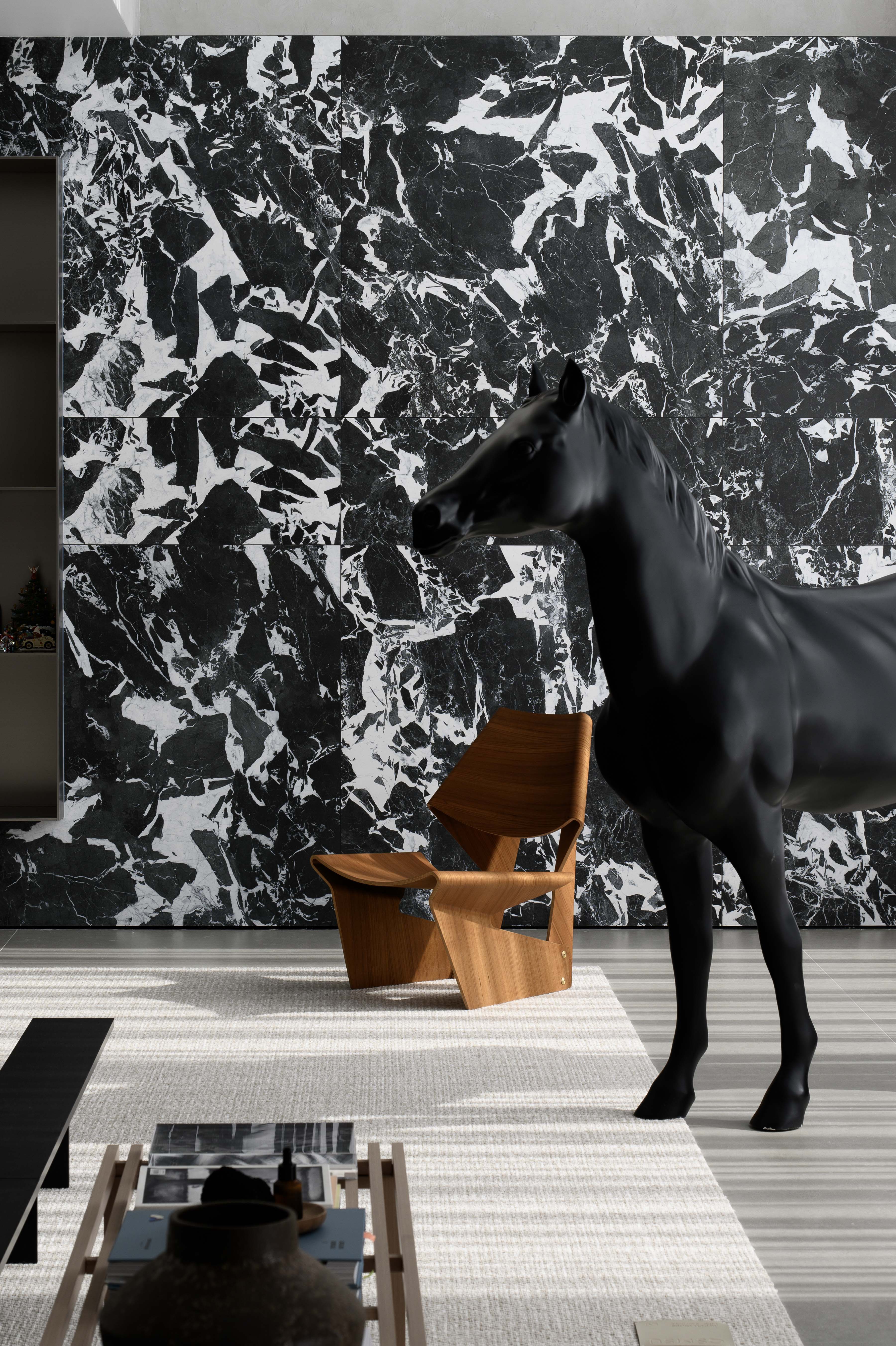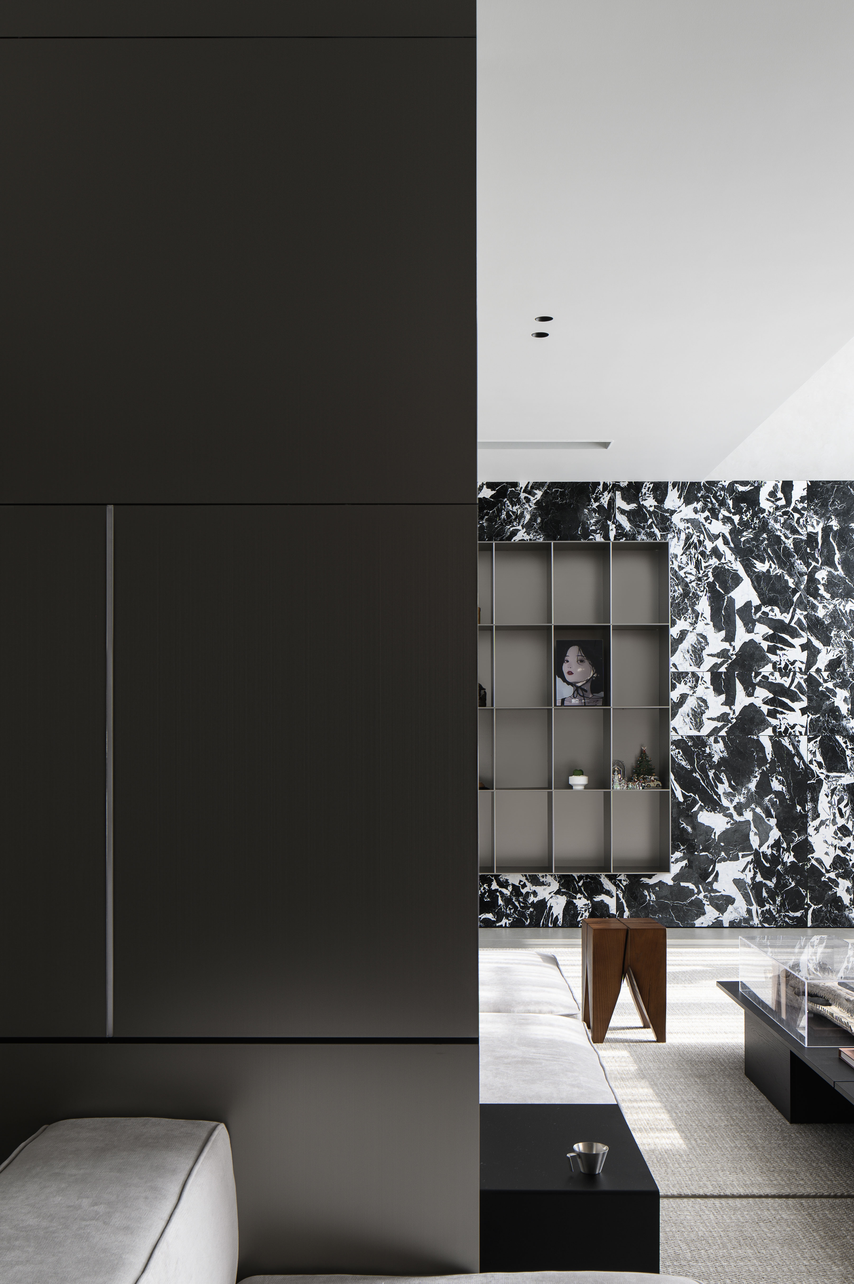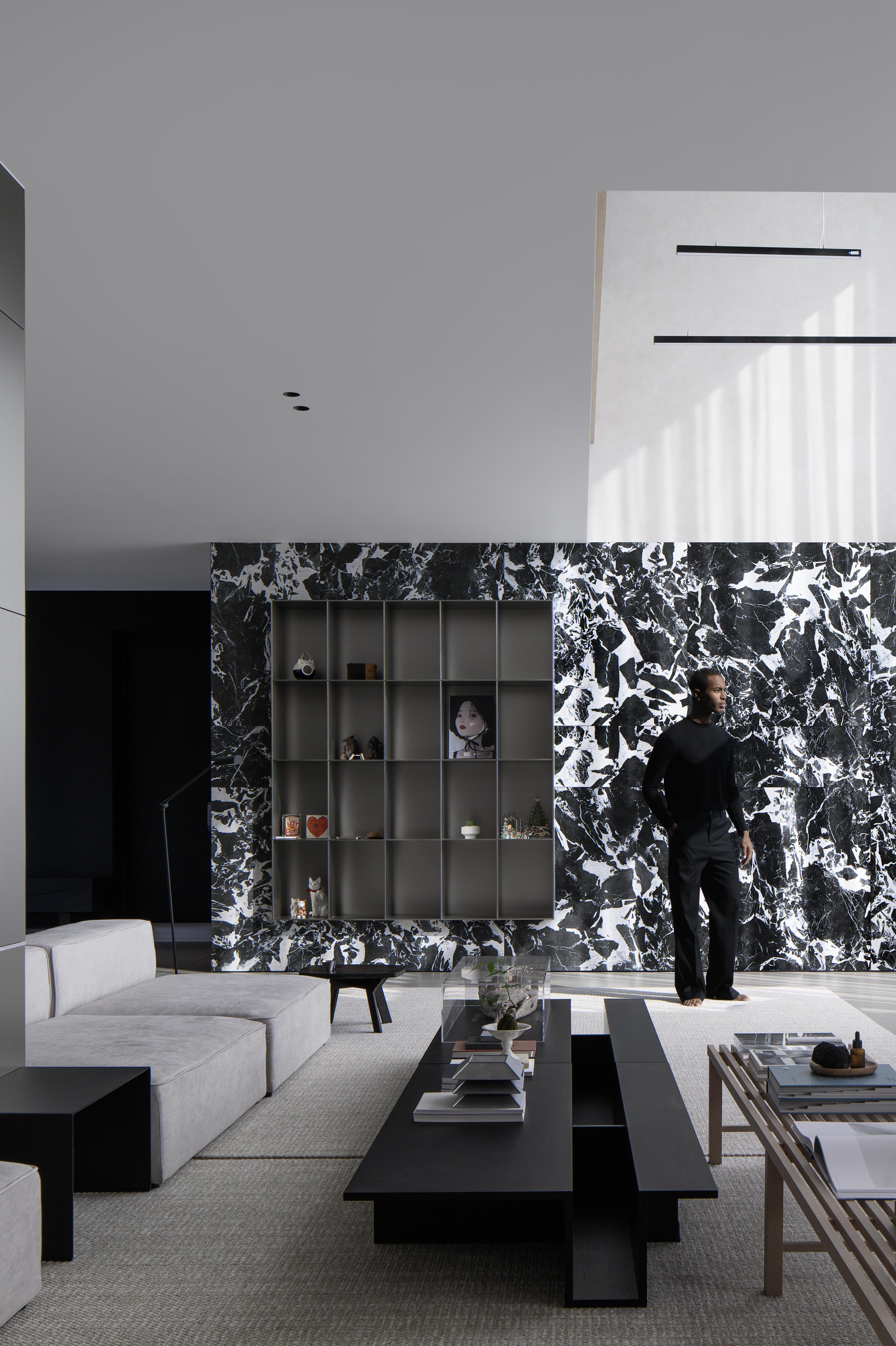 空间意境:设计的创新点在于通过大片落地窗与不锈钢镜面相辅相成,打破空间的边界感,展现自然景色与现代艺术的完美融合。黑白花砖连接玄关与客厅,花色如银河般优雅且神秘,突出了空间的张力。金属色展示柜巧妙嵌入墙面,提升了家居的艺术质感。