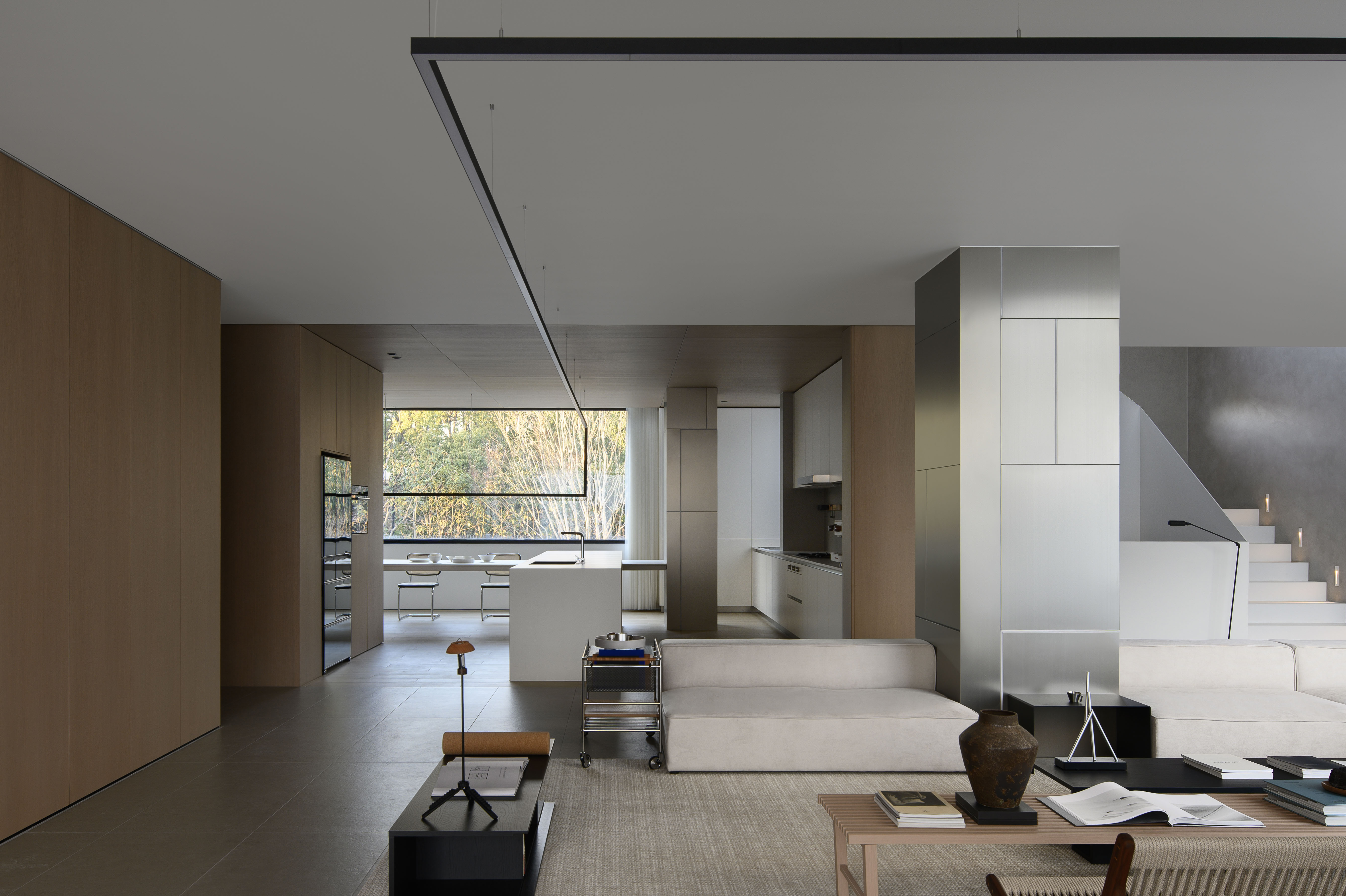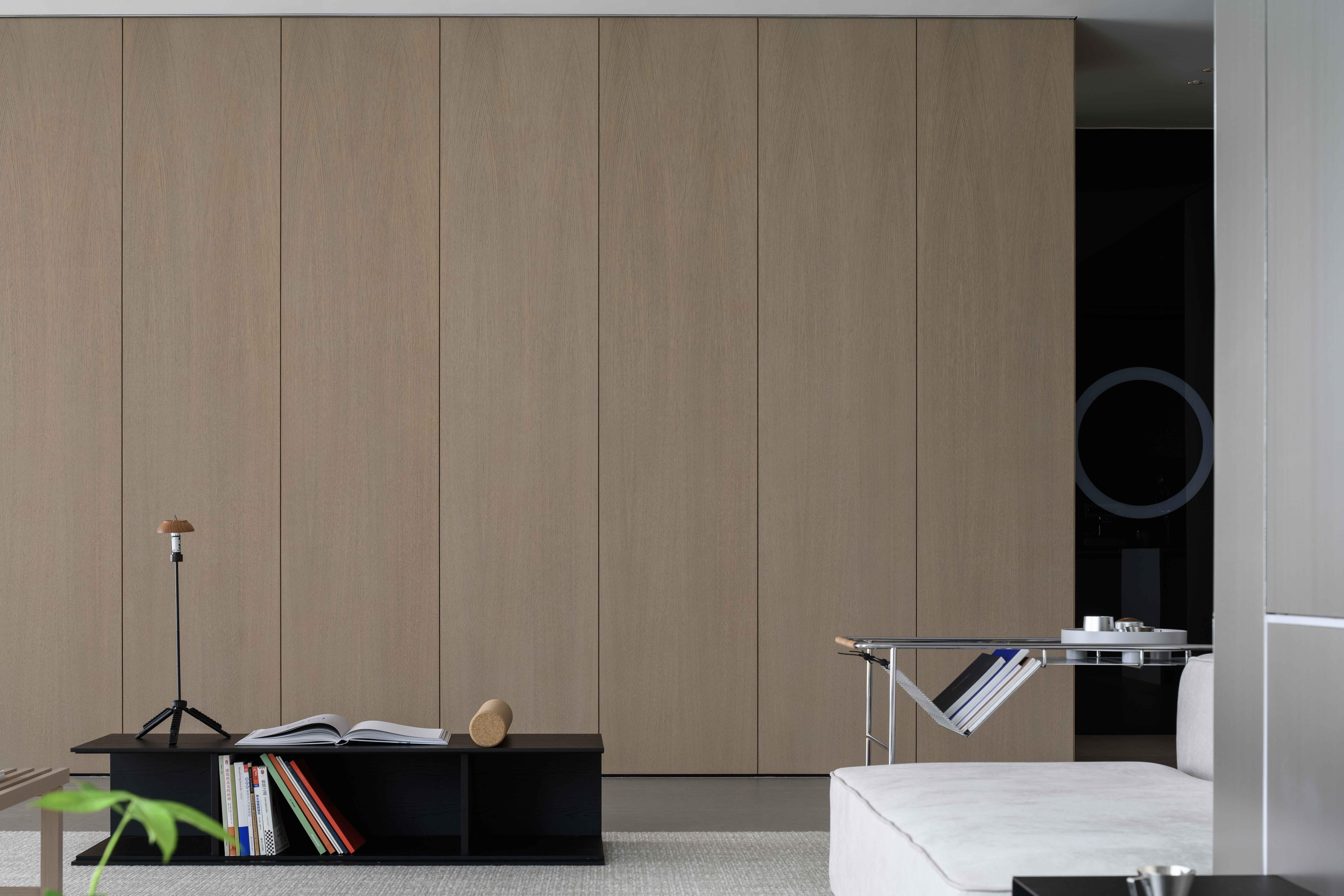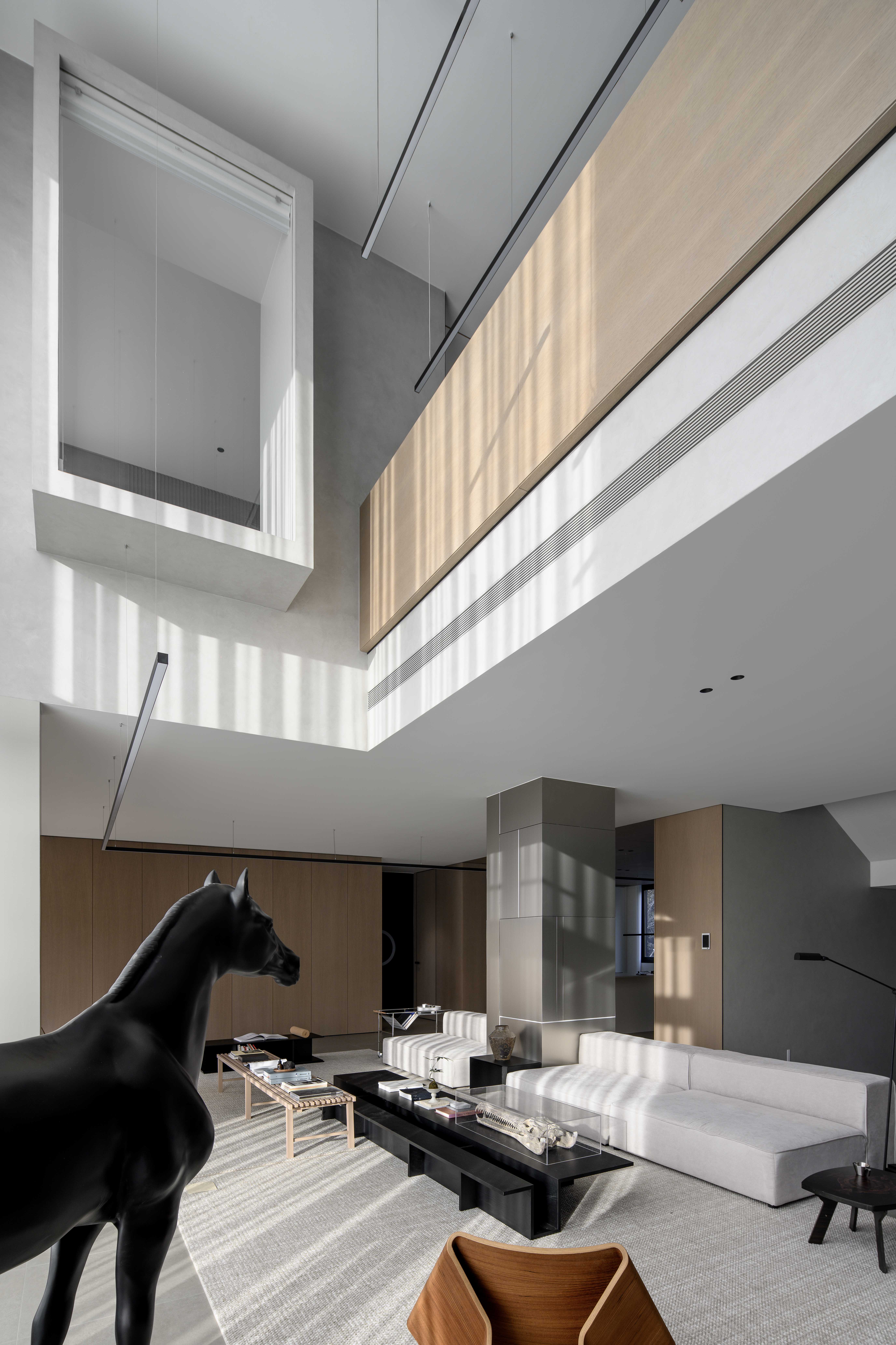 空间布局:空间布局的创新在于通过挑空设计和灵活的分区,让空间更加通透与互动。客厅围绕承重柱横向展开,视线自然引向外部景色。餐厨区通过木饰面和玻璃大窗打造独立又连贯的功能区,而圆形灯环和艺术感楼梯则为空间增添了层次感与趣味性。