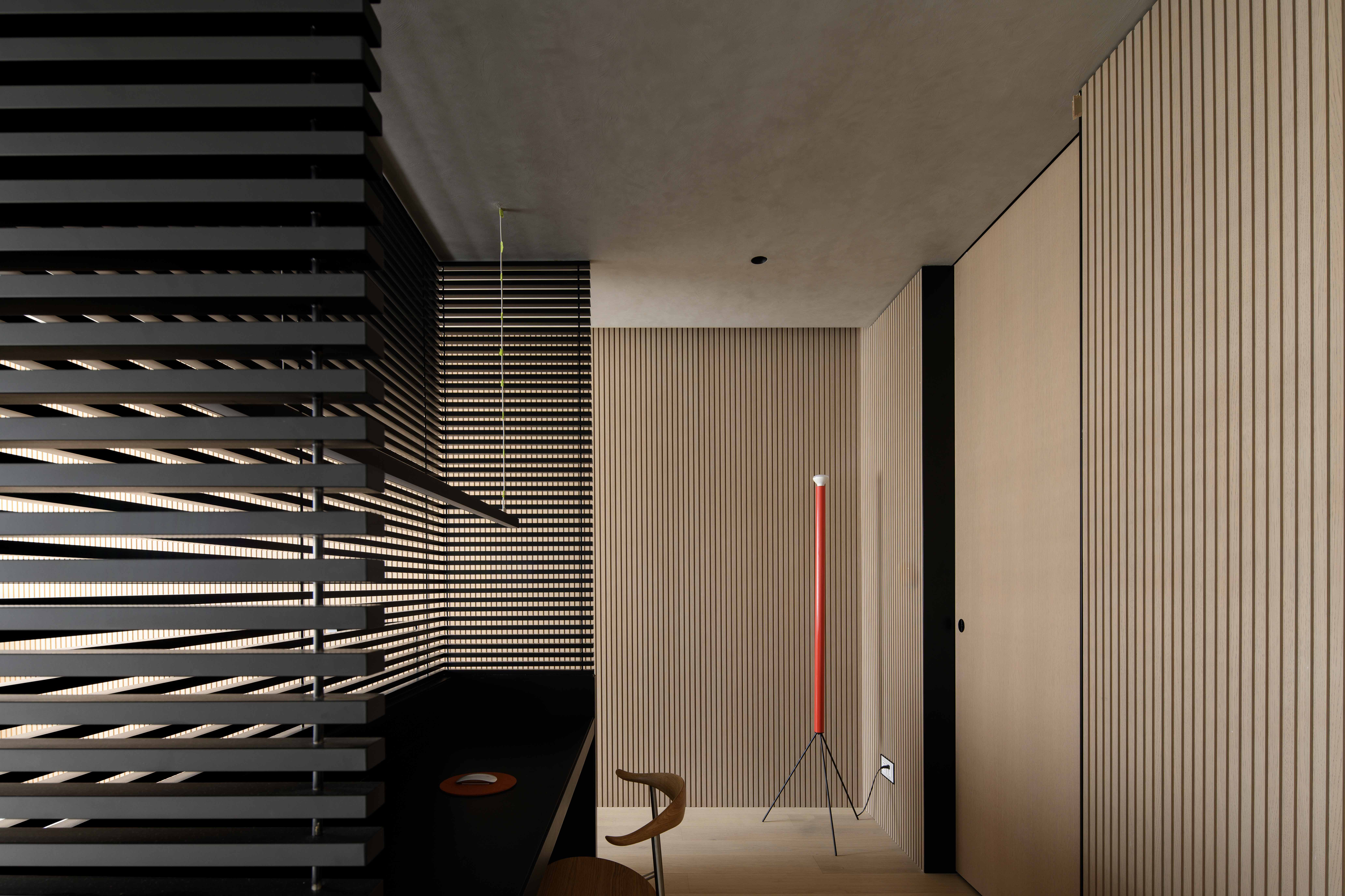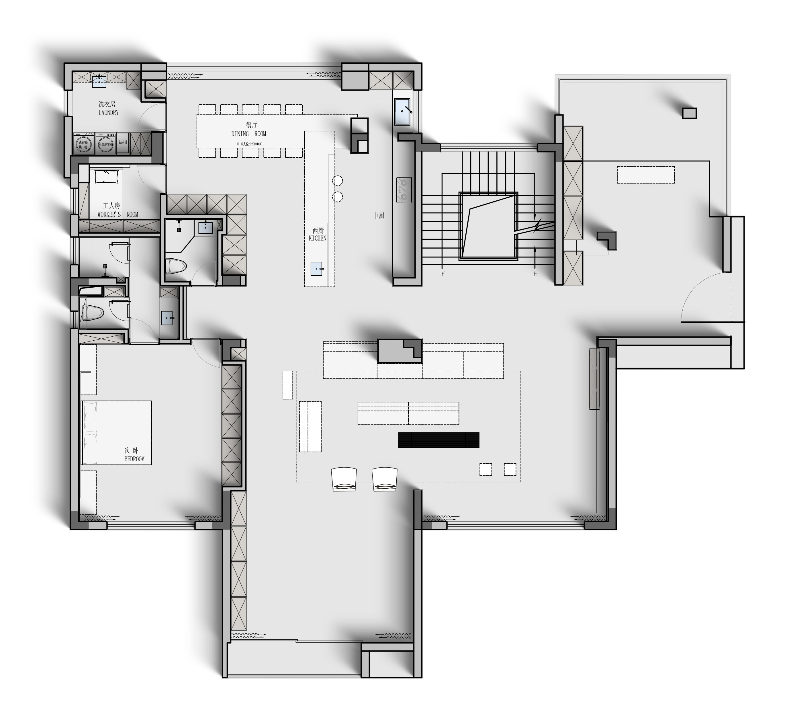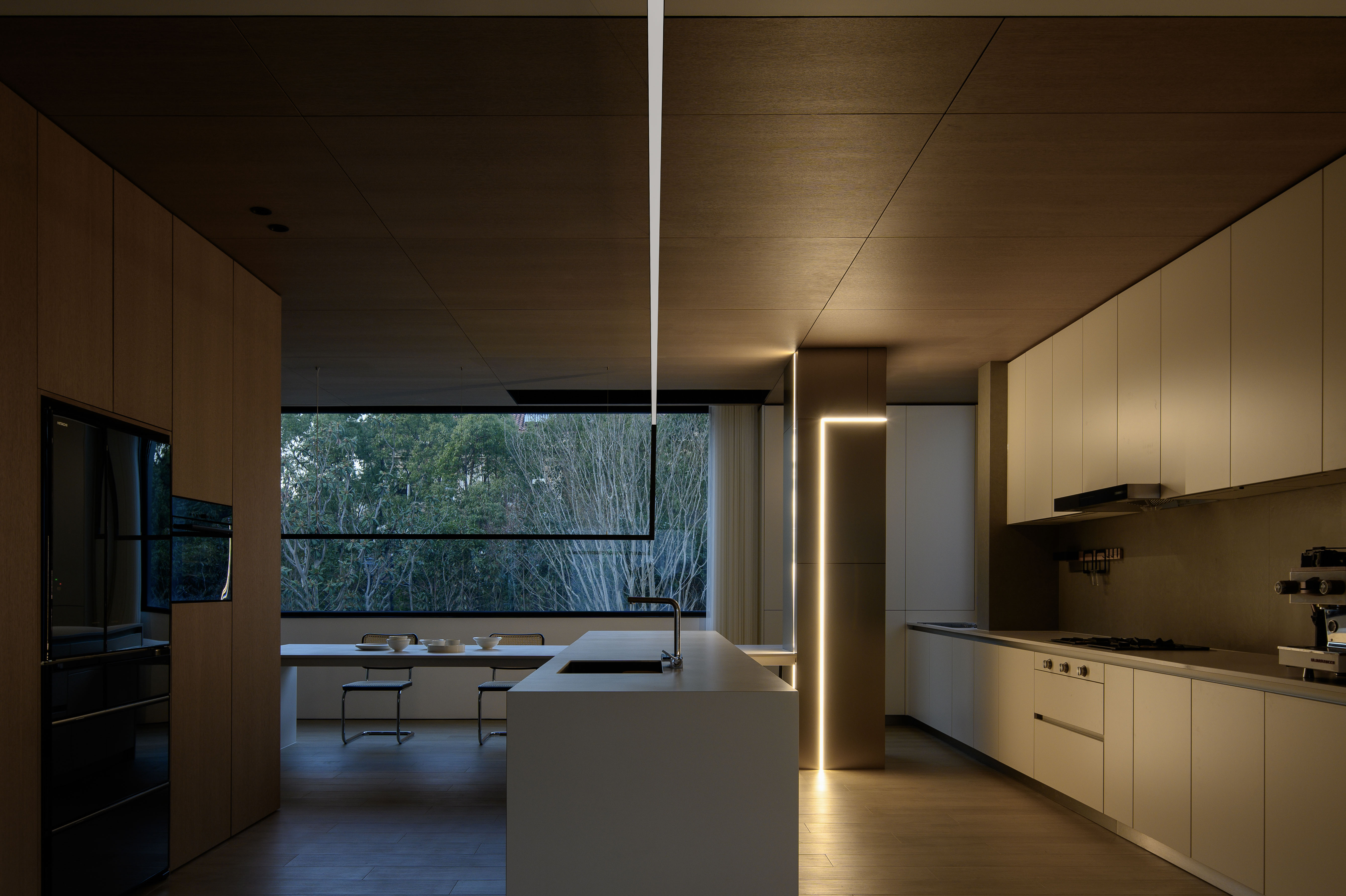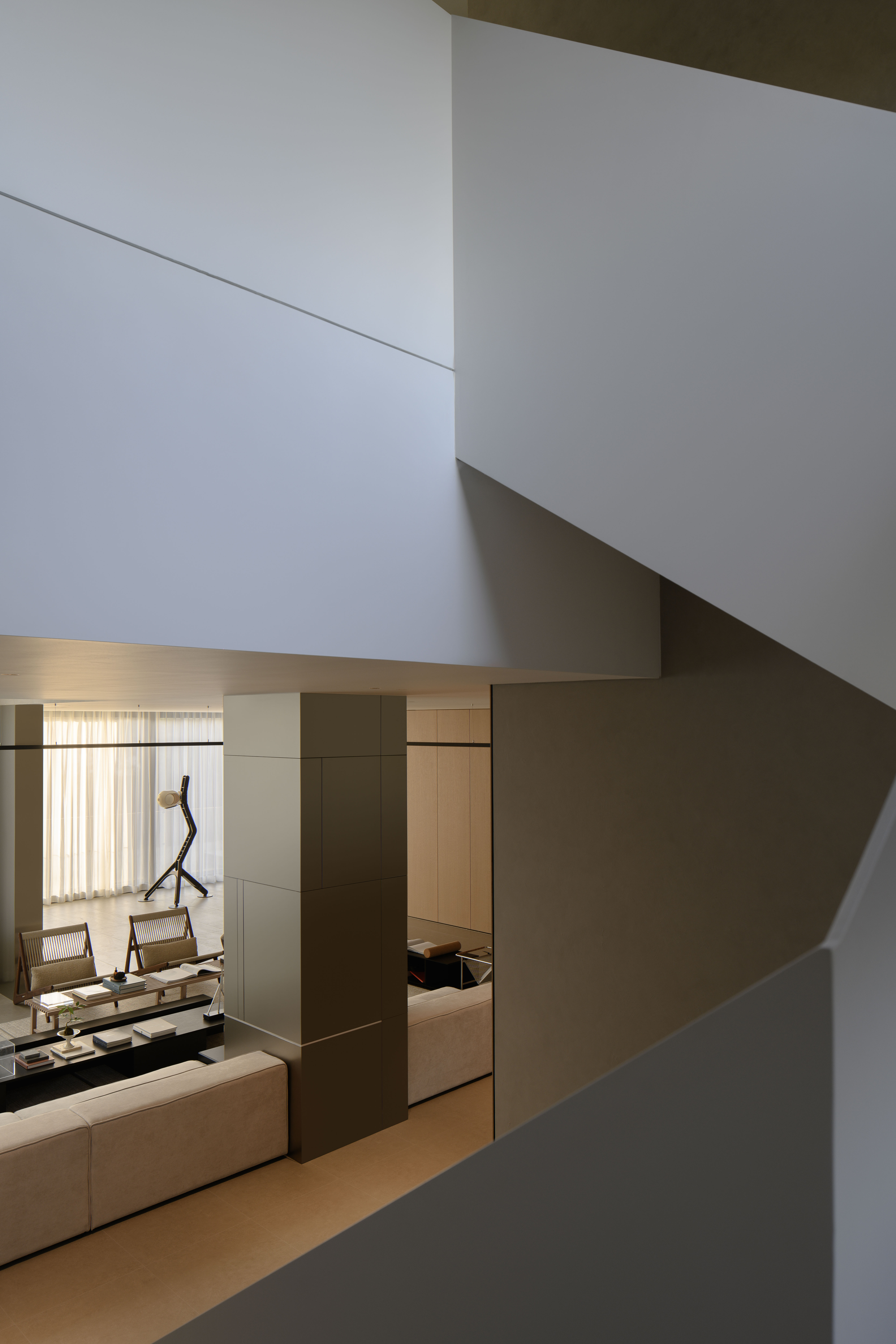 空间布局:空间布局的创新在于通过挑空设计和灵活的分区,让空间更加通透与互动。客厅围绕承重柱横向展开,视线自然引向外部景色。餐厨区通过木饰面和玻璃大窗打造独立又连贯的功能区,而圆形灯环和艺术感楼梯则为空间增添了层次感与趣味性。