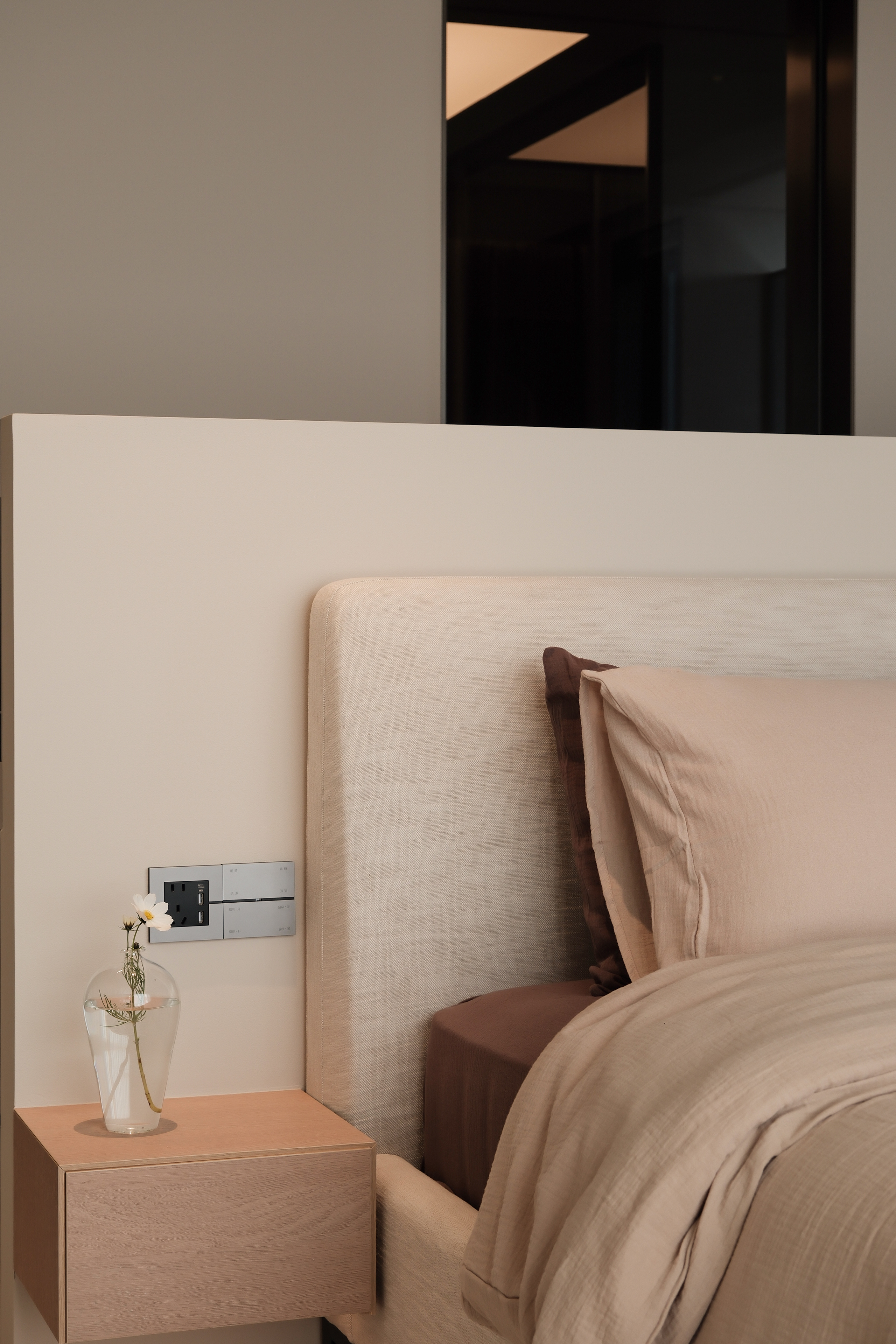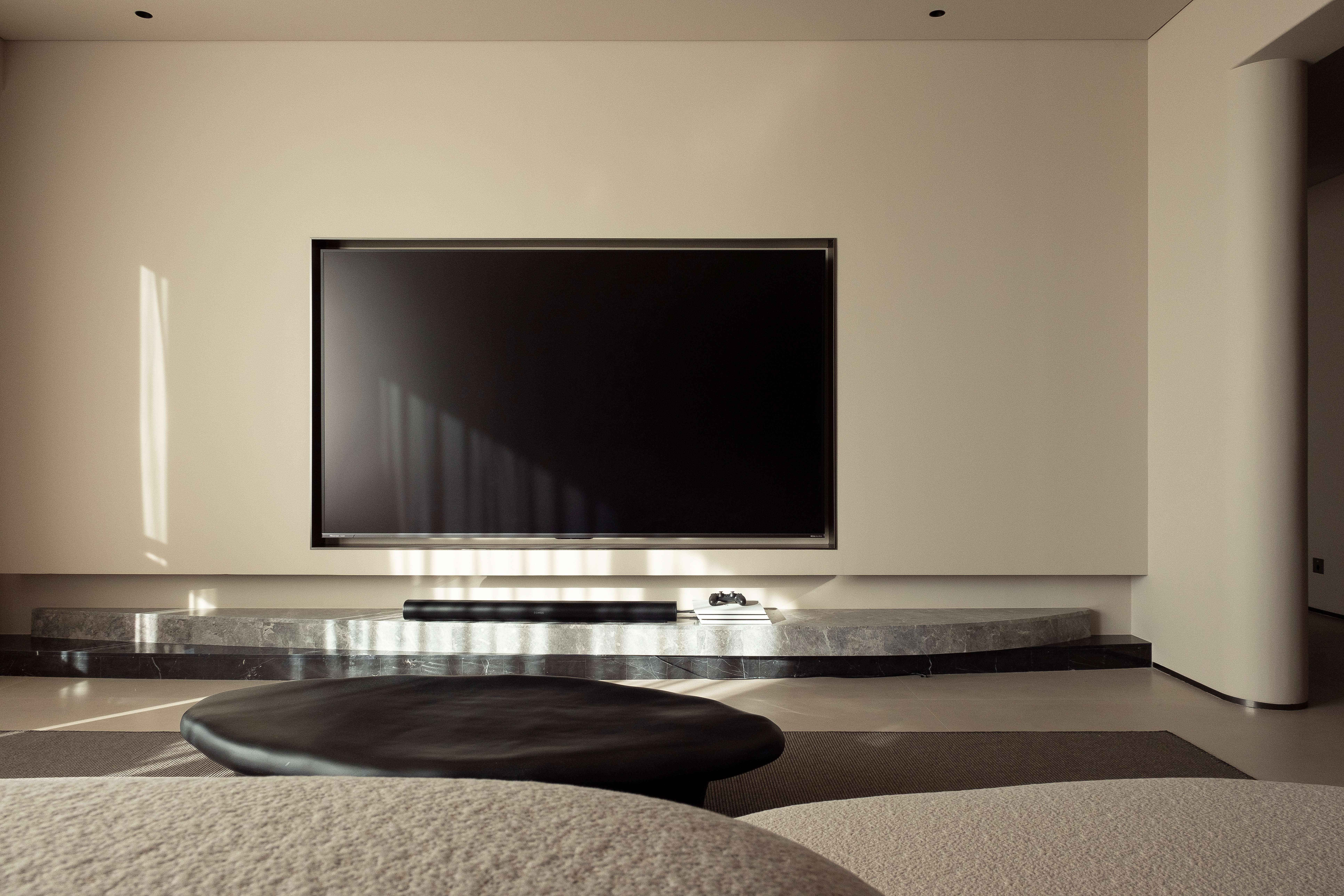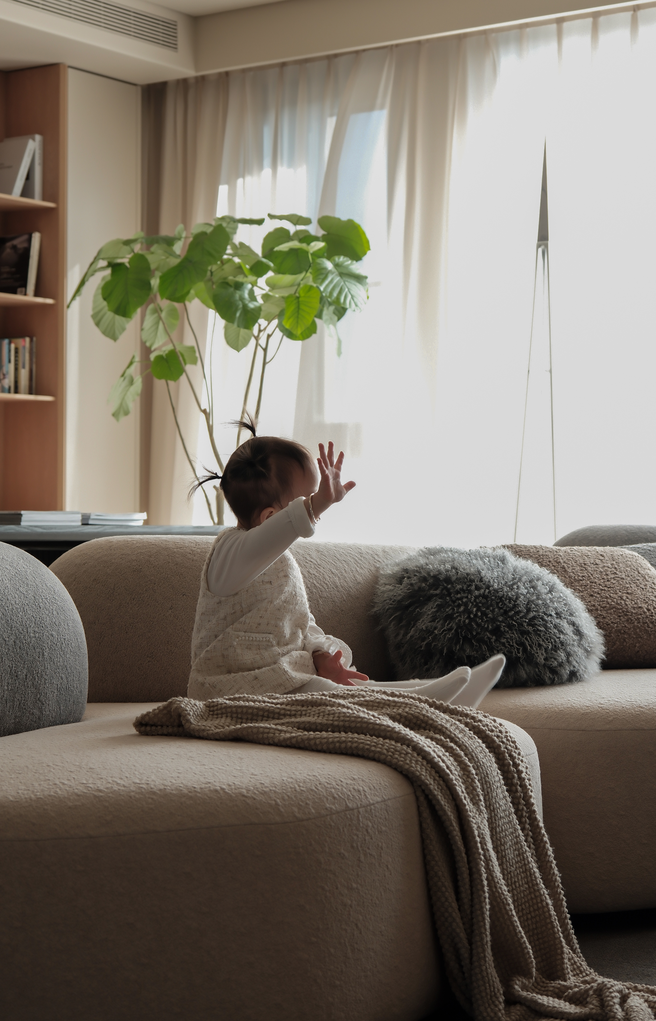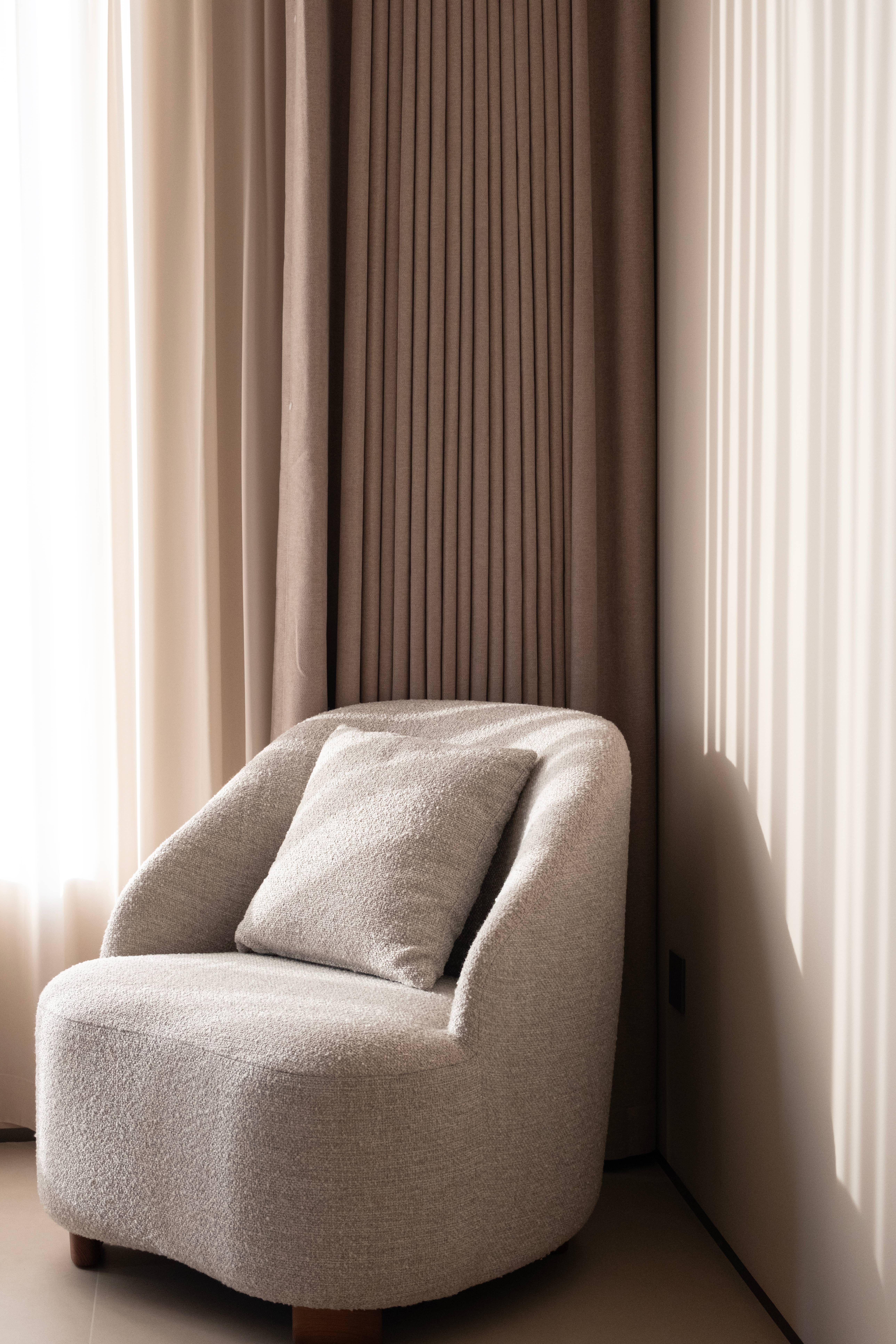 会客厅,从空间美学角度及功能性发想,兼顾到空间的温暖度和家的轻盈与轻松感,住宅中并没有皮质的家具。棉布及棉麻质地的织物面料出现在沙发、座椅等日常之物上,创造出温柔的使用场景。